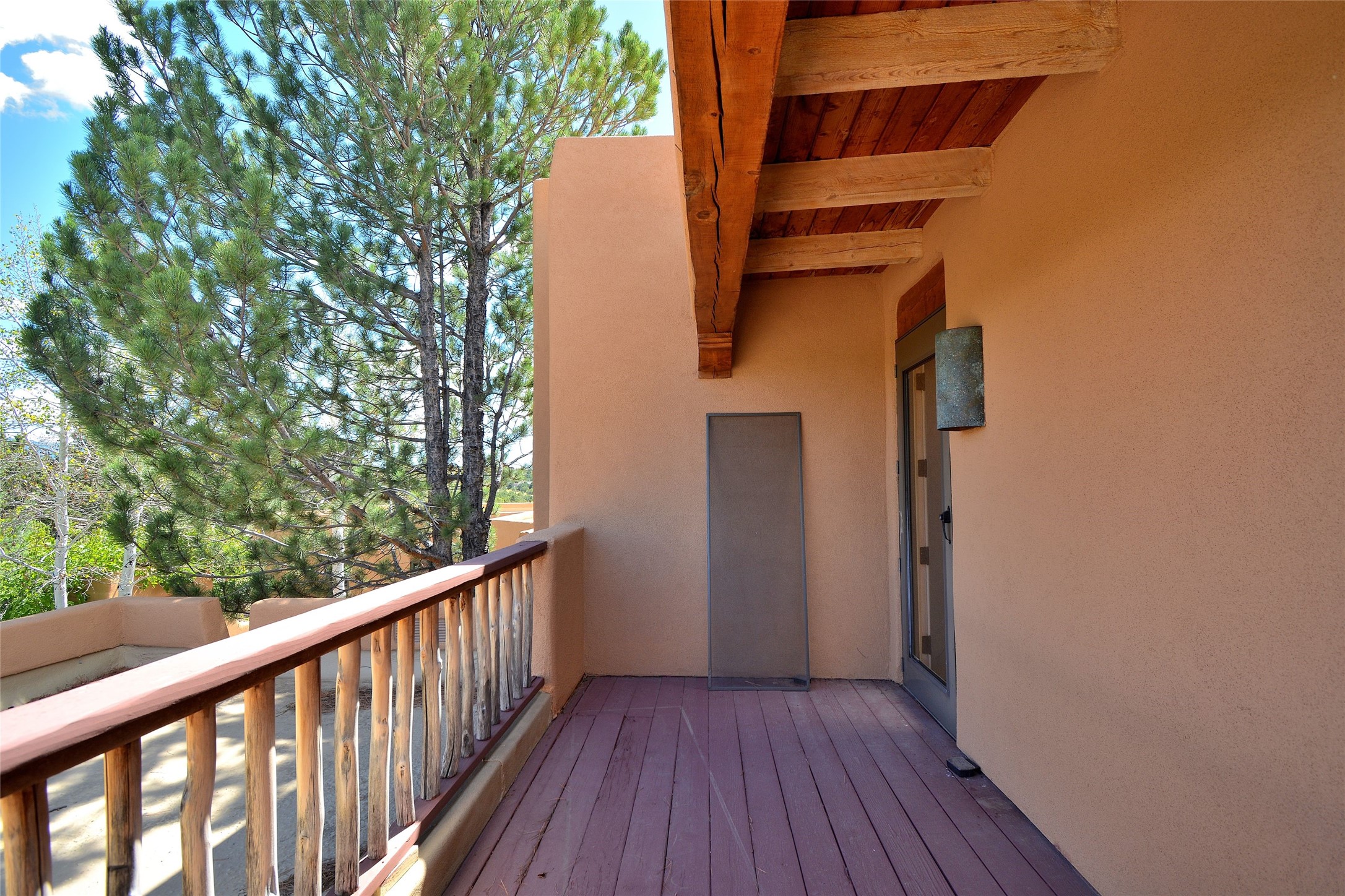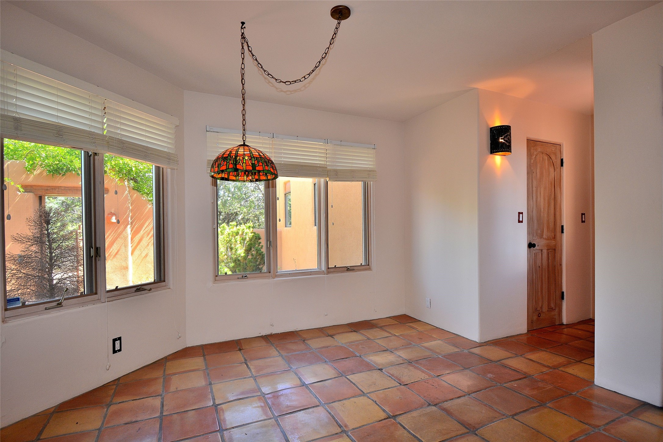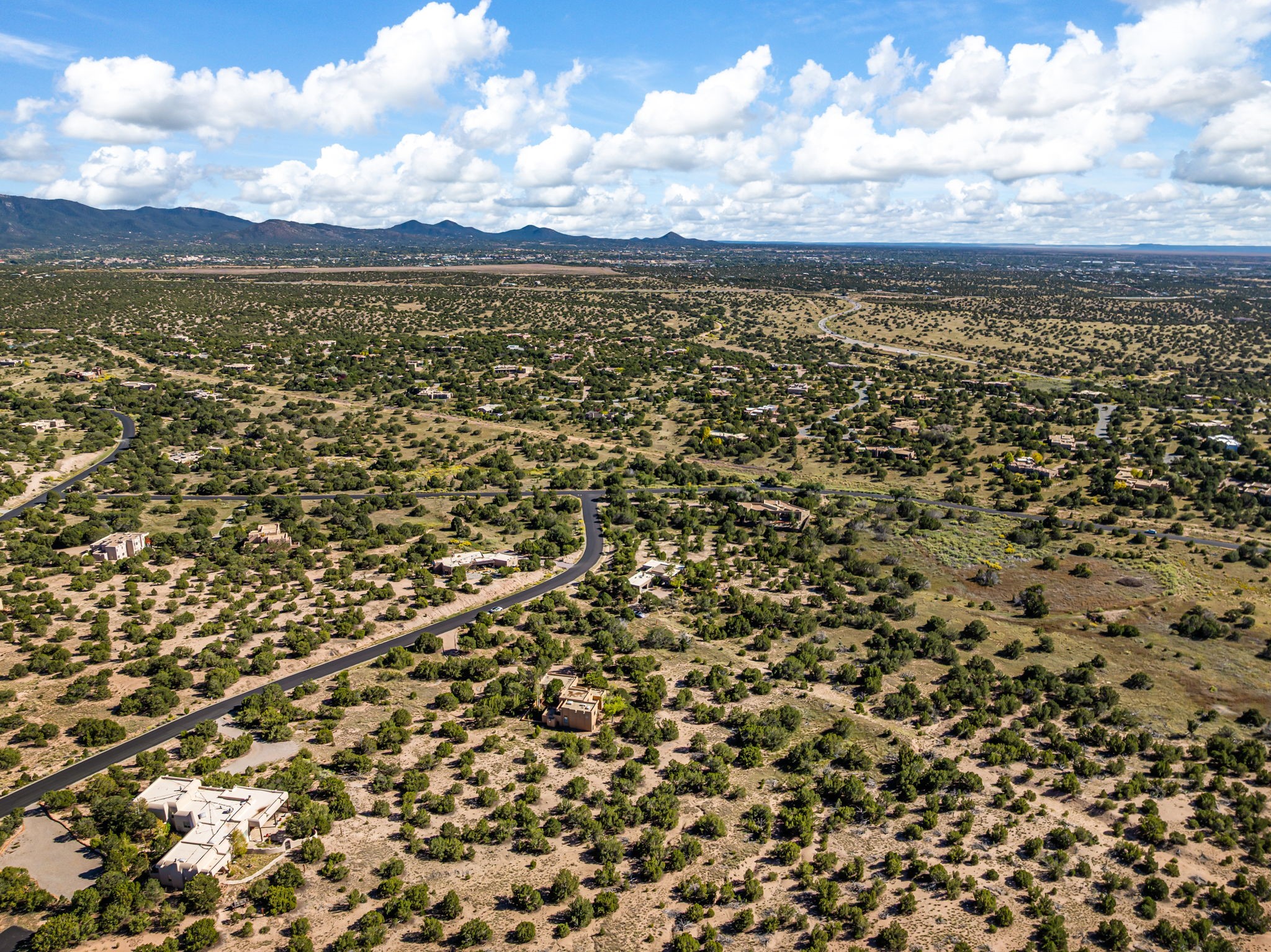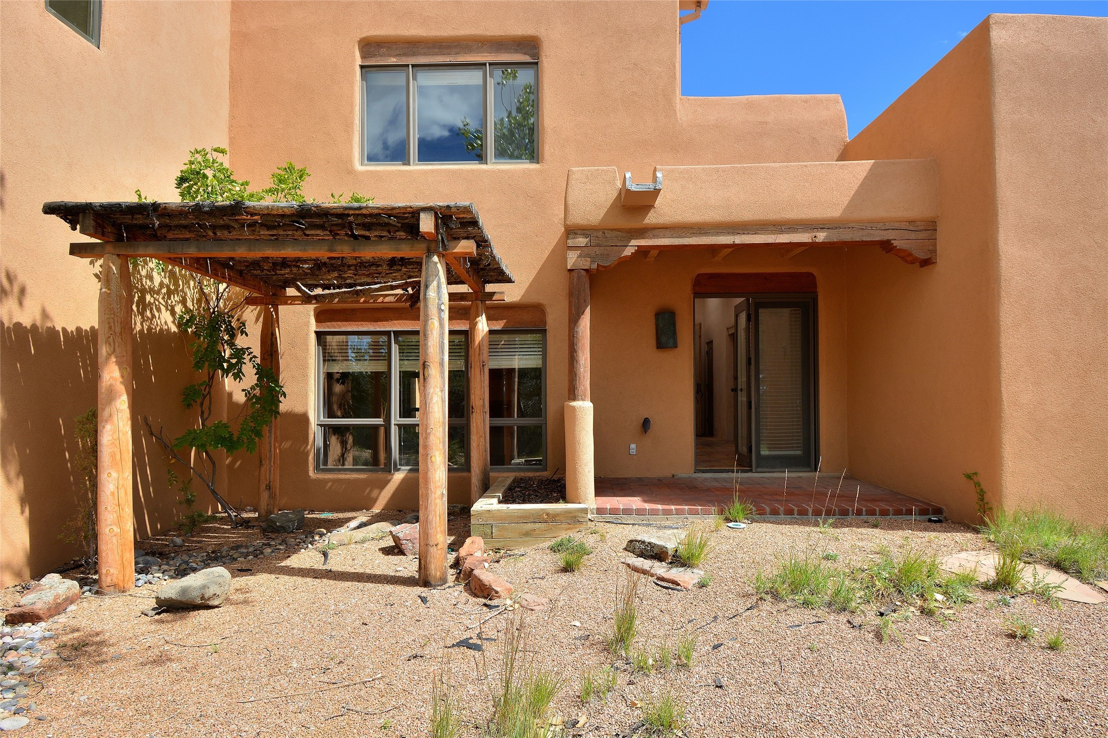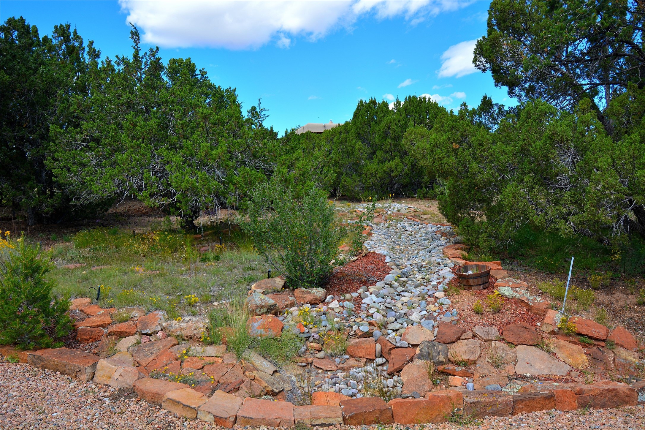 Nestled on two acres dotted with pion and juniper, this inviting Santa Fe-style home blends traditional charm with modern comforts. A gravel driveway leads to a graceful walkway, which in turn leads to a beautifully landscaped, enclosed front yard, The house features plastered walls, and the ground-level floors are adorned with traditional Saltillo tiles, except for the guest bedroom, which has carpet and an en-suite bathroom. The living and dining rooms feature soaring ceilings with vigas. A gas fireplace in the living room adds ambiance during cold winter nights.The kitchen, featuring skylights, granite countertops, and a gas cooktop, microwave, oven, and fridge/freezer, opens to a breakfast nook on one side, complete with its own private patio. Continuing from the breakfast nook, you enter the laundry and then the garage. On the other side of the kitchen is the dining room. The main level also features a second guest room or den with a nearby half-bath. The downstairs has in-floor radiant heat.Upstairs, the spacious main bedroom offers vigas, a second gas fireplace, radiant baseboard heat, and mountain views on one side and a deck on the other. The adjoining bath offers dual sinks, a Jacuzzi-style tub, a shower with seating, and a walk-in cedar closet.A new septic tank was installed in late November 2025With an alarm system and thoughtful storage throughout, this home offers a blend of traditional Santa Fe style and practicality in a serene setting, just a couple of minutes drive to 599 and access to Santa Fe (approx.10 minutes) or to Los Alamos, the Santa Fe airport, and Albuquerque.Adjacent to the subdivision is the La Tierra open space of almost 1500 acres, offering 25 miles of walking trails.