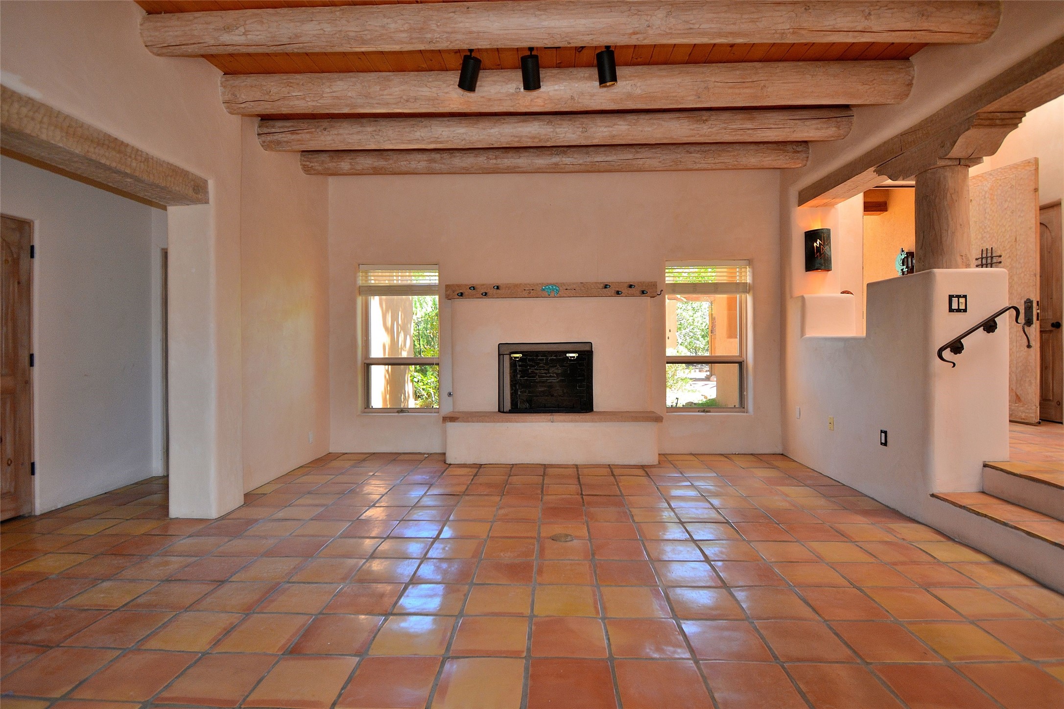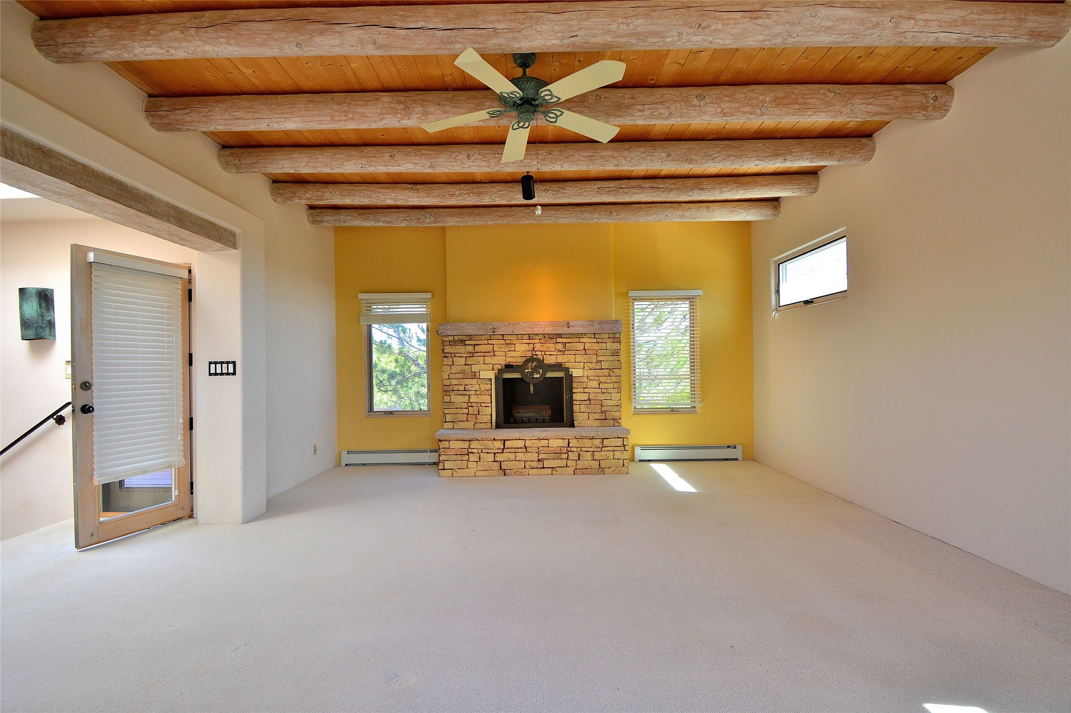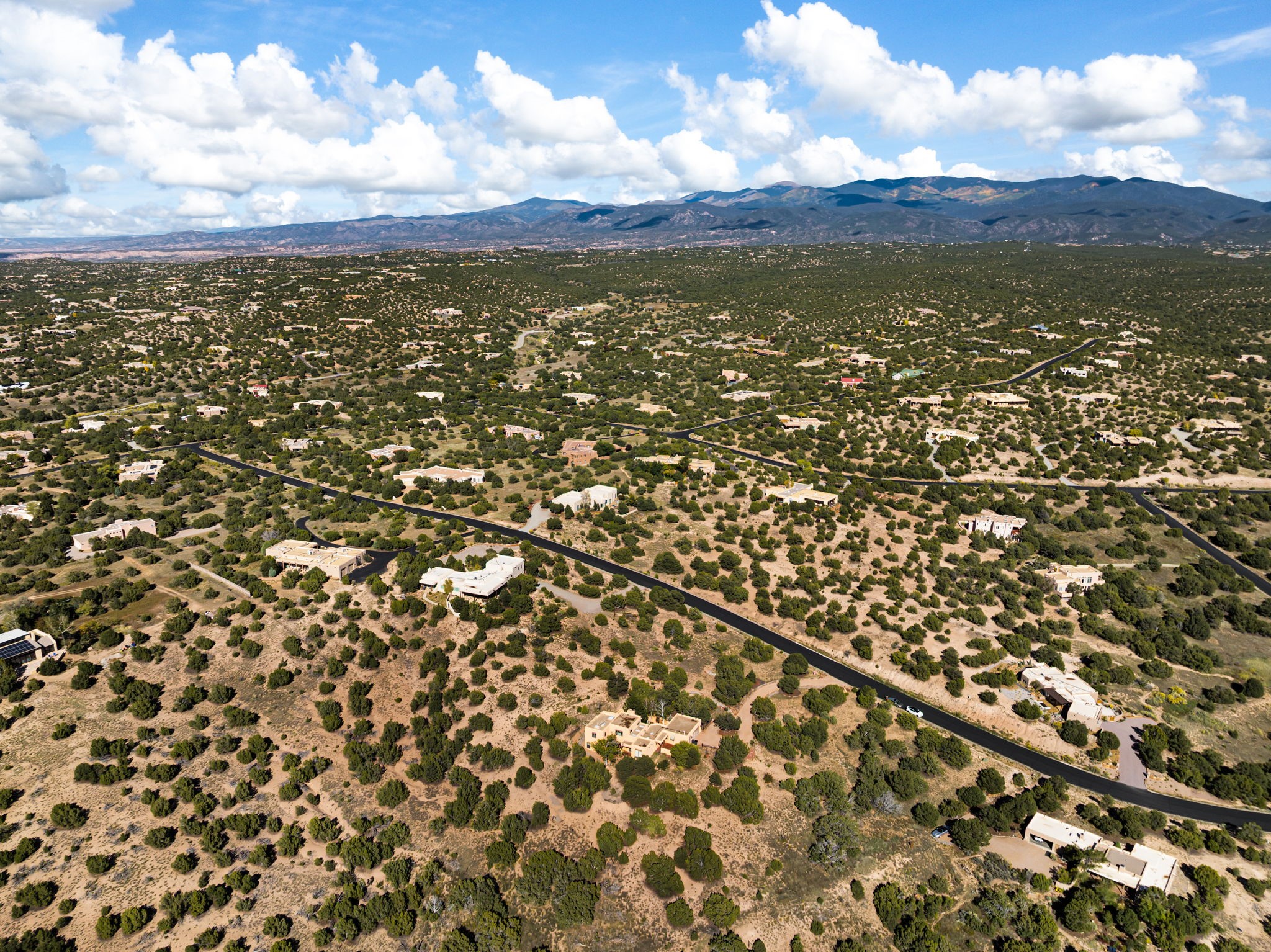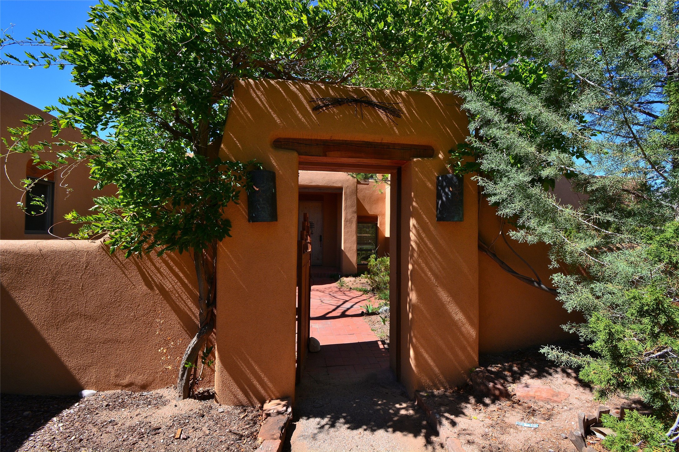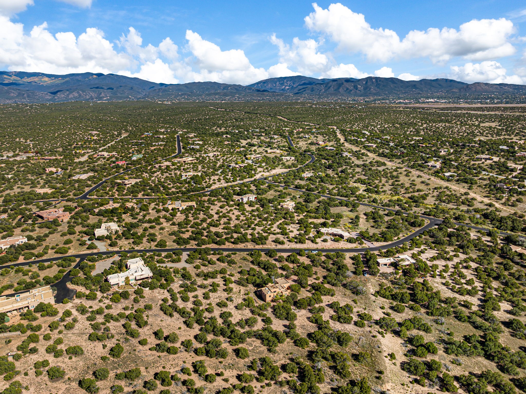 Nestled on two acres dotted with pion and juniper, this inviting Santa Fe-style home blends traditional charm with modern comforts. A gravel driveway leads to a graceful walkway, which in turn leads to a beautifully landscaped, enclosed front yard, The house features plastered walls, and the ground-level floors are adorned with traditional Saltillo tiles, except for the guest bedroom, which has carpet and an en-suite bathroom. The living and dining rooms feature soaring ceilings with vigas. A gas fireplace in the living room adds ambiance during cold winter nights.The kitchen, featuring skylights, granite countertops, and a gas cooktop, microwave, oven, and fridge/freezer, opens to a breakfast nook on one side, complete with its own private patio. Continuing from the breakfast nook, you enter the laundry and then the garage. On the other side of the kitchen is the dining room. The main level also features a second guest room or den with a nearby half-bath. The downstairs has in-floor radiant heat.Upstairs, the spacious main bedroom offers vigas, a second gas fireplace, radiant baseboard heat, and mountain views on one side and a deck on the other. The adjoining bath offers dual sinks, a Jacuzzi-style tub, a shower with seating, and a walk-in cedar closet.A new septic tank was installed in late November 2025With an alarm system and thoughtful storage throughout, this home offers a blend of traditional Santa Fe style and practicality in a serene setting, just a couple of minutes drive to 599 and access to Santa Fe (approx.10 minutes) or to Los Alamos, the Santa Fe airport, and Albuquerque.Adjacent to the subdivision is the La Tierra open space of almost 1500 acres, offering 25 miles of walking trails.