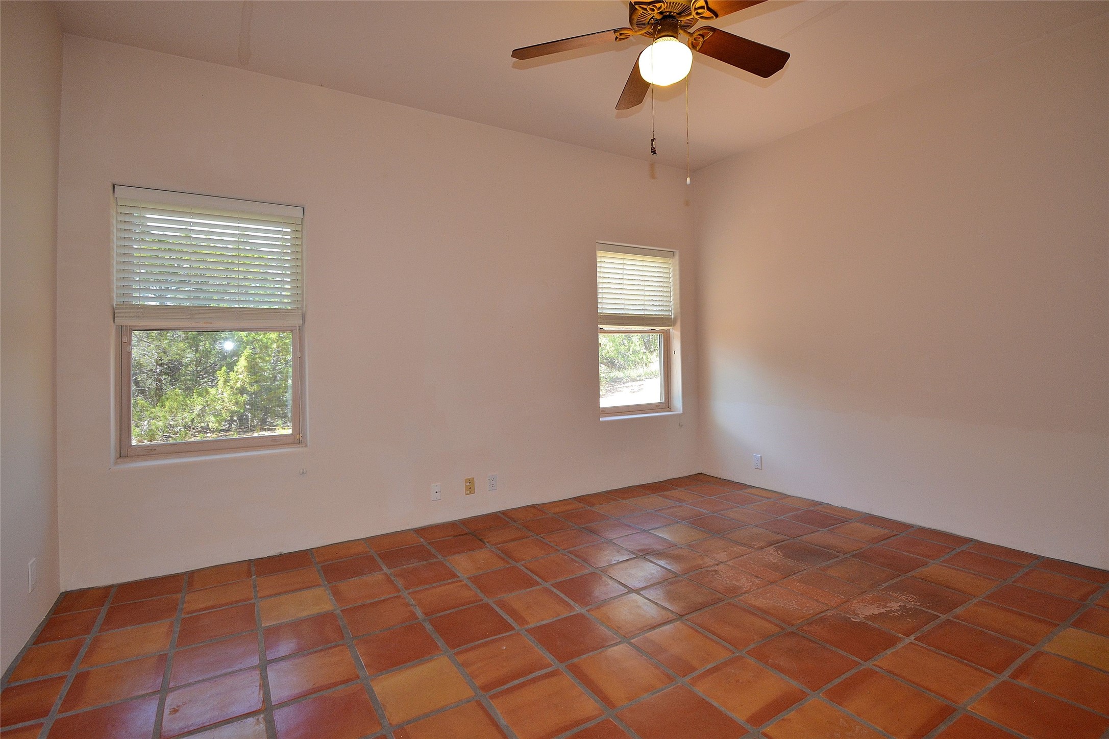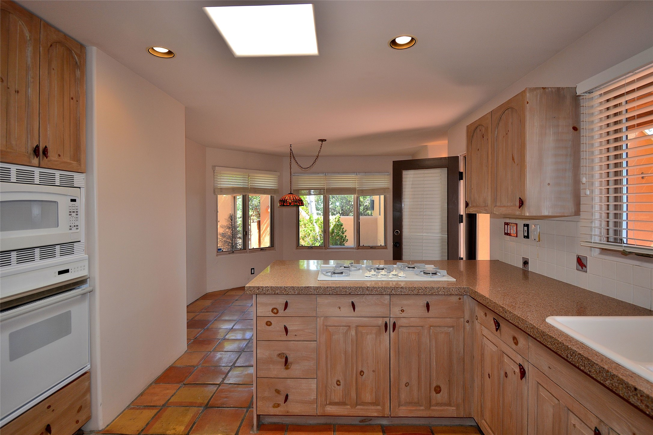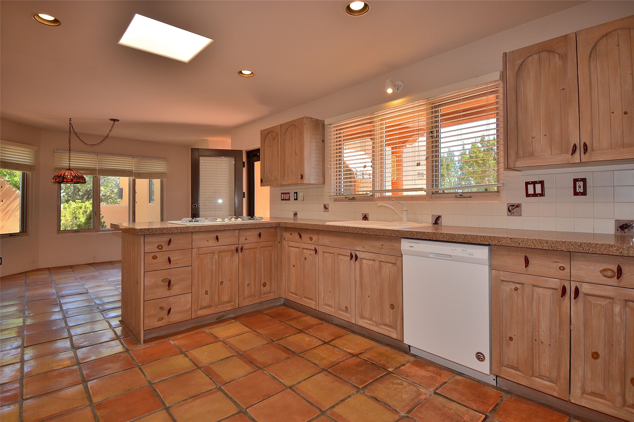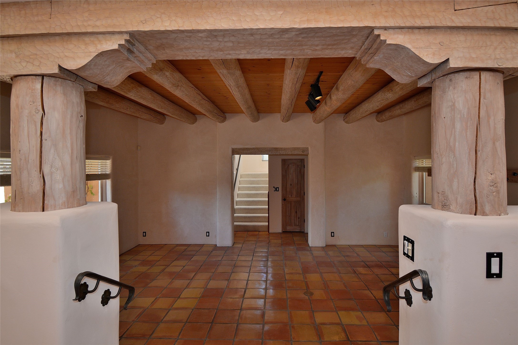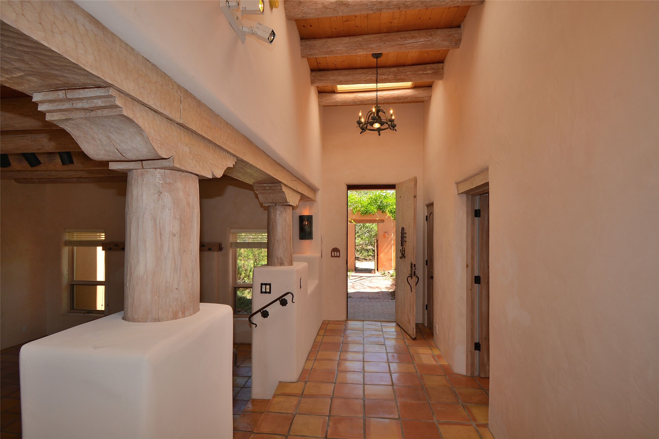 Nestled on two acres dotted with pion and juniper, this inviting Santa Fe-style home blends traditional charm with modern comforts. A gravel driveway leads to a graceful walkway, which in turn leads to a beautifully landscaped, enclosed front yard, The house features plastered walls, and the ground-level floors are adorned with traditional Saltillo tiles, except for the guest bedroom, which has carpet and an en-suite bathroom. The living and dining rooms feature soaring ceilings with vigas. A gas fireplace in the living room adds ambiance during cold winter nights.The kitchen, featuring skylights, granite countertops, and a gas cooktop, microwave, oven, and fridge/freezer, opens to a breakfast nook on one side, complete with its own private patio. Continuing from the breakfast nook, you enter the laundry and then the garage. On the other side of the kitchen is the dining room. The main level also features a second guest room or den with a nearby half-bath. The downstairs has in-floor radiant heat.Upstairs, the spacious main bedroom offers vigas, a second gas fireplace, radiant baseboard heat, and mountain views on one side and a deck on the other. The adjoining bath offers dual sinks, a Jacuzzi-style tub, a shower with seating, and a walk-in cedar closet.A new septic tank was installed in late November 2025With an alarm system and thoughtful storage throughout, this home offers a blend of traditional Santa Fe style and practicality in a serene setting, just a couple of minutes drive to 599 and access to Santa Fe (approx.10 minutes) or to Los Alamos, the Santa Fe airport, and Albuquerque.Adjacent to the subdivision is the La Tierra open space of almost 1500 acres, offering 25 miles of walking trails.