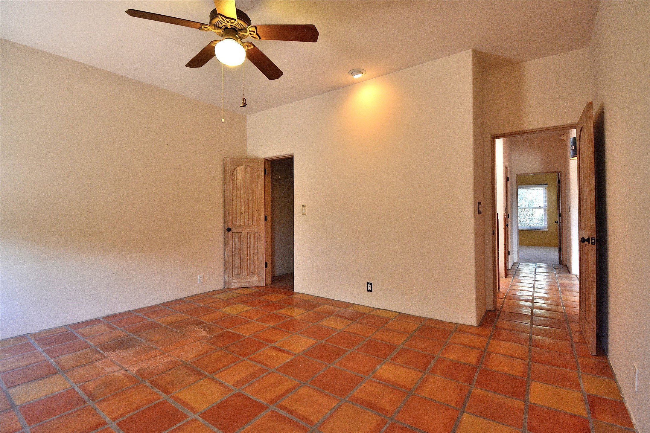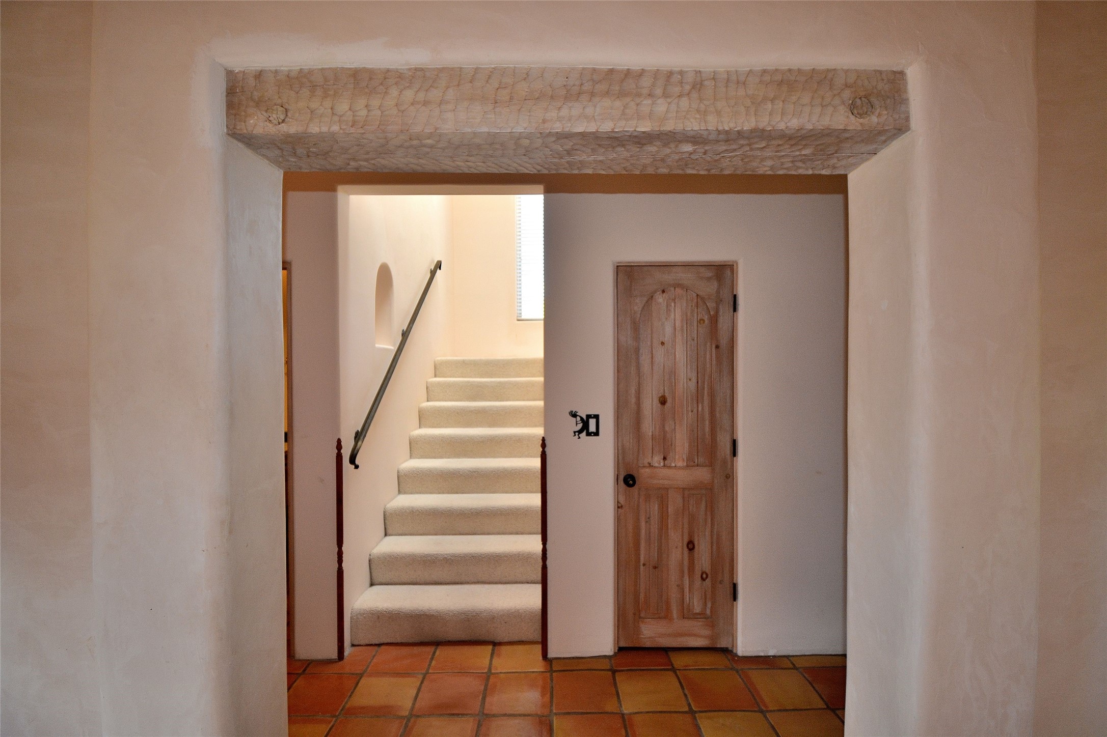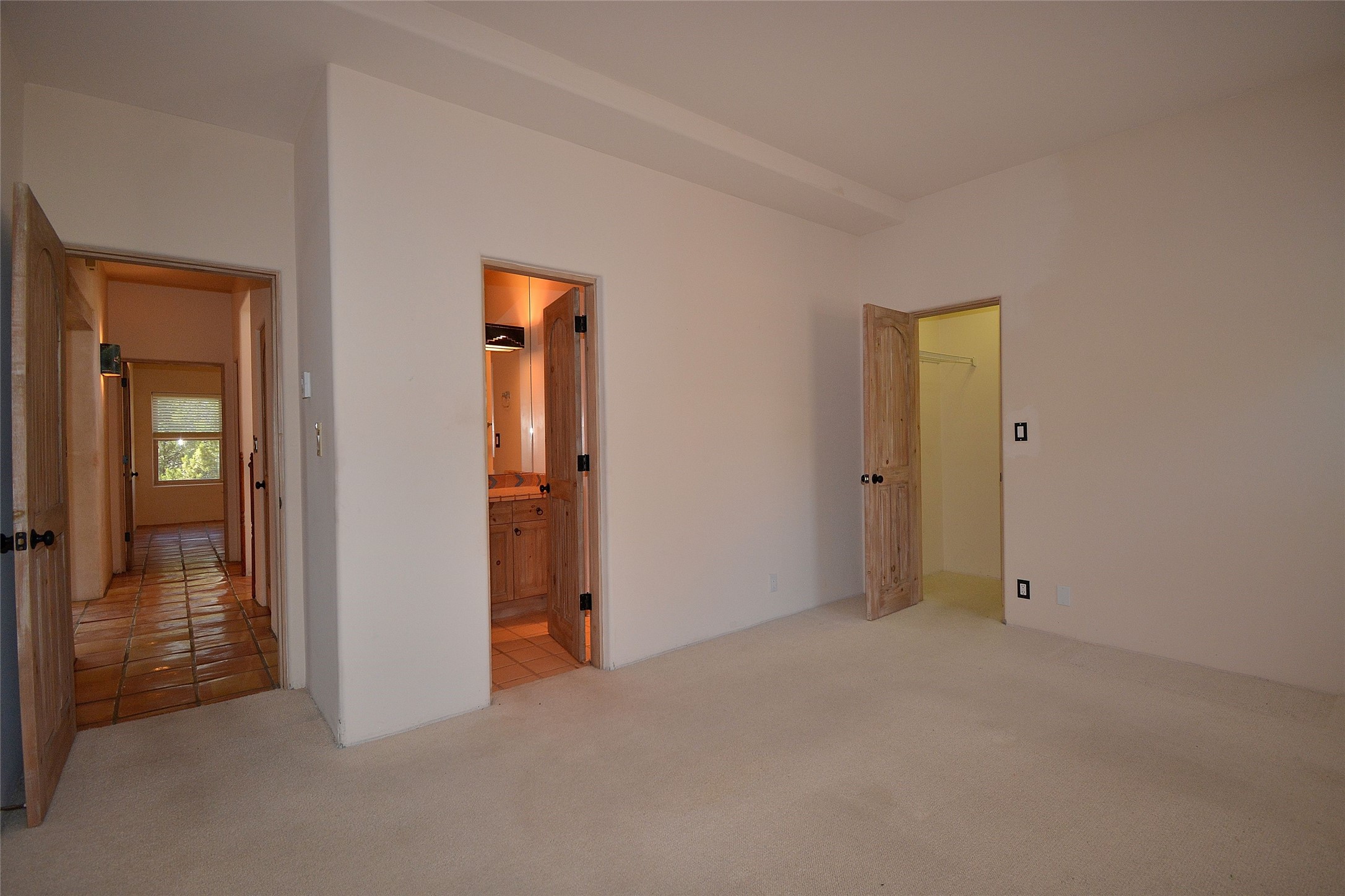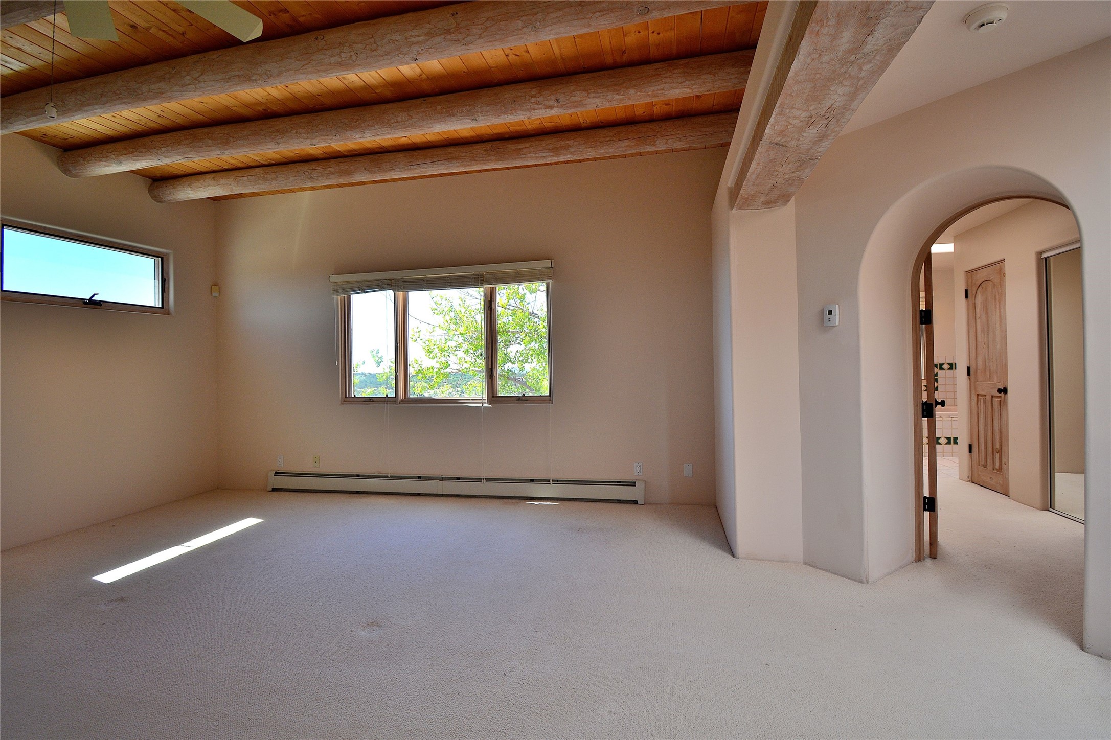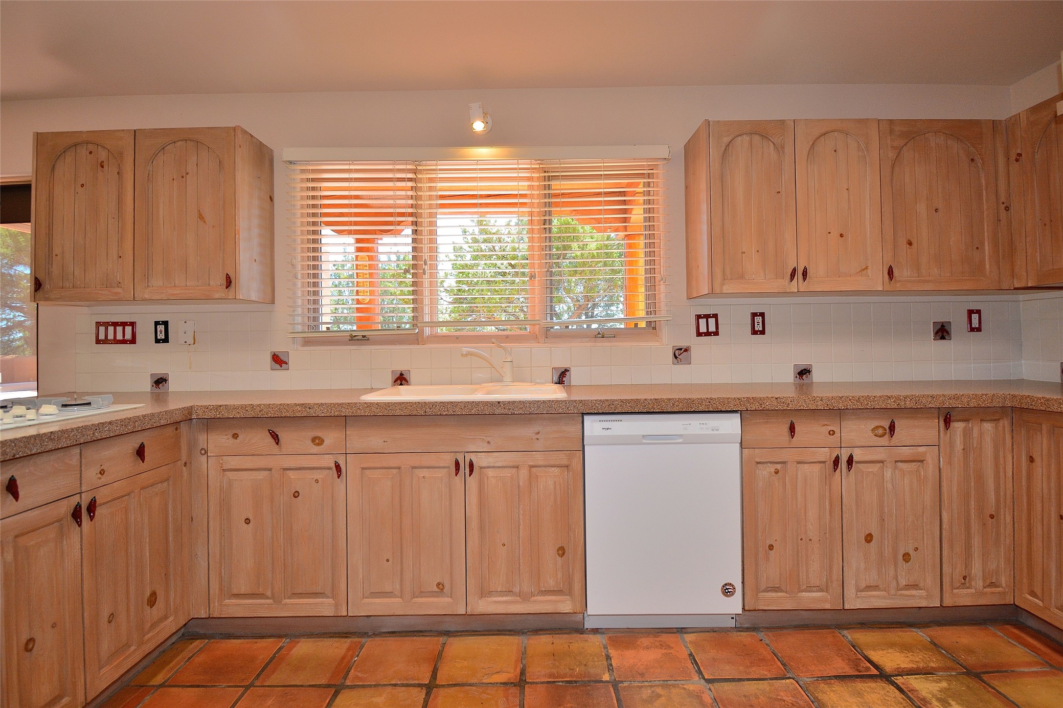 Nestled on two acres dotted with pion and juniper, this inviting Santa Fe-style home blends traditional charm with modern comforts. A gravel driveway leads to a graceful walkway, which in turn leads to a beautifully landscaped, enclosed front yard, The house features plastered walls, and the ground-level floors are adorned with traditional Saltillo tiles, except for the guest bedroom, which has carpet and an en-suite bathroom. The living and dining rooms feature soaring ceilings with vigas. A gas fireplace in the living room adds ambiance during cold winter nights.The kitchen, featuring skylights, granite countertops, and a gas cooktop, microwave, oven, and fridge/freezer, opens to a breakfast nook on one side, complete with its own private patio. Continuing from the breakfast nook, you enter the laundry and then the garage. On the other side of the kitchen is the dining room. The main level also features a second guest room or den with a nearby half-bath. The downstairs has in-floor radiant heat.Upstairs, the spacious main bedroom offers vigas, a second gas fireplace, radiant baseboard heat, and mountain views on one side and a deck on the other. The adjoining bath offers dual sinks, a Jacuzzi-style tub, a shower with seating, and a walk-in cedar closet.A new septic tank was installed in late November 2025With an alarm system and thoughtful storage throughout, this home offers a blend of traditional Santa Fe style and practicality in a serene setting, just a couple of minutes drive to 599 and access to Santa Fe (approx.10 minutes) or to Los Alamos, the Santa Fe airport, and Albuquerque.Adjacent to the subdivision is the La Tierra open space of almost 1500 acres, offering 25 miles of walking trails.