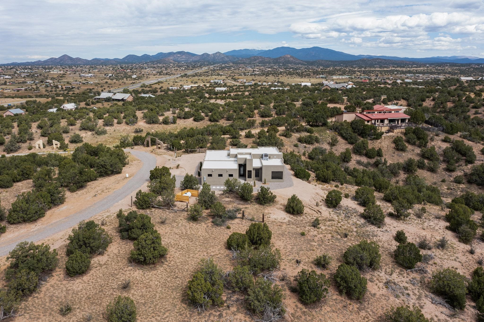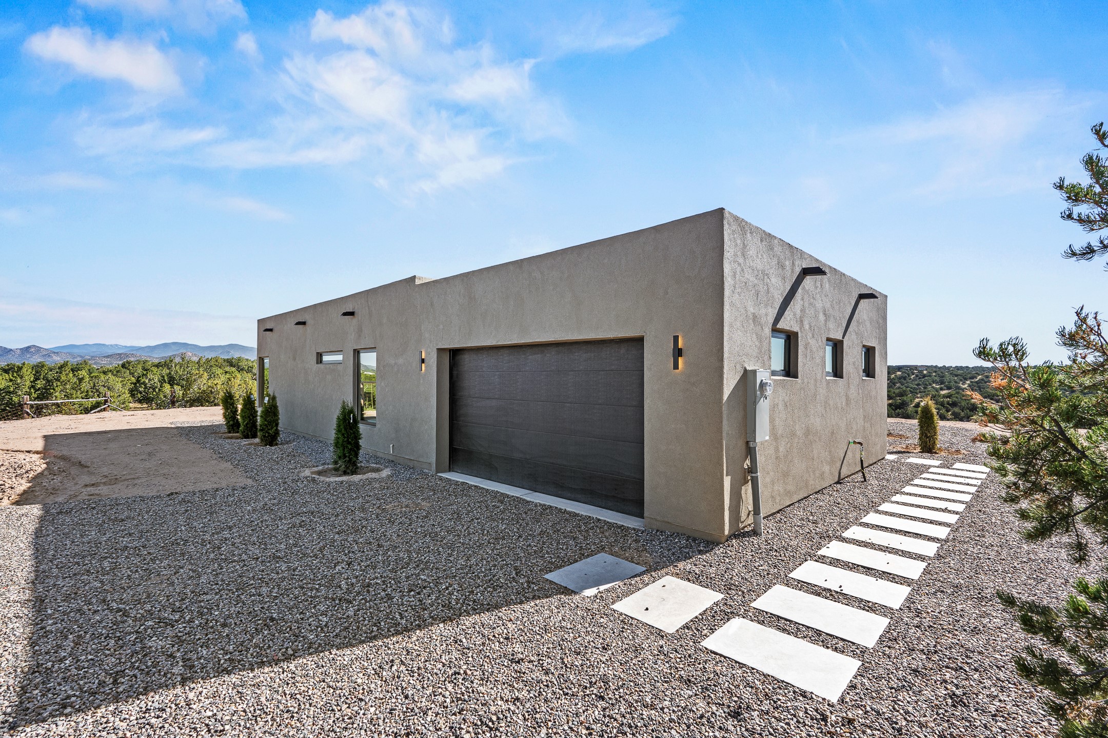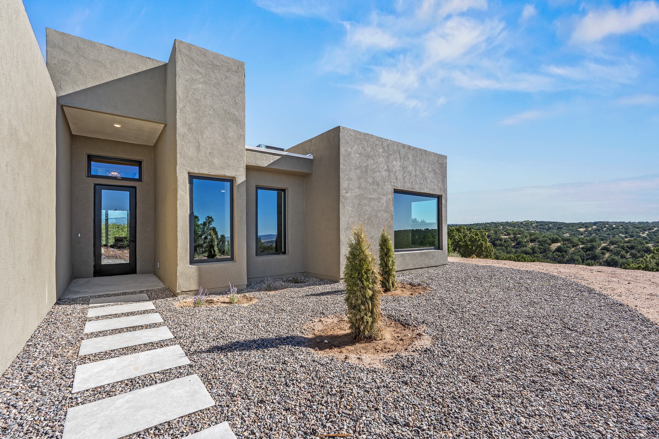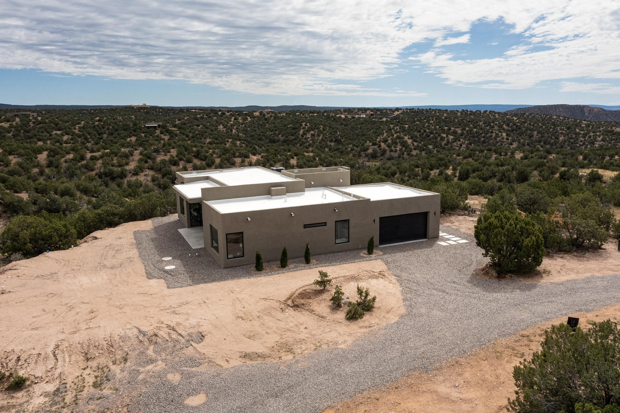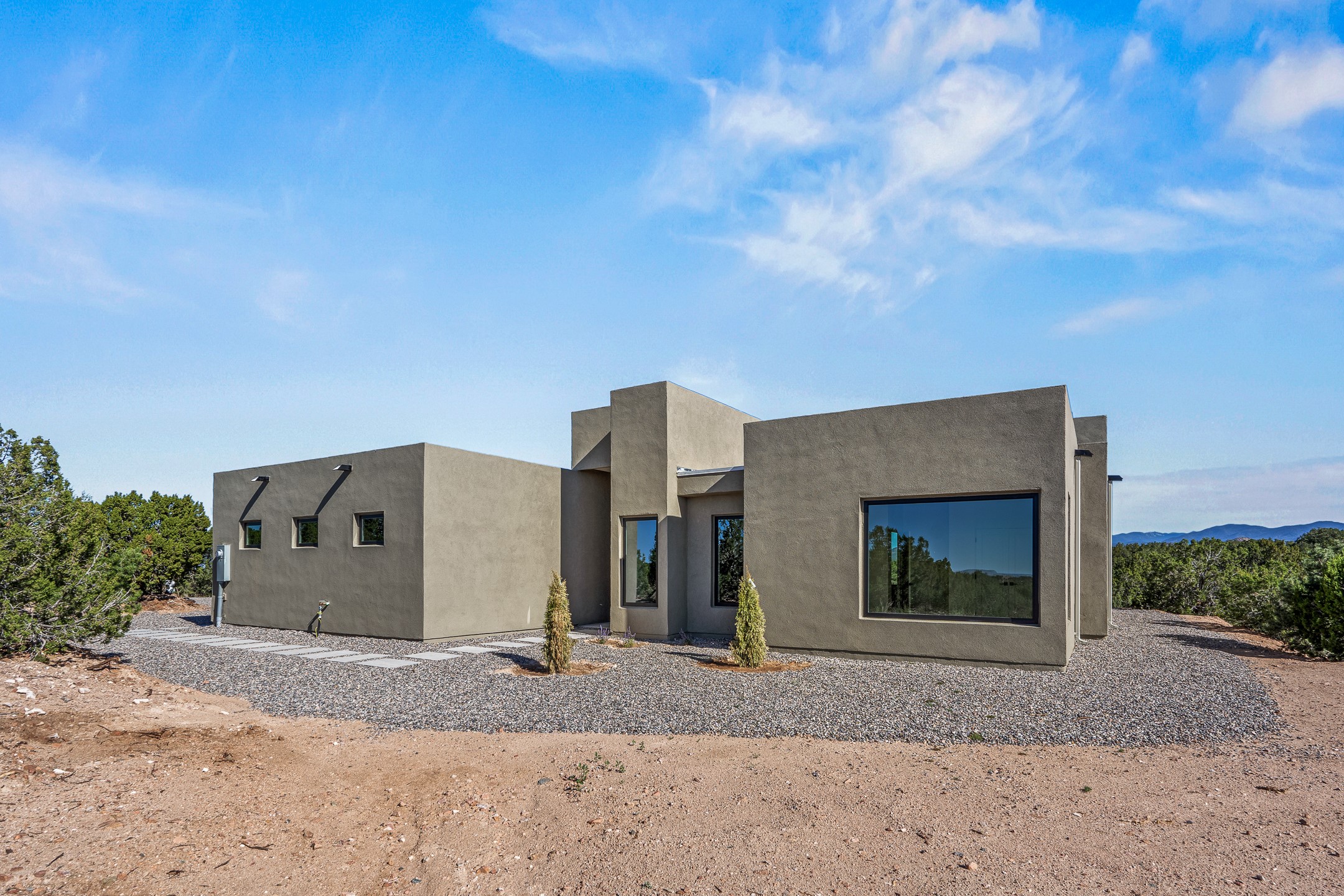 Just completed and ready for occupancy! Mountain views from every window in this new custom built contemporary pueblo style home with open floor plan situated on a huge 10.0 +/- ac. private lot in Lamy. Convenient access to US-285, the Agora shopping center, bank and restaurants. Perfect for indoor and outdoor entertaining. Open kitchen/family/dining room has floor to ceiling windows and double sliding glass doors to take in the fabulous views and access to the portal. The contemporary kitchen has a huge island bar and large walk in pantry. Every room has large picture windows with fabulous mountain views. Owner's bath has double sinks, soaking tub and large walk in shower room with double shower heads and rain showers and a large walk in closet. Home features contemporary style vigas in living areas. Three bedrooms with good separation and 2 baths. A guest house and equestrian structures are allowed, as well as 10 horses or cattle. (1 large animal per acre.) No HOA, recreational vehicles are allowed if parked inconspicuously. Connected to the Eldorado community water system. Located only 20 minutes from Downtown Santa Fe this home offers gorgeous views, rural living and easy access to everything Santa Fe has to offer. This home has it all; new home, fabulous views, great outdoor spaces, contemporary open floor plan, large private lot. Buyer to verify all information and Covenants. Seller gives $4000 credit to the buyer at closing for Range, dishwasher and microwave.