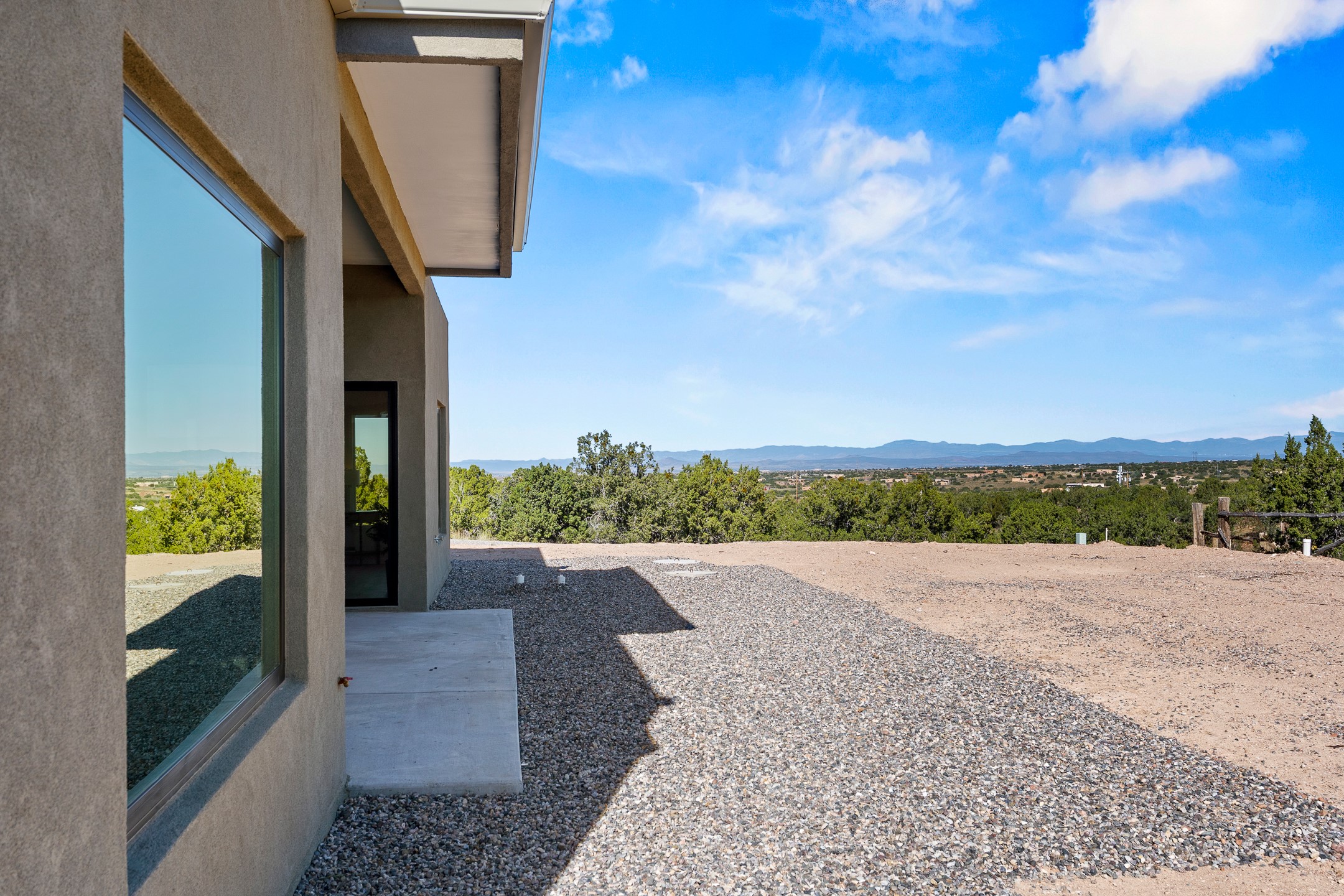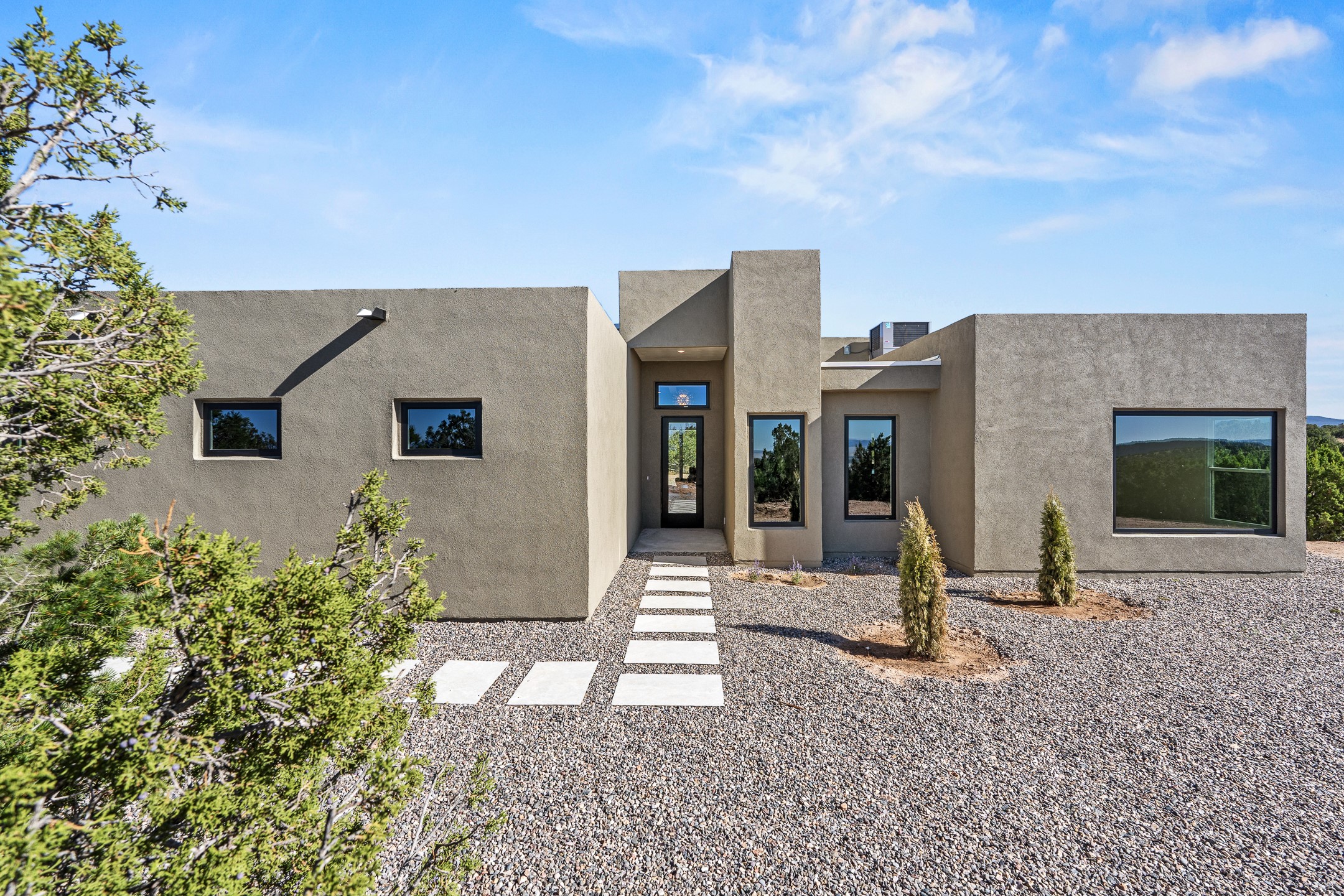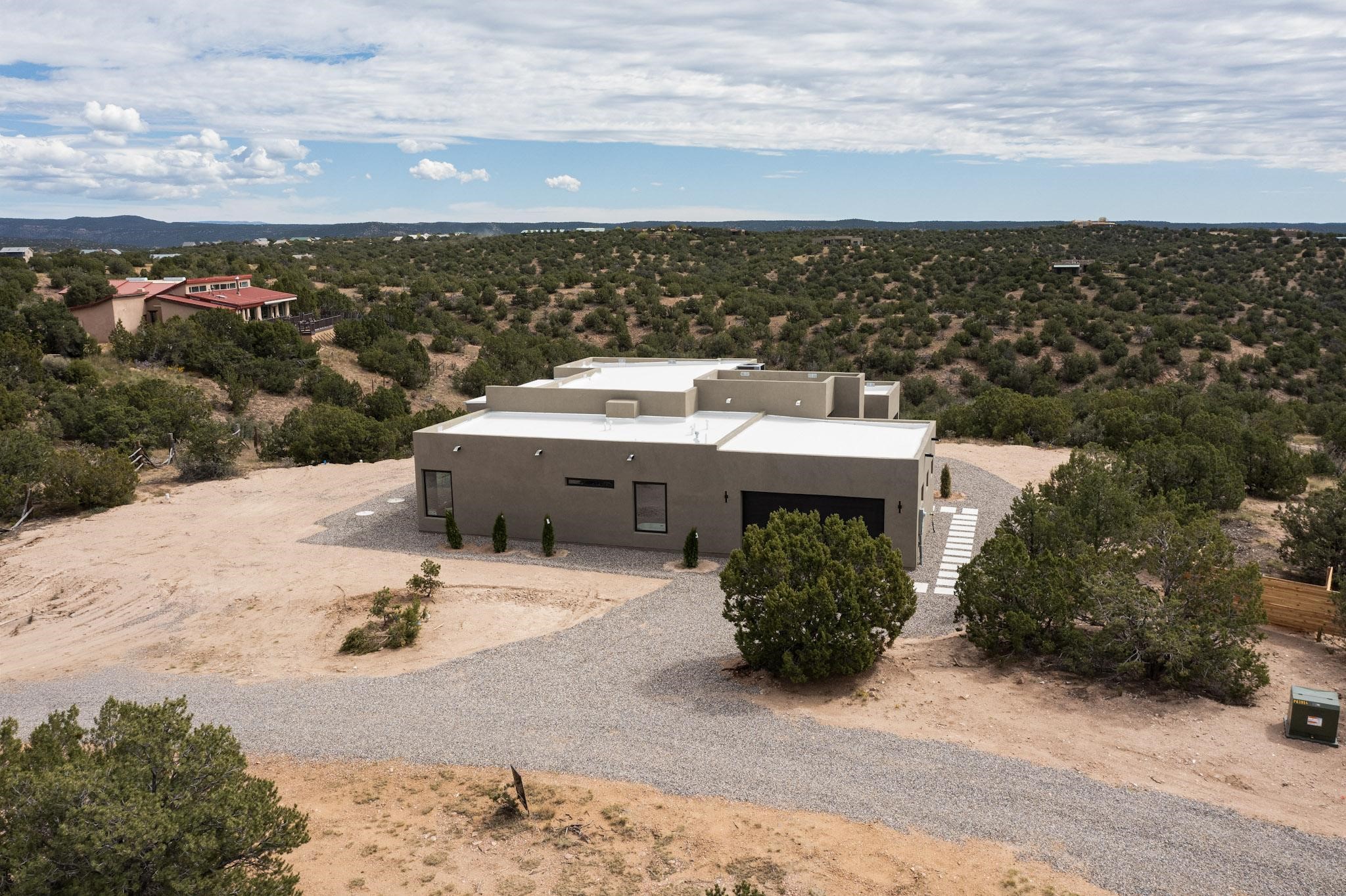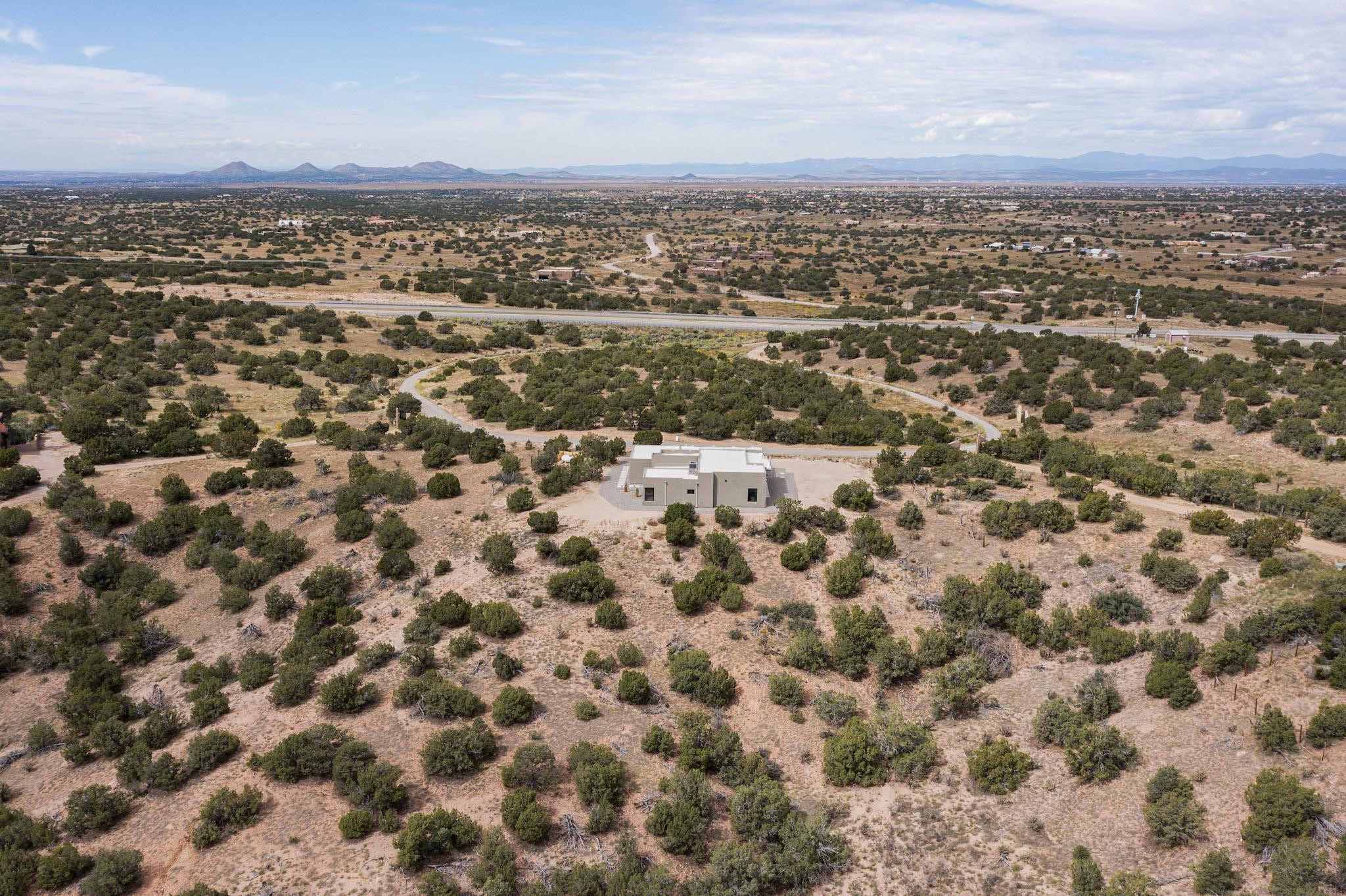 Just completed and ready for occupancy! Mountain views from every window in this new custom built contemporary pueblo style home with open floor plan situated on a huge 10.0 +/- ac. private lot in Lamy. Convenient access to US-285, the Agora shopping center, bank and restaurants. Perfect for indoor and outdoor entertaining. Open kitchen/family/dining room has floor to ceiling windows and double sliding glass doors to take in the fabulous views and access to the portal. The contemporary kitchen has a huge island bar and large walk in pantry. Every room has large picture windows with fabulous mountain views. Owner's bath has double sinks, soaking tub and large walk in shower room with double shower heads and rain showers and a large walk in closet. Home features contemporary style vigas in living areas. Three bedrooms with good separation and 2 baths. A guest house and equestrian structures are allowed, as well as 10 horses or cattle. (1 large animal per acre.) No HOA, recreational vehicles are allowed if parked inconspicuously. Connected to the Eldorado community water system. Located only 20 minutes from Downtown Santa Fe this home offers gorgeous views, rural living and easy access to everything Santa Fe has to offer. This home has it all; new home, fabulous views, great outdoor spaces, contemporary open floor plan, large private lot. Buyer to verify all information and Covenants. Seller gives $4000 credit to the buyer at closing for Range, dishwasher and microwave.