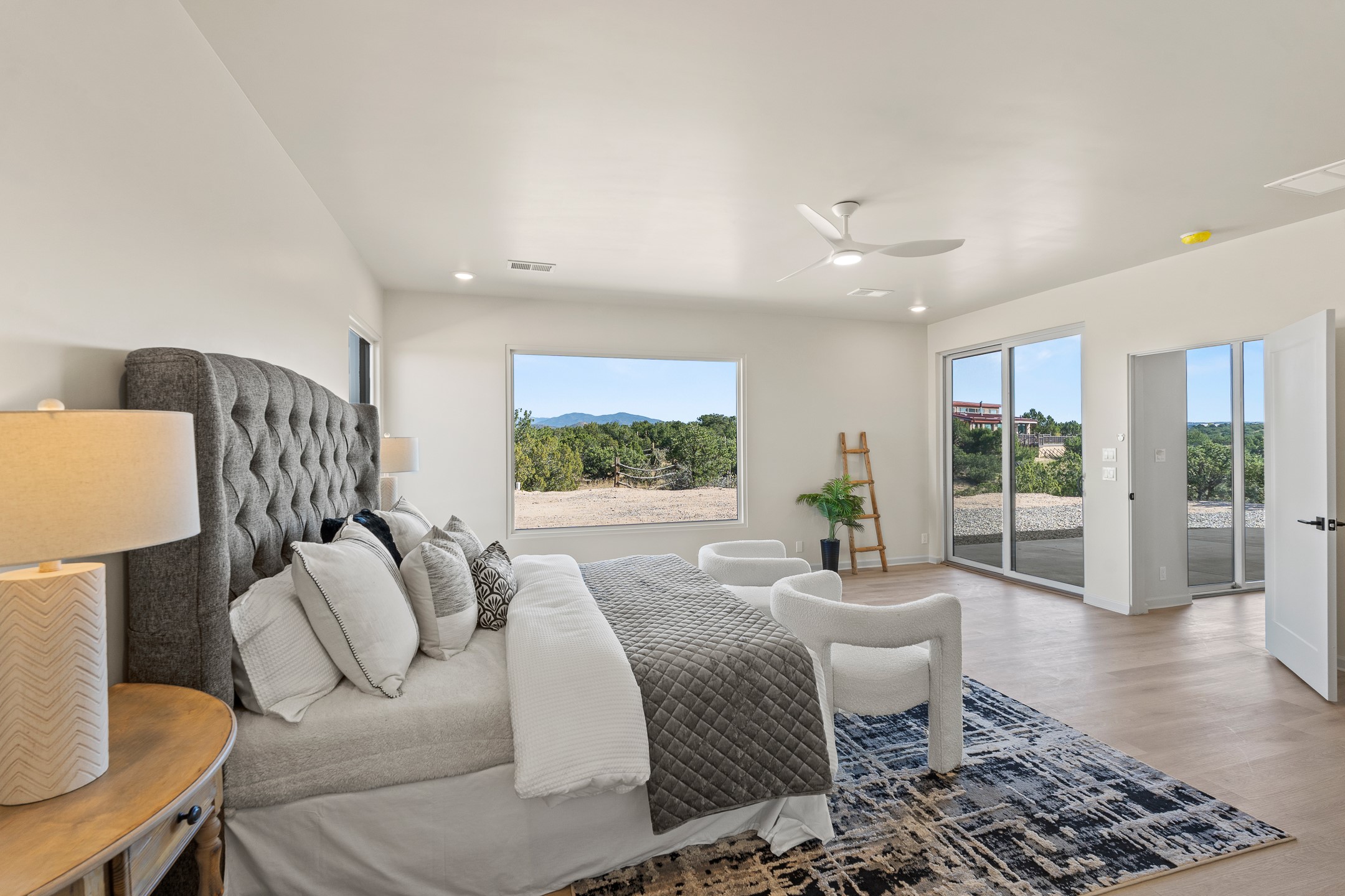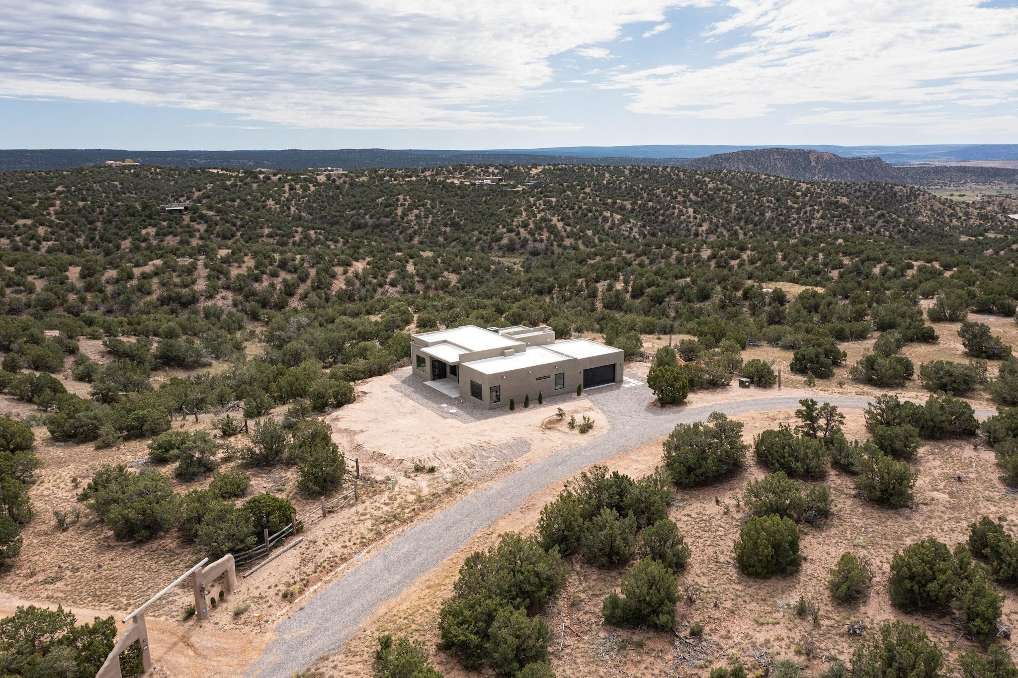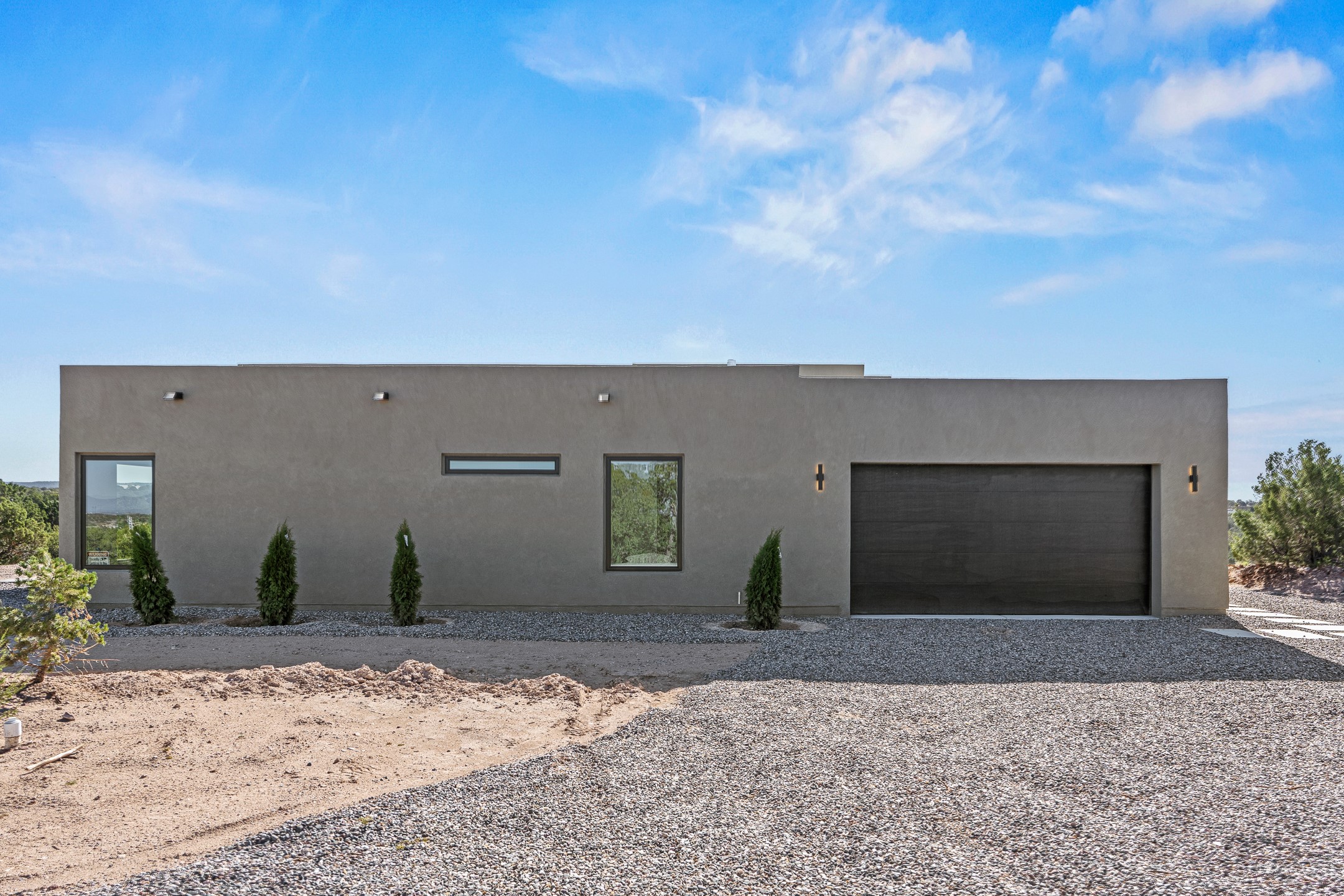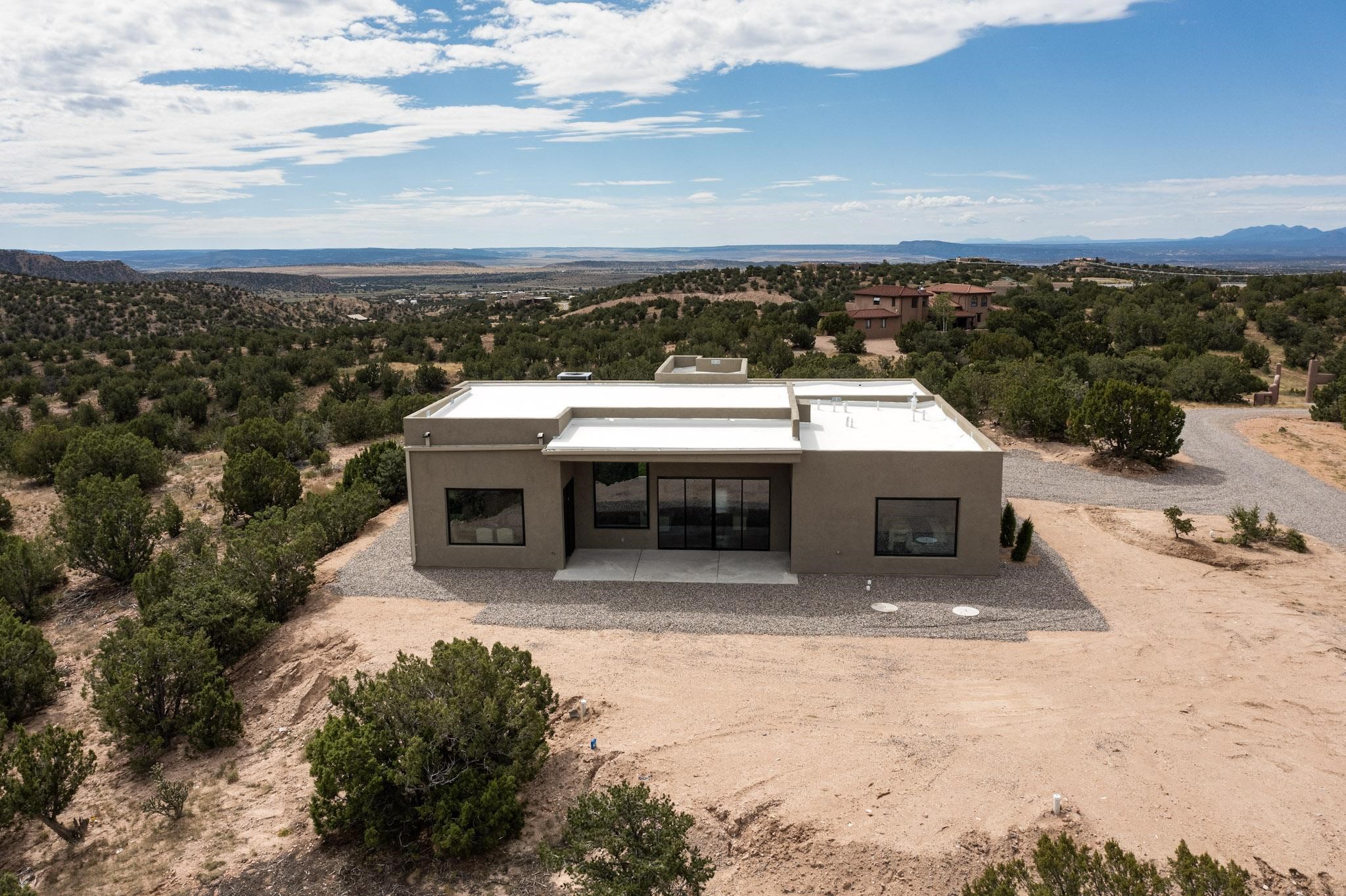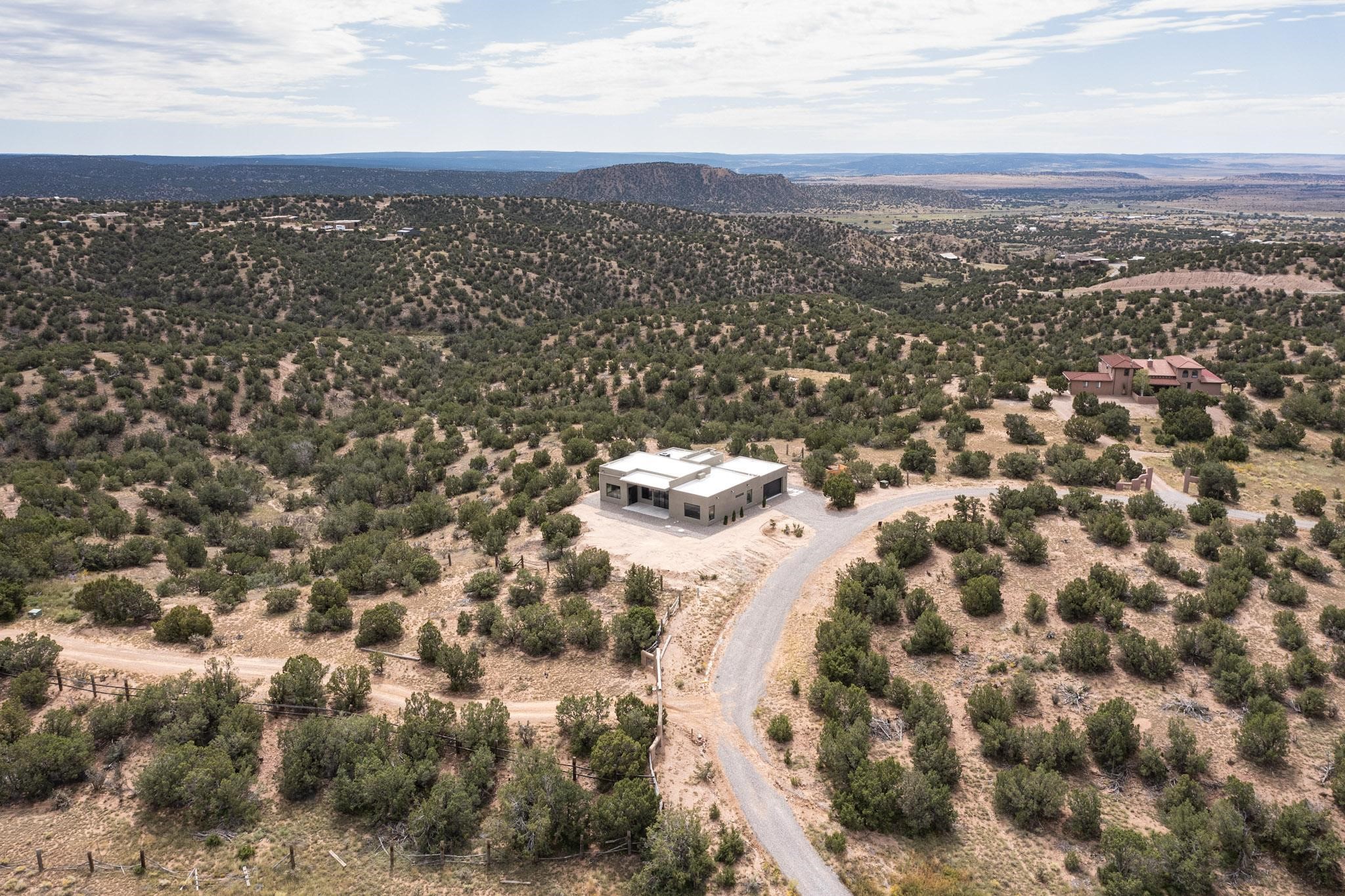 Just completed and ready for occupancy! Mountain views from every window in this new custom built contemporary pueblo style home with open floor plan situated on a huge 10.0 +/- ac. private lot in Lamy. Convenient access to US-285, the Agora shopping center, bank and restaurants. Perfect for indoor and outdoor entertaining. Open kitchen/family/dining room has floor to ceiling windows and double sliding glass doors to take in the fabulous views and access to the portal. The contemporary kitchen has a huge island bar and large walk in pantry. Every room has large picture windows with fabulous mountain views. Owner's bath has double sinks, soaking tub and large walk in shower room with double shower heads and rain showers and a large walk in closet. Home features contemporary style vigas in living areas. Three bedrooms with good separation and 2 baths. A guest house and equestrian structures are allowed, as well as 10 horses or cattle. (1 large animal per acre.) No HOA, recreational vehicles are allowed if parked inconspicuously. Connected to the Eldorado community water system. Located only 20 minutes from Downtown Santa Fe this home offers gorgeous views, rural living and easy access to everything Santa Fe has to offer. This home has it all; new home, fabulous views, great outdoor spaces, contemporary open floor plan, large private lot. Buyer to verify all information and Covenants. Seller gives $4000 credit to the buyer at closing for Range, dishwasher and microwave.