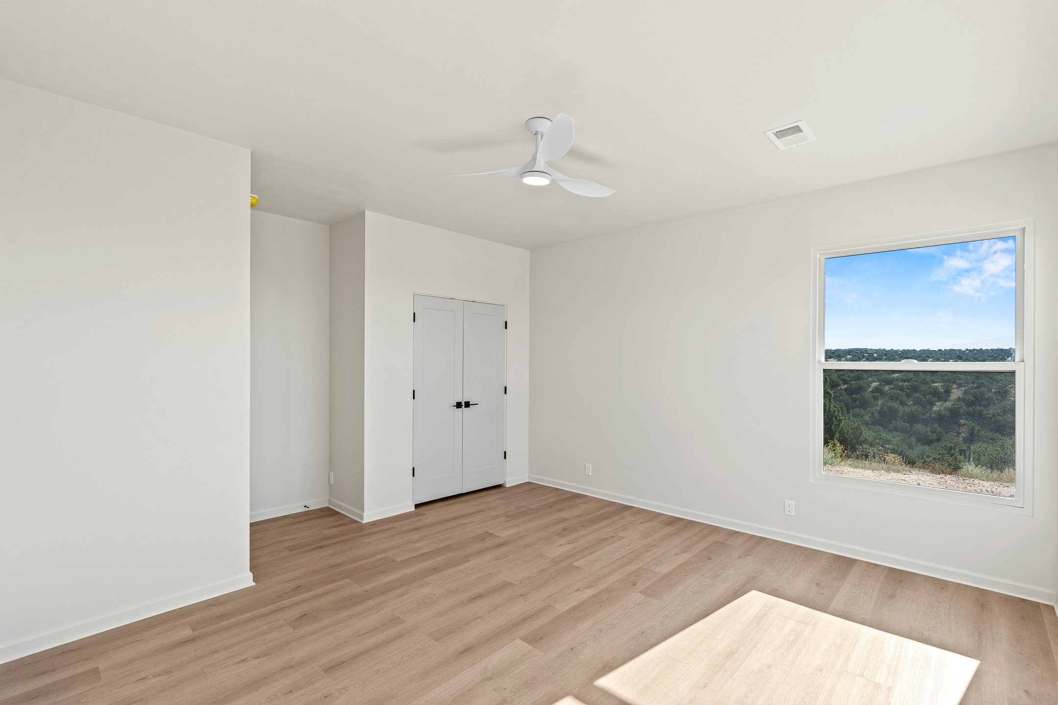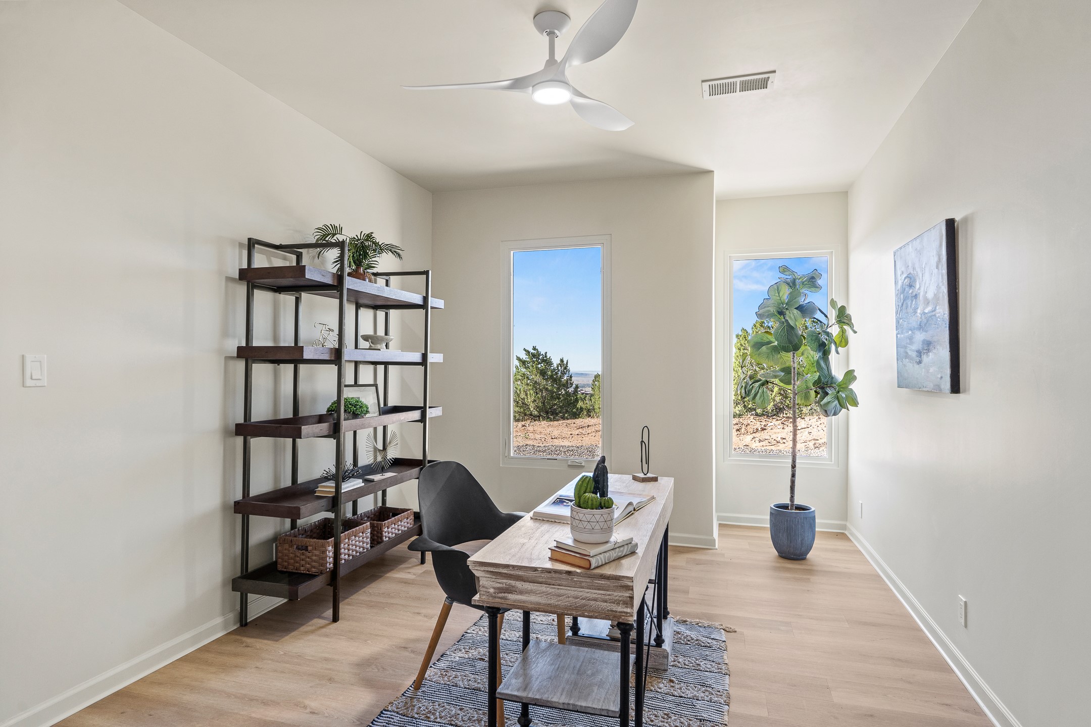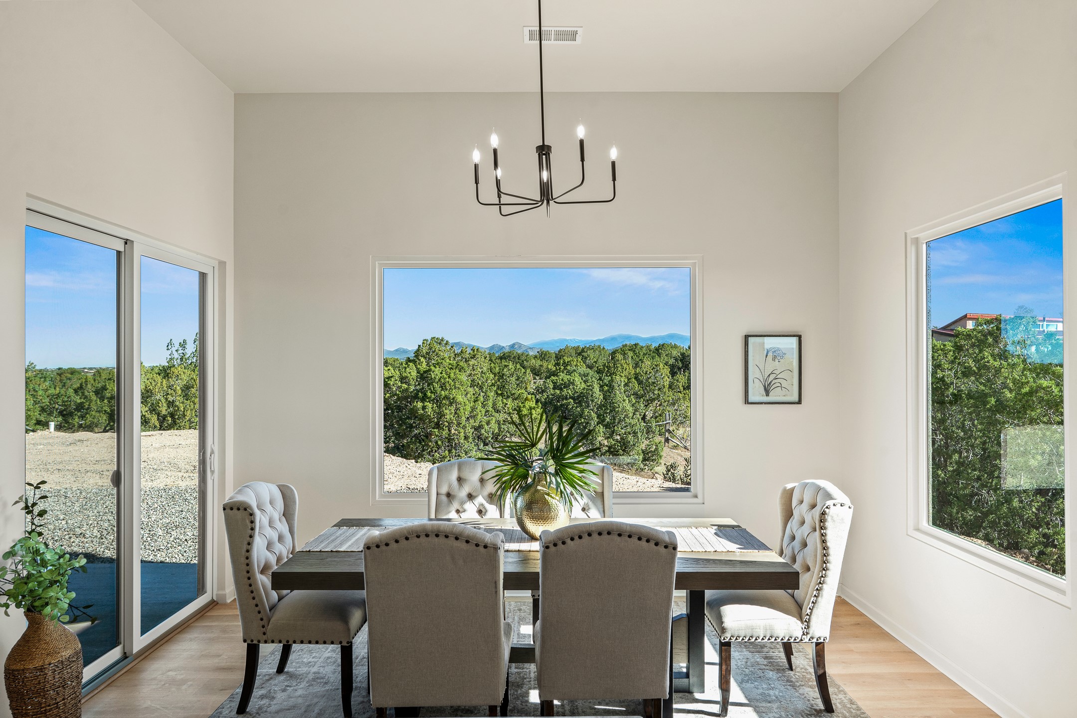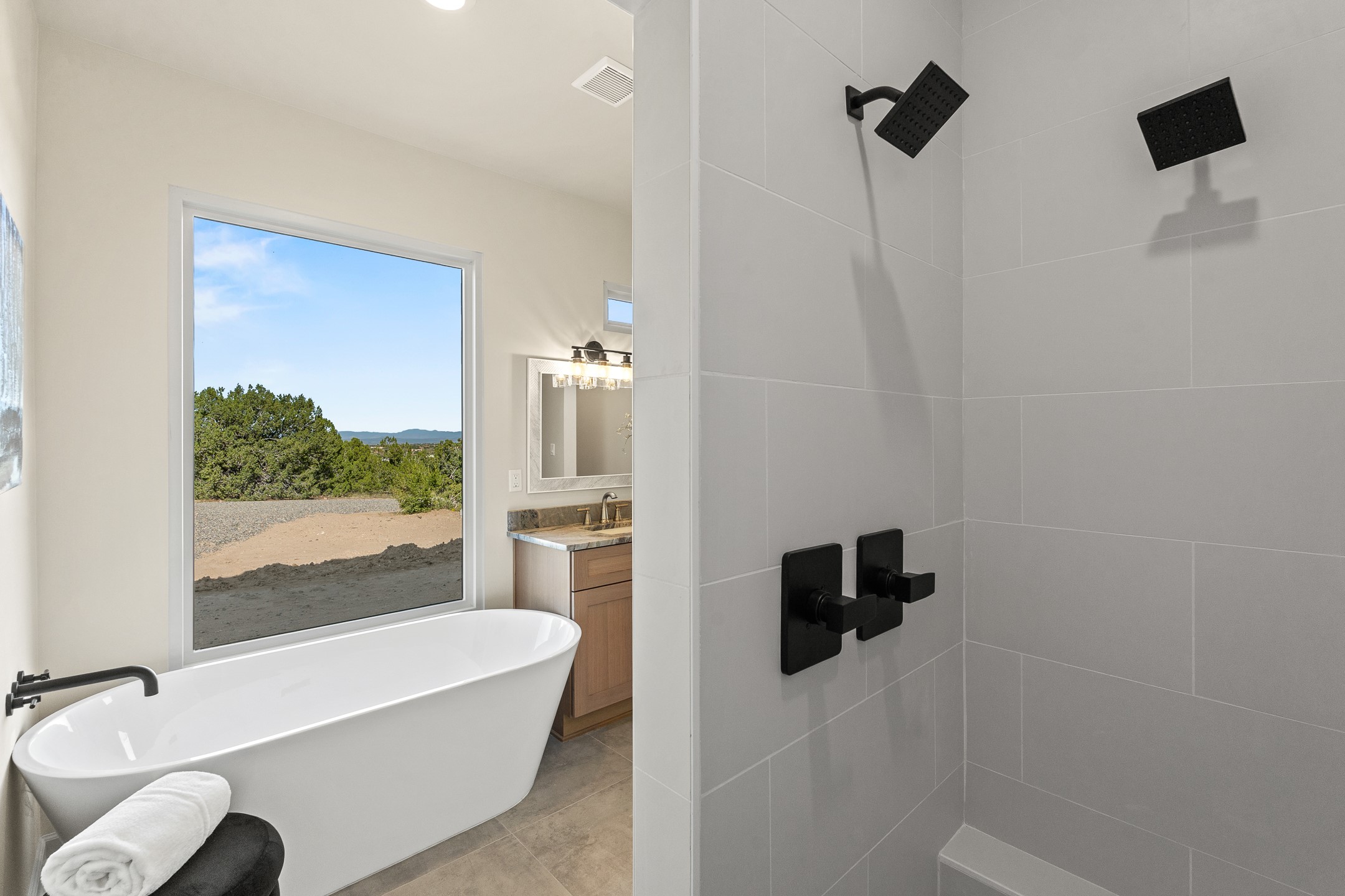 Just completed and ready for occupancy! Mountain views from every window in this new custom built contemporary pueblo style home with open floor plan situated on a huge 10.0 +/- ac. private lot in Lamy. Convenient access to US-285, the Agora shopping center, bank and restaurants. Perfect for indoor and outdoor entertaining. Open kitchen/family/dining room has floor to ceiling windows and double sliding glass doors to take in the fabulous views and access to the portal. The contemporary kitchen has a huge island bar and large walk in pantry. Every room has large picture windows with fabulous mountain views. Owner's bath has double sinks, soaking tub and large walk in shower room with double shower heads and rain showers and a large walk in closet. Home features contemporary style vigas in living areas. Three bedrooms with good separation and 2 baths. A guest house and equestrian structures are allowed, as well as 10 horses or cattle. (1 large animal per acre.) No HOA, recreational vehicles are allowed if parked inconspicuously. Connected to the Eldorado community water system. Located only 20 minutes from Downtown Santa Fe this home offers gorgeous views, rural living and easy access to everything Santa Fe has to offer. This home has it all; new home, fabulous views, great outdoor spaces, contemporary open floor plan, large private lot. Buyer to verify all information and Covenants. Seller gives $4000 credit to the buyer at closing for Range, dishwasher and microwave.