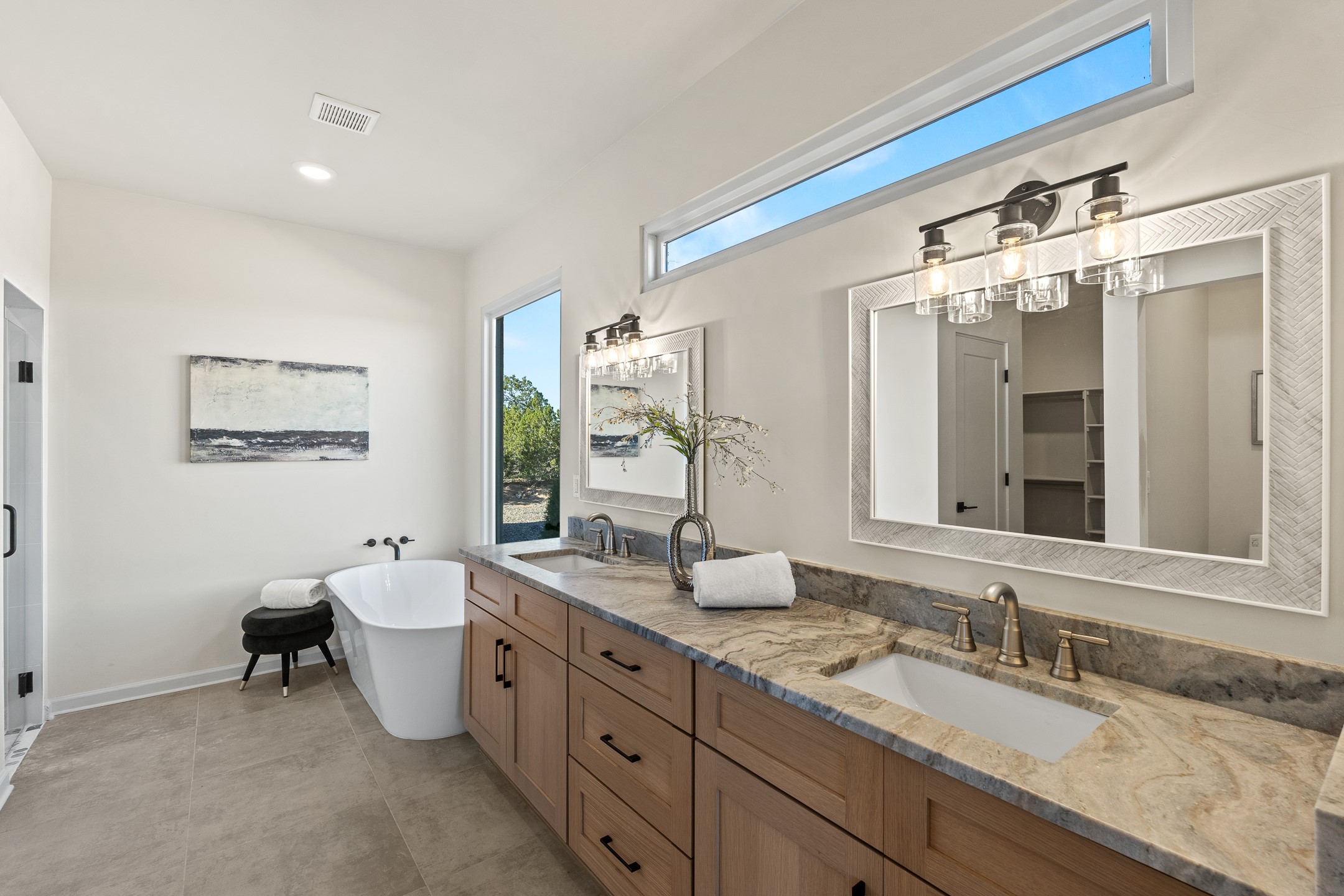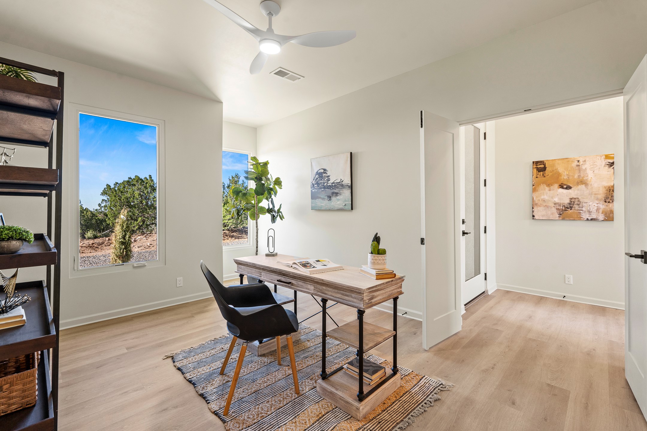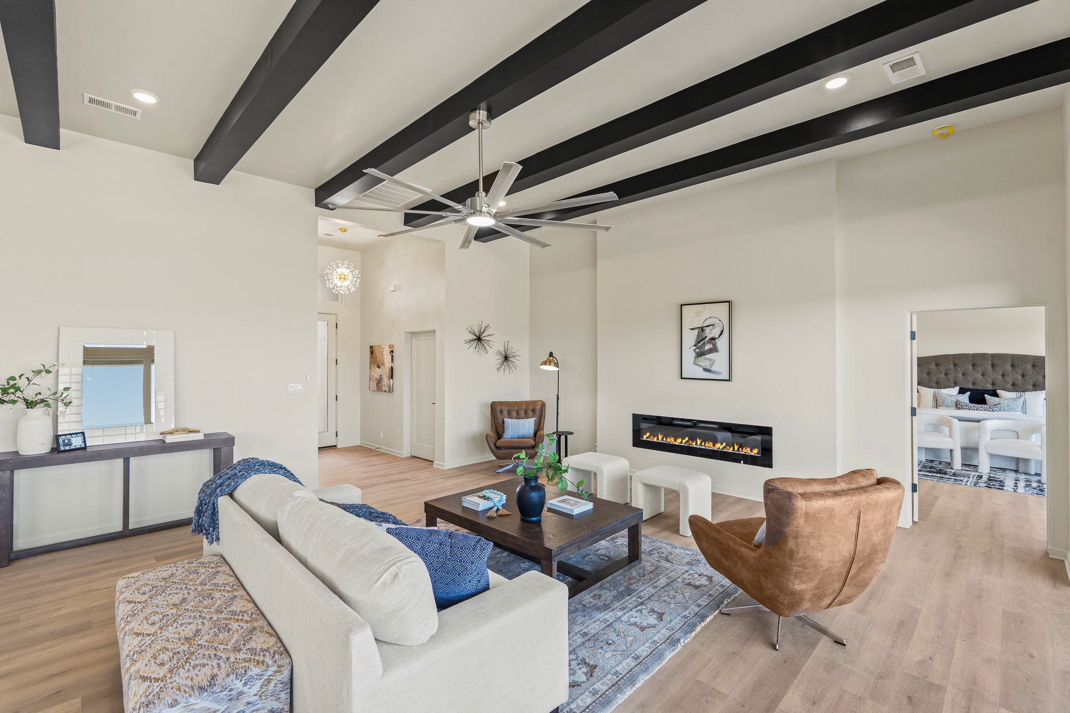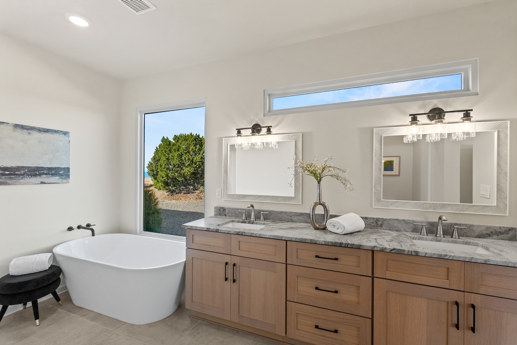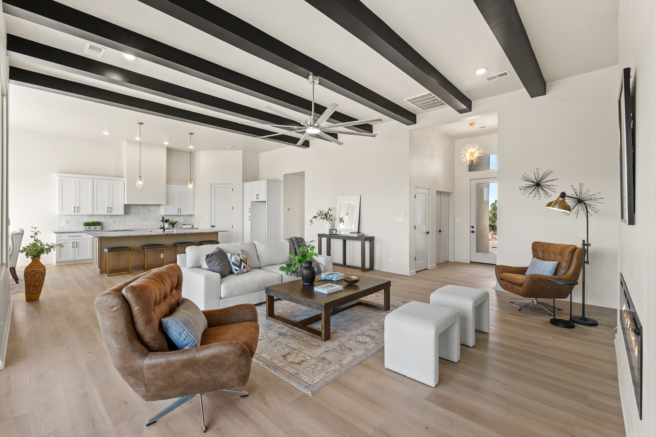Just completed and ready for occupancy! Mountain views from every window in this new custom built contemporary pueblo style home with open floor plan situated on a huge 10.0 +/- ac. private lot in Lamy. Convenient access to US-285, the Agora shopping center, bank and restaurants. Perfect for indoor and outdoor entertaining. Open kitchen/family/dining room has floor to ceiling windows and double sliding glass doors to take in the fabulous views and access to the portal. The contemporary kitchen has a huge island bar and large walk in pantry. Every room has large picture windows with fabulous mountain views. Owner's bath has double sinks, soaking tub and large walk in shower room with double shower heads and rain showers and a large walk in closet. Home features contemporary style vigas in living areas. Three bedrooms with good separation and 2 baths. A guest house and equestrian structures are allowed, as well as 10 horses or cattle. (1 large animal per acre.) No HOA, recreational vehicles are allowed if parked inconspicuously. Connected to the Eldorado community water system. Located only 20 minutes from Downtown Santa Fe this home offers gorgeous views, rural living and easy access to everything Santa Fe has to offer. This home has it all; new home, fabulous views, great outdoor spaces, contemporary open floor plan, large private lot. Buyer to verify all information and Covenants. Seller gives $4000 credit to the buyer at closing for Range, dishwasher and microwave.