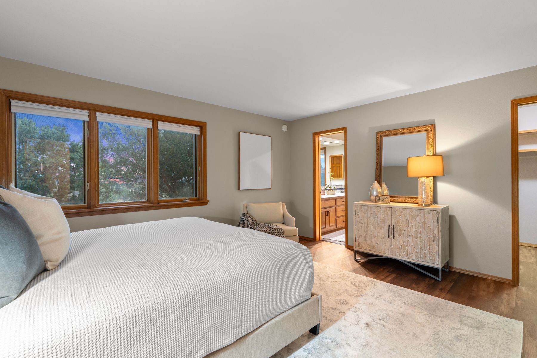Enjoy mountain views and unforgettable sunset skies from this single-level home in desirable Arroyo Hondo West. Designed to capture natural light and scenic vistas, this inviting residence blends Santa Fe charm with modern updates. The spacious living room features soaring beamed ceilings, a classic fireplace, Saltillo tile floors, warm wood trim and built-in shelving for an open yet welcoming feel. The updated kitchen offers butcher block counters, stainless appliances, upgraded lighting and a wine fridge, flowing easily into the dining and den areas that open to a serene patio. The primary suite is a peaceful haven with a walk-in closet, double vanity and step-in shower. Set on expansive acreage with sweeping views, the property invites outdoor living, gardening or future expansion. Located in a quiet, established neighborhood just moments from the Rail Trail and about 15 minutes from the Plaza, this home combines tranquility and convenience.