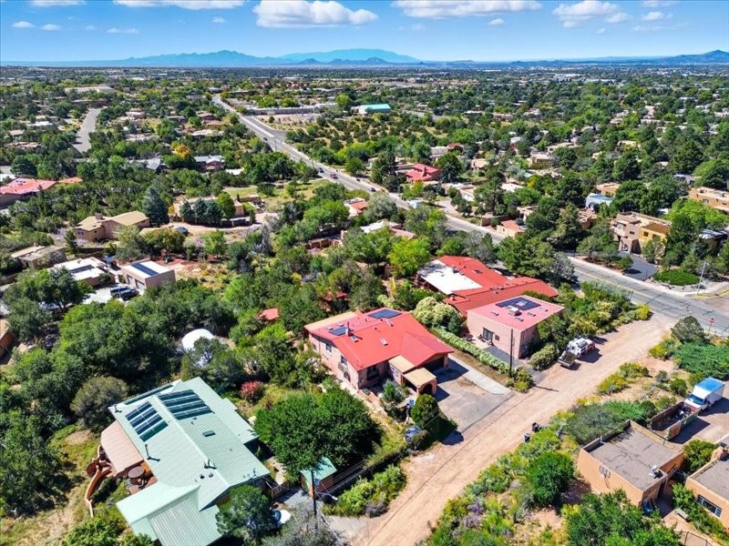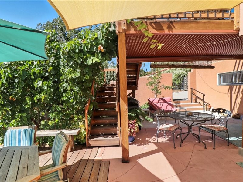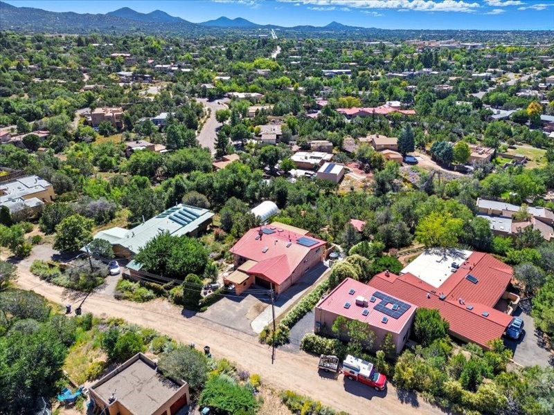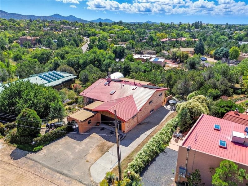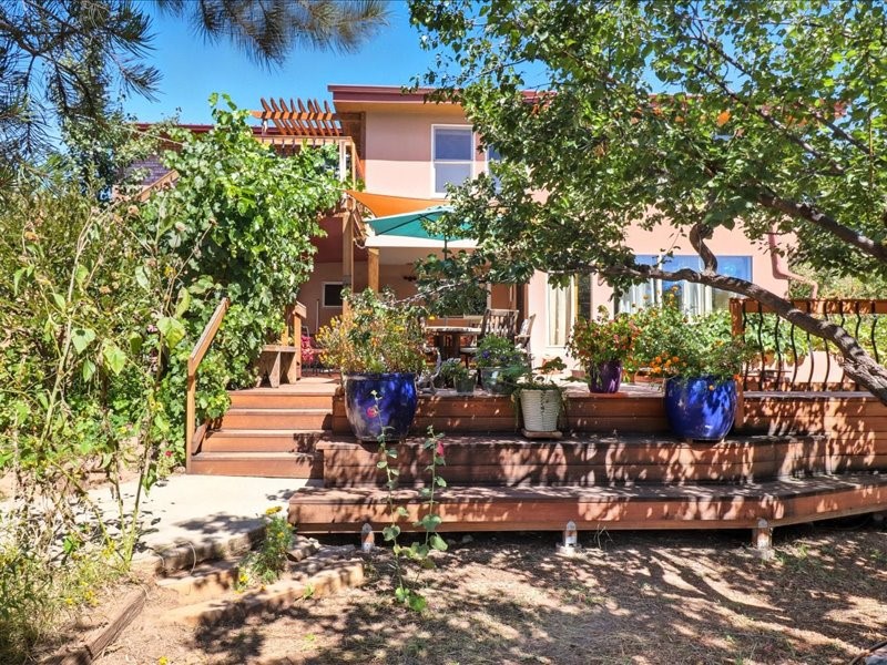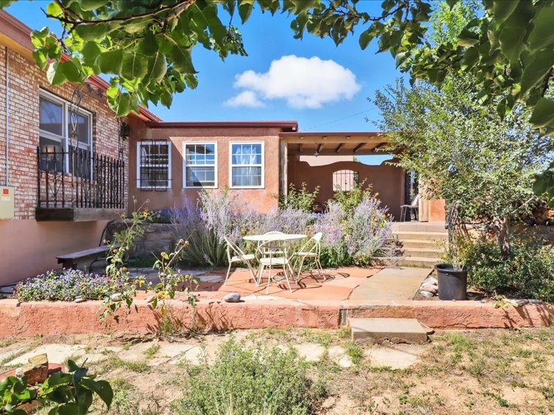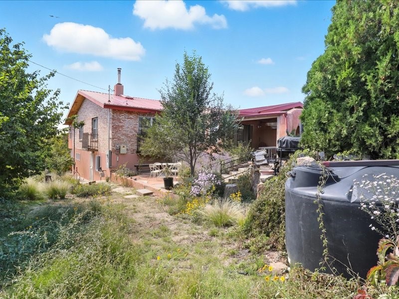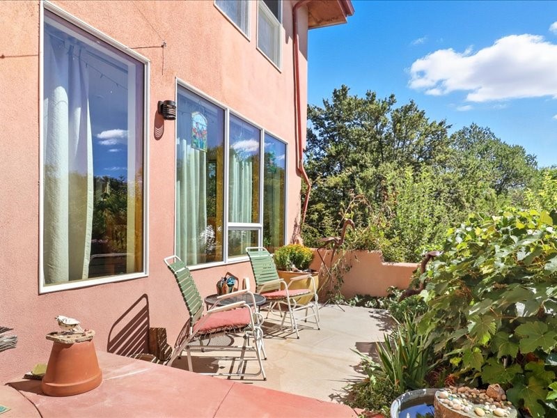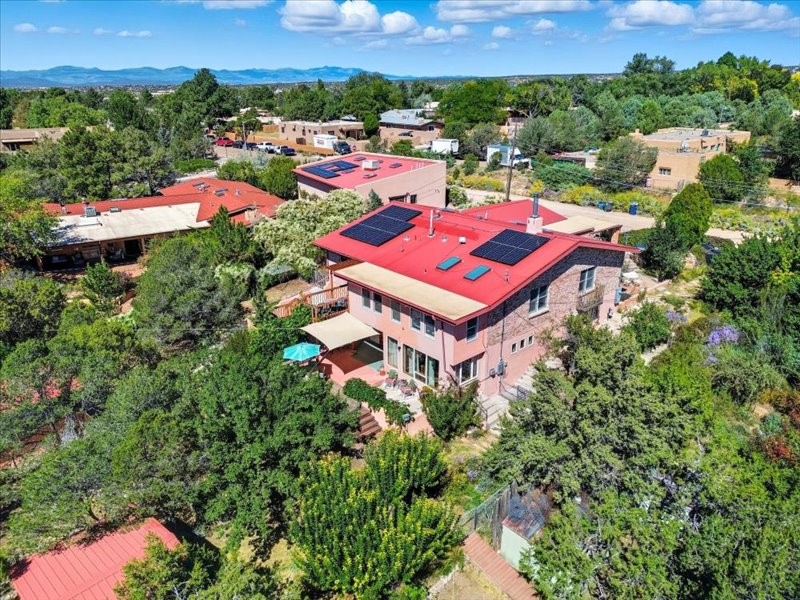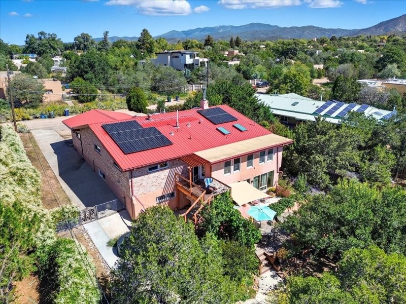 Welcome to this exceptional Santa Fe property, where classic brick construction meets timeless character and thoughtful updates. With 3242 sq ft of well-designed space, the property offers two connected but separate living quarters plus a charming studio, ideal for multigenerational living, rental income, or guest accommodations. Set on a lush lot, this is a true garden sanctuary, boasting a pitched metal roof, inviting brick exterior, fruit trees, greenhouse, water rights, and both city and well water. Multiple porches and patios extend the living space outdoors, perfect for enjoying Santa Fe's blue skies, and endless sunsets. A grey water system nourishes the gardens, while solar panels add efficiency. The upper 3-bedroom residence offers soaring ceilings with wood beams, recessed lighting, windows framing mountain views, and a striking interior rock wall with wood stove, brings rustic charm. Tile and laminate floors flow throughout. The primary suite features a full bath, while a second bath serves guests. A south-facing porch captures warmth and light.The lower 3-bedroom residence highlights warm wood details, butcher block and steel counters, and new windows. The main suite has a walk-in closet, patio access, and en-suite bath. Multiple heating zones, gas stove, and ceiling fans ensure year-round comfort. Additional highlights include 6 heat zones, rental history, and a flexible design perfect for live/rent or guest accommodations. There is also plenty of land to build an accessory dwelling unit. A separate utility meter enhances rental potential. Completing the property is a detached studio, perfect for an artist studio or private retreat. With its brick exterior, solar power, greenhouse, gardens, fruit trees, patios, hot tub, 2 car garage, ample storage, and mountain views, this home embodies the Santa Fe lifestyle. Whether envisioned as a family compound, income-producing property, or serene retreat, it offers unmatched character, flexibility, and lasting value.