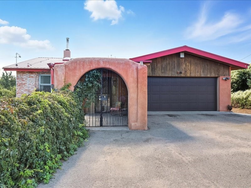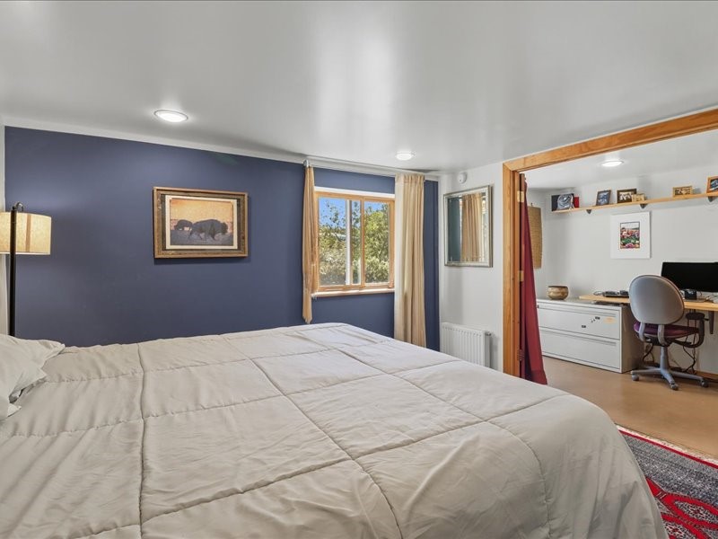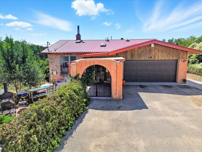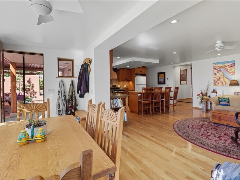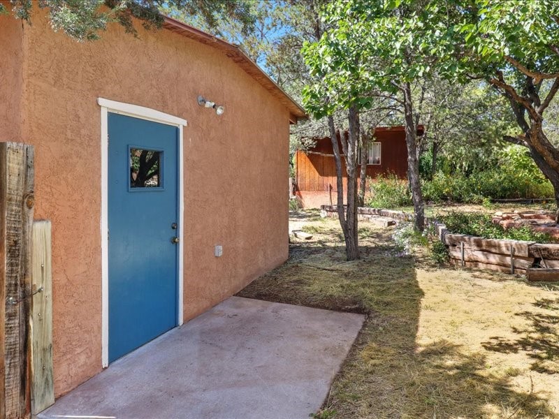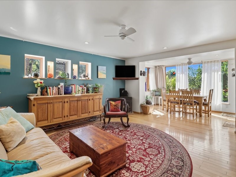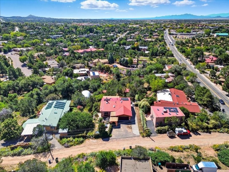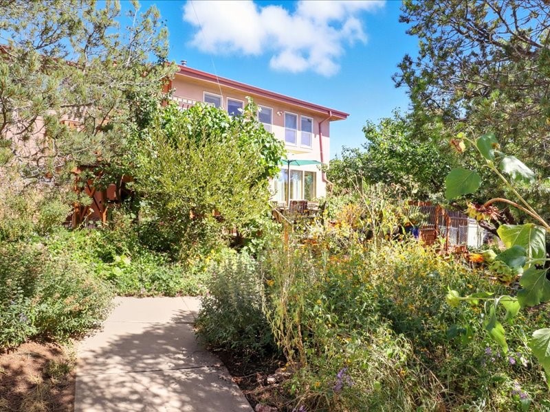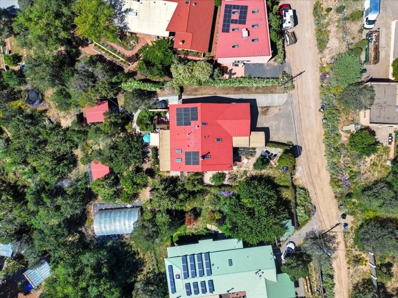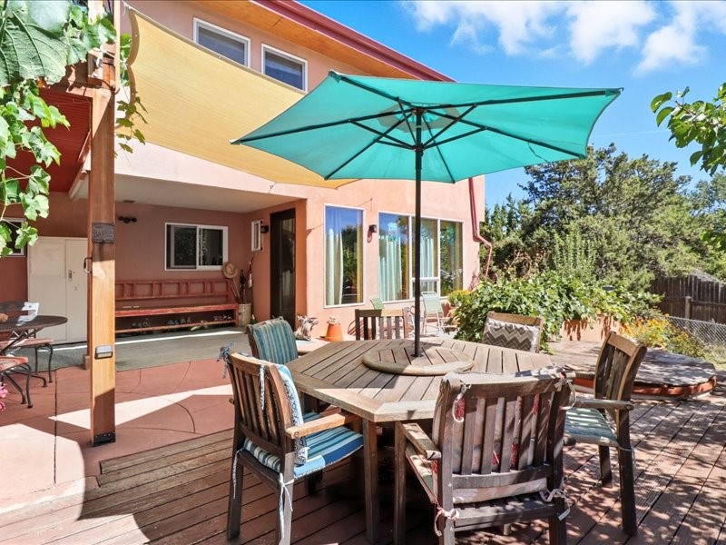 Welcome to this exceptional Santa Fe property, where classic brick construction meets timeless character and thoughtful updates. With 3242 sq ft of well-designed space, the property offers two connected but separate living quarters plus a charming studio, ideal for multigenerational living, rental income, or guest accommodations. Set on a lush lot, this is a true garden sanctuary, boasting a pitched metal roof, inviting brick exterior, fruit trees, greenhouse, water rights, and both city and well water. Multiple porches and patios extend the living space outdoors, perfect for enjoying Santa Fe's blue skies, and endless sunsets. A grey water system nourishes the gardens, while solar panels add efficiency. The upper 3-bedroom residence offers soaring ceilings with wood beams, recessed lighting, windows framing mountain views, and a striking interior rock wall with wood stove, brings rustic charm. Tile and laminate floors flow throughout. The primary suite features a full bath, while a second bath serves guests. A south-facing porch captures warmth and light.The lower 3-bedroom residence highlights warm wood details, butcher block and steel counters, and new windows. The main suite has a walk-in closet, patio access, and en-suite bath. Multiple heating zones, gas stove, and ceiling fans ensure year-round comfort. Additional highlights include 6 heat zones, rental history, and a flexible design perfect for live/rent or guest accommodations. There is also plenty of land to build an accessory dwelling unit. A separate utility meter enhances rental potential. Completing the property is a detached studio, perfect for an artist studio or private retreat. With its brick exterior, solar power, greenhouse, gardens, fruit trees, patios, hot tub, 2 car garage, ample storage, and mountain views, this home embodies the Santa Fe lifestyle. Whether envisioned as a family compound, income-producing property, or serene retreat, it offers unmatched character, flexibility, and lasting value.