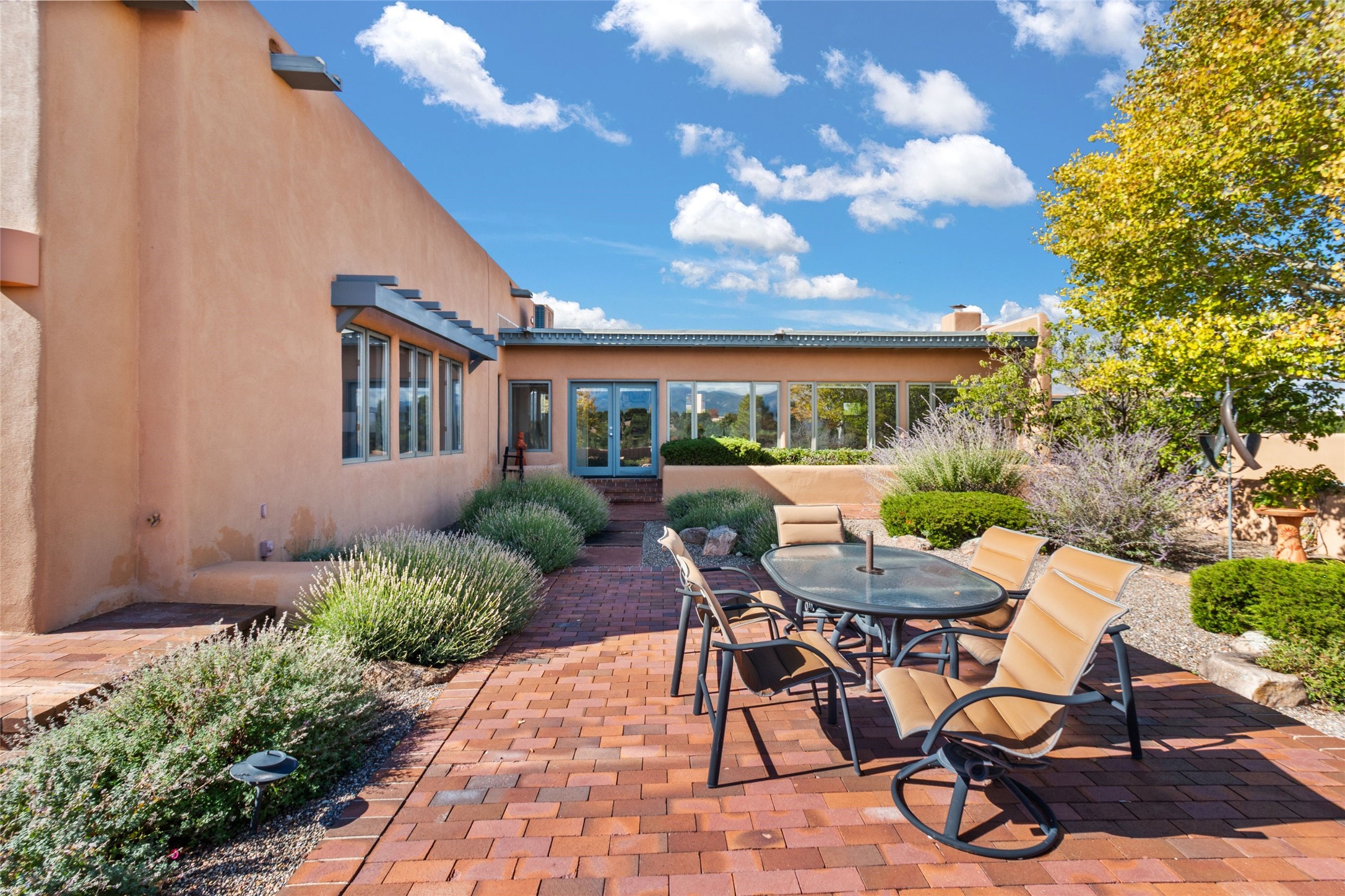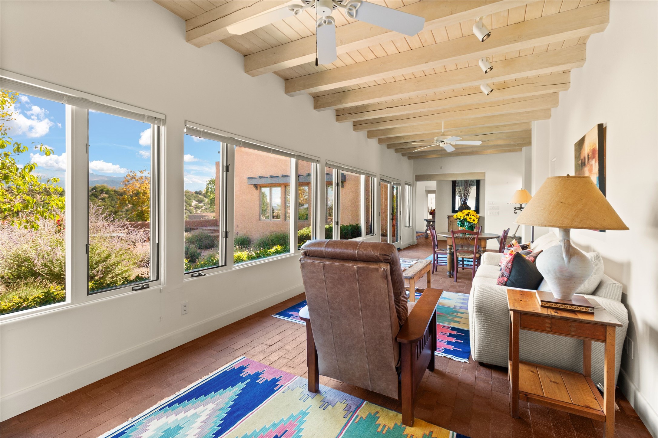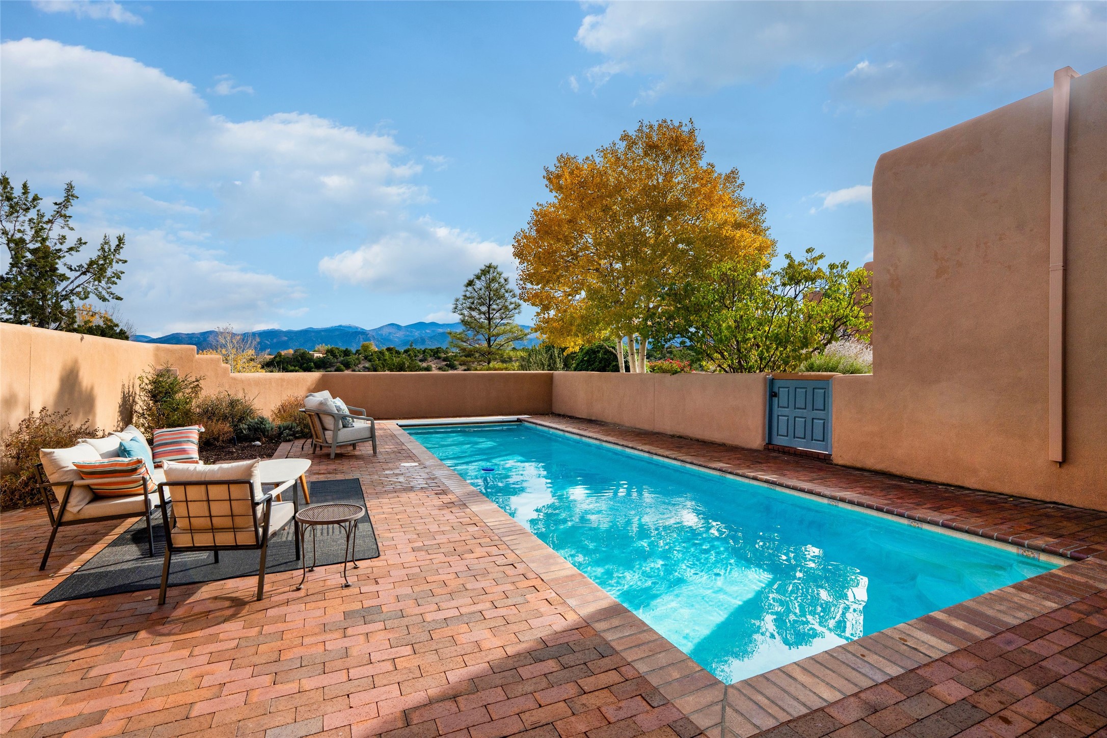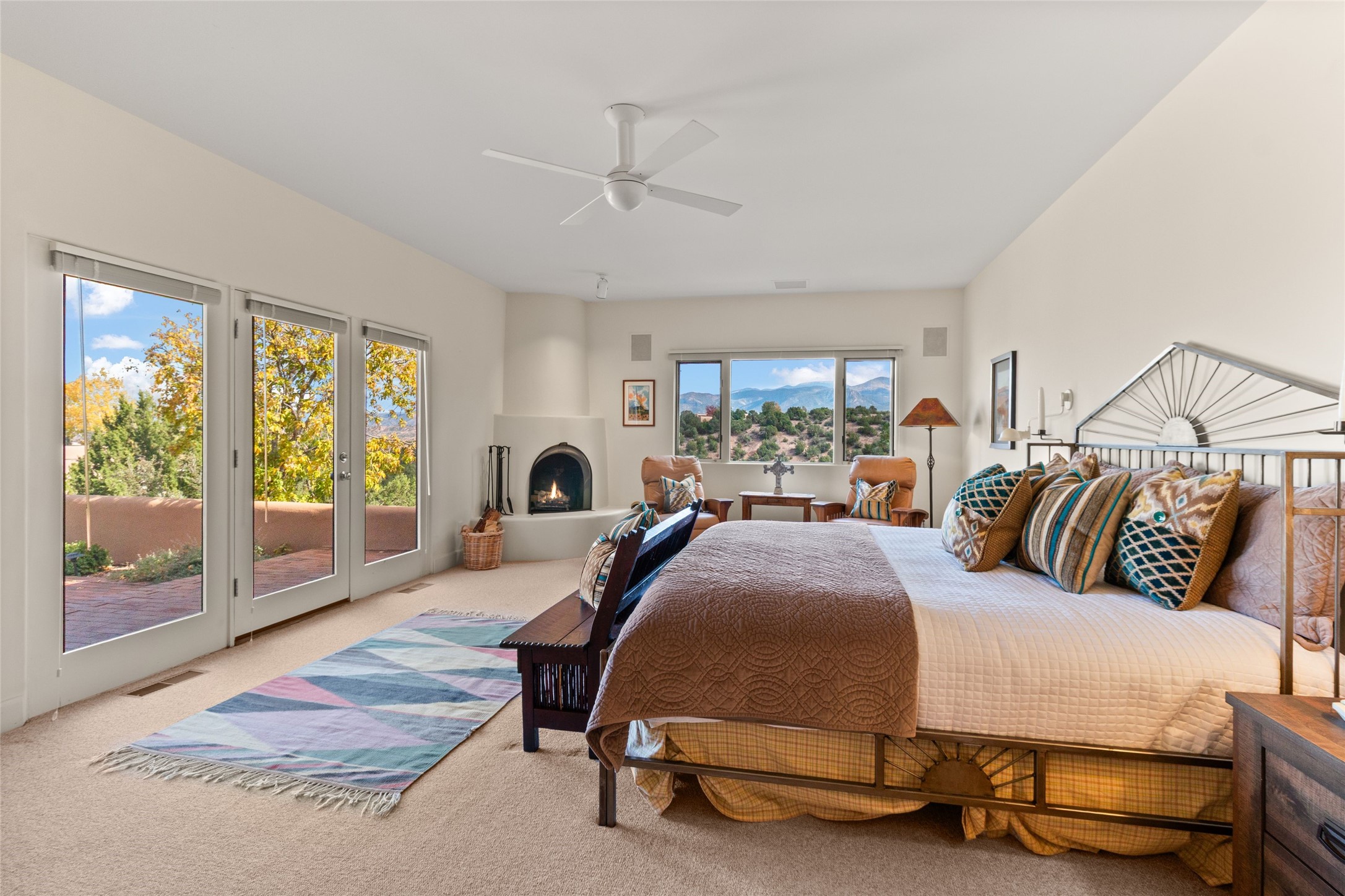The story goes that when John Crosby (the original developer and founder of the Santa Fe Opera) chose a lot for their model, he chose this interior Casas de San Juan lot due to it's seclusion, privacy, and spectacular views. The main house, separate guest house, and heated swimming pool are singular in the condominium configuration in the subdivision. The living room features a high ceiling and glass window wall the inspire "Wow" when one walks in the home...it also features a wet bar, corner kiva fireplace, and a wall for media. The newly installed/renovated kitchen (by renowned kitchen designer Jeanne') features stone counter tops, Sub-Zero and Kitchen Aid appliances with a range/oven and a 2nd oven for big togethers. The kitchen space features high ceilings and lots of light. The over-sized Primary suite again features the views, a corner kiva fireplace, and a beautifully renovated full bath with separate tub and shower. The second large bedroom suite is on the other end of the home for privacy, and the home is rounded out by a 3rd bedroom and hallway full bath. The separate guest house sits atop the garage and is a welcome retreat from the main house with lots of space, privacy and comfort. To the east of the main part of the home is a large courtyard/garden area that provides plenty of options for outdoor living. And the large lap pool (41 x 12) sits to the north and is fenced in with a cabana, kiva fireplace and a barbecue area. The home has forced air heat and refrigerated air conditioning, w/ supplemental heat & AC via mini-split in the north bedroom suite and in the guest house. The home has a wired sound system, and utilizes a shared well and septic via the HOA. Casas de San Juan is a gated subdivision accessed by the Main Entrance front gate staffed during the day for added Security.