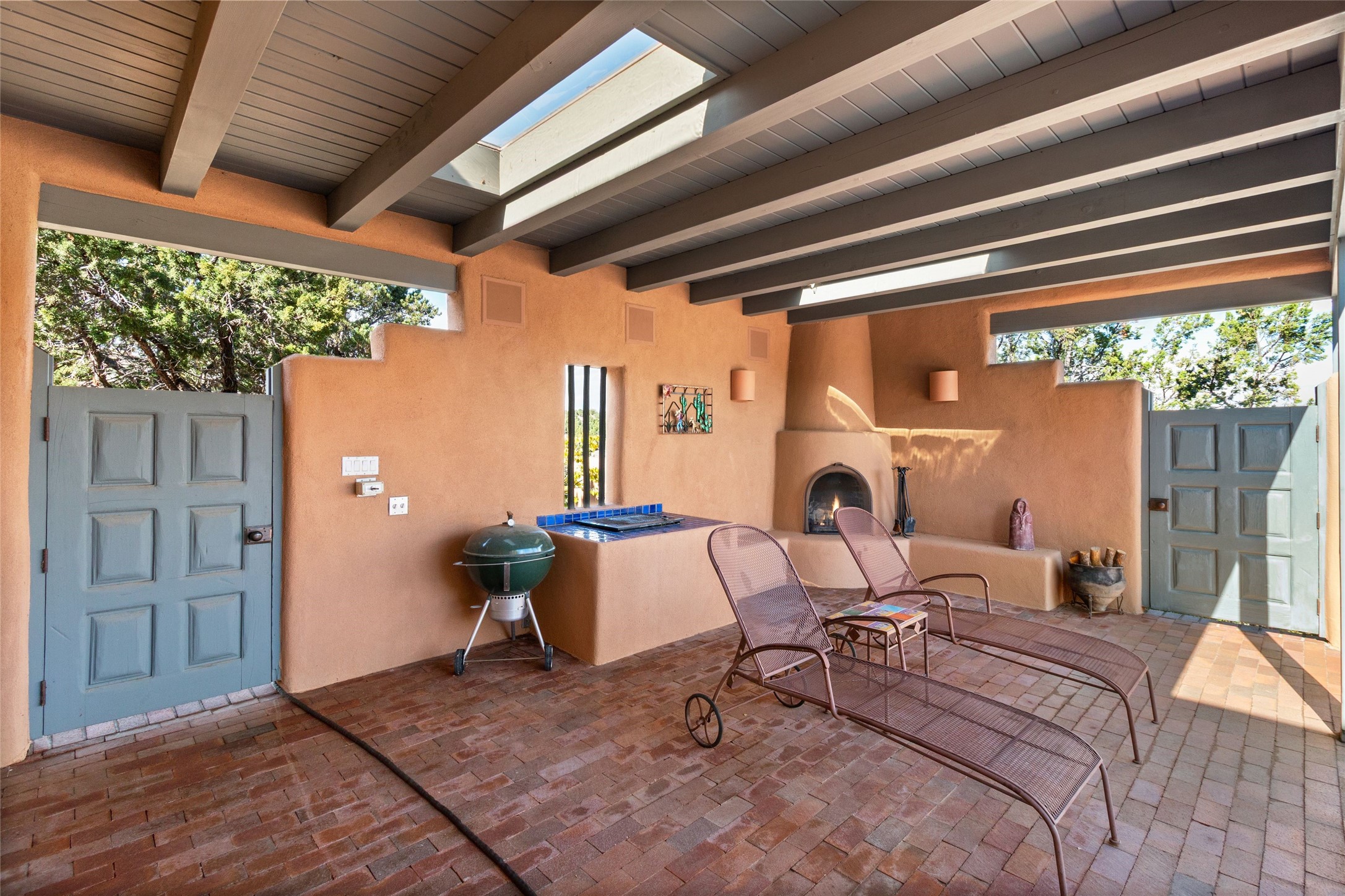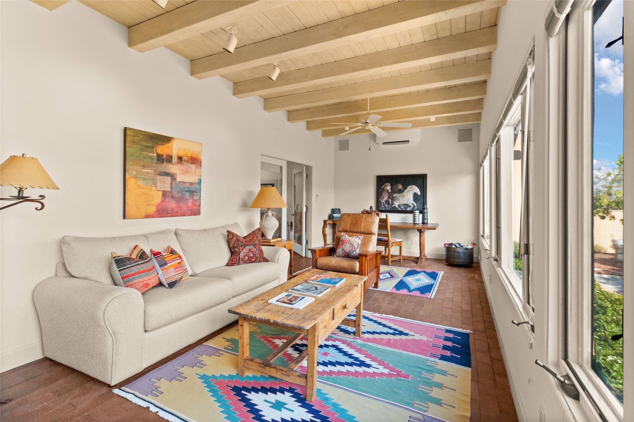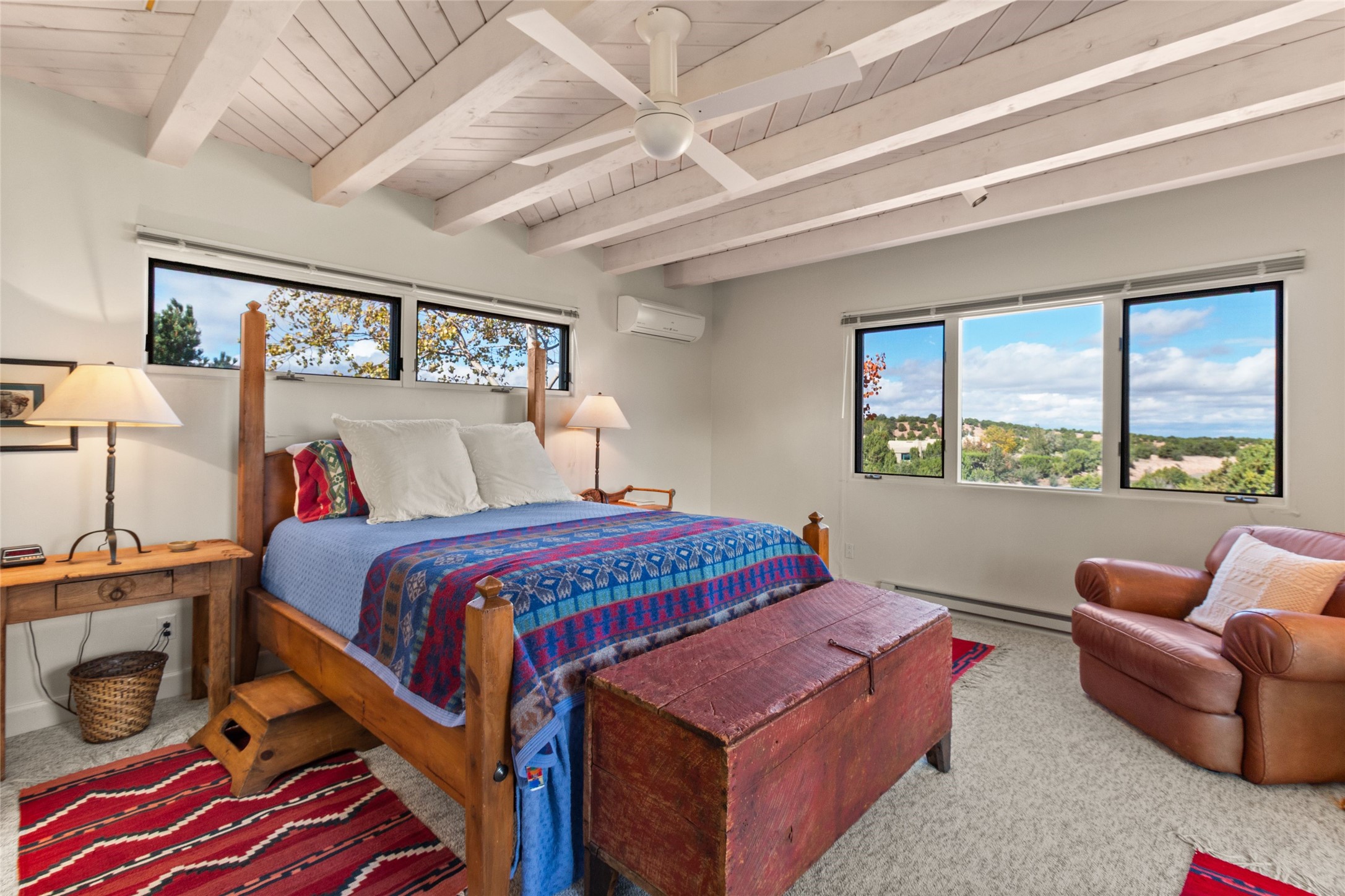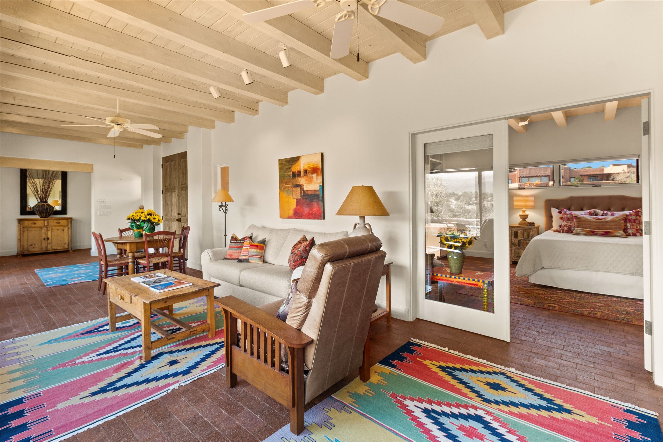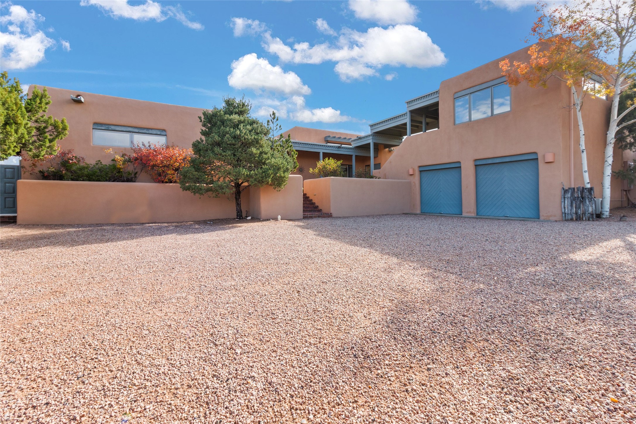 The story goes that when John Crosby (the original developer and founder of the Santa Fe Opera) chose a lot for their model, he chose this interior Casas de San Juan lot due to it's seclusion, privacy, and spectacular views. The main house, separate guest house, and heated swimming pool are singular in the condominium configuration in the subdivision. The living room features a high ceiling and glass window wall the inspire "Wow" when one walks in the home...it also features a wet bar, corner kiva fireplace, and a wall for media. The newly installed/renovated kitchen (by renowned kitchen designer Jeanne') features stone counter tops, Sub-Zero and Kitchen Aid appliances with a range/oven and a 2nd oven for big togethers. The kitchen space features high ceilings and lots of light. The over-sized Primary suite again features the views, a corner kiva fireplace, and a beautifully renovated full bath with separate tub and shower. The second large bedroom suite is on the other end of the home for privacy, and the home is rounded out by a 3rd bedroom and hallway full bath. The separate guest house sits atop the garage and is a welcome retreat from the main house with lots of space, privacy and comfort. To the east of the main part of the home is a large courtyard/garden area that provides plenty of options for outdoor living. And the large lap pool (41 x 12) sits to the north and is fenced in with a cabana, kiva fireplace and a barbecue area. The home has forced air heat and refrigerated air conditioning, w/ supplemental heat & AC via mini-split in the north bedroom suite and in the guest house. The home has a wired sound system, and utilizes a shared well and septic via the HOA. Casas de San Juan is a gated subdivision accessed by the Main Entrance front gate staffed during the day for added Security.