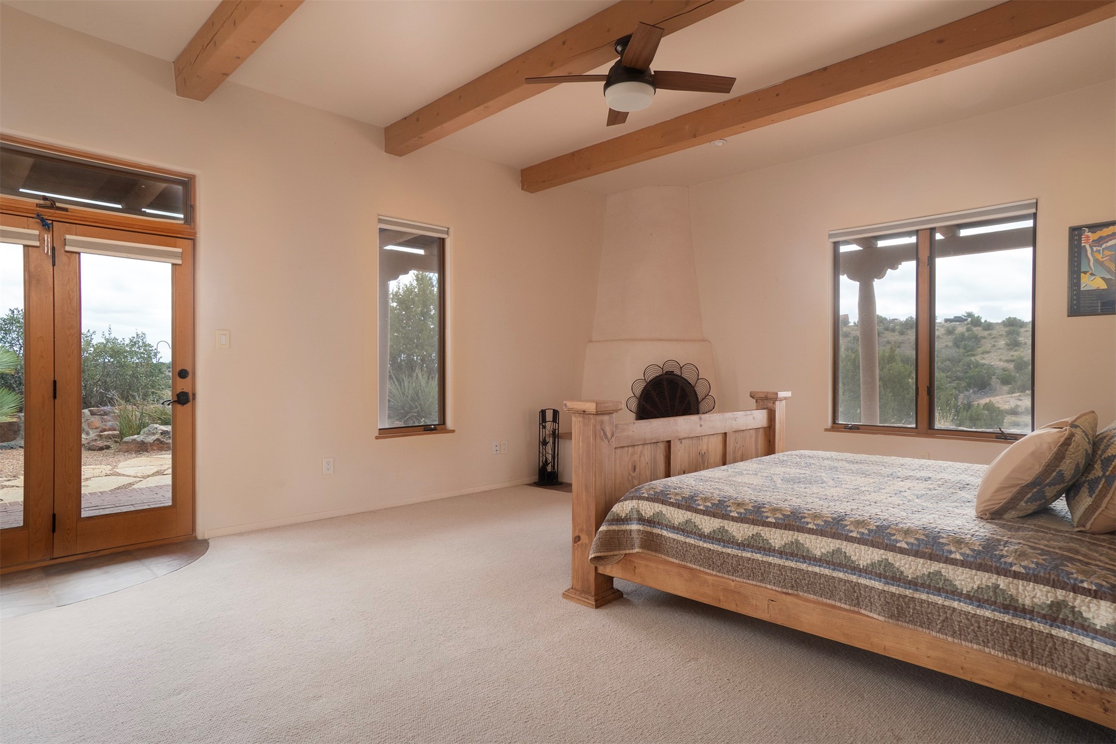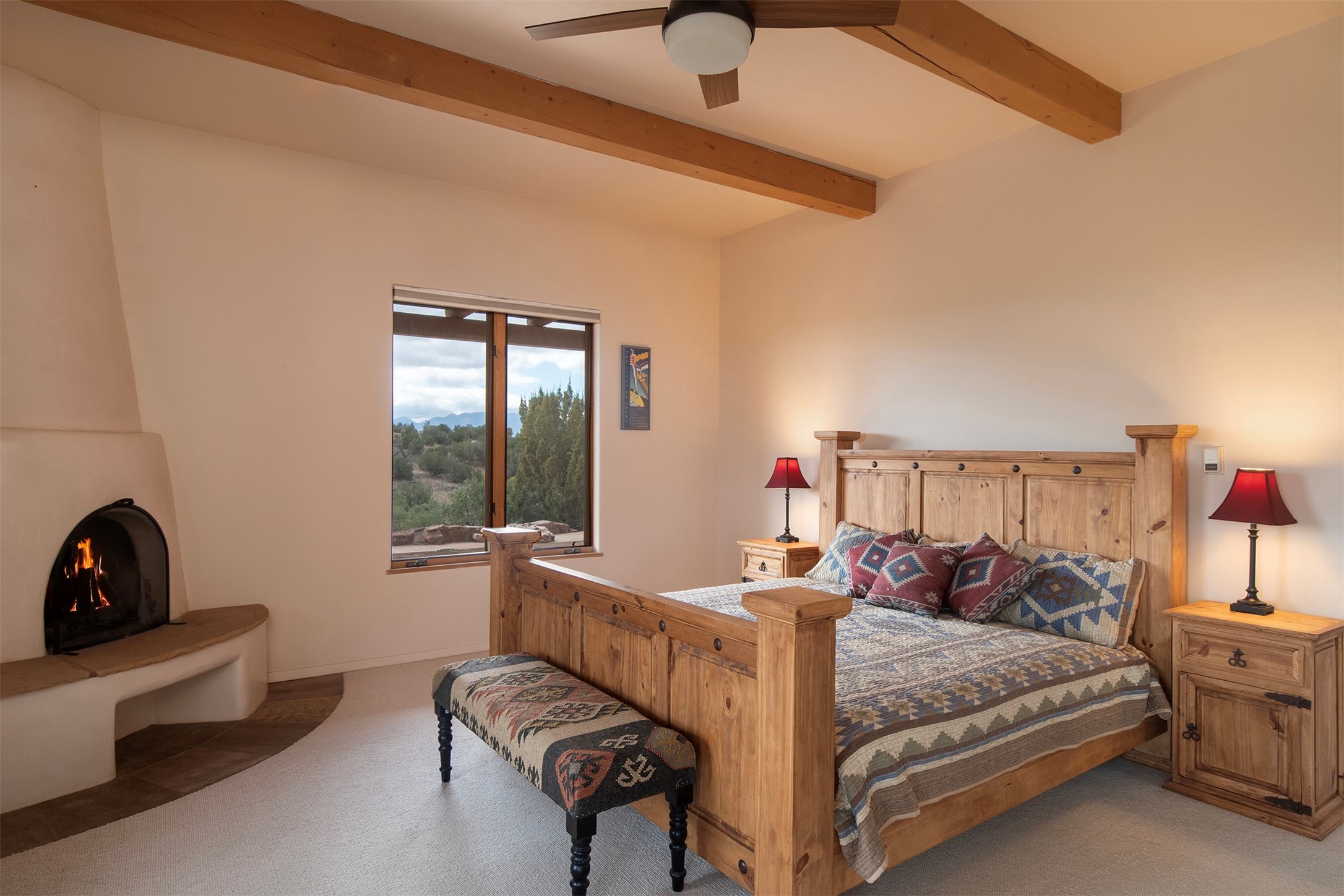 Set on 15 private acres with commanding forever views, this exceptional property combines the best of rural living with a strong sense of community & a lifestyle that embraces the outdoors.The main home offers nearly 3,500 square feet of living space, complemented by an attached 1,100 square foot ADU/guest house. Perfect for independent living, extended family, private guest quarters, a home office, or potential rental income, the guest house provides both flexibility & privacy.Inside the main residence, classic Santa Fe charm shines throughout. A spacious chef's kitchen is the heart of the home, while high ceilings with cedar latillas, hard trowel plaster walls, and multiple kiva fireplaces add warmth and character. A pellet stove ensures cozy comfort.Outdoor living takes center stage in every direction. Whether gathering around the kiva fireplace, relaxing on the patios, or entertaining on the elevated margarita deck with 360-degree sunset views, this property was designed to connect with nature & wide-open skies.Adding to its appeal, the home is equipped with green energy features including a Tesla Powerwall and a solar array, ensuring minimal electric costs while supporting sustainable living.This rare offering blends timeless Southwestern design with modern energy efficiency and endless opportunities for living, working, and entertaining--truly Rancho Alegre country living at its best.