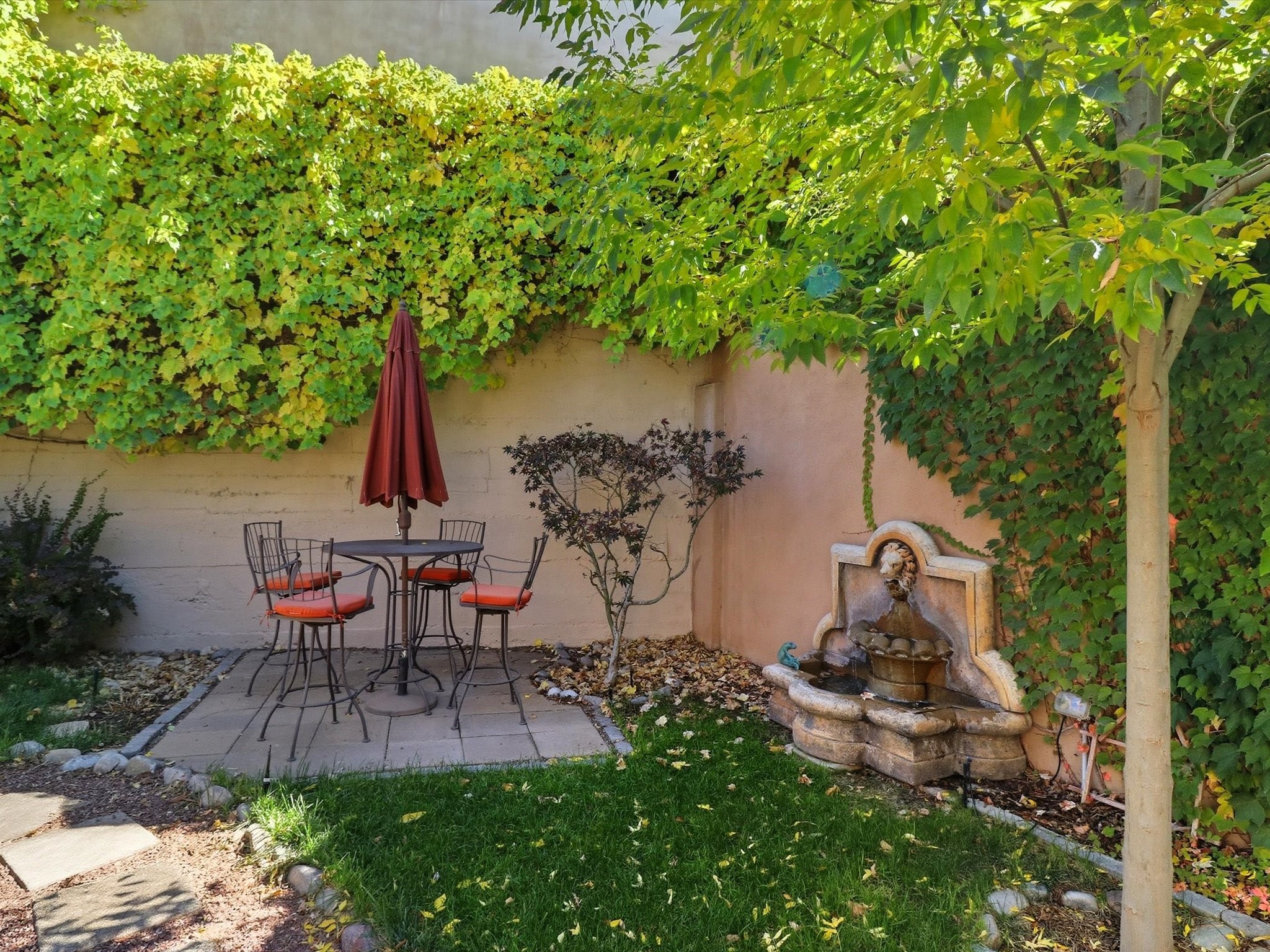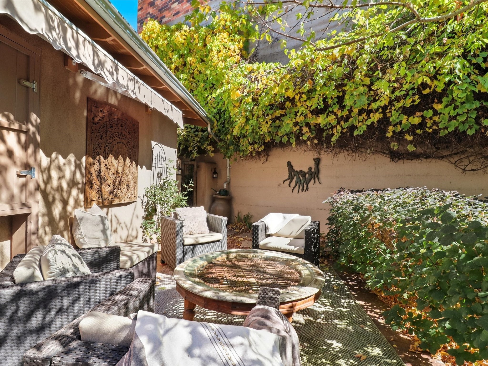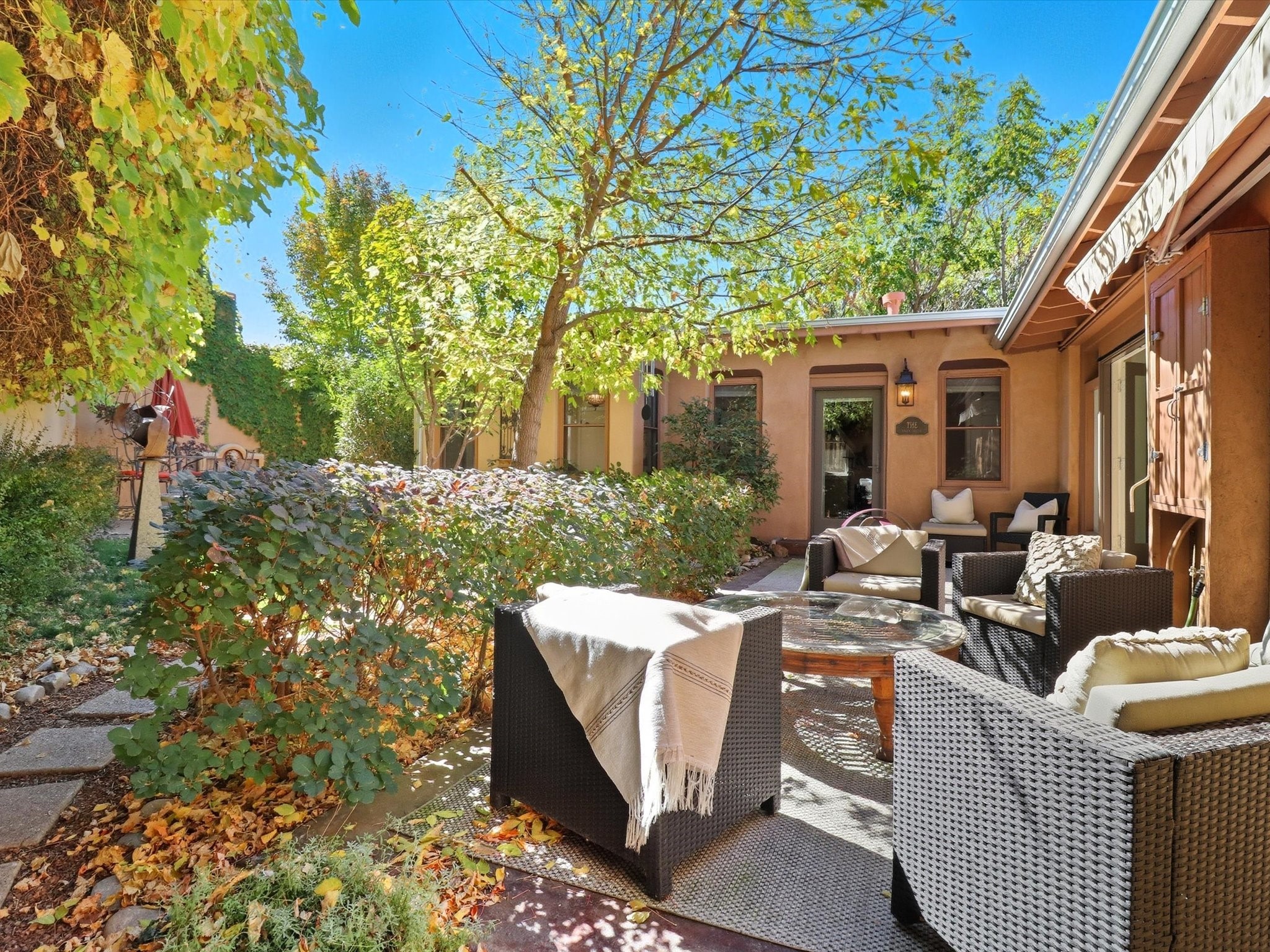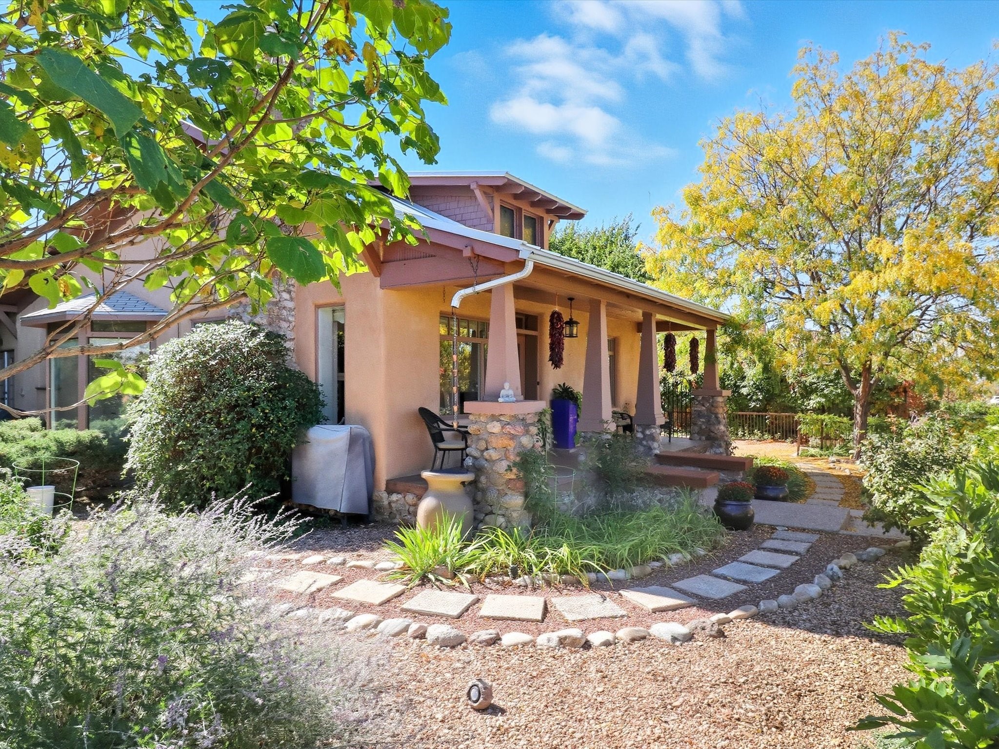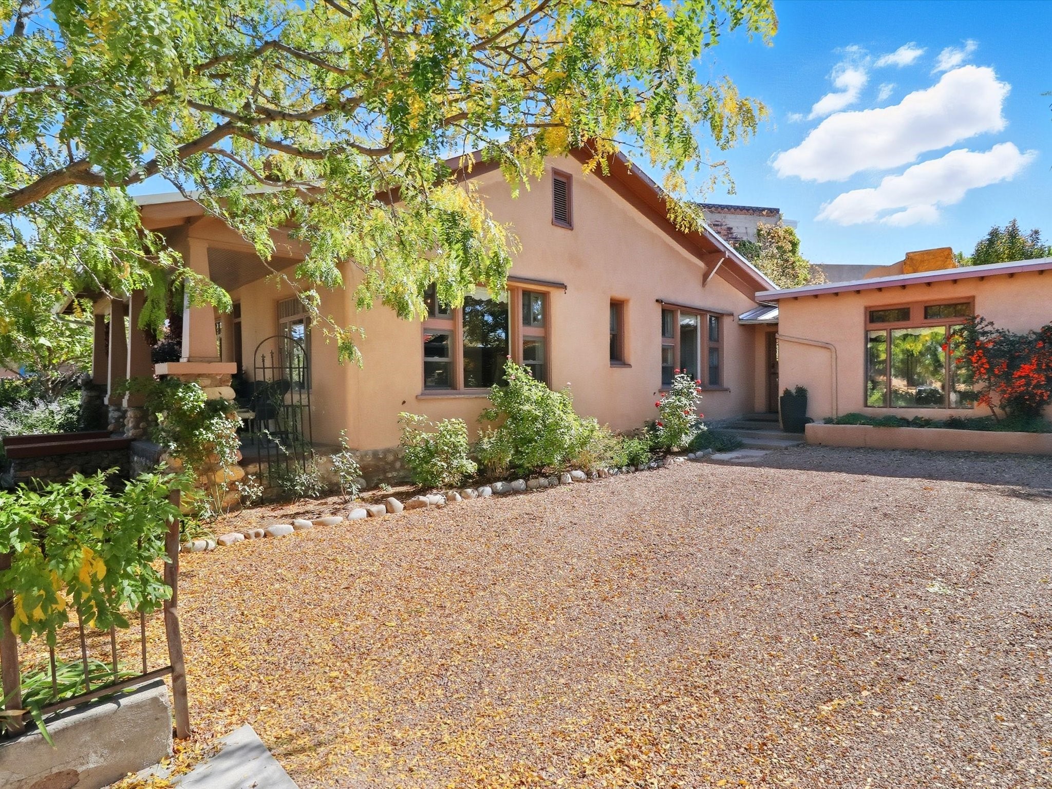 Price Adjustment! One of Santa Fe's most desirable locations. This historically 'contributing' home on East Agua Fria is a light-filled jewel. It is perfectly situated to enjoy all the vibrancy of Santa Fe's Railyard District and Santa Fe's Downtown. Imagine owning a property just blocks away from world-class art galleries, dining, shopping and music. The Santa Fe Farmers Market, a beloved community hub, is just a few blocks to the south. This charming 1900 Craftsman Bungalow home offers four bedrooms, 2 baths, many upgrades, double adobe construction creating a timeless, inviting and very quiet home. Additionally, this property offers remarkable flexibility with two distinct areas, each featuring separate street and garden entrances providing an excellent investor opportunity. The current owners have meticulously cultivated large romantic garden areas over many years, showcasing roses, shade trees and climbing vines, all maintained by an automatic drip system. Experience the unexpectedly large, very private rear patio - a secluded oasis ideal for entertaining or simply unwinding. Further enhancing convenience and livability is the unusually generous, gated off-street parking, a single-story design and a 200-square-foot storage area in the rear. Come see and be captivated! Seller will consider 5% Owner Financing and is offering a 15K seller credit to be used at the buyer's discretion. Neither Listing Brokers nor Seller warrants the square footage of the home or lot. If the size of the home or lot is of material consideration to the Buyer, then the Buyer should have them measured. Tax Levy is from the Assessor website. All fires depicted are photo-shopped. Buyer to verify the functionality of the fireplace.
