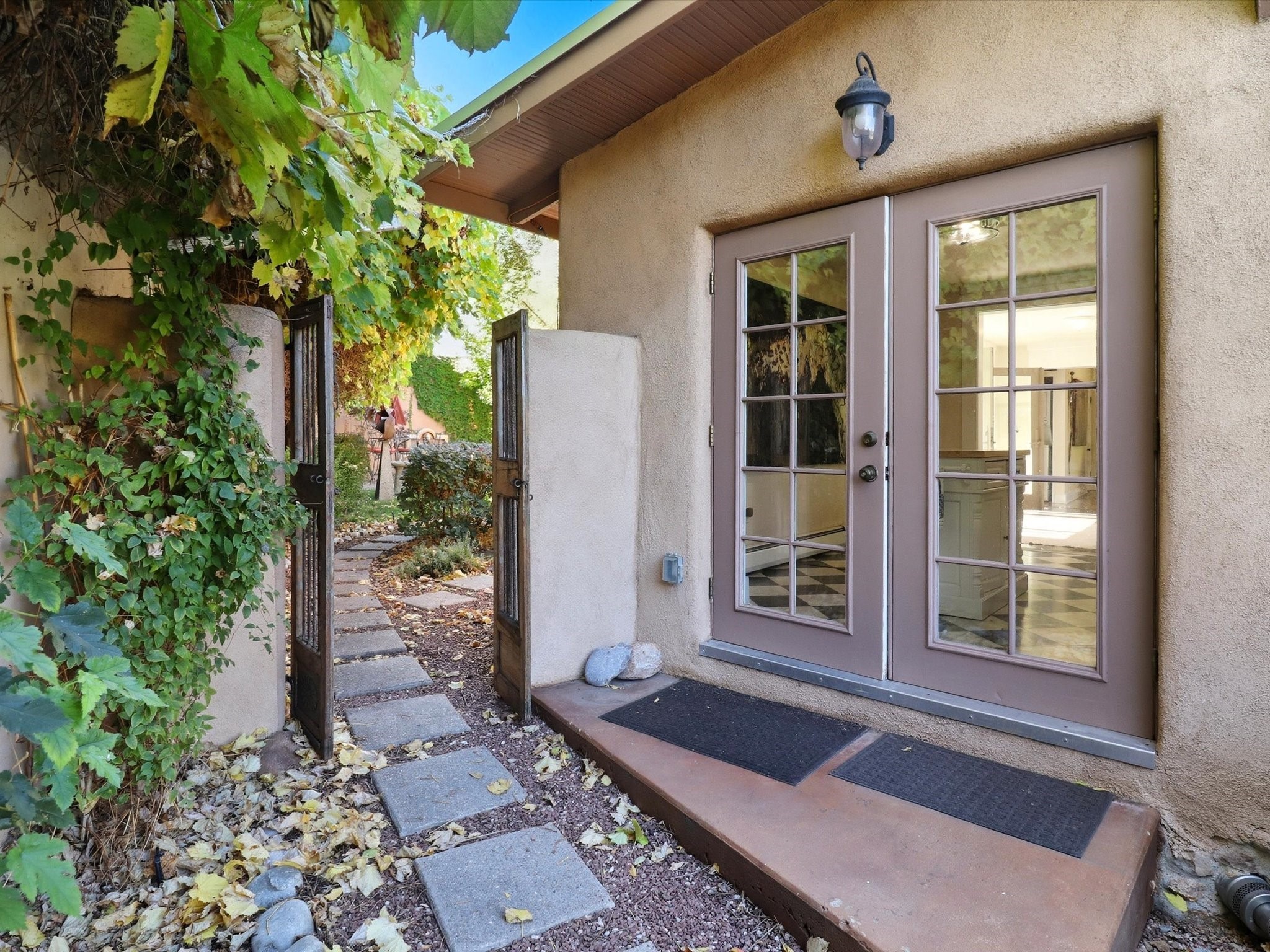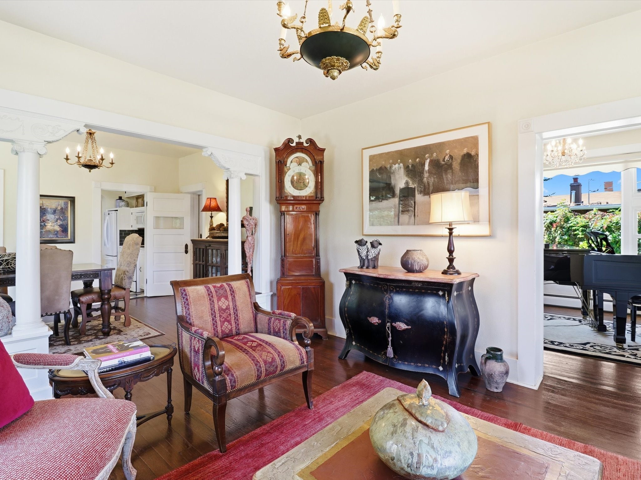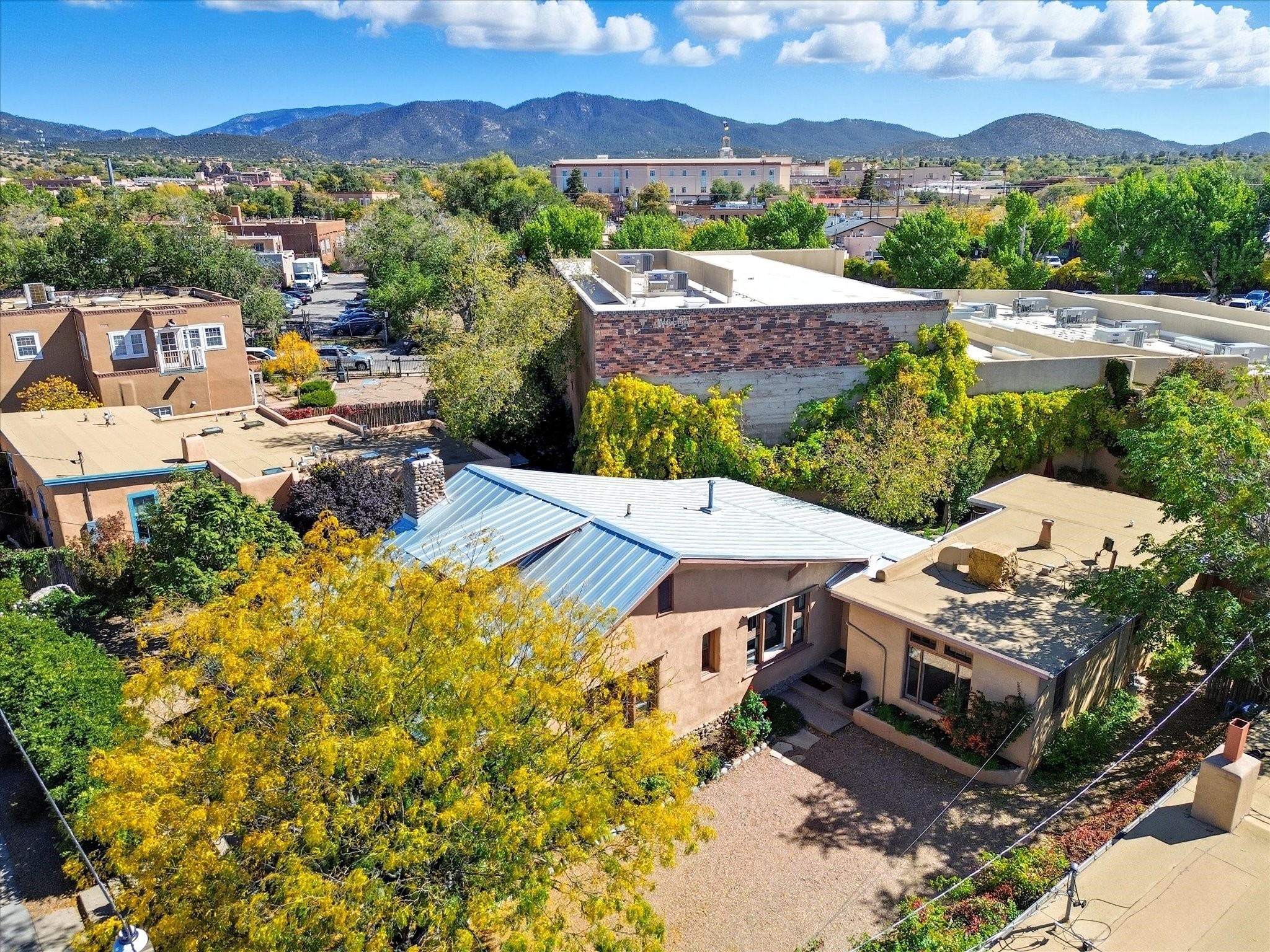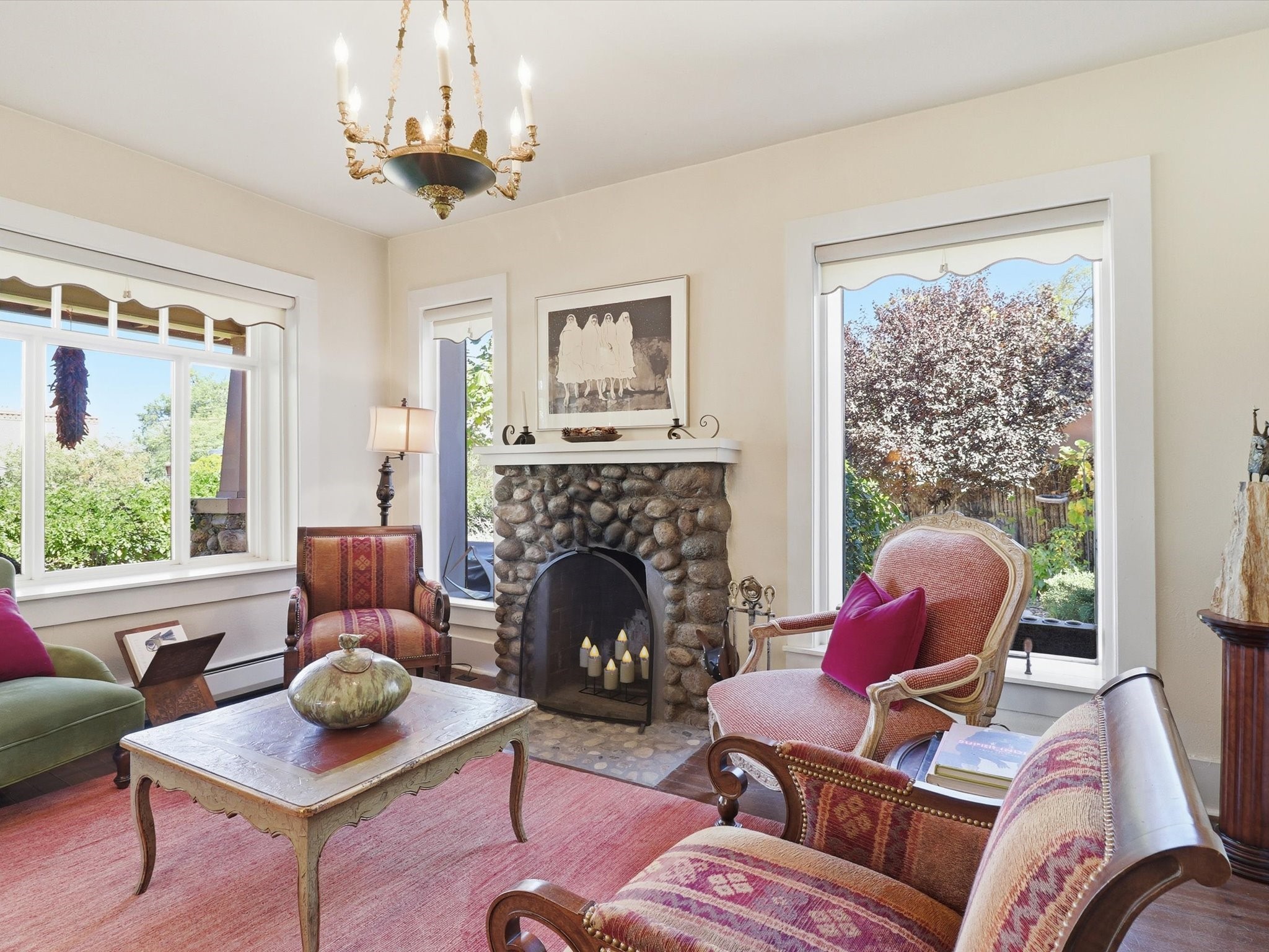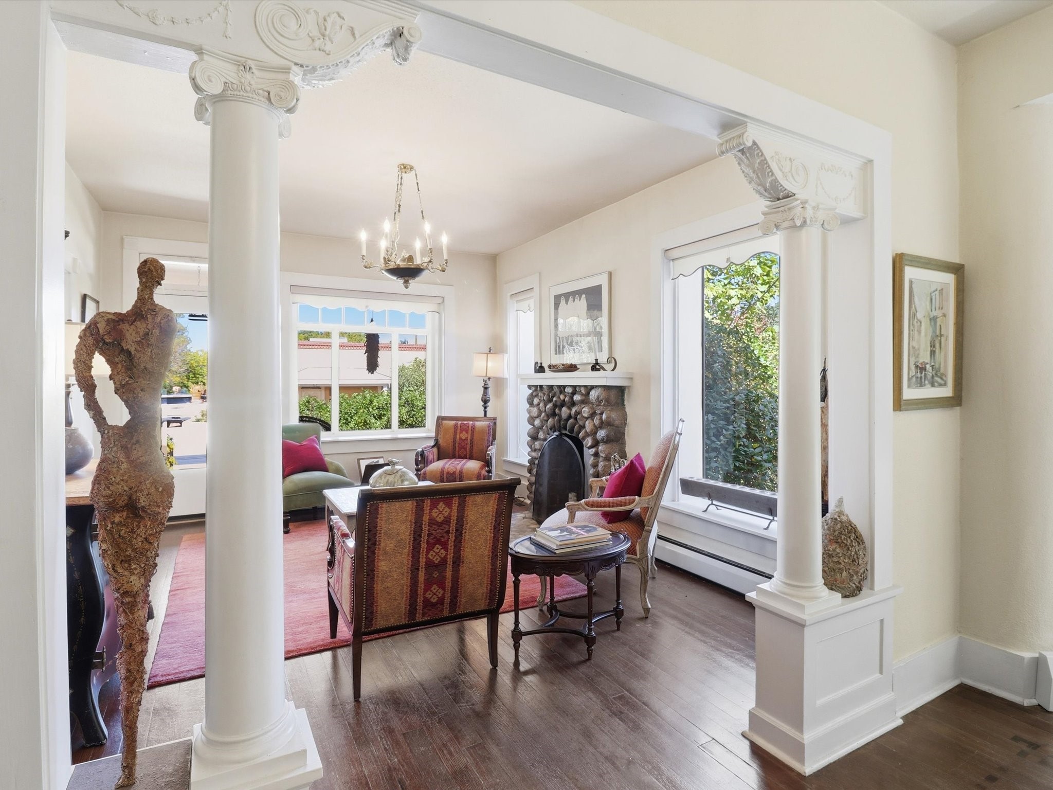 Price Adjustment! One of Santa Fe's most desirable locations. This historically 'contributing' home on East Agua Fria is a light-filled jewel. It is perfectly situated to enjoy all the vibrancy of Santa Fe's Railyard District and Santa Fe's Downtown. Imagine owning a property just blocks away from world-class art galleries, dining, shopping and music. The Santa Fe Farmers Market, a beloved community hub, is just a few blocks to the south. This charming 1900 Craftsman Bungalow home offers four bedrooms, 2 baths, many upgrades, double adobe construction creating a timeless, inviting and very quiet home. Additionally, this property offers remarkable flexibility with two distinct areas, each featuring separate street and garden entrances providing an excellent investor opportunity. The current owners have meticulously cultivated large romantic garden areas over many years, showcasing roses, shade trees and climbing vines, all maintained by an automatic drip system. Experience the unexpectedly large, very private rear patio - a secluded oasis ideal for entertaining or simply unwinding. Further enhancing convenience and livability is the unusually generous, gated off-street parking, a single-story design and a 200-square-foot storage area in the rear. Come see and be captivated! Seller will consider 5% Owner Financing and is offering a 15K seller credit to be used at the buyer's discretion. Neither Listing Brokers nor Seller warrants the square footage of the home or lot. If the size of the home or lot is of material consideration to the Buyer, then the Buyer should have them measured. Tax Levy is from the Assessor website. All fires depicted are photo-shopped. Buyer to verify the functionality of the fireplace.