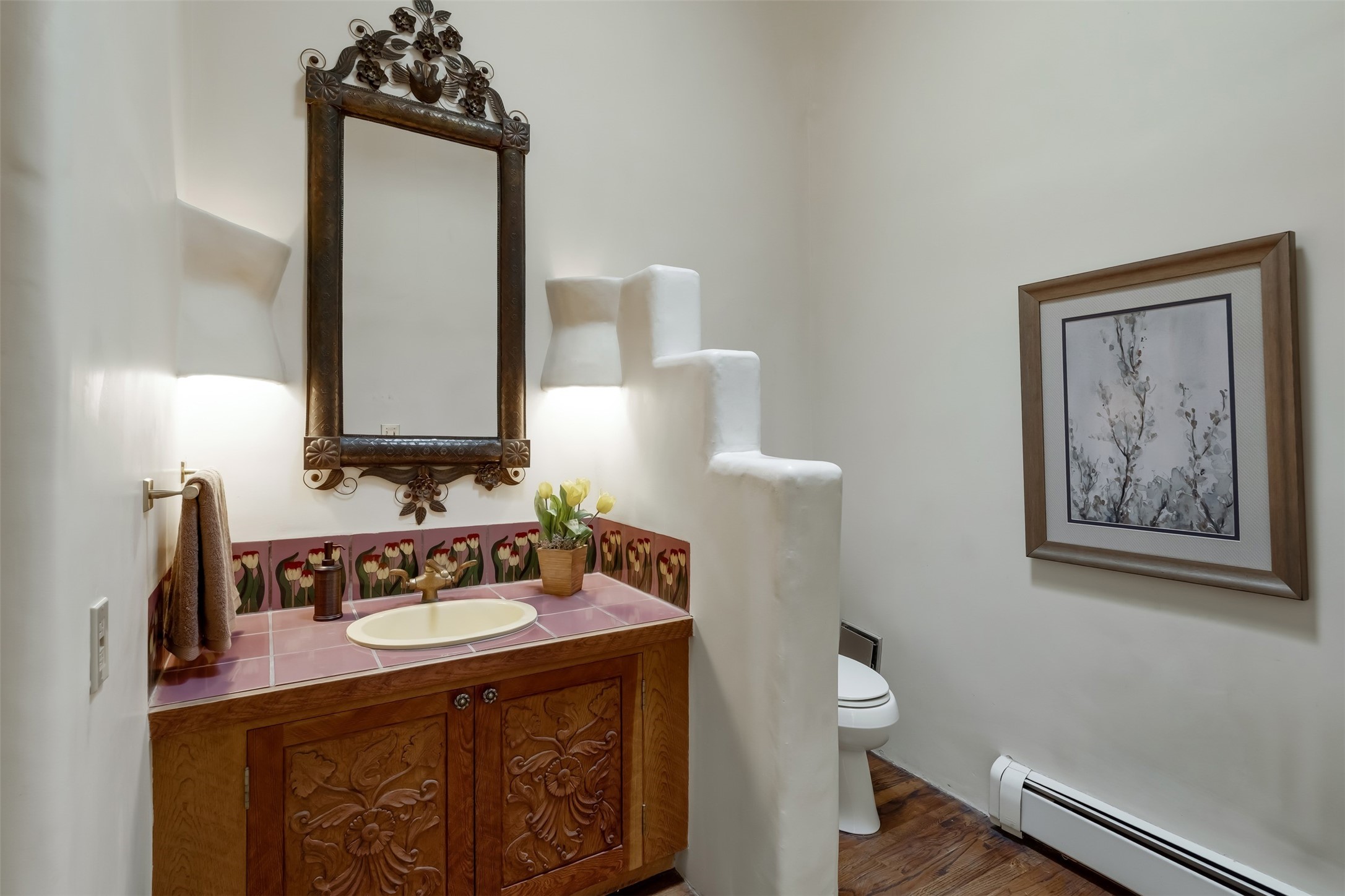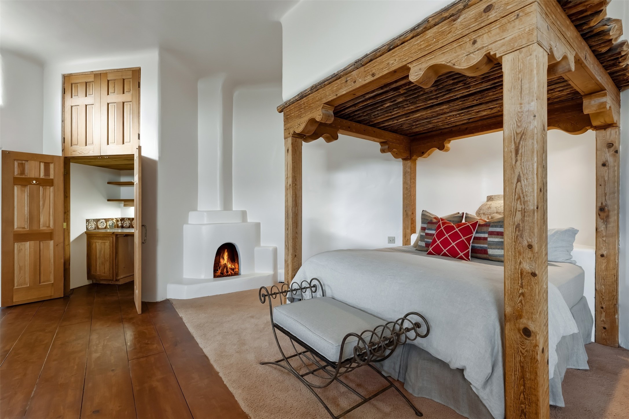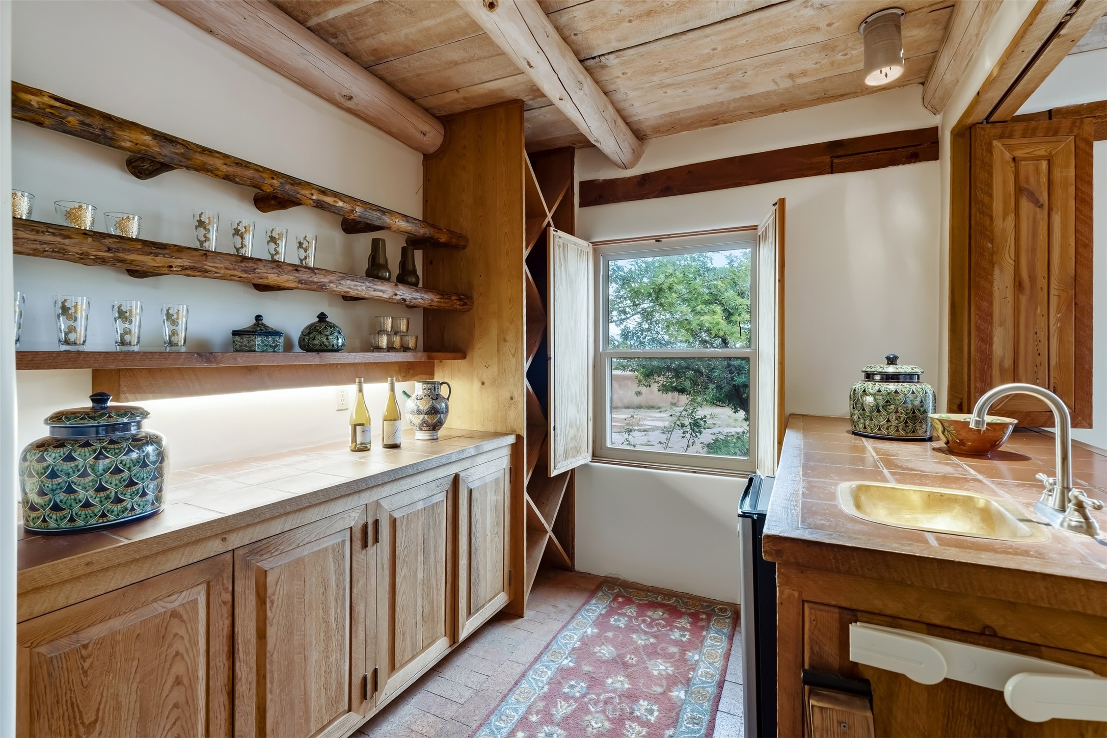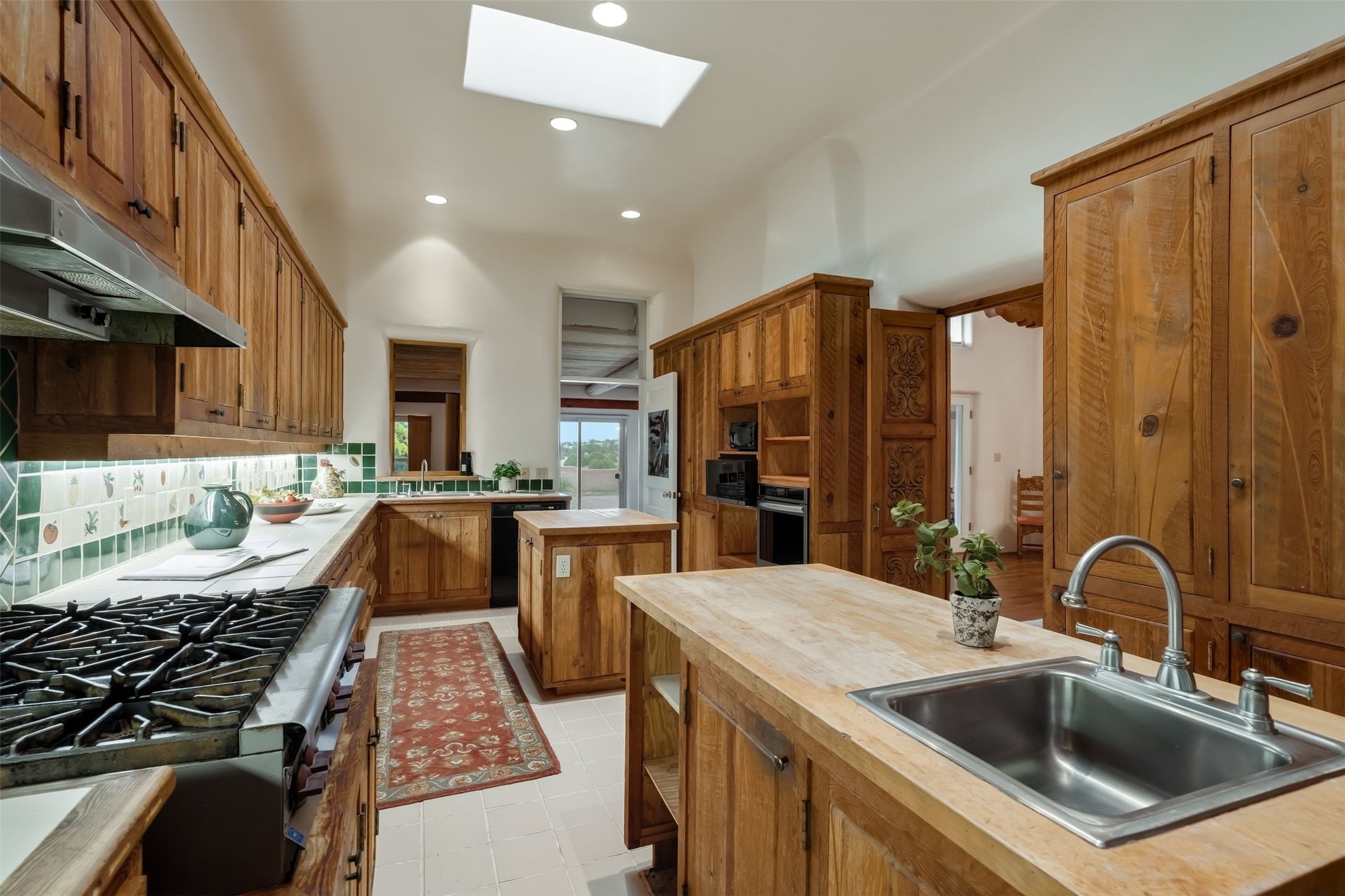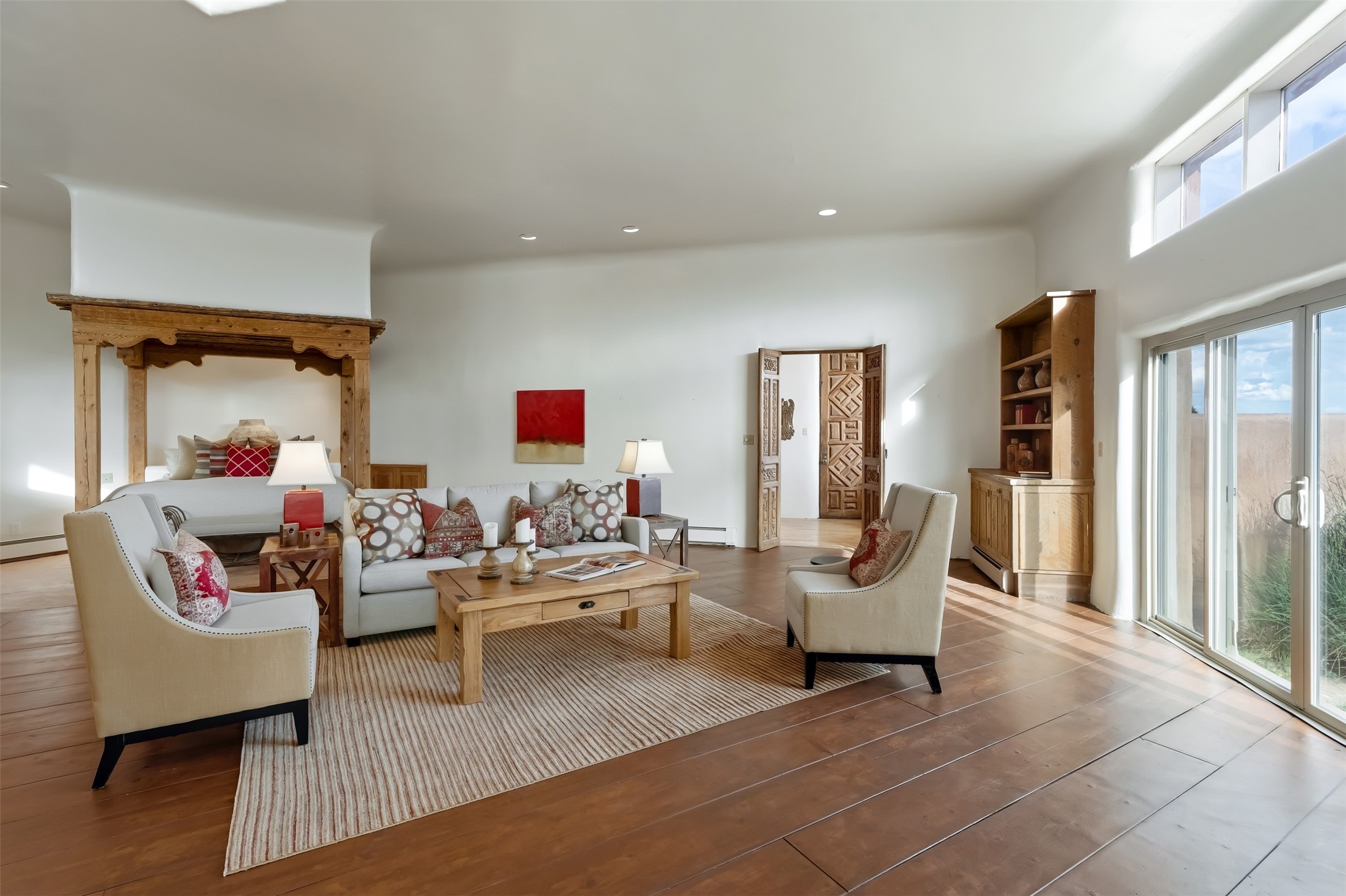 In the quaint village of Galisteo lies this gracious and majestic home with adjoining 5 acre lot, for a total of 10 acres, known as 'Hacienda del Sol." One hundred years ago was the site of the Old Galisteo School House. The original 1886 bell and corner stone 1938 were placed within the walls of this present day home. Built atop a gentle hill with stunning views of the Galisteo Basin, Sangre de Cristos and Jemez Mountains along with huge white puffy cloud formations in a brilliant blue sky greet you everyday. Large rooms with cathedral ceilings flooded with light, sculptured fireplaces, oak and pine floors with 10 foot elegantly carved doors delight the eye upon entering. Screened in, is a lovely outdoor patio with vast, distant views. A gallery hallway runs the length of the house craving art, paintings, photographs, memorabilia. A chef's kitchen with a six burner stove, center islands, prep sinks has everything one would want. An elegant dining room with arched walls, subtle lighting, and carved cabinets allow for many guests or small intimate settings. Three Bedroom suites each with fireplaces and luscious bathrooms are perfectly placed for privacy. An attached "casita" with kitchen and bath is off one of the wings of the home. Outside, there is a circular, walled patio area for summer gatherings and moon lit nights. Included in this fabulous property is a blue gate opening up to an adjoining 5 acre parcel of vacant land accessed off of Camino San Cristobal used for pleasure or as additional acreage for another home, studio, horses, and imagination. Dream on...