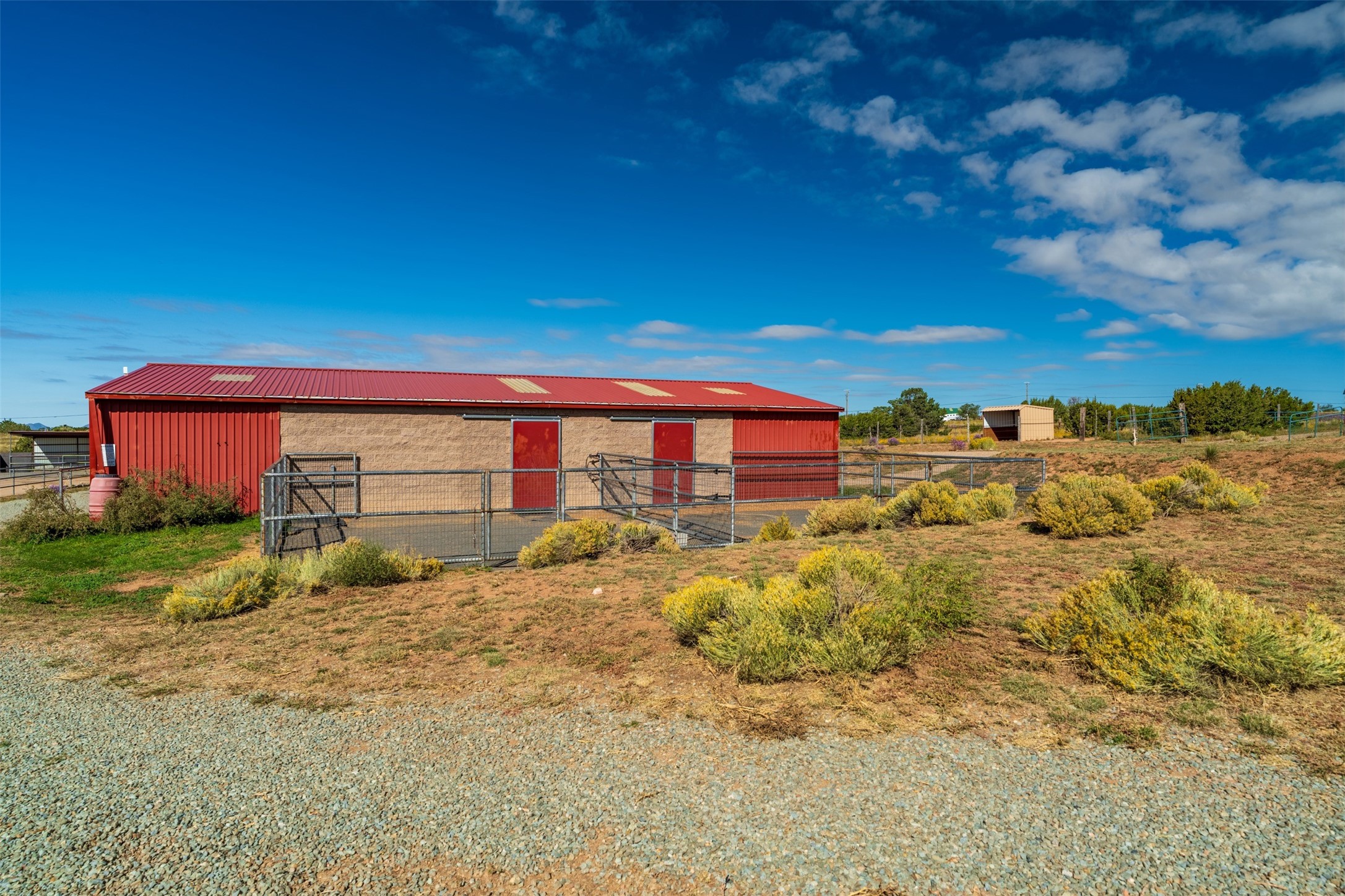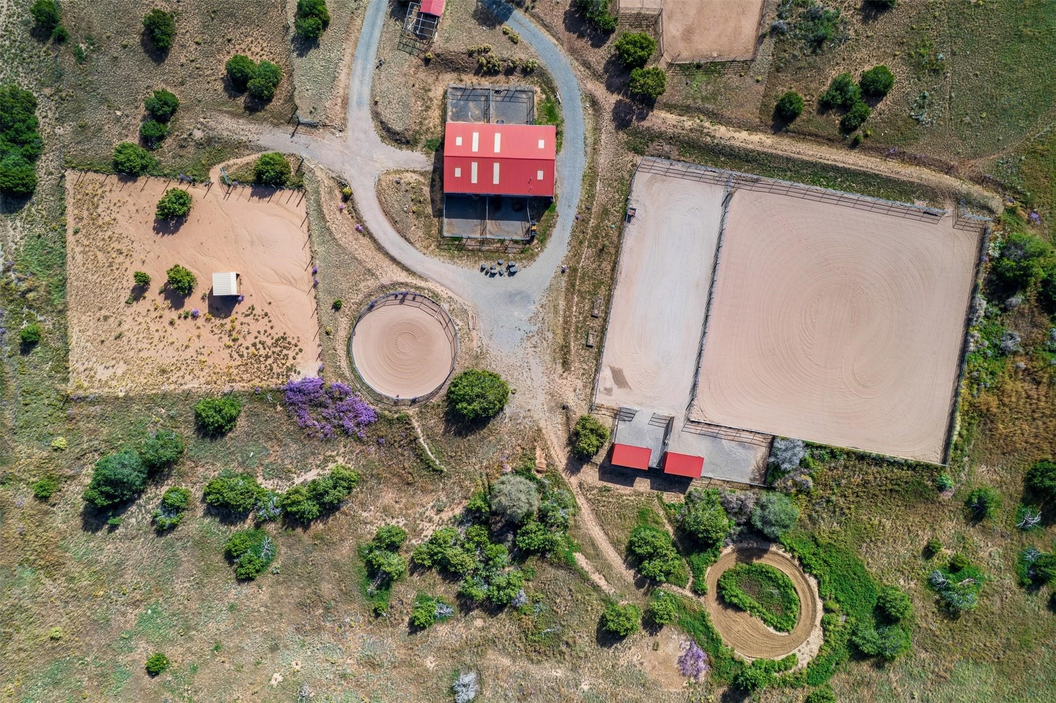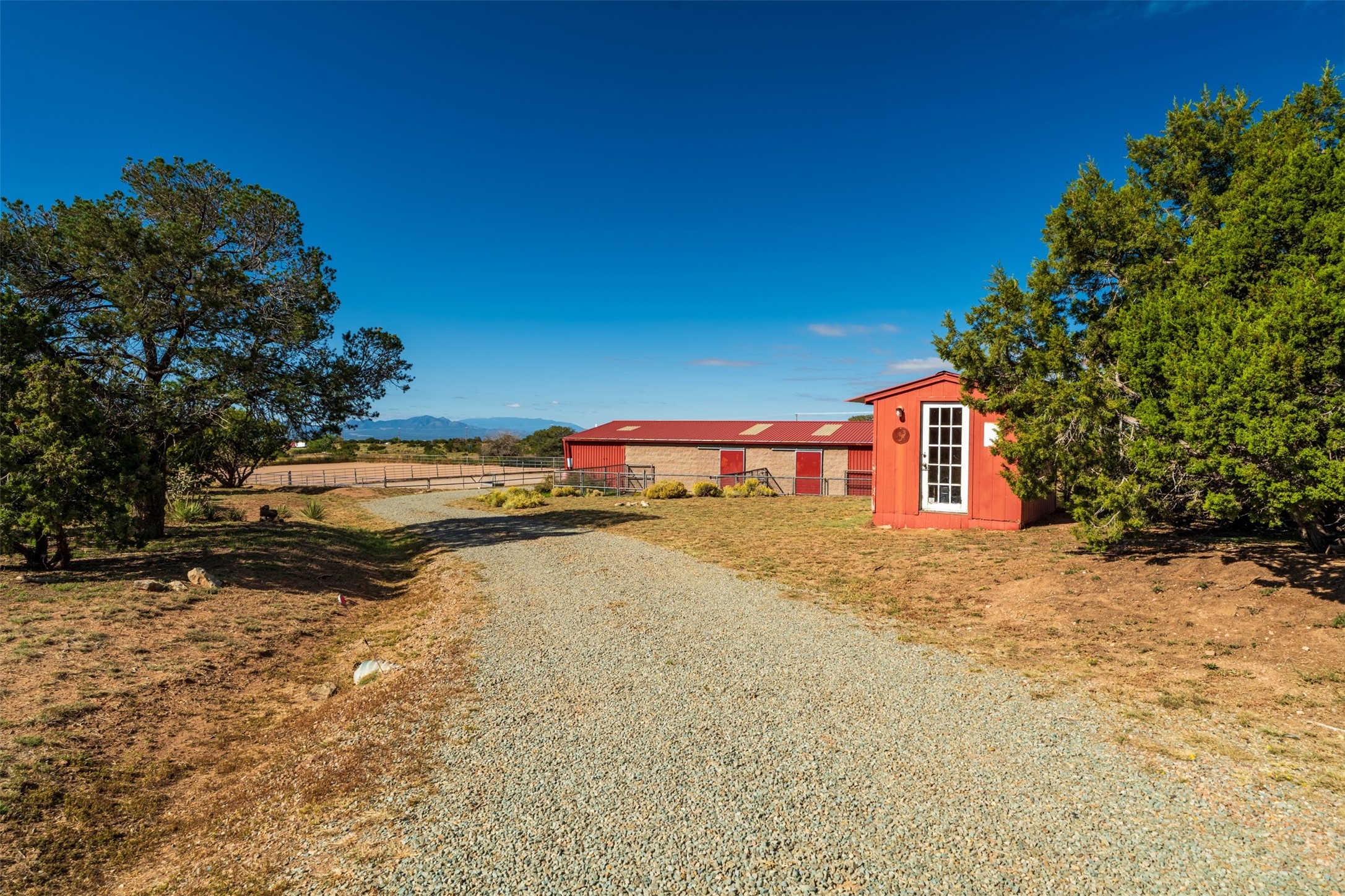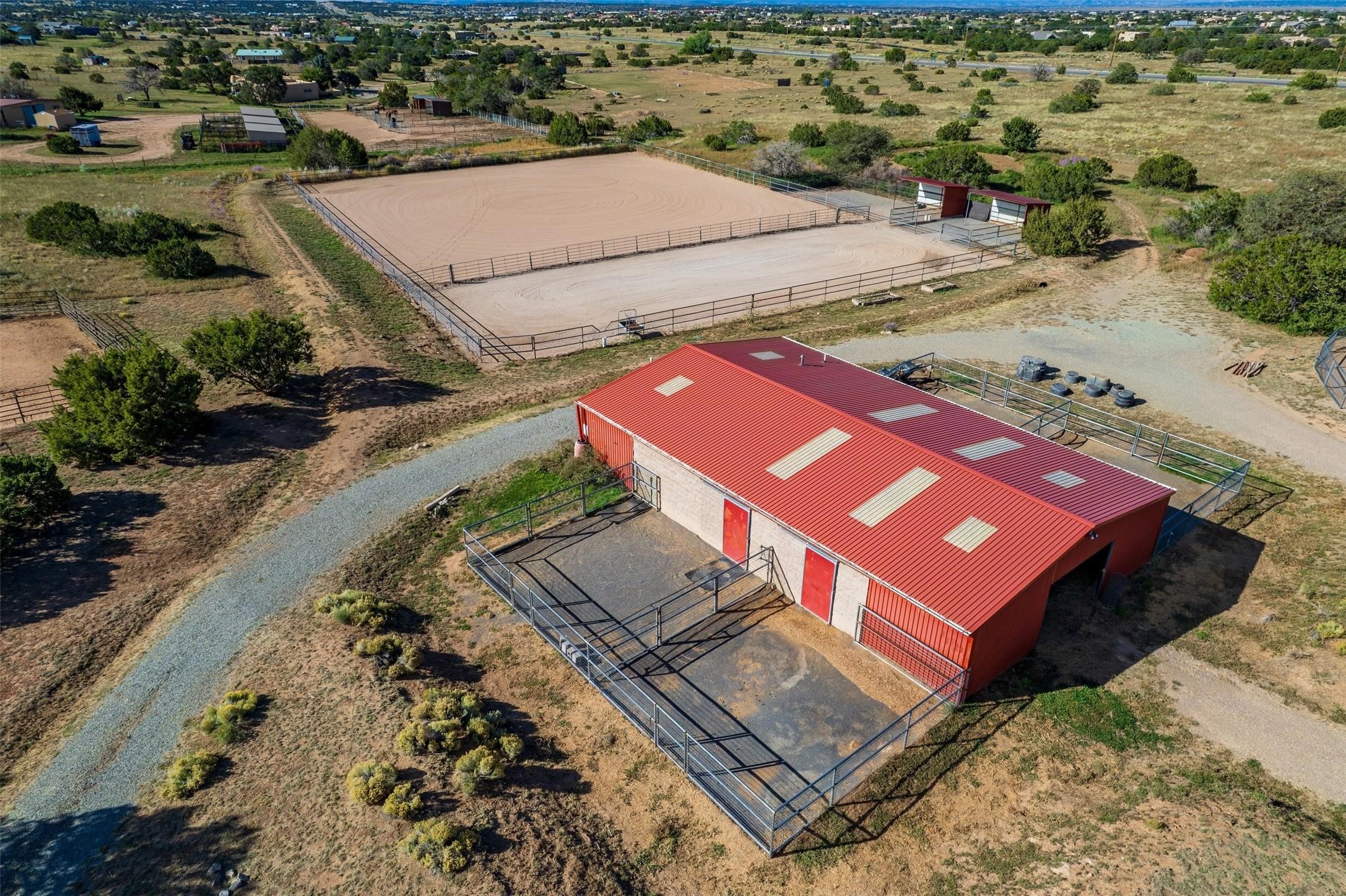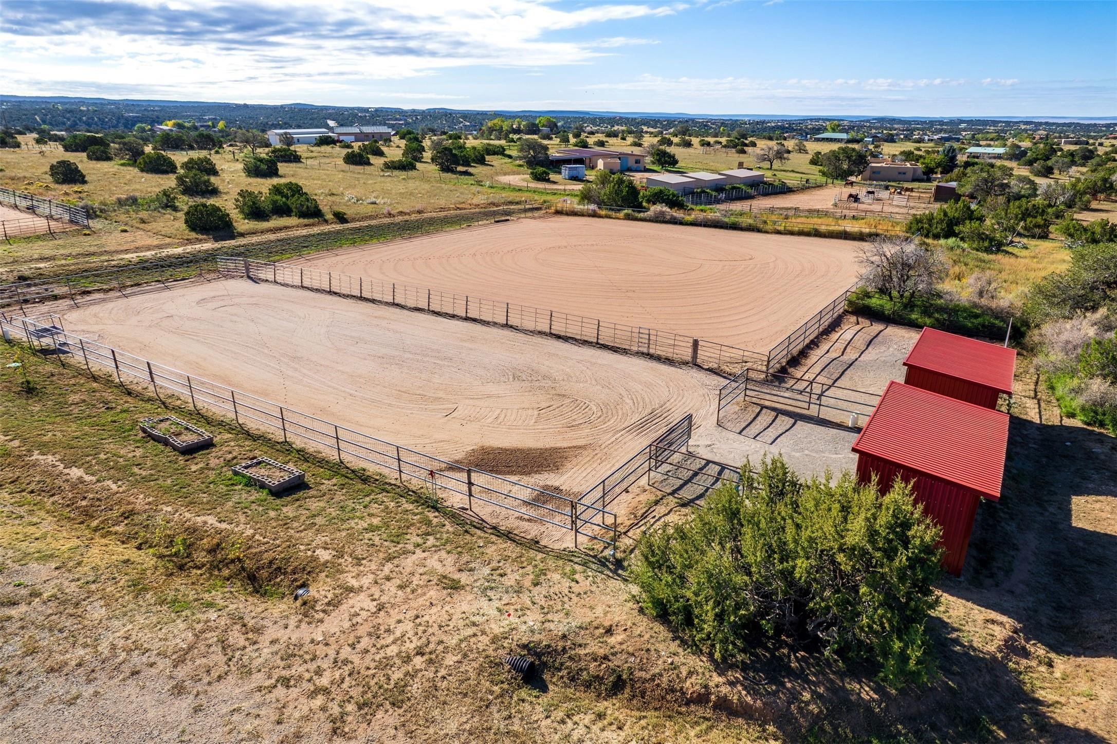 A rare horse property. This Santa Fe-style country home offers an exceptional location directly across from Eldorado, providing convenient access to local community amenities. The property benefits from Eldorado water and natural gas, and its proximity to the highway ensures easy access to town.The home features a split floor plan and an open-concept living, dining, and kitchen area, perfect for comfortable living and entertaining, all while offering beautiful southerly mountain views.The oversized garage is a real plus with plenty of storage and shelving. Walk thru laundry room. Enclosed, heated sunroom. For equestrian enthusiasts, this property is truly turn-key featuring a 2,400 sq ft, center-aisle, block and metal barn with four stalls, each equipped with attached piped paddocks, crusher fine footing, and automatic heated waterers. The barn also includes a dedicated tack room, a hot water wash rack, hay storage, and a feed room complete with a sink and toilet. Additional amenities include a piped rail sand arena and four turnouts with run-in sheds. Beyond the equestrian facilities, the property also has a detached, 432 sq ft, unheated workshop/studio with a carport and extra storage. No HOA.
