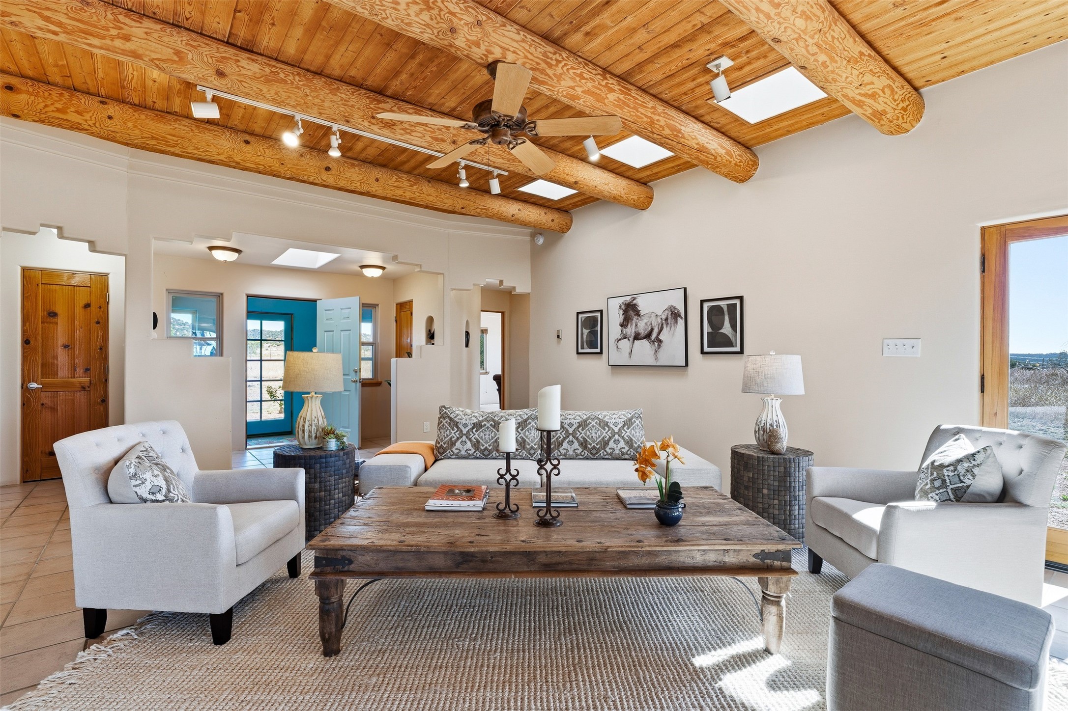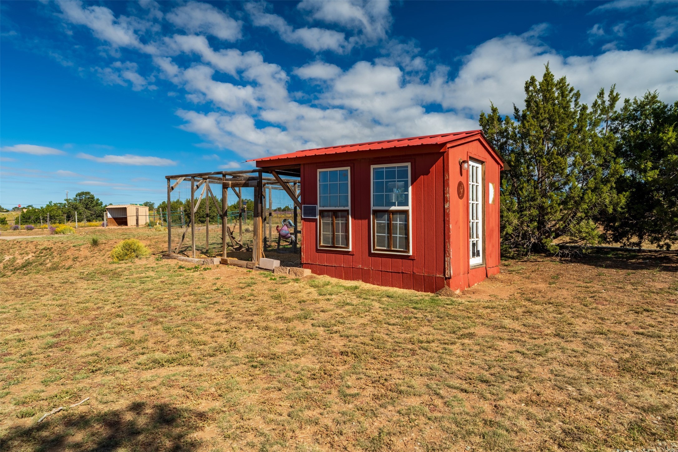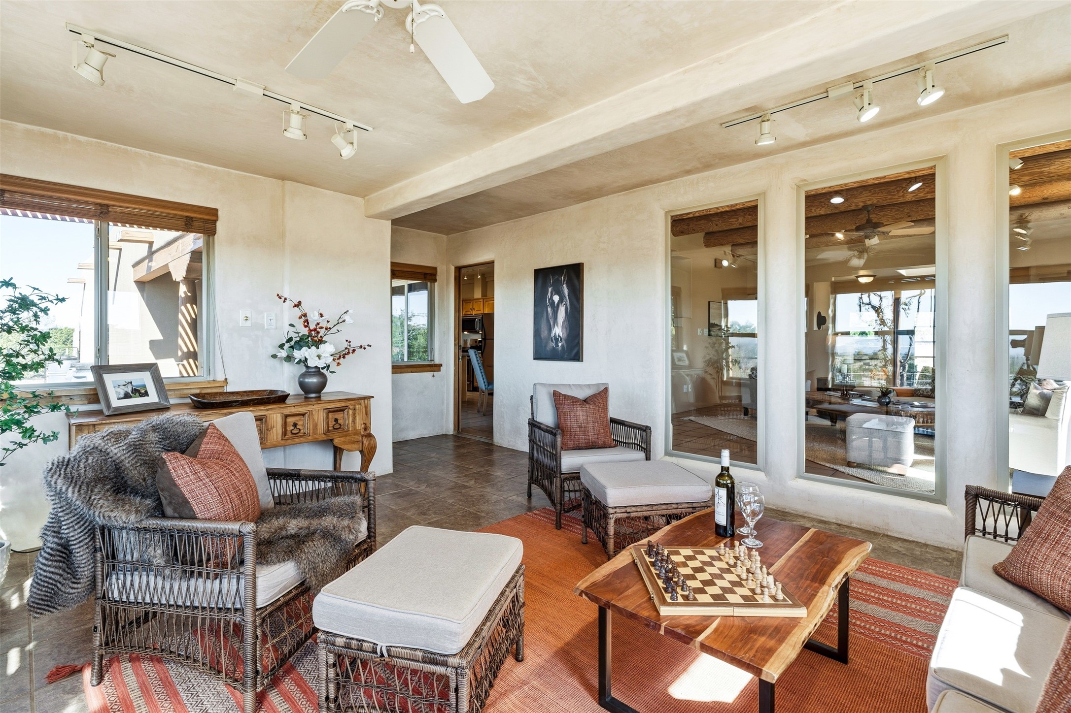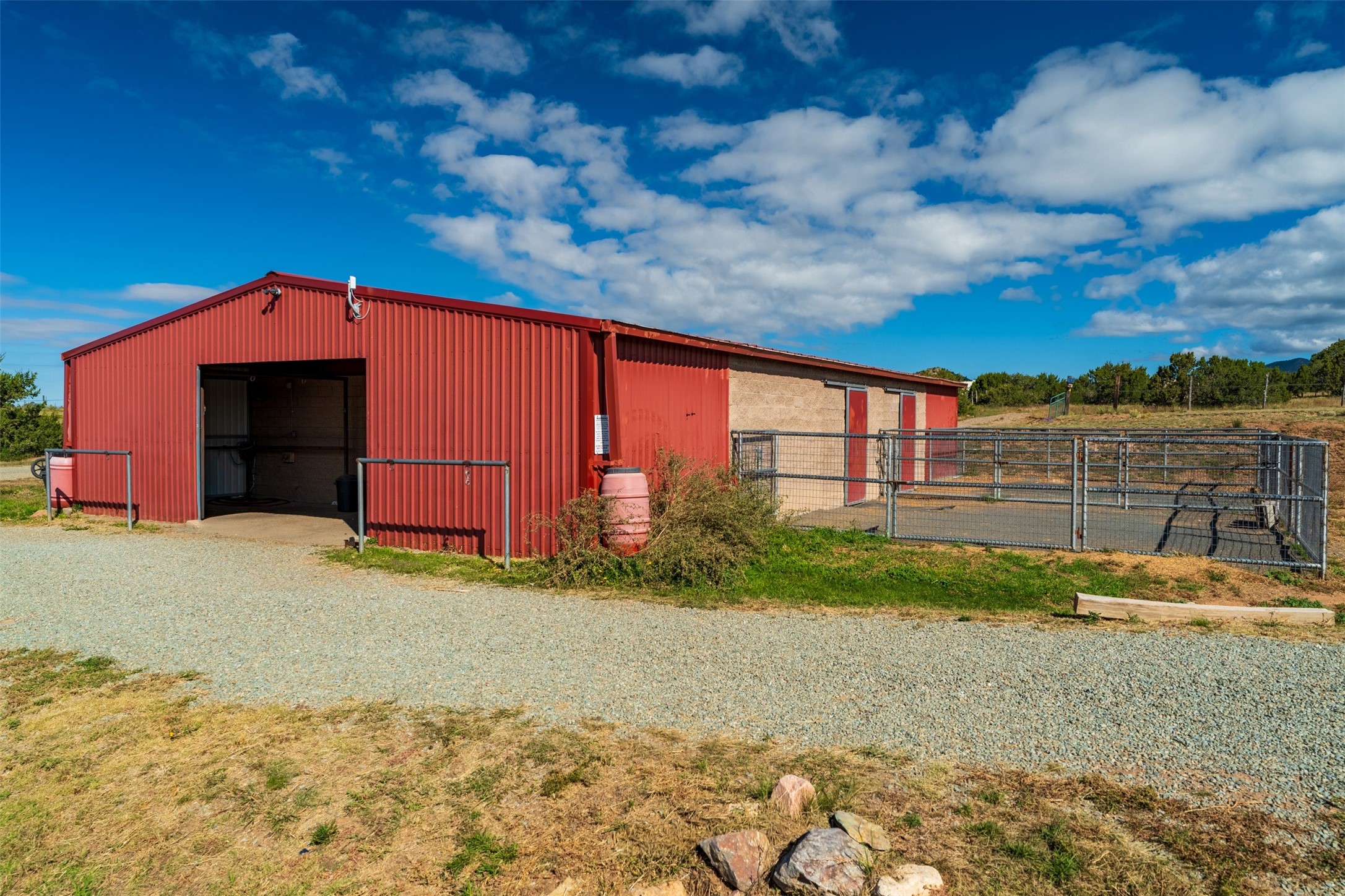A rare horse property. This Santa Fe-style country home offers an exceptional location directly across from Eldorado, providing convenient access to local community amenities. The property benefits from Eldorado water and natural gas, and its proximity to the highway ensures easy access to town.The home features a split floor plan and an open-concept living, dining, and kitchen area, perfect for comfortable living and entertaining, all while offering beautiful southerly mountain views.The oversized garage is a real plus with plenty of storage and shelving. Walk thru laundry room. Enclosed, heated sunroom. For equestrian enthusiasts, this property is truly turn-key featuring a 2,400 sq ft, center-aisle, block and metal barn with four stalls, each equipped with attached piped paddocks, crusher fine footing, and automatic heated waterers. The barn also includes a dedicated tack room, a hot water wash rack, hay storage, and a feed room complete with a sink and toilet. Additional amenities include a piped rail sand arena and four turnouts with run-in sheds. Beyond the equestrian facilities, the property also has a detached, 432 sq ft, unheated workshop/studio with a carport and extra storage. No HOA.