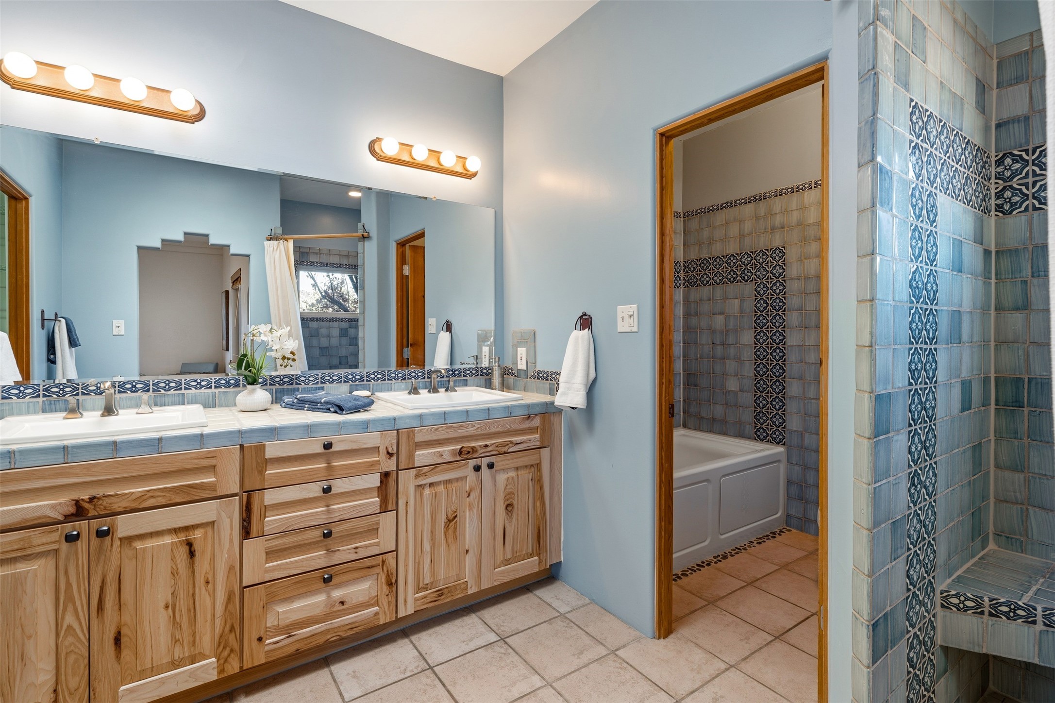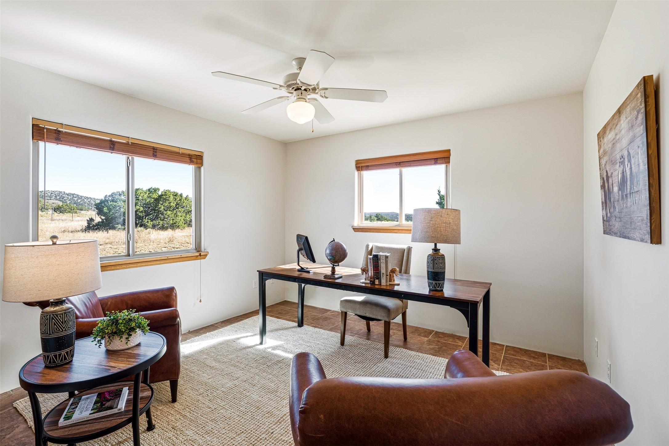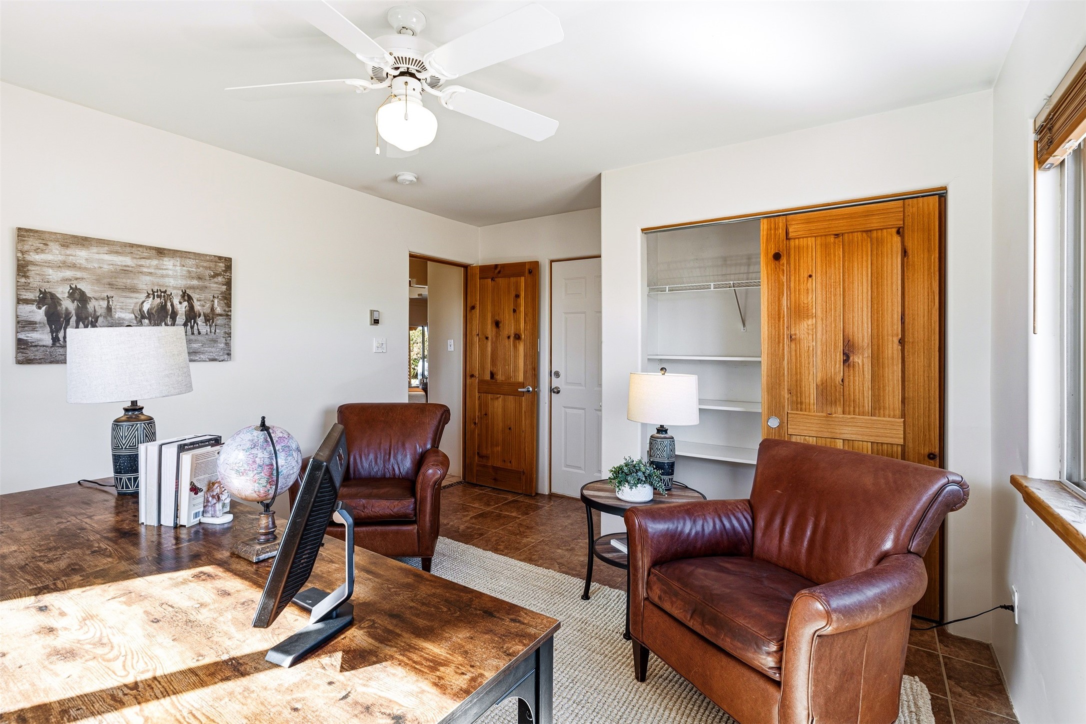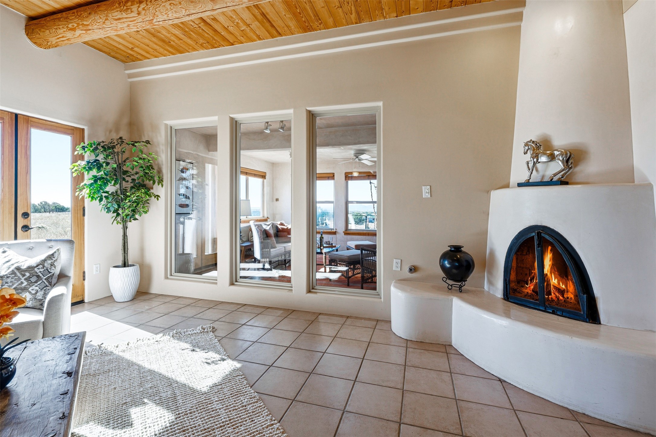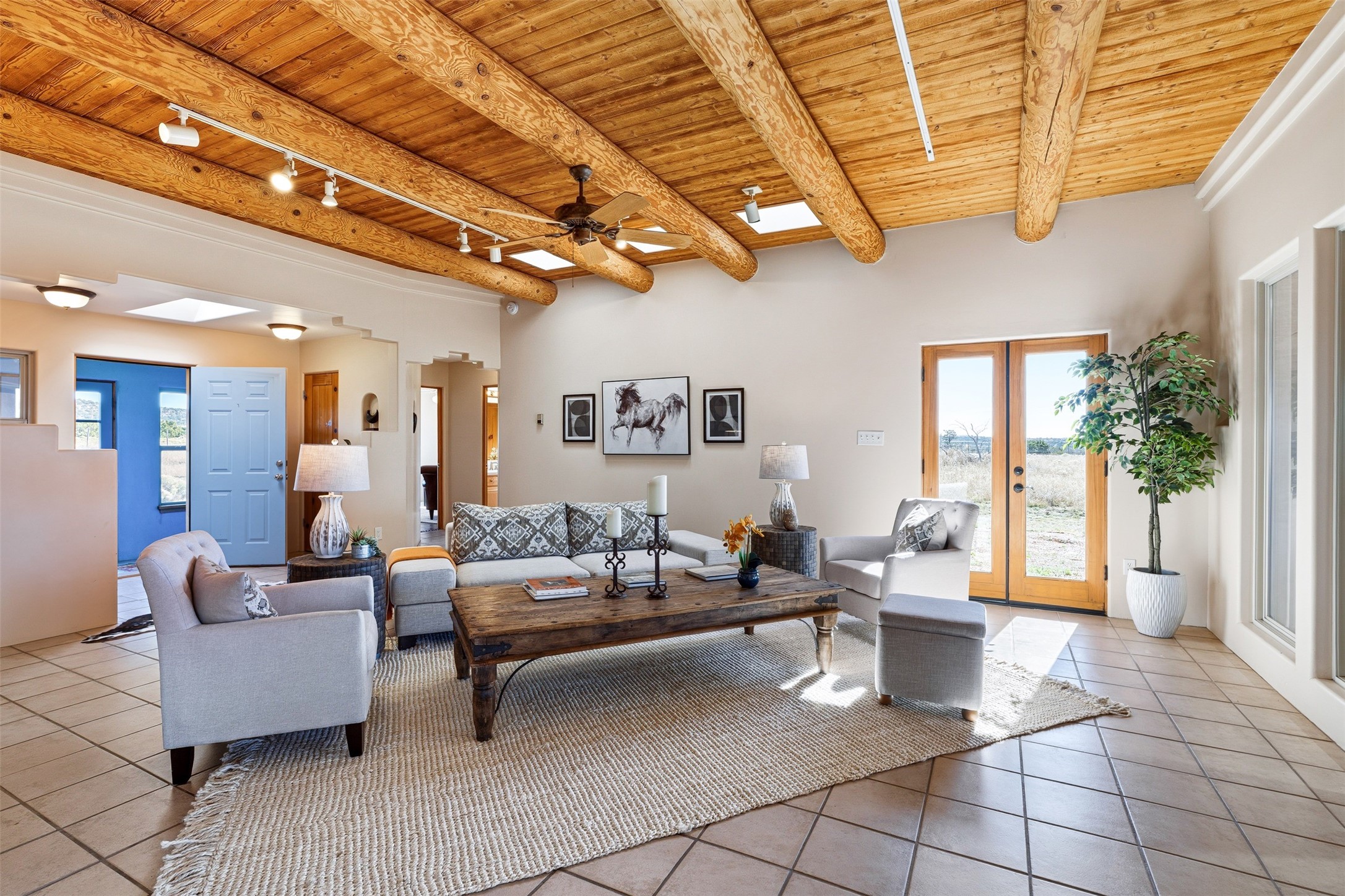 A rare horse property. This Santa Fe-style country home offers an exceptional location directly across from Eldorado, providing convenient access to local community amenities. The property benefits from Eldorado water and natural gas, and its proximity to the highway ensures easy access to town.The home features a split floor plan and an open-concept living, dining, and kitchen area, perfect for comfortable living and entertaining, all while offering beautiful southerly mountain views.The oversized garage is a real plus with plenty of storage and shelving. Walk thru laundry room. Enclosed, heated sunroom. For equestrian enthusiasts, this property is truly turn-key featuring a 2,400 sq ft, center-aisle, block and metal barn with four stalls, each equipped with attached piped paddocks, crusher fine footing, and automatic heated waterers. The barn also includes a dedicated tack room, a hot water wash rack, hay storage, and a feed room complete with a sink and toilet. Additional amenities include a piped rail sand arena and four turnouts with run-in sheds. Beyond the equestrian facilities, the property also has a detached, 432 sq ft, unheated workshop/studio with a carport and extra storage. No HOA.