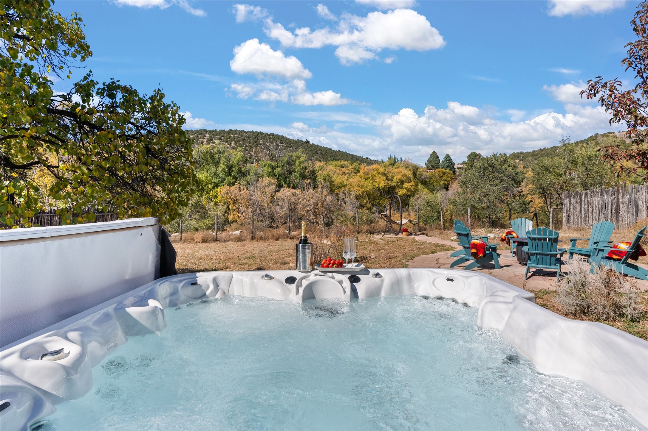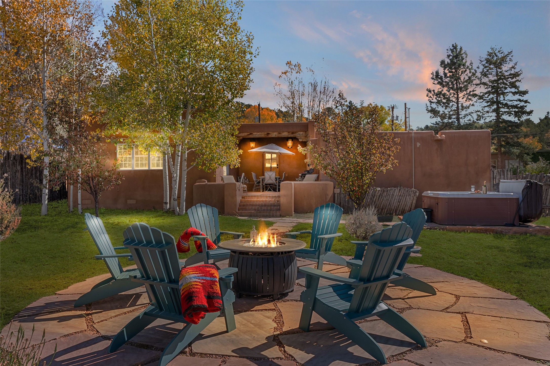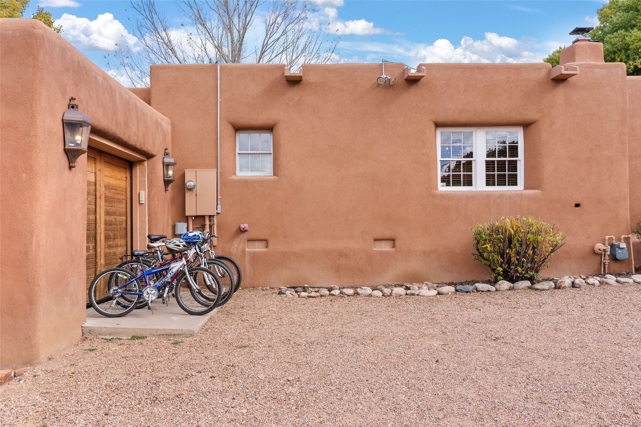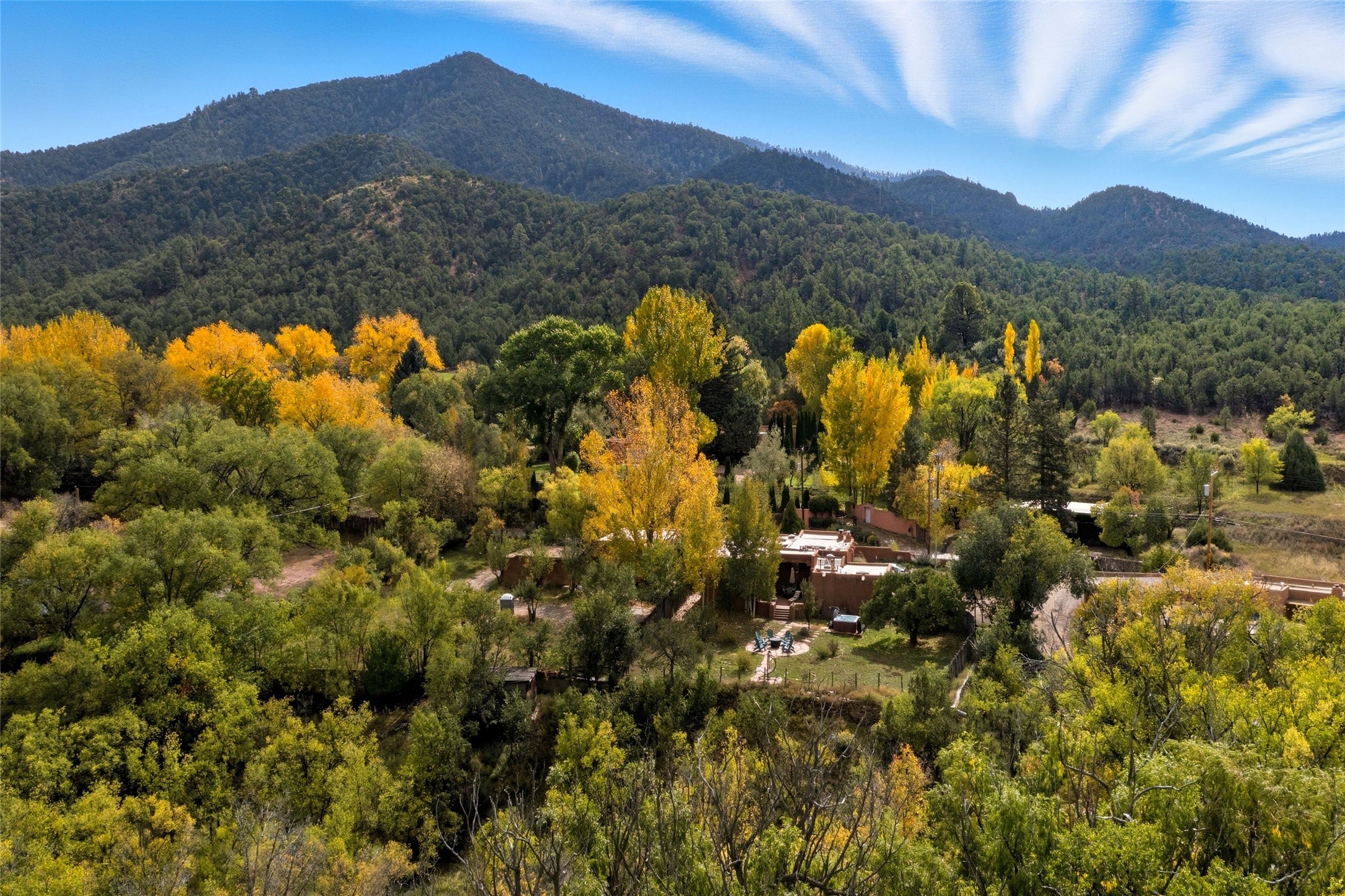 Overlooking the serene Santa Fe River, Historic Upper Canyon Road Santa Fe Eastside 3-bedroom, 2.5-bath adobe home with wonderful mountain views. Potential for rental income upon receipt of a City of Santa Fe Short Term Rental permit. This property includes two separately deeded lots, offering ample space and endless possibilities, whether you envision a guest house, studio, or an expansive garden retreat. High end design features include white oak flooring that flows throughout the open-concept living, dining, and kitchen areas, providing a warm and inviting atmosphere. Highlighted by three charming fireplaces and custom alder cabinets, the home seamlessly blends comfort and sophistication. The light-filled kitchen is appointed with top-of-the-line Wolf gas range, Sub-Zero refrigerator, and a Sub-Zero wine cooler, making it ideal for both everyday cooking and entertaining. Primary suite features a sitting area, fireplace, and private access to the outdoor patio. The en-suite bath is a luxurious escape, complete with a Kohler Tea-for-Two tub and a spacious walk-in shower. Two additional guest bedrooms share a bath and a cozy office area, perfect for remote work or creative pursuits. Step outside to enjoy multiple outdoor spaces that showcase breathtaking river and mountain views. To top it all off, a hot tub awaits you for soothing evenings under the stars. Rare one-car garage on Upper Canyon Rd. Coveted location close to the Cerro Gordo Trailhead, restaurants and galleries of Canyon Rd and the Santa Fe Plaza.