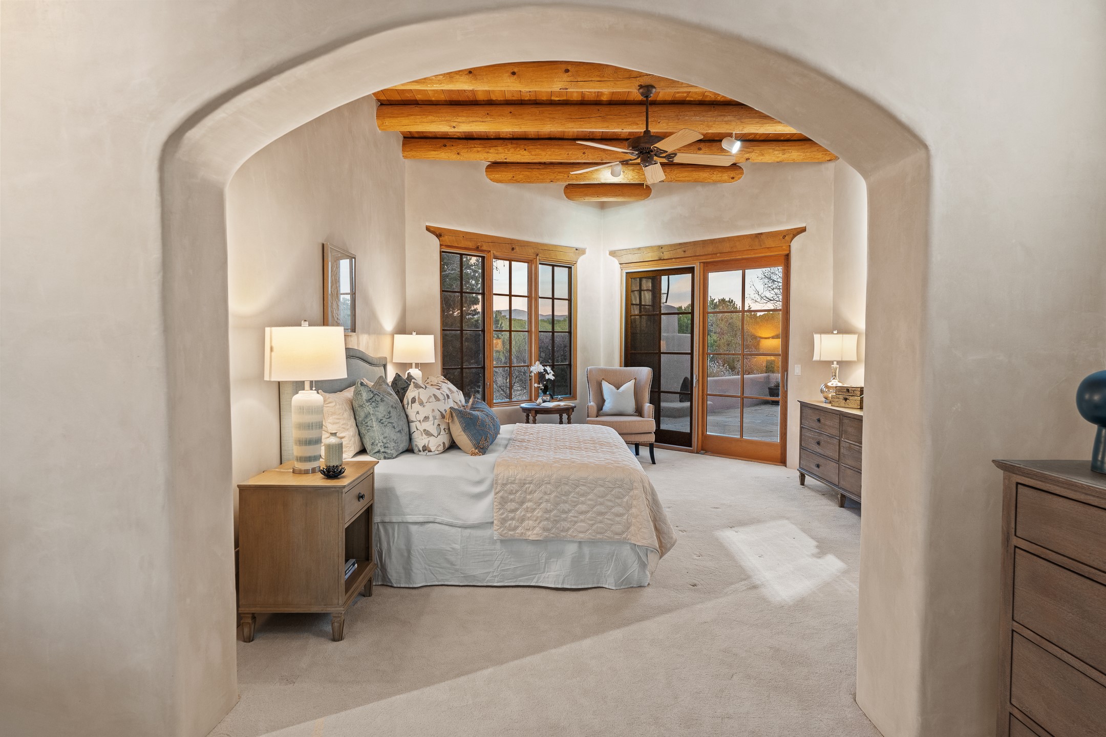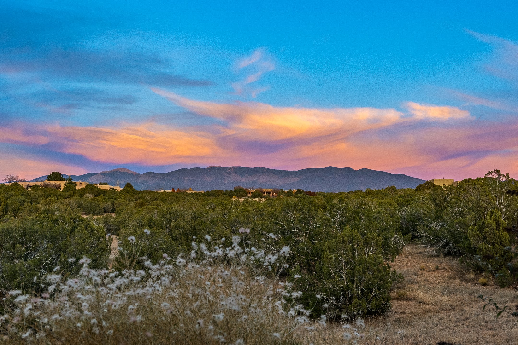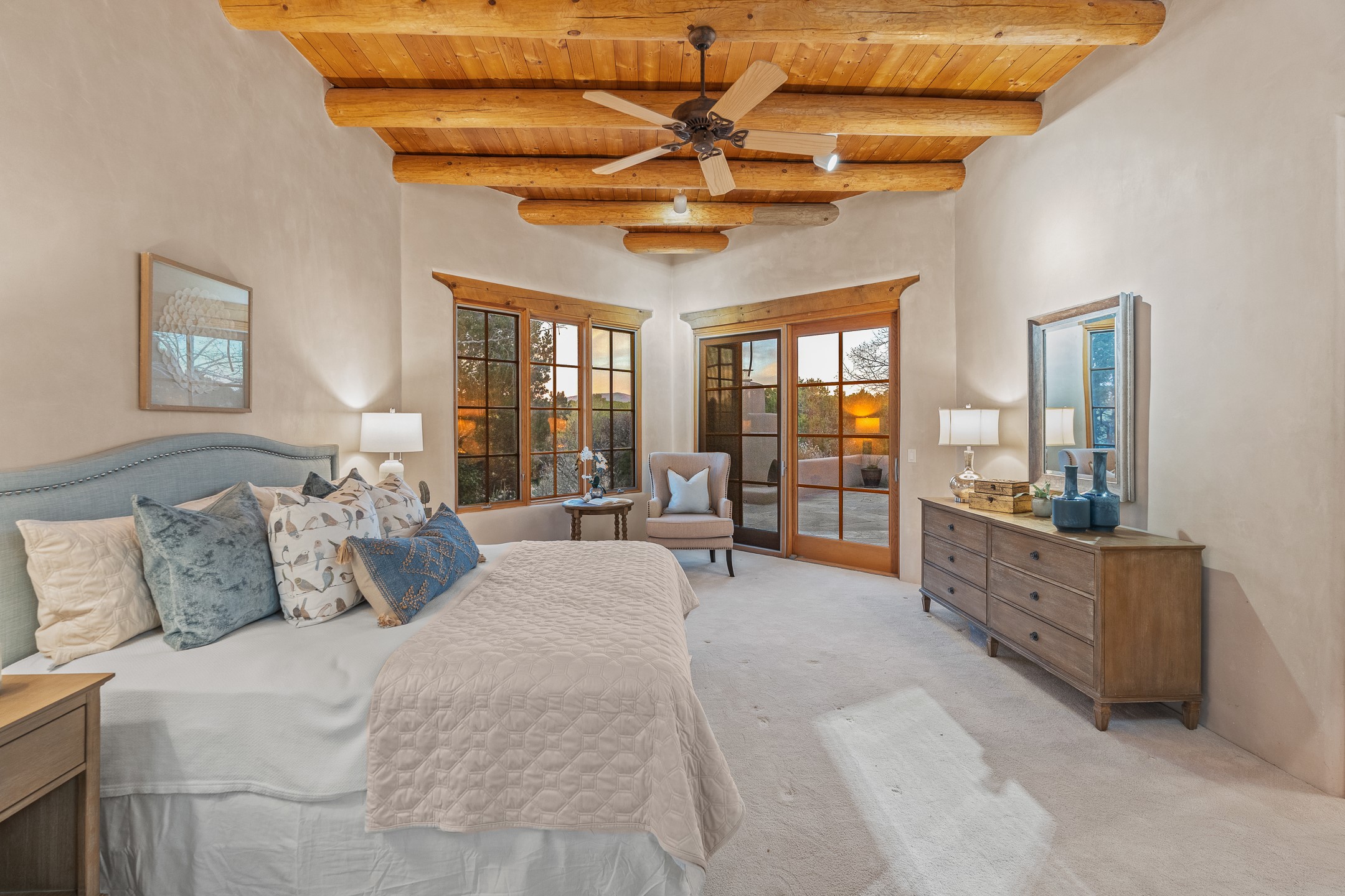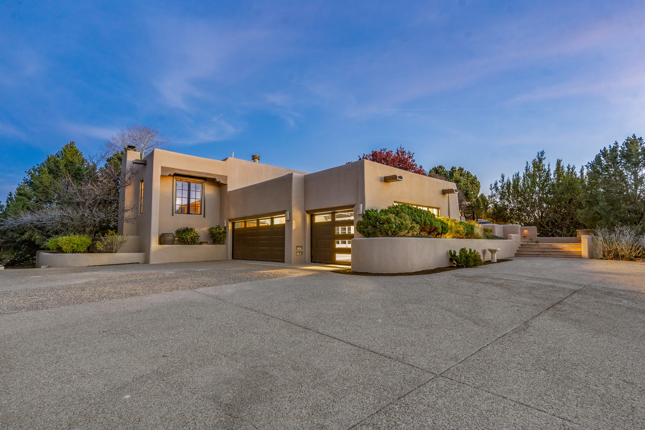 Remarkable and spacious Pueblo Style Home perfectly situated on a premium 3.51 acre +/- lot at the end of a cul-de-sac showcasing panoramic massive Sangre de Cristo and Jemez Mountain views and enclosed gardens! This bright, sun-lit home has an outstanding floor plan with a separated guest wing, large family room off the kitchen, lovely covered outdoor portals with fireplaces, an oversized massive primary suite, and an impressive entry foyer that flows into an expansive great room, perfect for entertaining, and three guest rooms with ensuite bathrooms. The home features a finished garage with A/C/heating split and new garage doors, new outdoor automatic sunshades, new Subzero refrigerator/freezer and Bosch dishwasher, pull out shelving, new designer closets in primary suite, new LED room and closet lighting throughout the home, and newly replaced exterior woodwork.