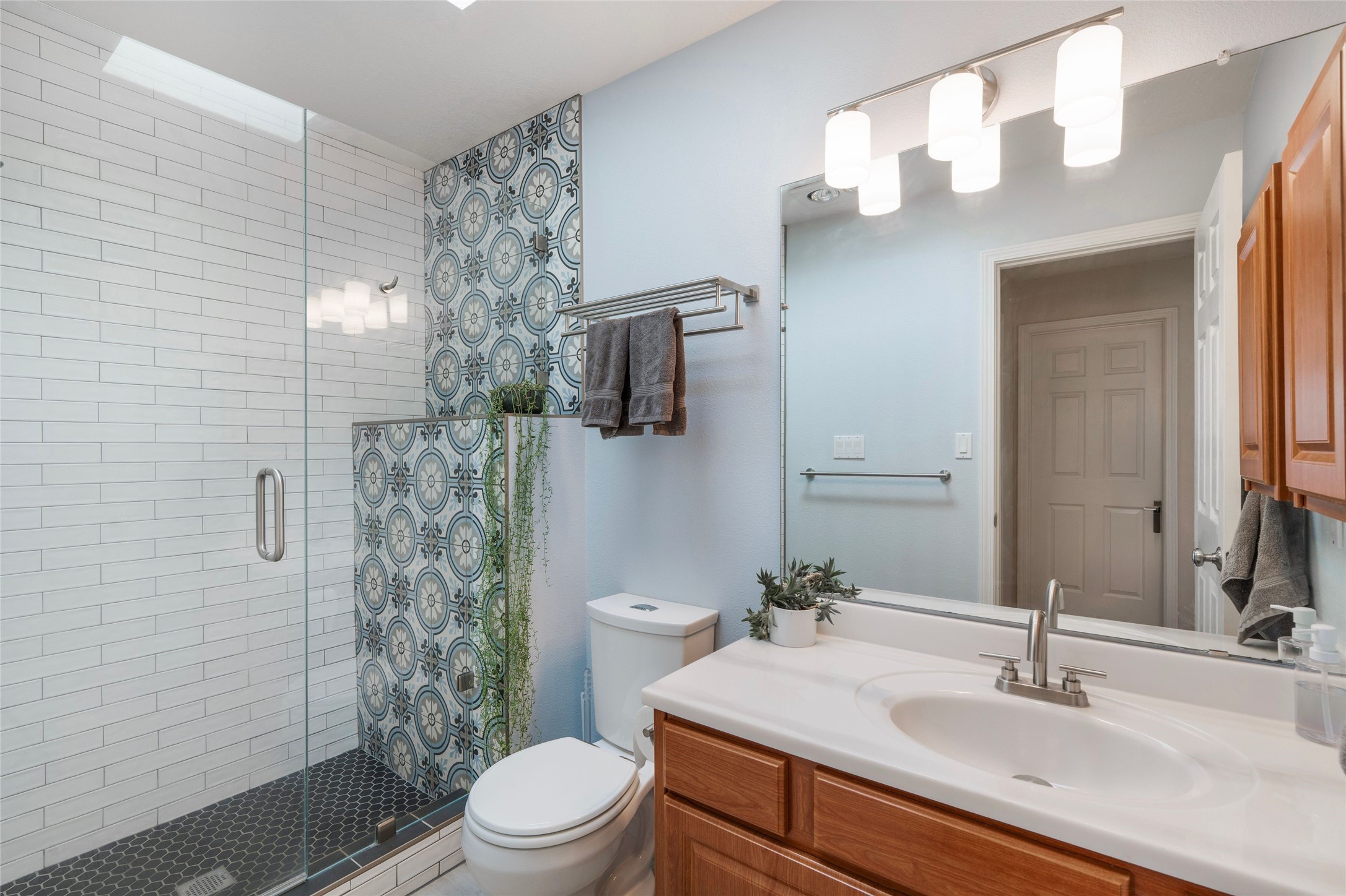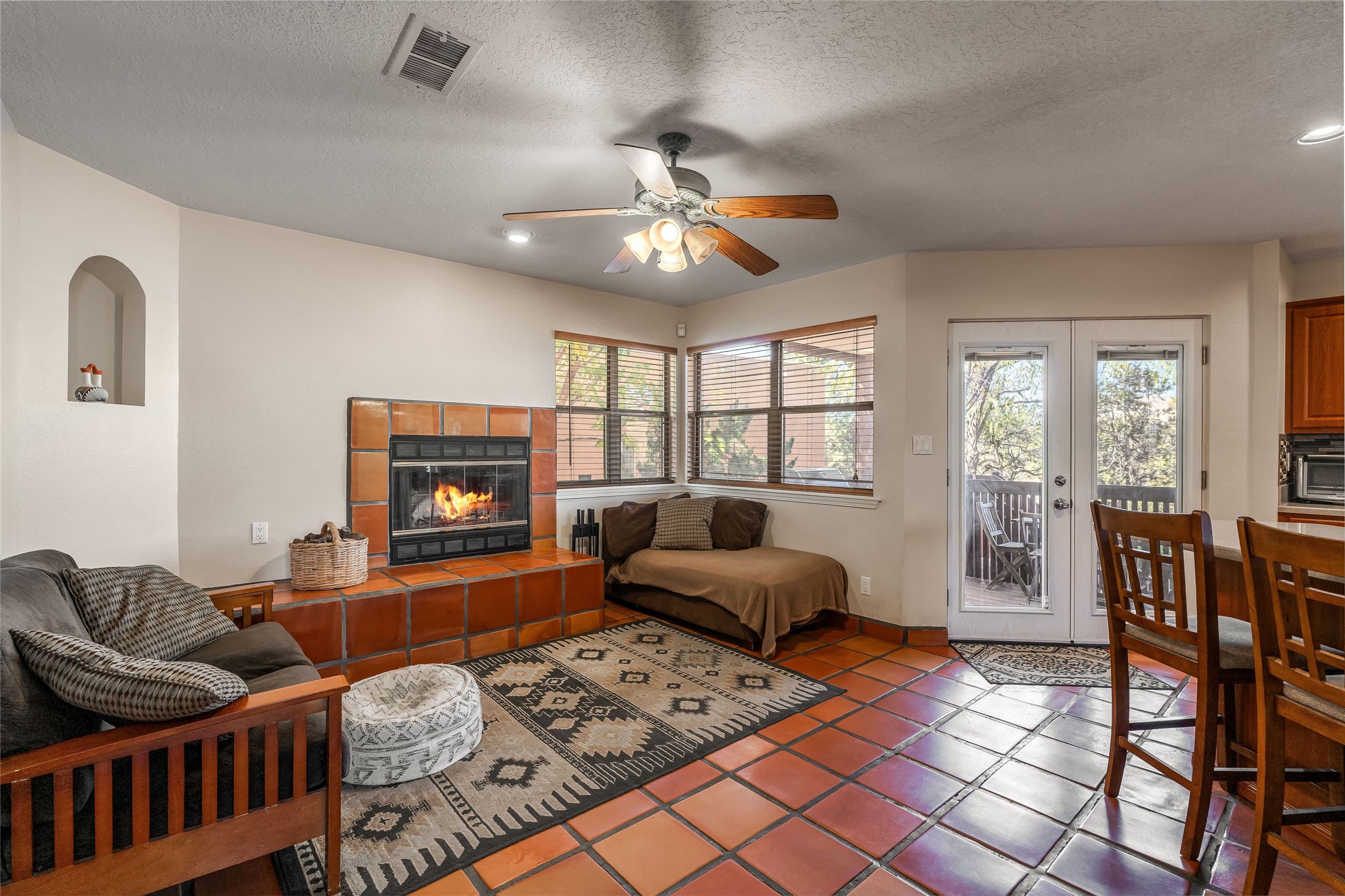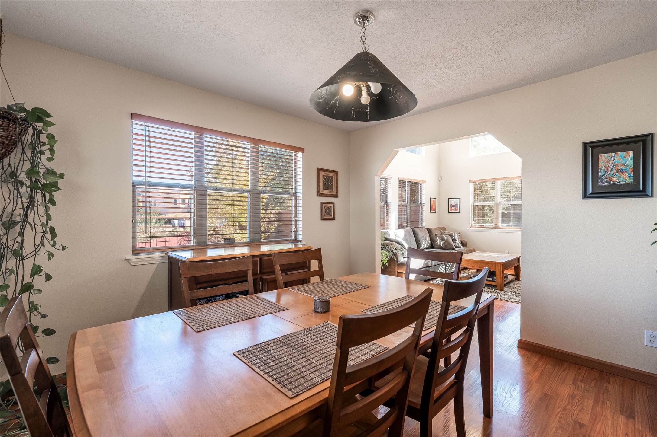 This spacious and comfortable two-story home sits on a unique private lot in the quiet and well-maintained Pueblos del Sol neighborhood. The large landscaped and fully-fenced backyard overlooks open space and features mature shade and apple trees, a pergola, and a patio that are perfect for entertaining, grilling, gardening or relaxing. The kitchen connects to the den for casual gatherings or morning coffee, with easy access to the backyard off the kitchen. The primary suite is the perfect retreat with a huge updated and expanded shower and separate bath, a large walk-in closet, and a peaceful balcony for catching the sunset or some mountain views. The living room has tons of natural light, high ceilings and vigas which provide the cozy comfort of home. There is plenty of room for your family, guests, or home office in this 2,286 square foot 4 bedroom and 3 bath home. An oversized and finished 2-car garage, tool shed, second refrigerator, giant kitchen pantry, laundry room, and ample closet space provide plenty of storage for all your needs and hobbies. Miles of neighborhood walking trails are accessible just a few steps from the house, and the brand new Pueblos del Sol playground is just down the street. Recent updates include a new water heater (2025), new upstairs blinds (2025), whole house parapet restoration (2024), and upstairs guest and primary bathroom remodel (2020).
