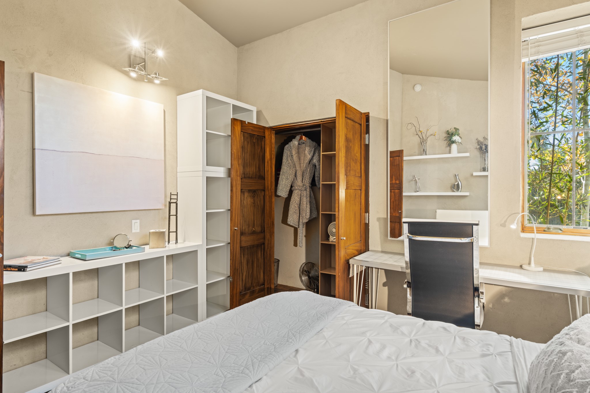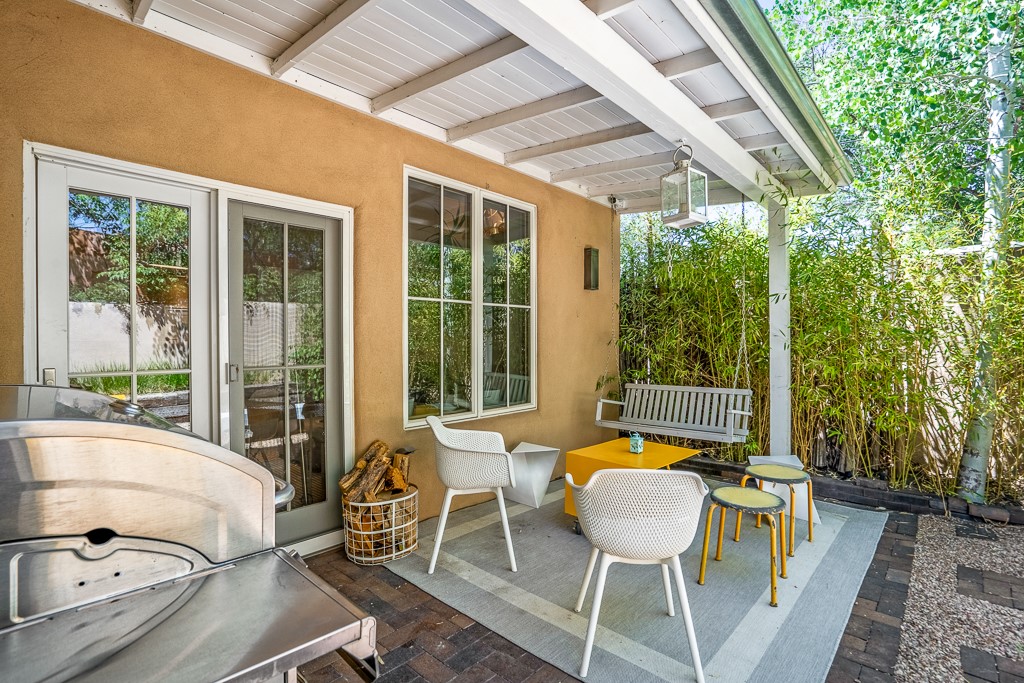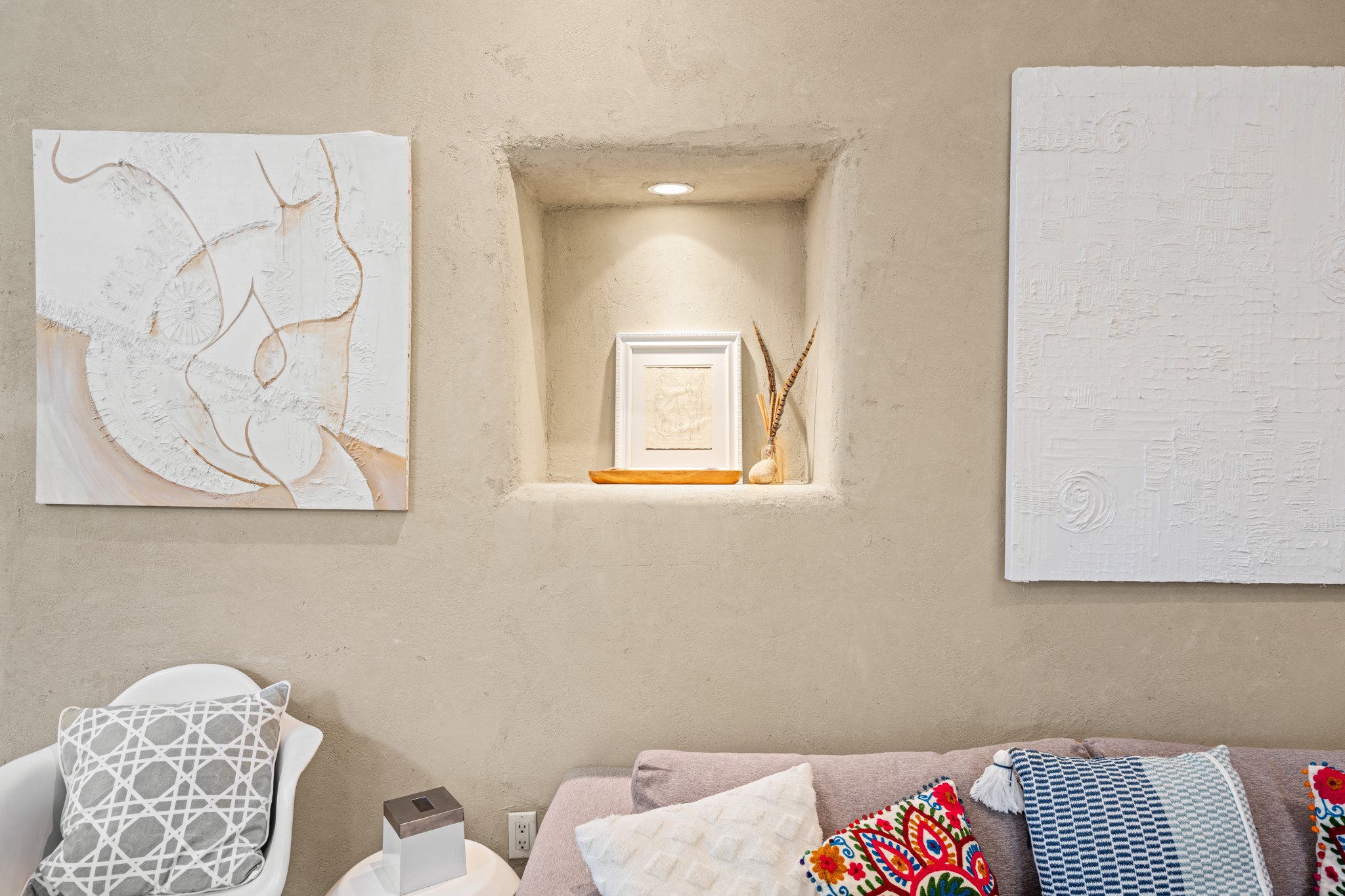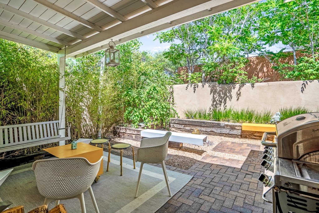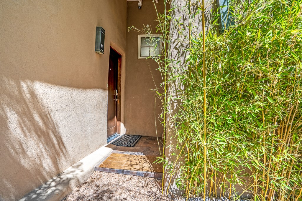 Unique Contemporary condo in one of the most convenient Santa Fe locations. You can walk to the DeVargas Mall, the historic Santa Fe Plaza or the Railyard district in just minutes !! Constructed in 2009 by award winning architect Andrea Caraballo, this 2 bedroom 2 bathroom condo has a level of fit and finish you just don't find in most condos. Old world Italian stucco meets new world modern stainless steel appliances, high end cabinets, Silestone countertops, gorgeous brick pavers and unique lighting. This property has in-floor radiant heating, central air conditioning, built-in sound system, wood / gas fireplace and a large concrete basement for storage. There are 2 outdoor living spaces with comfortable seating and a beautiful water feature. Did I mention it has 3 dedicated parking spaces? Combining the superior architectural design elements, the abundance of storage in every room, the lovely outdoor patios and the modern new mechanical systems... this is a rare beauty just waiting for the next owner.Please don't miss out on this very special property !!