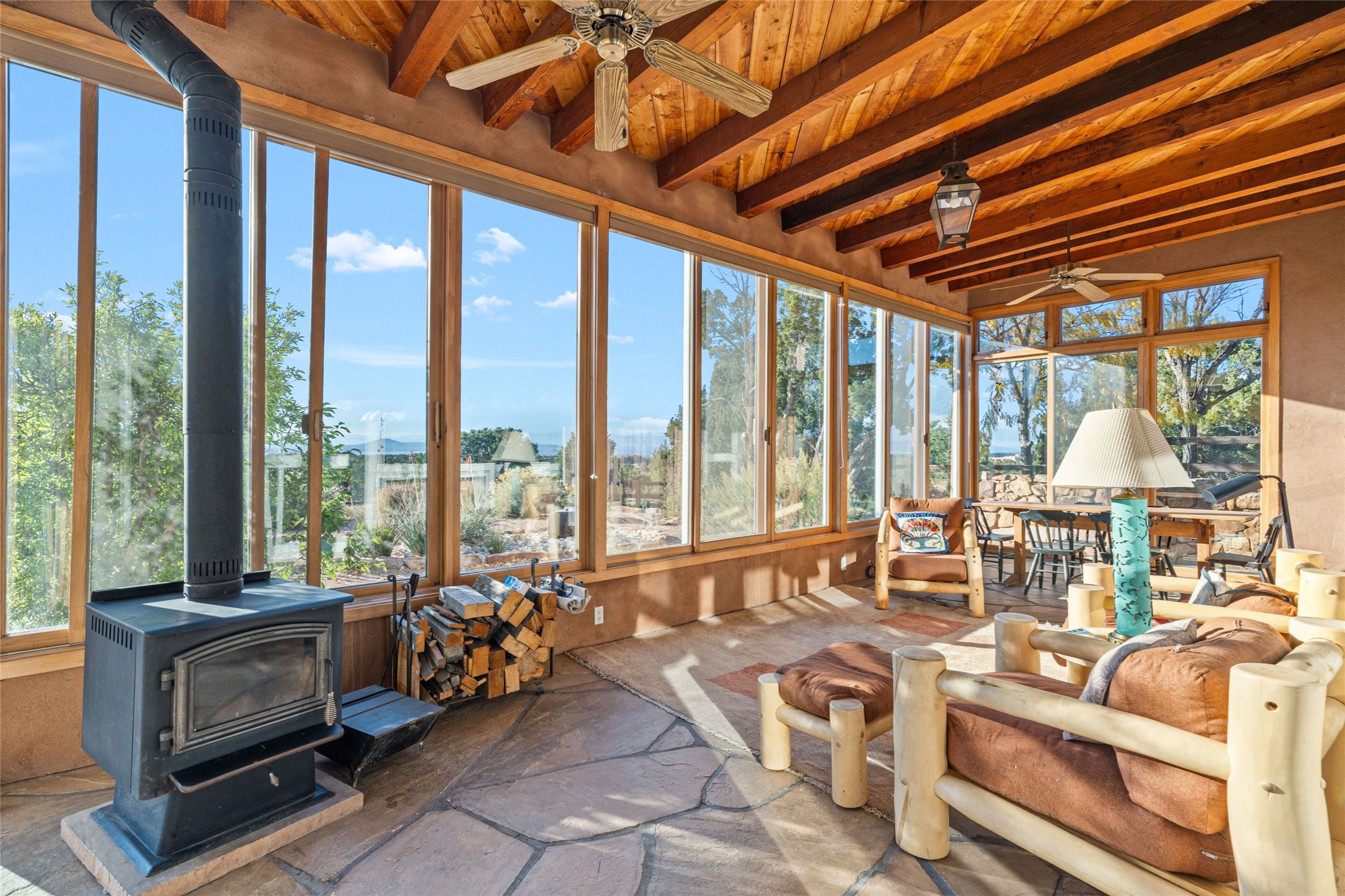 Private La Tierra custom home topping 12 Pinion and Juniper covered acres, set high to capture panoramic Jemez and Sangre de Cristo Mountain views. Experience exceptional privacy and independence just 15 minutes from downtown Santa Fe. Combining modern design with classic New Mexico craftsmanship, this unique property offers a rare balance of seclusion and easy access to Santa Fe's world-class restaurants, galleries, and culture. The main residence showcases soaring ceilings, wide-plank pine and flagstone floors, and handcrafted Saltillo tile details. Walls of glass bathe the interior in natural light and frame sweeping vistas in every direction, creating an atmosphere of calm and inspiration. Currently configured as a three-bedroom home, the flexible layout includes a spacious home office easily convertible to a fourth bedroom, a second office or studio and a dedicated exercise room, a stunning west-facing sunroom perfect for year-round enjoyment of the sunset skies, a luxurious owner's suite with kiva fireplace, high ceilings, and extraordinary Sangre views. Outdoors, a Japanese-inspired courtyard offers serenity and shade. Keep up to four horses with ample space to add a barn or equestrian facilities. Birdwatching at it's best, from inside or outside. Recent Upgrades & Highlights include New stucco (2024) and new flat roof (2025) with transferrable 12-year warranty, Solar electricity system (9 kW ground-mounted, installed 2022 by Positive Energy Solar), Standing-seam pitched roof with high decked ceilings, Forced air & mini-split A/C for year-round comfort, New KitchenAid & Bosch appliances, Silestone countertops, Pre-inspected and lovingly maintained, Septic system sized for four bedrooms. This La Tierra retreat offers a lifestyle of quiet sophistication--a private mountain-view sanctuary minutes from the heart of Santa Fe. Watch the video tour for the full story.
