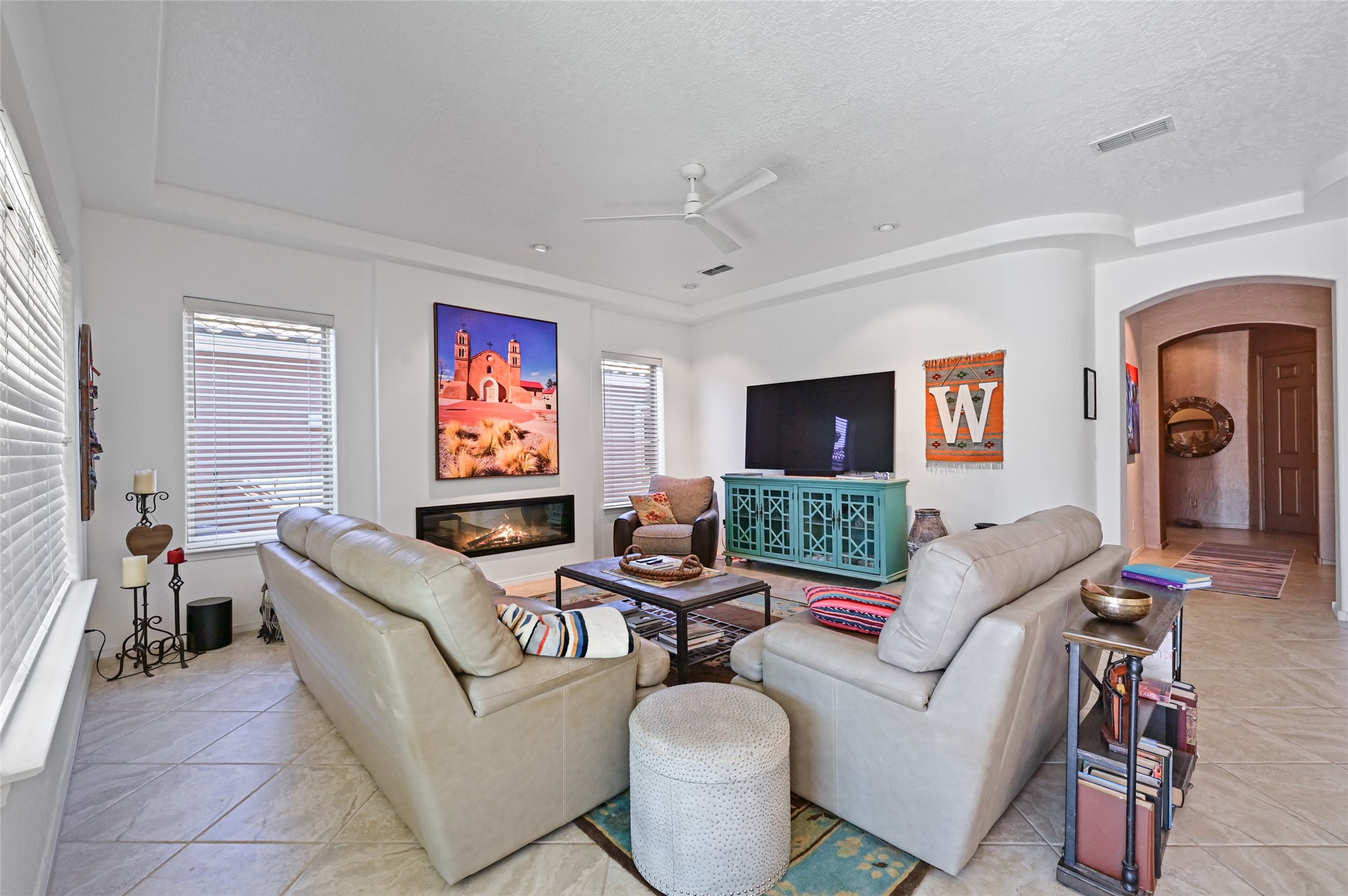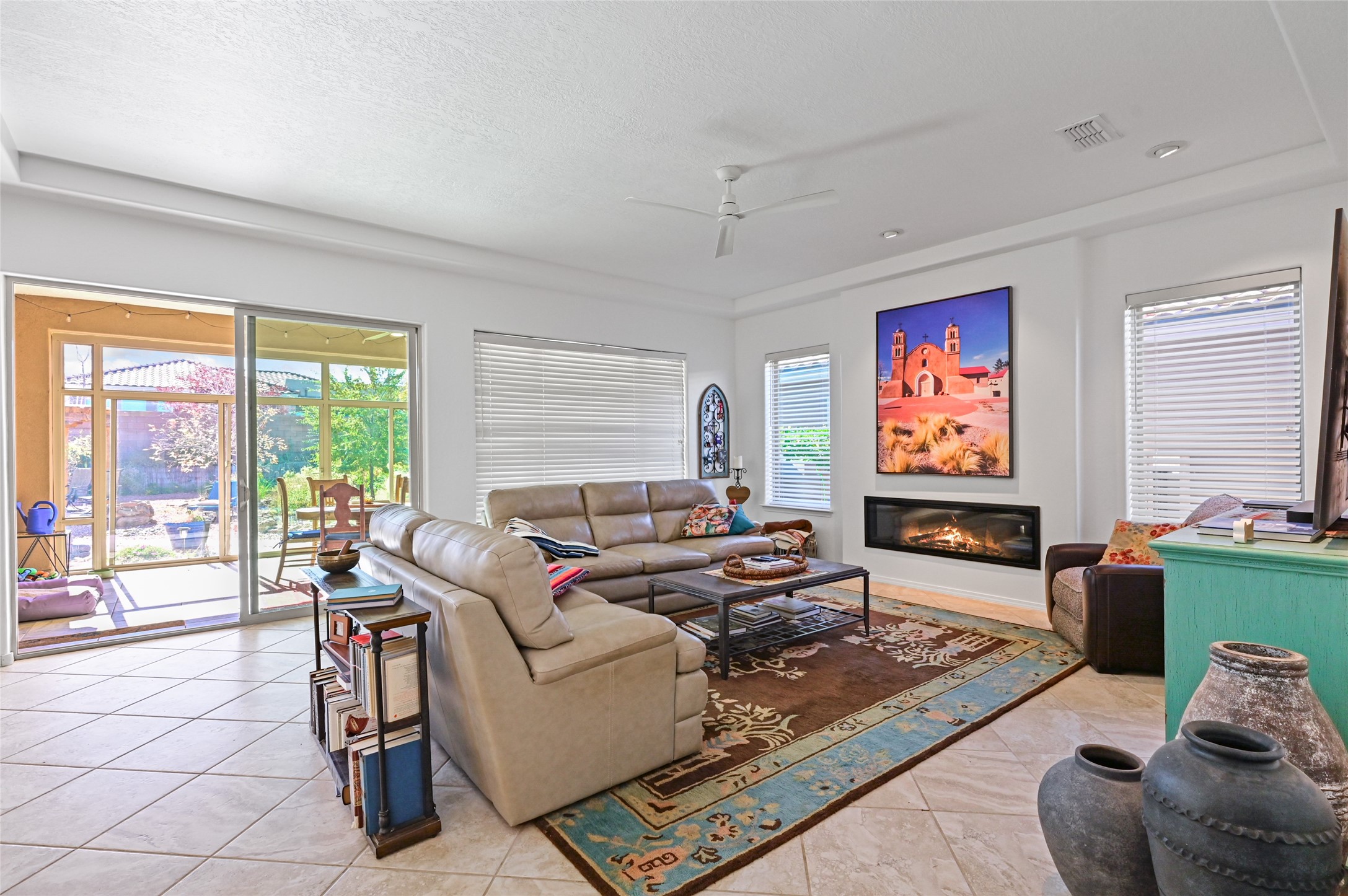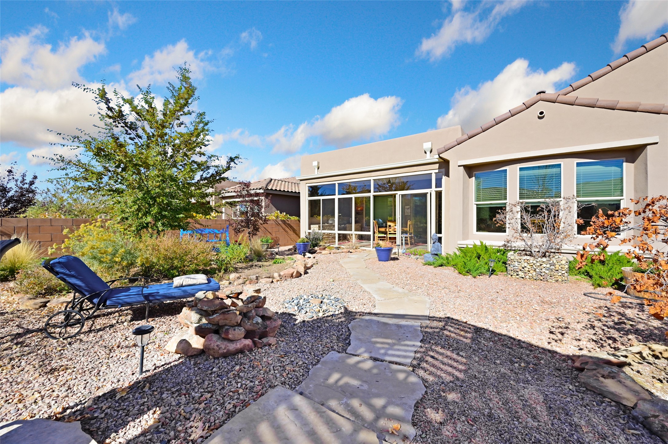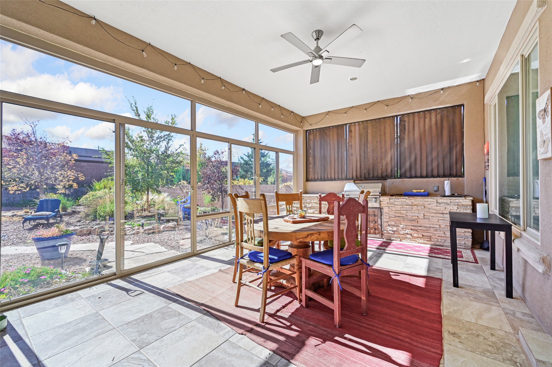 *Current contract is contingent on sale of Buyers" Home.* Step Inside Your Dream Home! Welcome to this beautifully designed, single-level retreat featuring 3 spacious bedrooms, a den/office and 2 full bathrooms. Thoughful design with the comfort of refrigerated air conditioning and the stunning scale provided by 10-ft ceilings and 8-ft doors throughout. An open-concept floor plan flows effortlessly from the living room to the kitchen and dining areas. Fall in love with the gourmet kitchen, a true chef's haven! It's equipped with a gas cooktop, two electric ovens, and a brilliantly designed 42-inch island that even features a convenient, elevated dishwasher. A consistent flow of porcelain tile flooring ties the entire home together, offering both beauty and easy upkeep. A Retreat for Everyone. You'll find the tranquil primary bedroom suite on one end of the home, while the comfortable guest wing is tucked away on the other. A serene enclosed sunroom, complete with windows and screening, features a built-in barbecue grill! An ideal place to unwind while enjoying views of the walled yard. The same luxurious granite countertops you see inside right into the outdoor kitchen area for a sophisticated, continuous look. Outdoor Oasis and Community Perks. The backyard features a custom pergola--the perfect spot to enjoy the beautiful Southwest Garden. And the community adds value with a great jogging path just steps away! This home truly brings together style, comfort, and functionality.