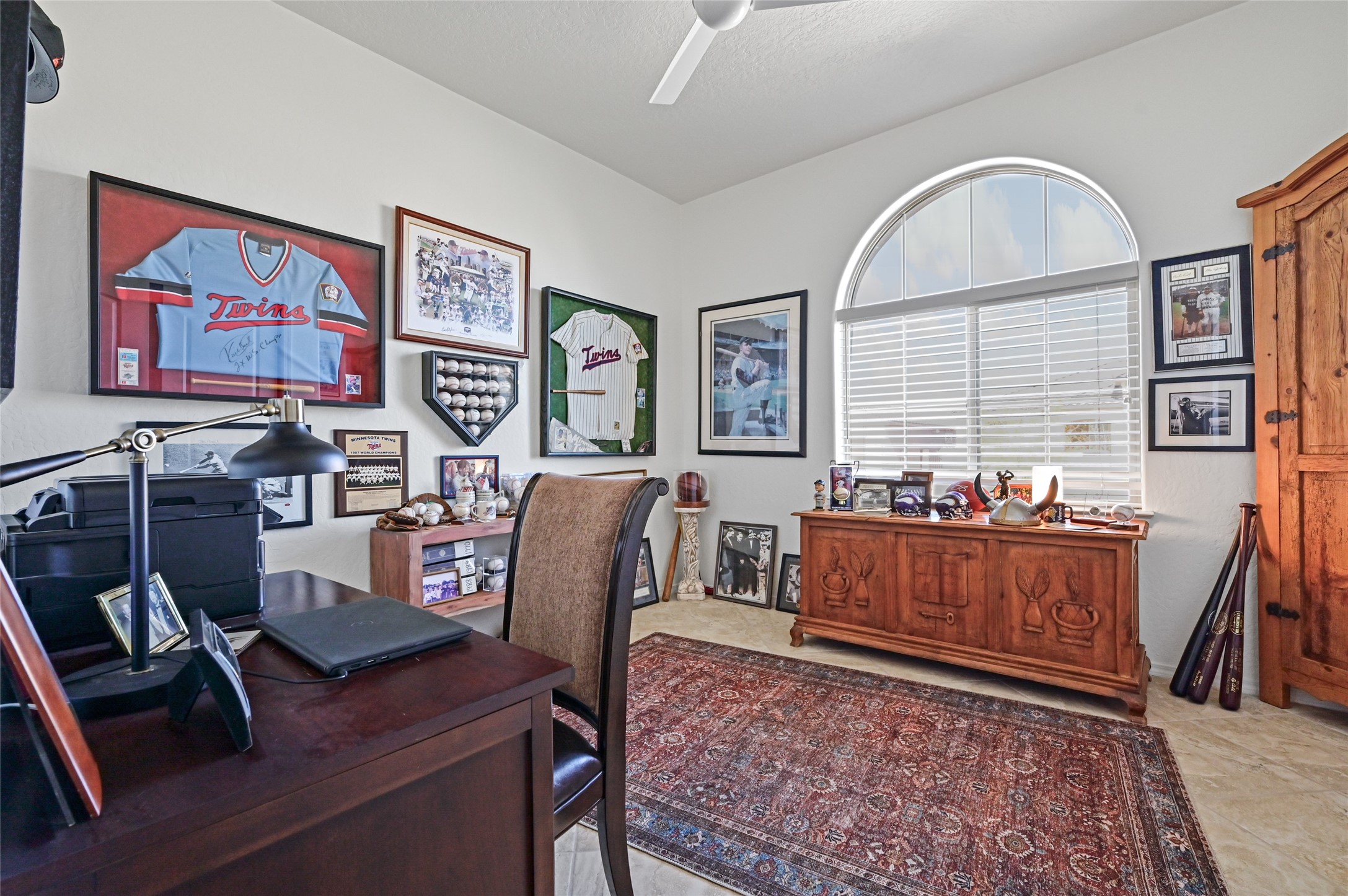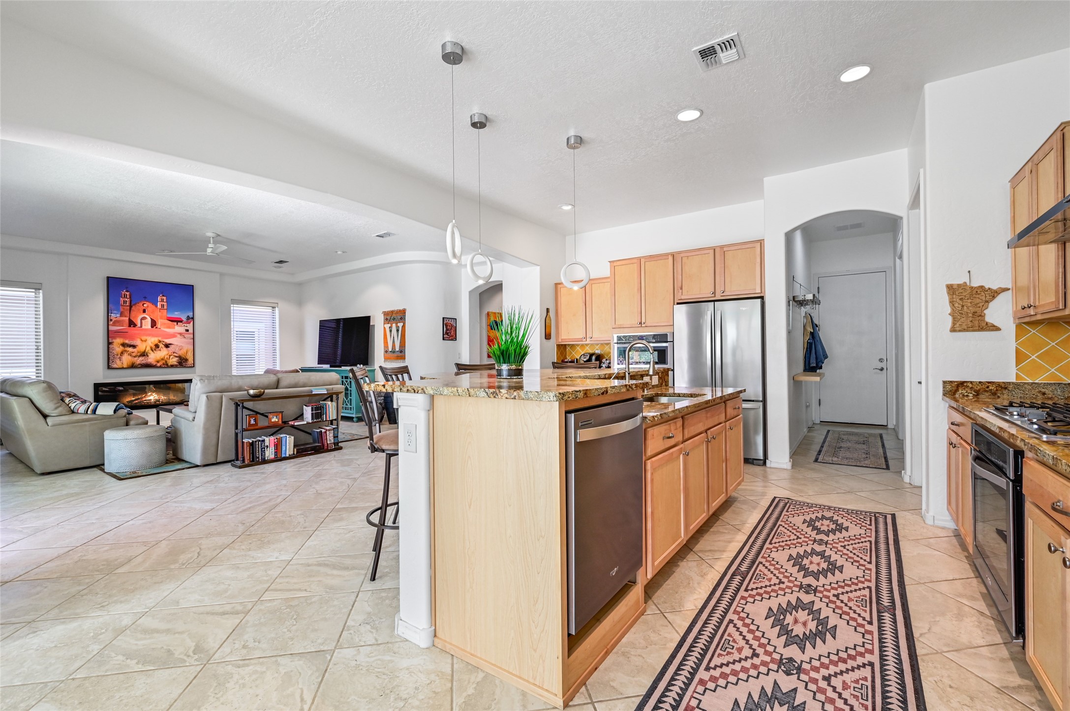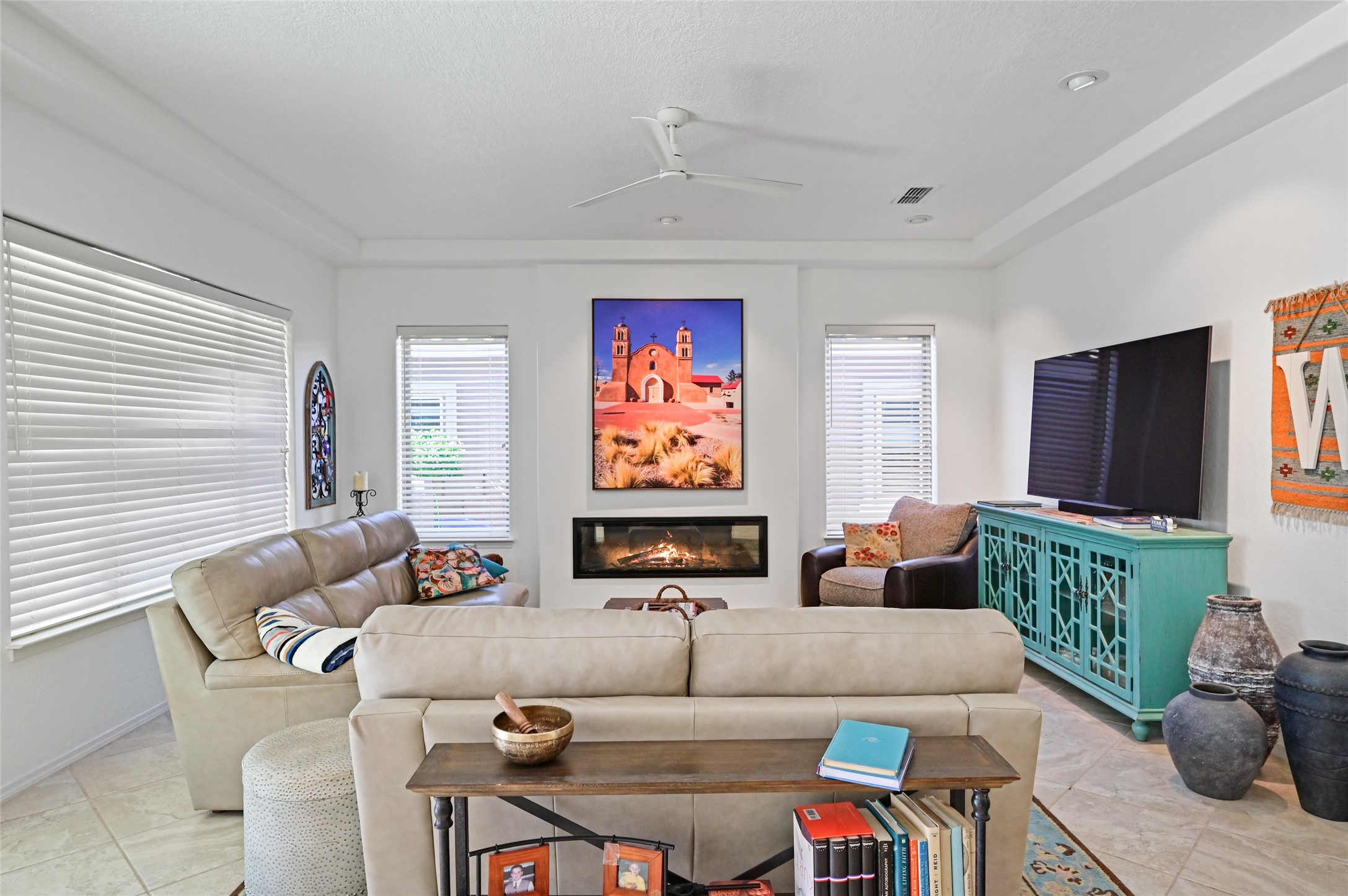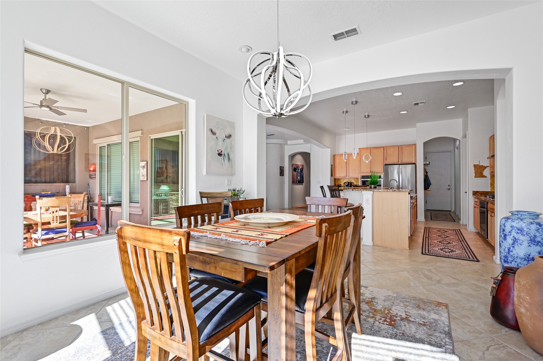 *Current contract is contingent on sale of Buyers" Home.* Step Inside Your Dream Home! Welcome to this beautifully designed, single-level retreat featuring 3 spacious bedrooms, a den/office and 2 full bathrooms. Thoughful design with the comfort of refrigerated air conditioning and the stunning scale provided by 10-ft ceilings and 8-ft doors throughout. An open-concept floor plan flows effortlessly from the living room to the kitchen and dining areas. Fall in love with the gourmet kitchen, a true chef's haven! It's equipped with a gas cooktop, two electric ovens, and a brilliantly designed 42-inch island that even features a convenient, elevated dishwasher. A consistent flow of porcelain tile flooring ties the entire home together, offering both beauty and easy upkeep. A Retreat for Everyone. You'll find the tranquil primary bedroom suite on one end of the home, while the comfortable guest wing is tucked away on the other. A serene enclosed sunroom, complete with windows and screening, features a built-in barbecue grill! An ideal place to unwind while enjoying views of the walled yard. The same luxurious granite countertops you see inside right into the outdoor kitchen area for a sophisticated, continuous look. Outdoor Oasis and Community Perks. The backyard features a custom pergola--the perfect spot to enjoy the beautiful Southwest Garden. And the community adds value with a great jogging path just steps away! This home truly brings together style, comfort, and functionality.