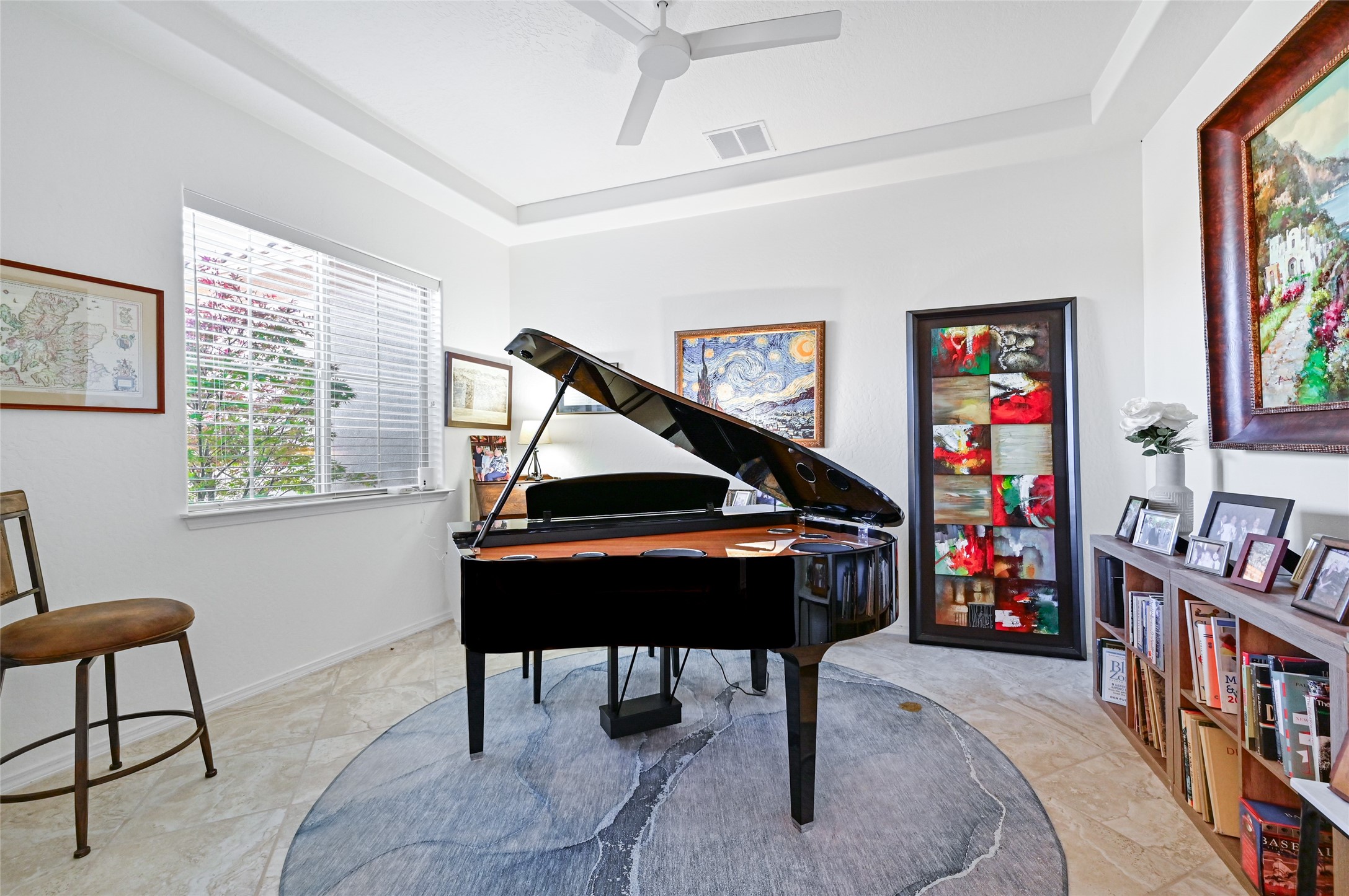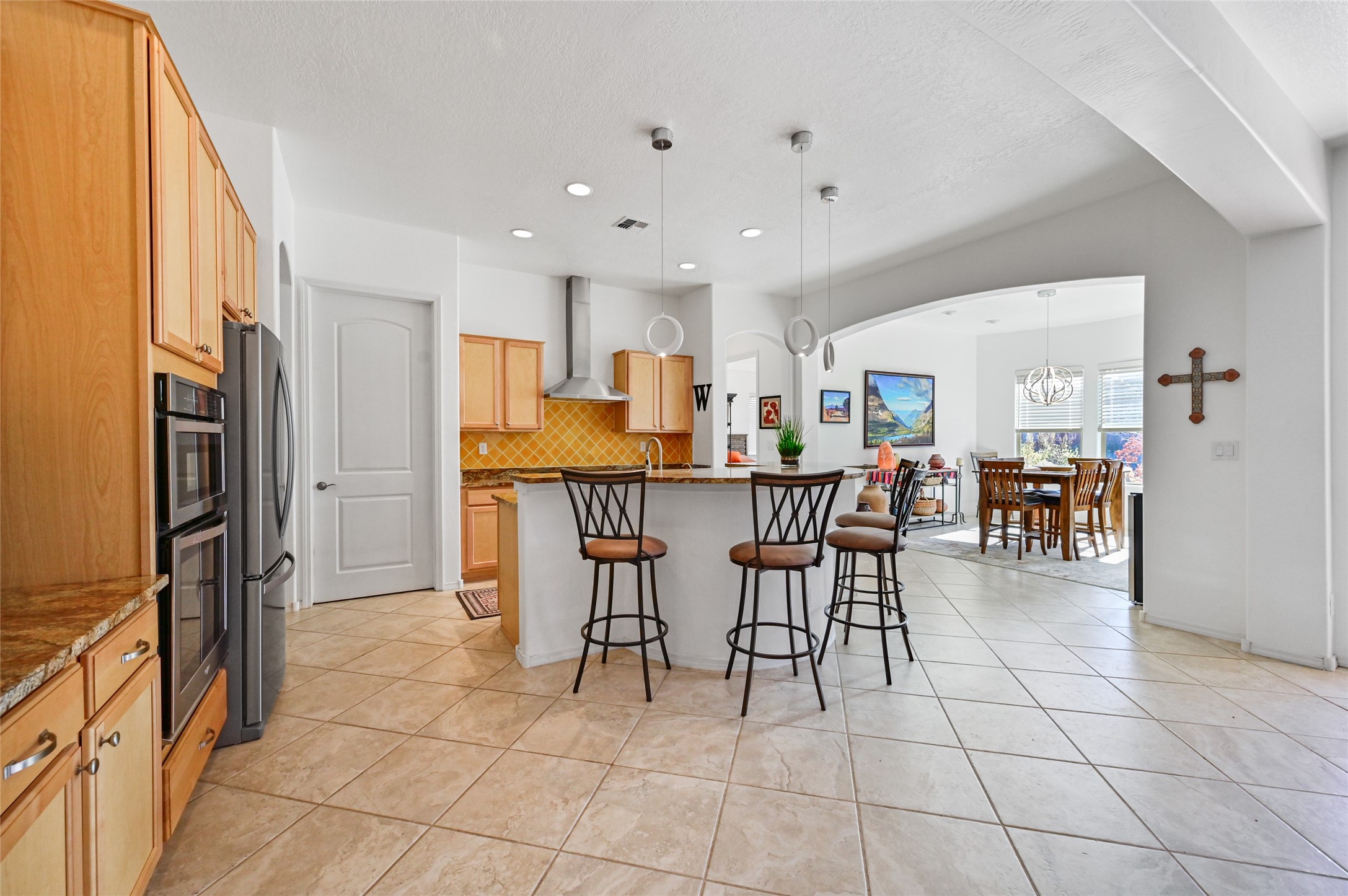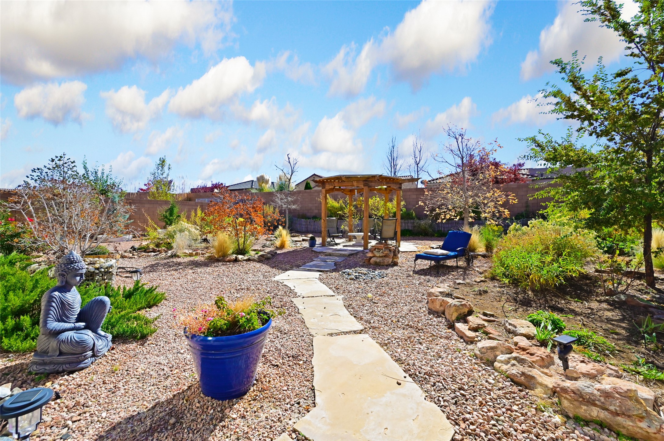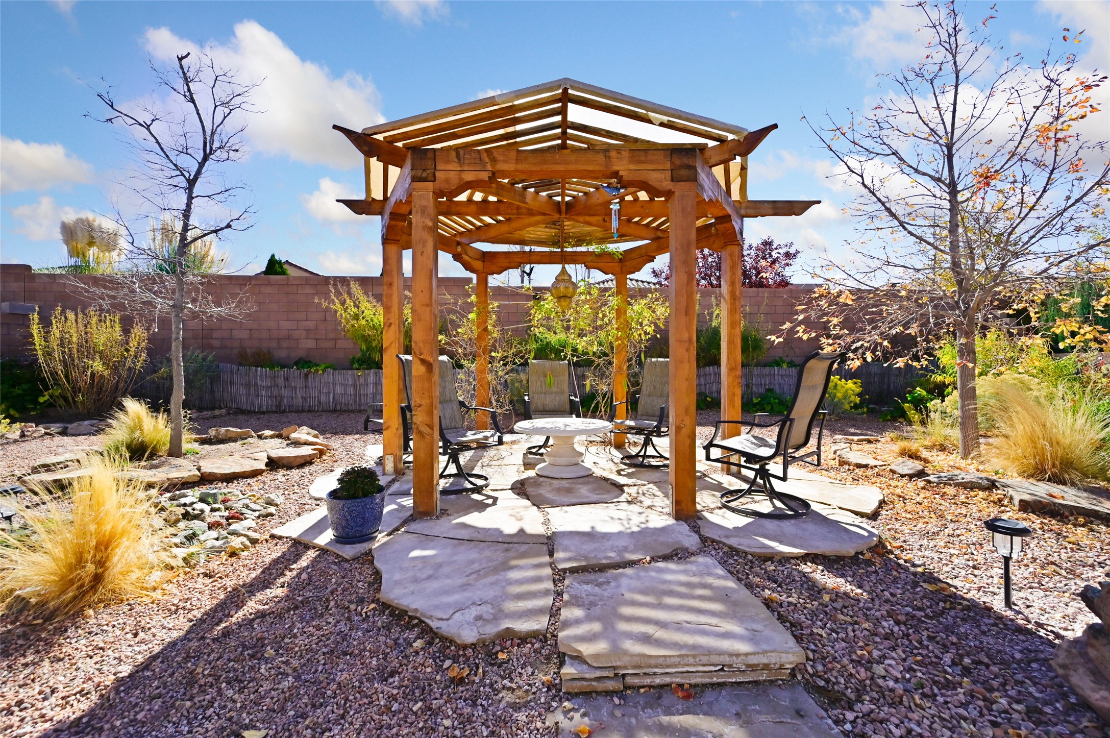 *Current contract is contingent on sale of Buyers" Home.* Step Inside Your Dream Home! Welcome to this beautifully designed, single-level retreat featuring 3 spacious bedrooms, a den/office and 2 full bathrooms. Thoughful design with the comfort of refrigerated air conditioning and the stunning scale provided by 10-ft ceilings and 8-ft doors throughout. An open-concept floor plan flows effortlessly from the living room to the kitchen and dining areas. Fall in love with the gourmet kitchen, a true chef's haven! It's equipped with a gas cooktop, two electric ovens, and a brilliantly designed 42-inch island that even features a convenient, elevated dishwasher. A consistent flow of porcelain tile flooring ties the entire home together, offering both beauty and easy upkeep. A Retreat for Everyone. You'll find the tranquil primary bedroom suite on one end of the home, while the comfortable guest wing is tucked away on the other. A serene enclosed sunroom, complete with windows and screening, features a built-in barbecue grill! An ideal place to unwind while enjoying views of the walled yard. The same luxurious granite countertops you see inside right into the outdoor kitchen area for a sophisticated, continuous look. Outdoor Oasis and Community Perks. The backyard features a custom pergola--the perfect spot to enjoy the beautiful Southwest Garden. And the community adds value with a great jogging path just steps away! This home truly brings together style, comfort, and functionality.