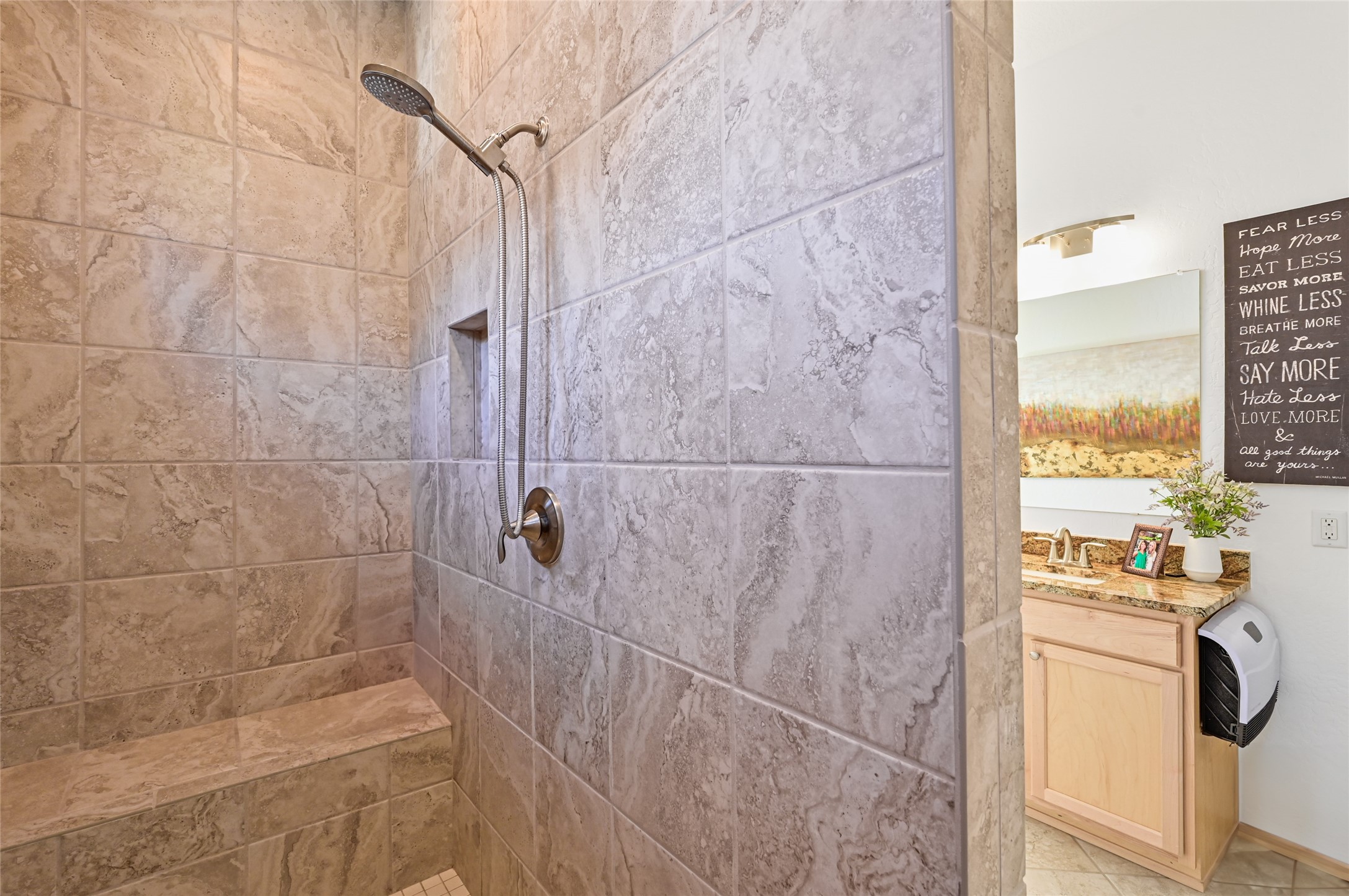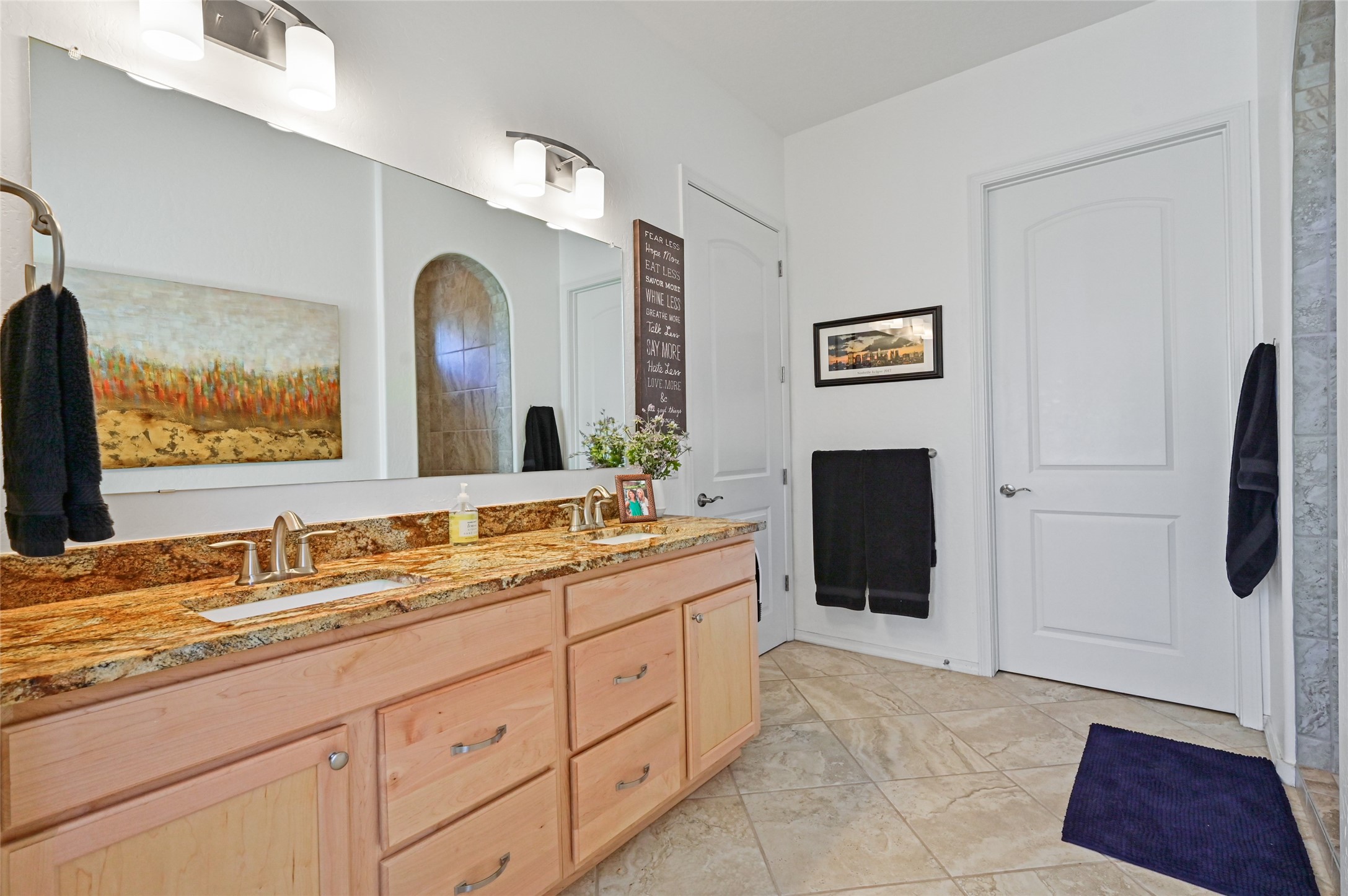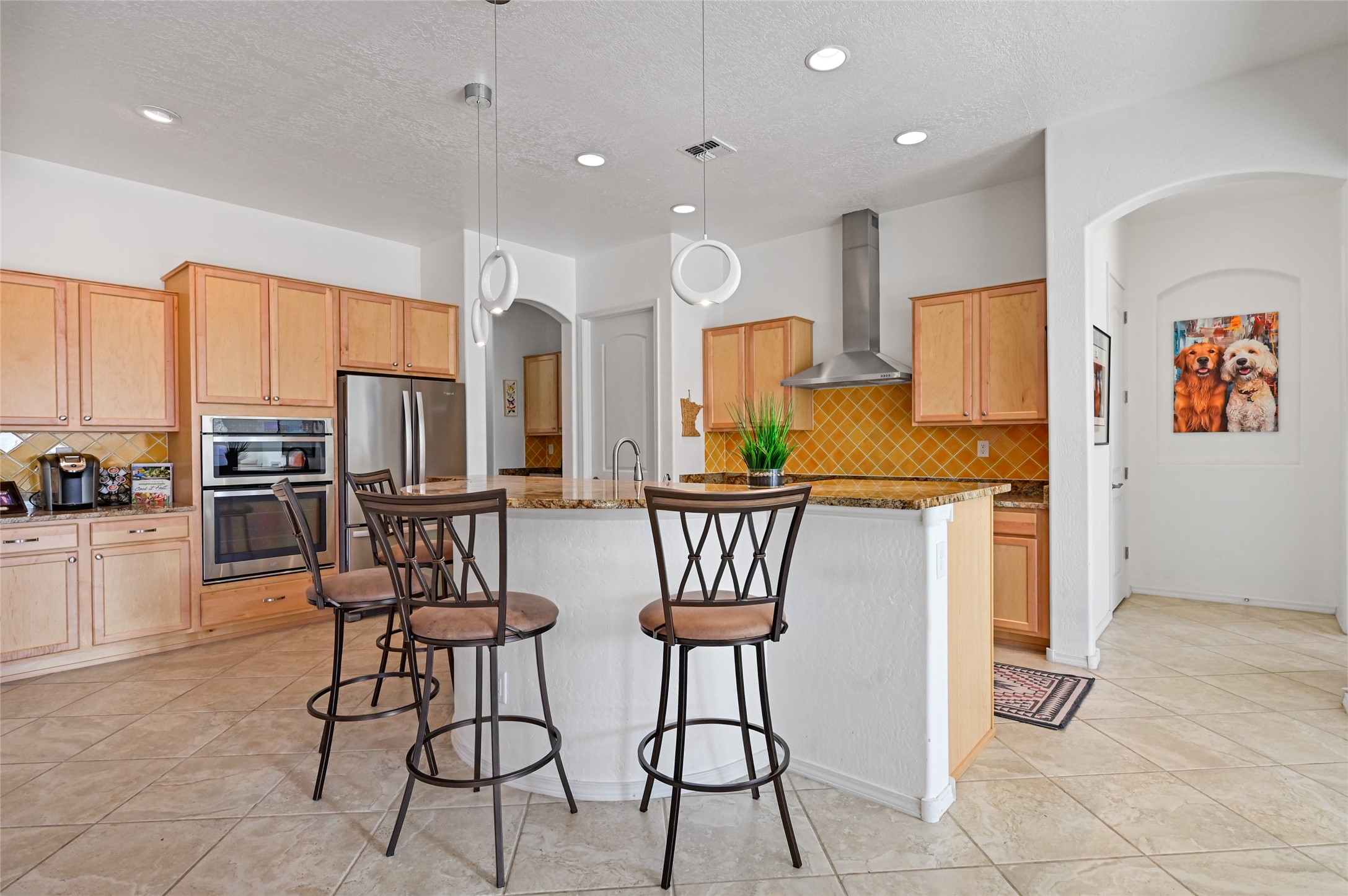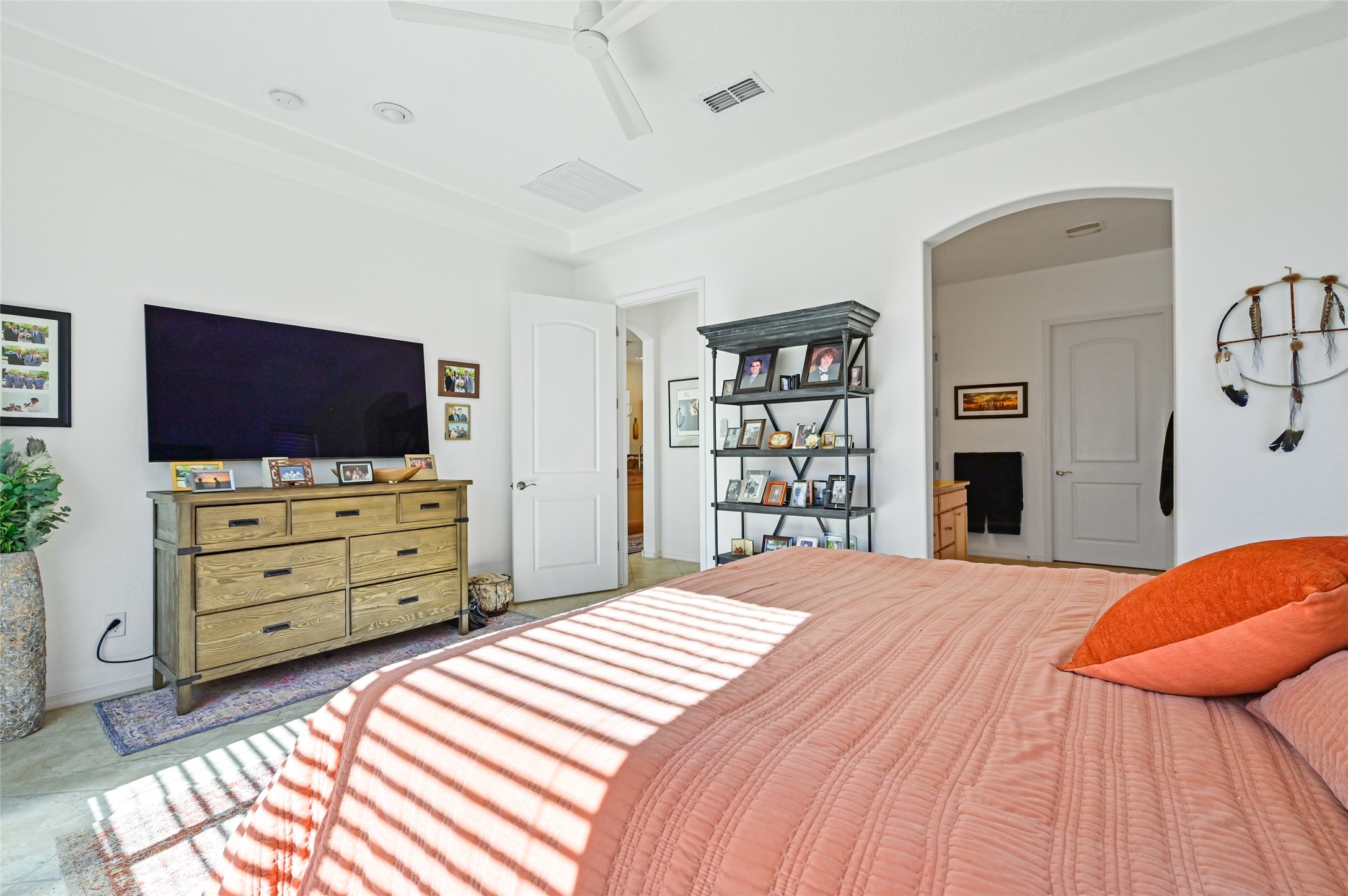 *Current contract is contingent on sale of Buyers" Home.* Step Inside Your Dream Home! Welcome to this beautifully designed, single-level retreat featuring 3 spacious bedrooms, a den/office and 2 full bathrooms. Thoughful design with the comfort of refrigerated air conditioning and the stunning scale provided by 10-ft ceilings and 8-ft doors throughout. An open-concept floor plan flows effortlessly from the living room to the kitchen and dining areas. Fall in love with the gourmet kitchen, a true chef's haven! It's equipped with a gas cooktop, two electric ovens, and a brilliantly designed 42-inch island that even features a convenient, elevated dishwasher. A consistent flow of porcelain tile flooring ties the entire home together, offering both beauty and easy upkeep. A Retreat for Everyone. You'll find the tranquil primary bedroom suite on one end of the home, while the comfortable guest wing is tucked away on the other. A serene enclosed sunroom, complete with windows and screening, features a built-in barbecue grill! An ideal place to unwind while enjoying views of the walled yard. The same luxurious granite countertops you see inside right into the outdoor kitchen area for a sophisticated, continuous look. Outdoor Oasis and Community Perks. The backyard features a custom pergola--the perfect spot to enjoy the beautiful Southwest Garden. And the community adds value with a great jogging path just steps away! This home truly brings together style, comfort, and functionality.