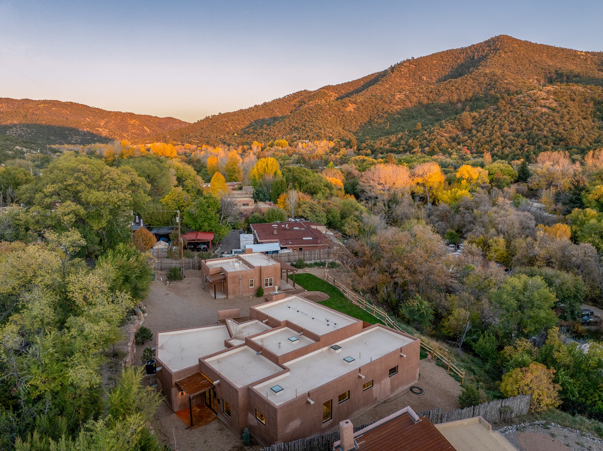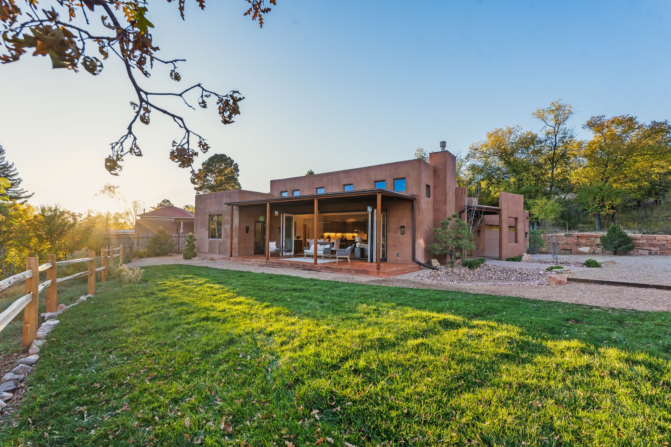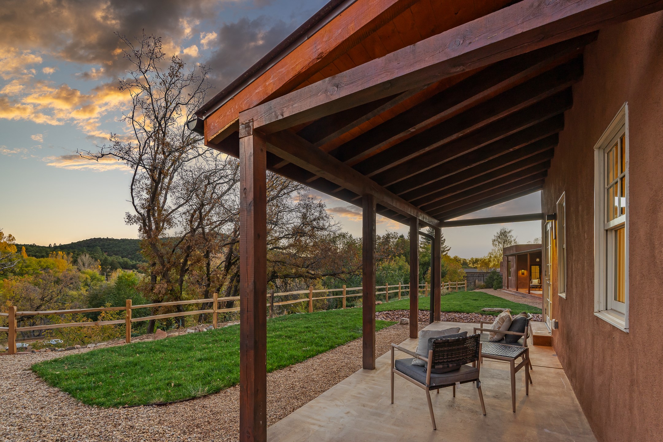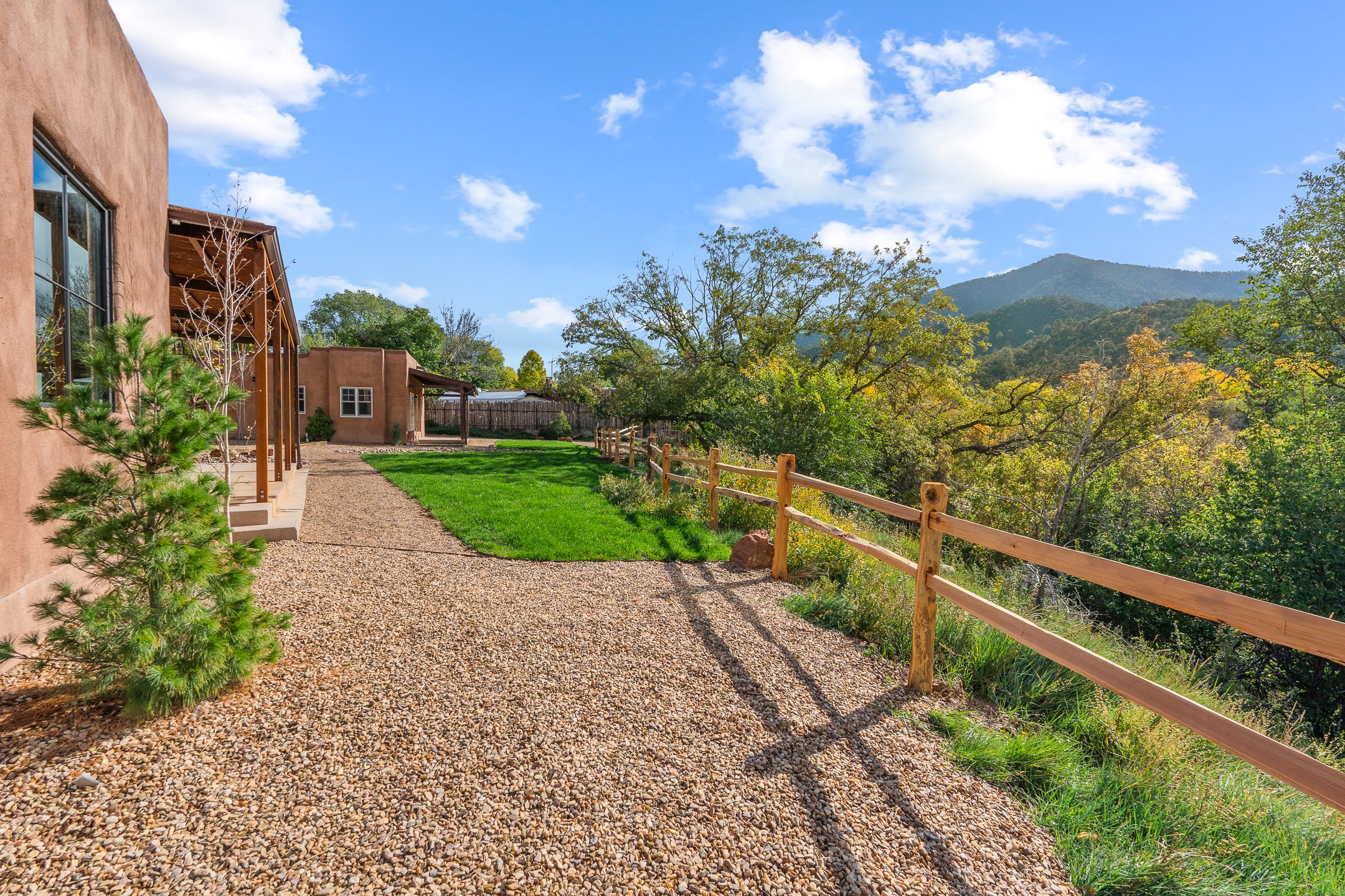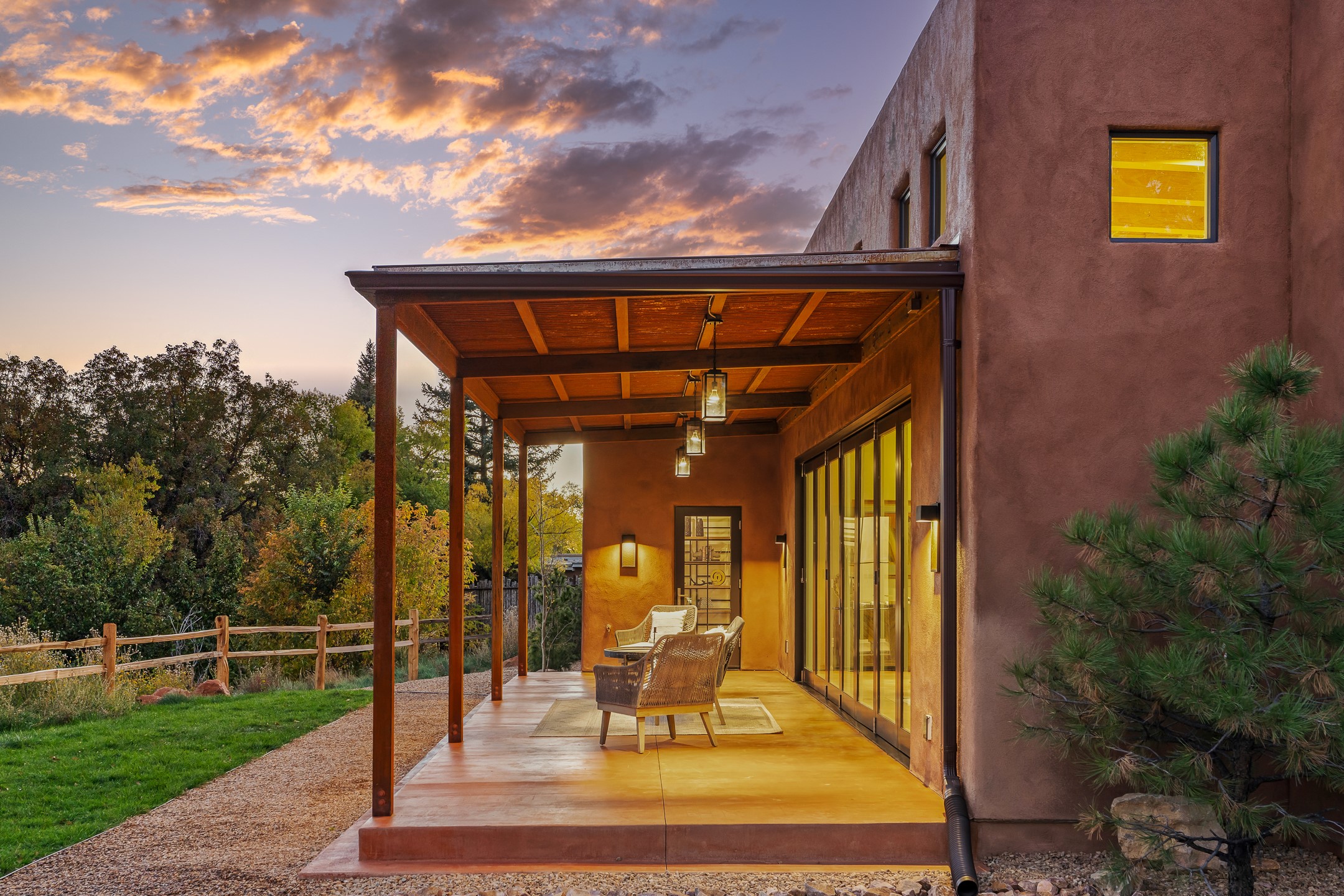 Contemporary Elegance Above the Santa Fe River Nature Preserve. Perched above the Santa Fe River Nature Preserve, with breathtaking views of Picacho Peak, this brand-new, all-single-level 2025 contemporary residence is a masterful blend of architecture, nature, and modern comfort--just minutes from Canyon Road, The Teahouse, and downtown Santa Fe.Designed for effortless living and entertaining, the main residence offers three bedrooms and two baths, an open-concept living space with soaring ceilings, wood flooring, a sleek gas fireplace with a built-in banco, and a wall of glass articulating doors that frame Picacho Peak and the surrounding foothills, inviting the outdoors in with seamless flow onto the southeast-facing, view-filled portal--perfect for entertaining or quiet moments of reflection. The open, well-designed chef's kitchen features Nocturne quartz countertops, soft-hued cabinetry, and stainless-steel appliances.Set on over half an acre, the landscaped property features lush green grass framed by a graceful grove of native oak trees and is graced by the historic Acequia, its gentle spring-fed waters flowing near the primary suite. The spa-like primary bath offers a freestanding soaking tub and a separate walk-in shower, creating a serene retreat inspired by nature.A TPO roof and two-car garage speak to both form and function, while mindful touches--fire suppression system, drip irrigation, and central air conditioning--ensure lasting peace of mind. The detached one-bedroom, one-bath casita with a full kitchen provides the ideal retreat for guests, an art studio, an office, or a rental opportunity.All a five-minute drive from Canyon Road and moments from the Dale Ball Trails, the Beaver Pond, and the Audubon, this location offers endless opportunities to connect with Santa Fe's natural beauty and culture--an inspired sanctuary for those who live beautifully.