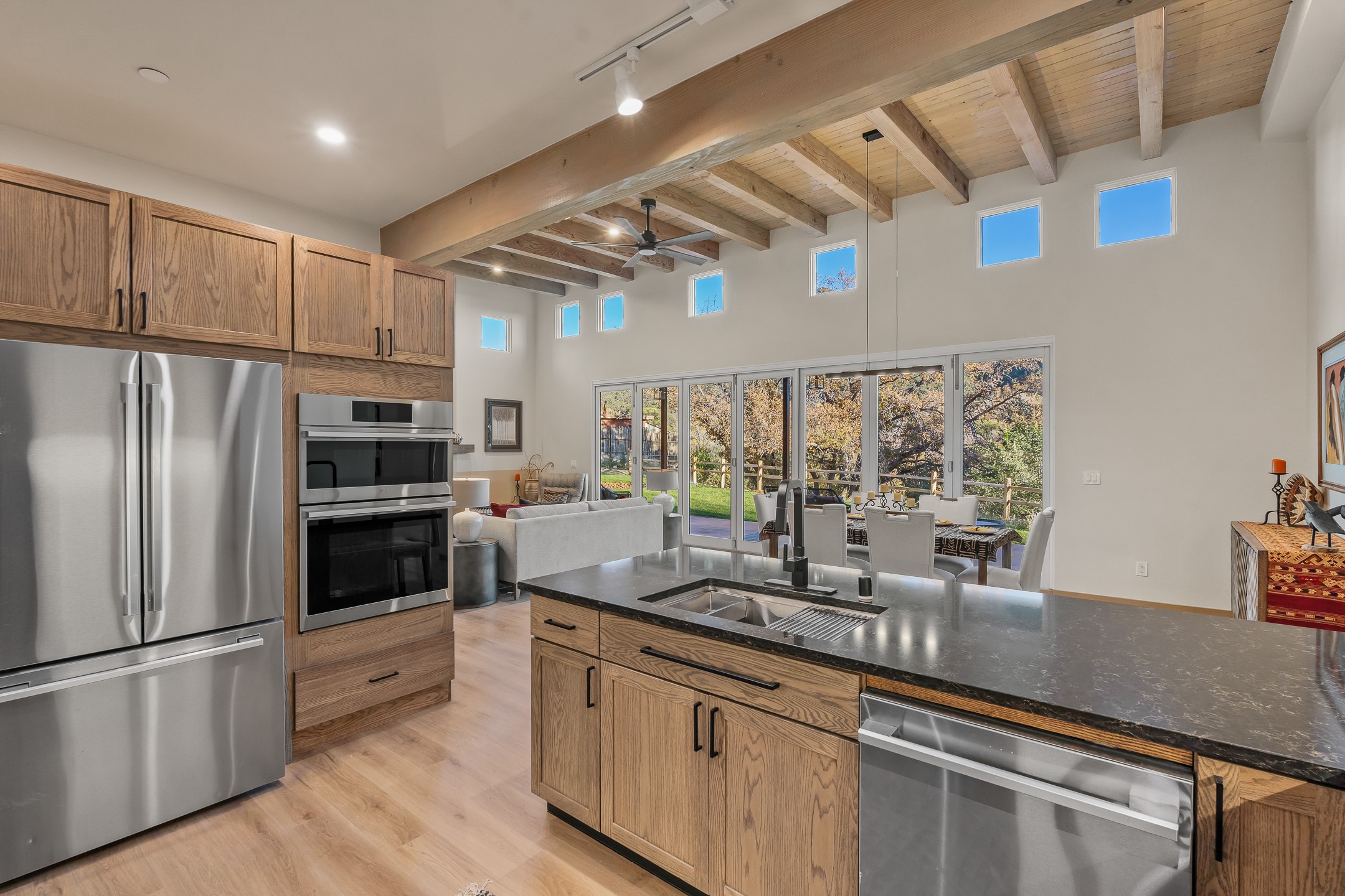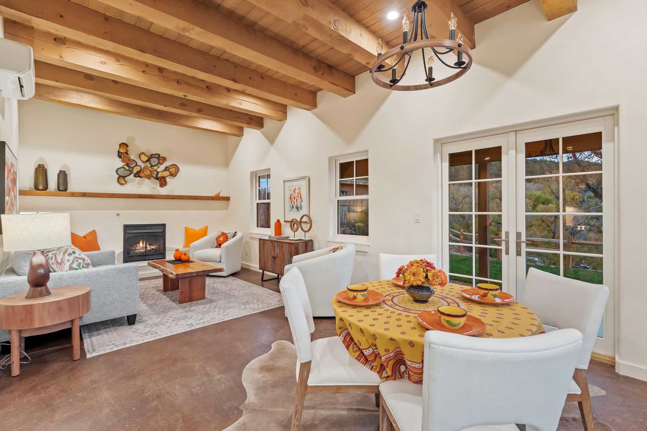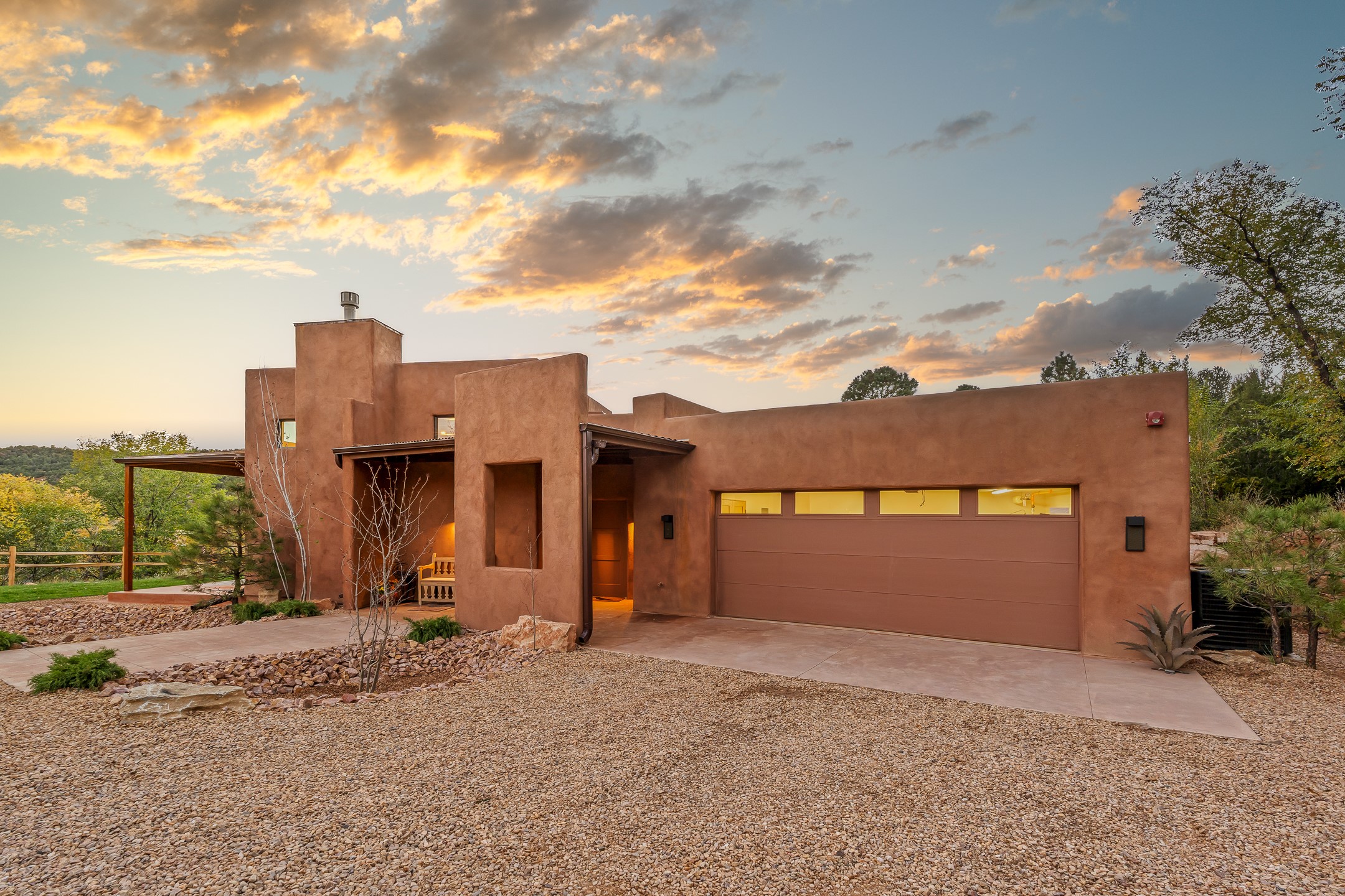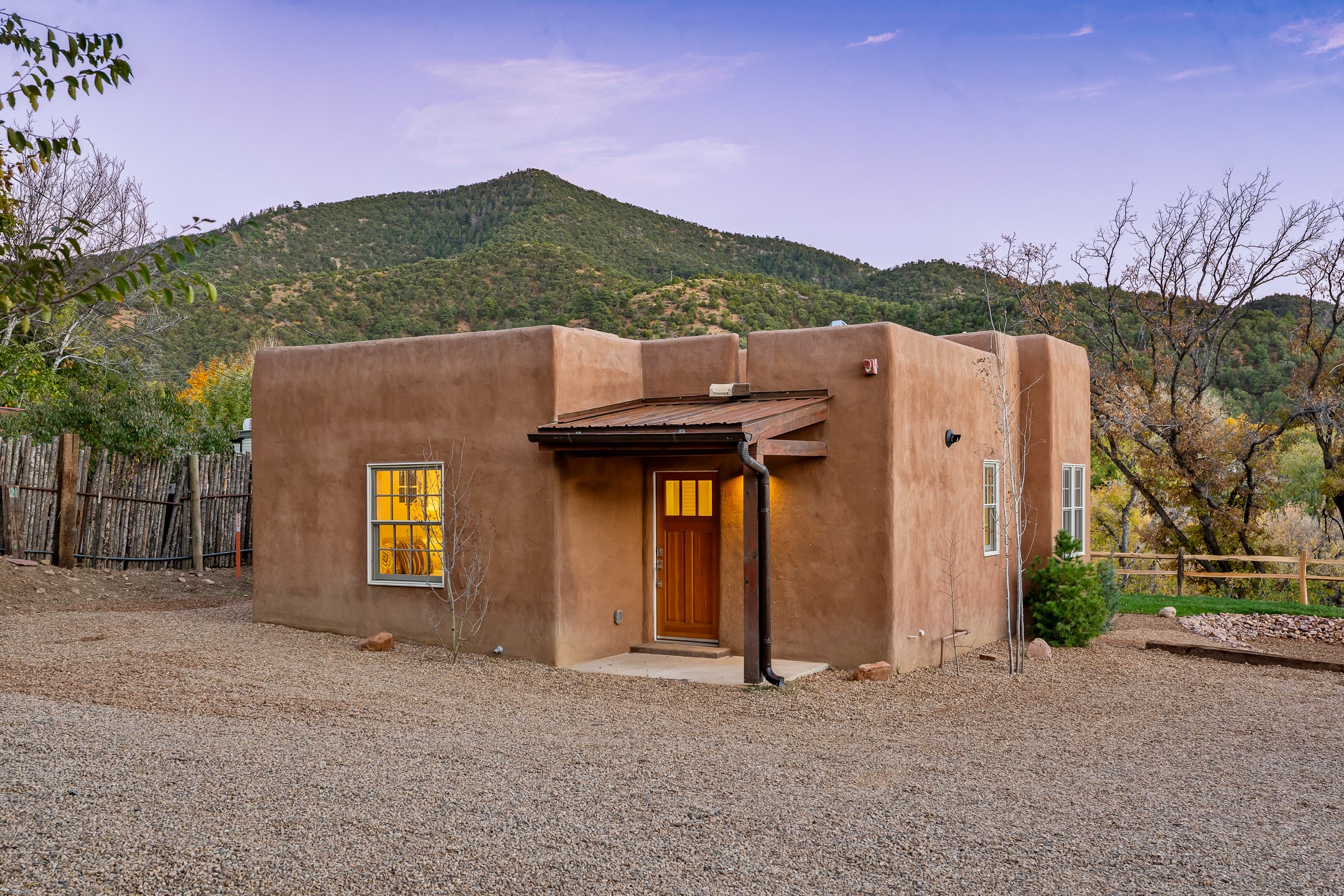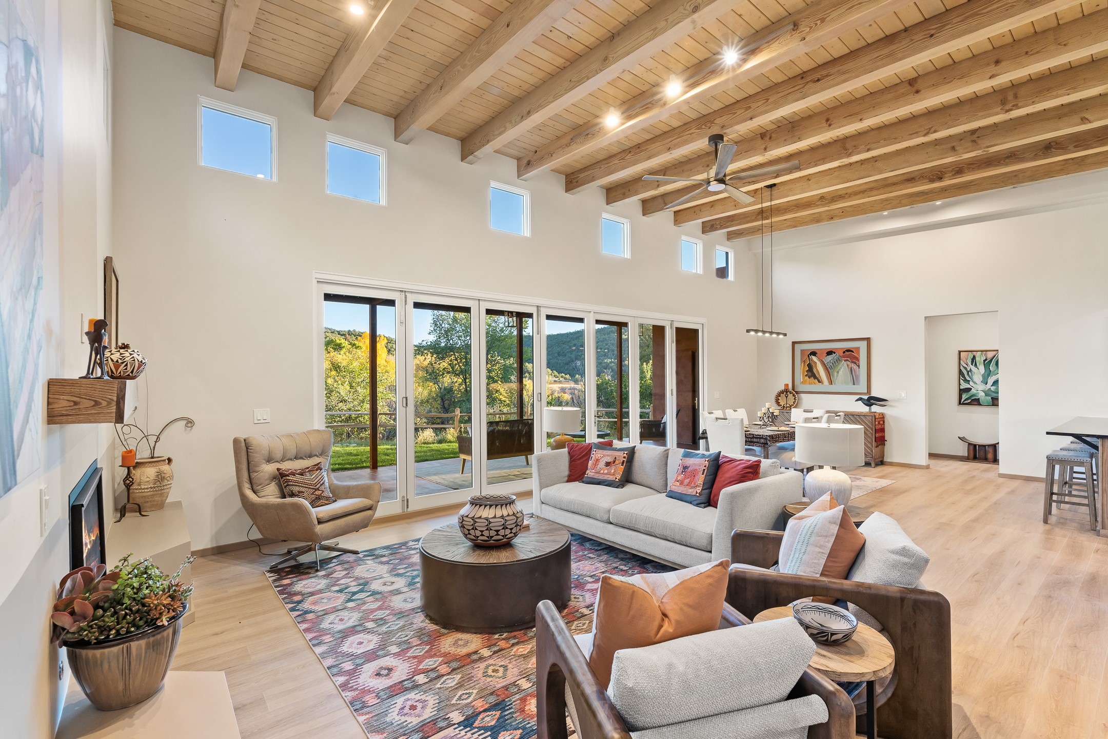 Contemporary Elegance Above the Santa Fe River Nature Preserve. Perched above the Santa Fe River Nature Preserve, with breathtaking views of Picacho Peak, this brand-new, all-single-level 2025 contemporary residence is a masterful blend of architecture, nature, and modern comfort--just minutes from Canyon Road, The Teahouse, and downtown Santa Fe.Designed for effortless living and entertaining, the main residence offers three bedrooms and two baths, an open-concept living space with soaring ceilings, wood flooring, a sleek gas fireplace with a built-in banco, and a wall of glass articulating doors that frame Picacho Peak and the surrounding foothills, inviting the outdoors in with seamless flow onto the southeast-facing, view-filled portal--perfect for entertaining or quiet moments of reflection. The open, well-designed chef's kitchen features Nocturne quartz countertops, soft-hued cabinetry, and stainless-steel appliances.Set on over half an acre, the landscaped property features lush green grass framed by a graceful grove of native oak trees and is graced by the historic Acequia, its gentle spring-fed waters flowing near the primary suite. The spa-like primary bath offers a freestanding soaking tub and a separate walk-in shower, creating a serene retreat inspired by nature.A TPO roof and two-car garage speak to both form and function, while mindful touches--fire suppression system, drip irrigation, and central air conditioning--ensure lasting peace of mind. The detached one-bedroom, one-bath casita with a full kitchen provides the ideal retreat for guests, an art studio, an office, or a rental opportunity.All a five-minute drive from Canyon Road and moments from the Dale Ball Trails, the Beaver Pond, and the Audubon, this location offers endless opportunities to connect with Santa Fe's natural beauty and culture--an inspired sanctuary for those who live beautifully.