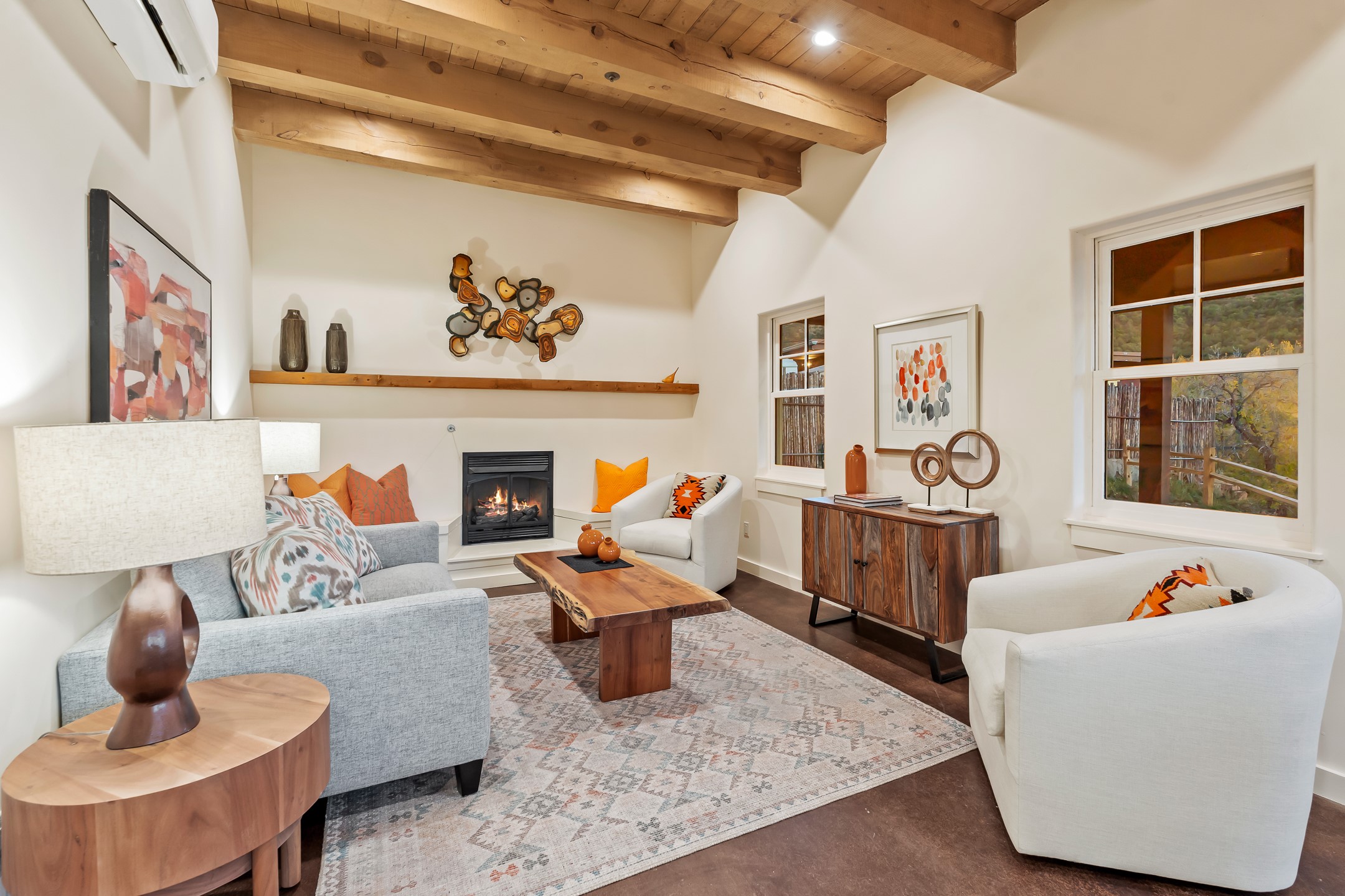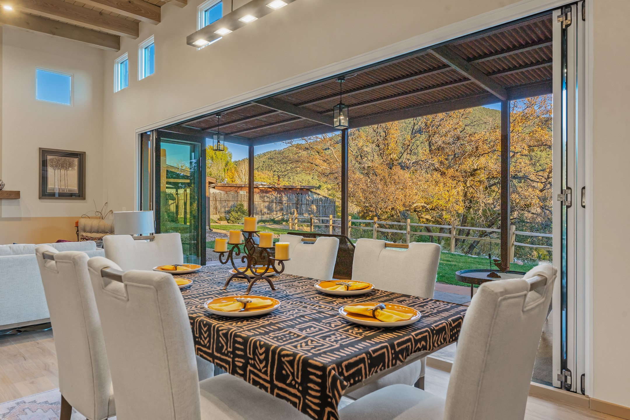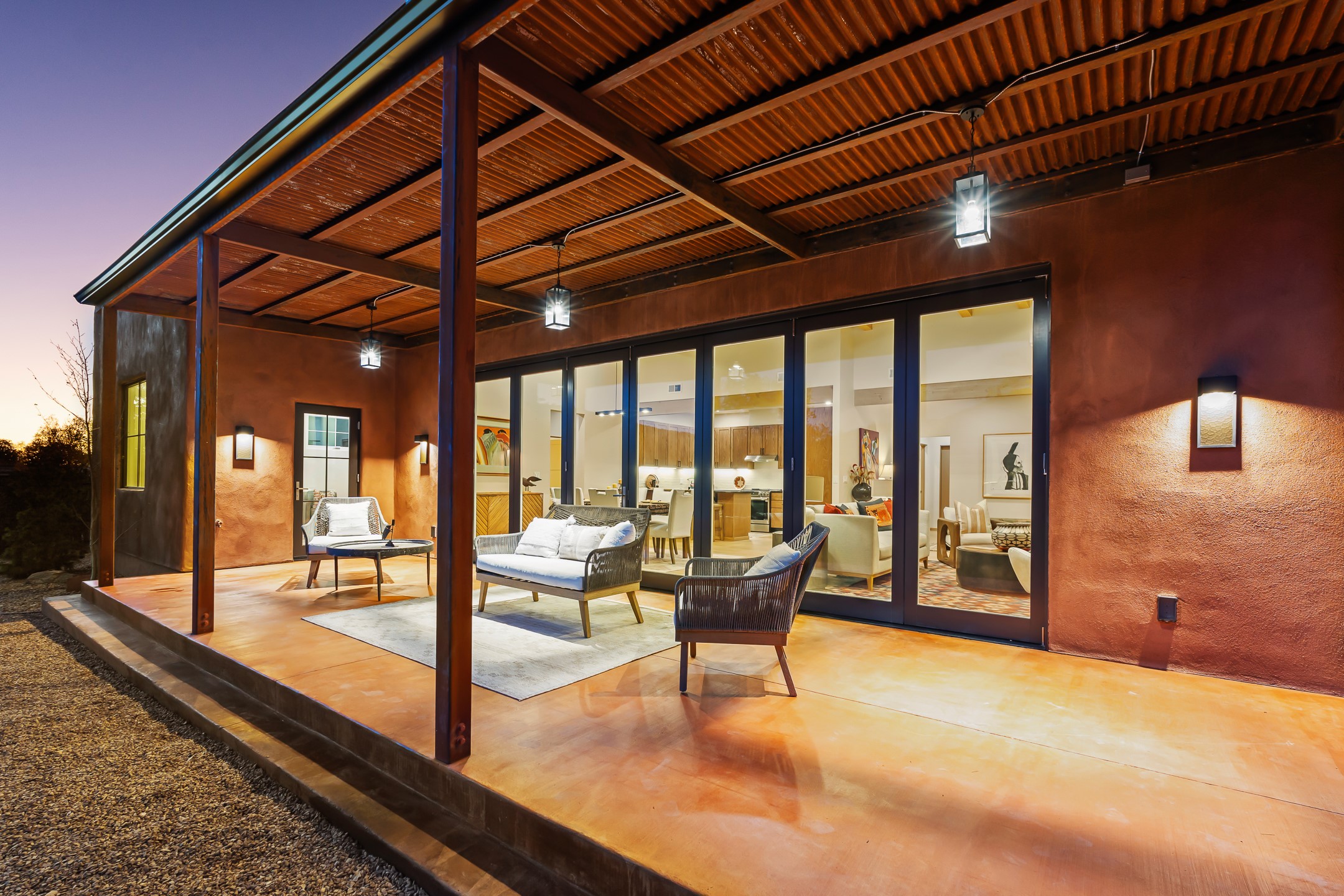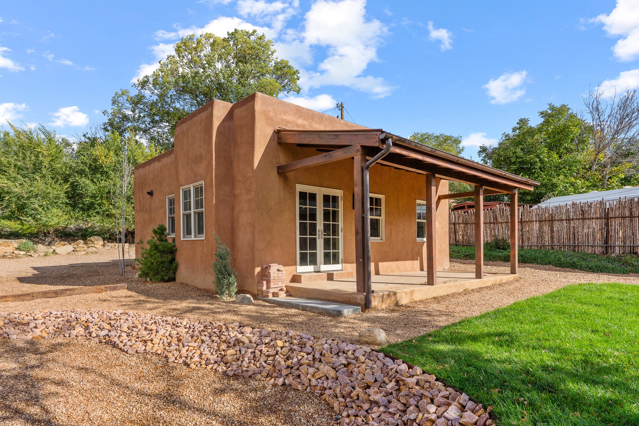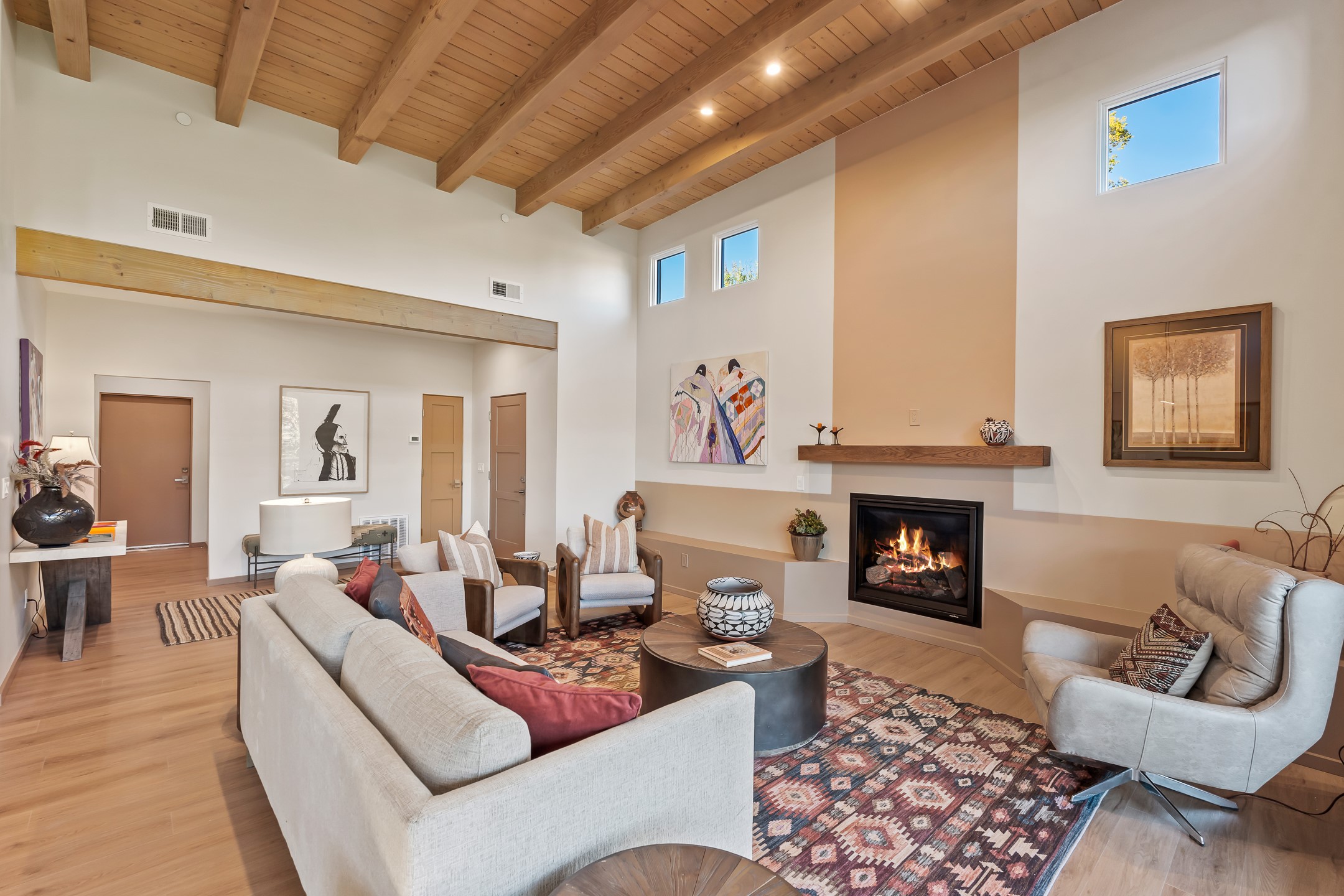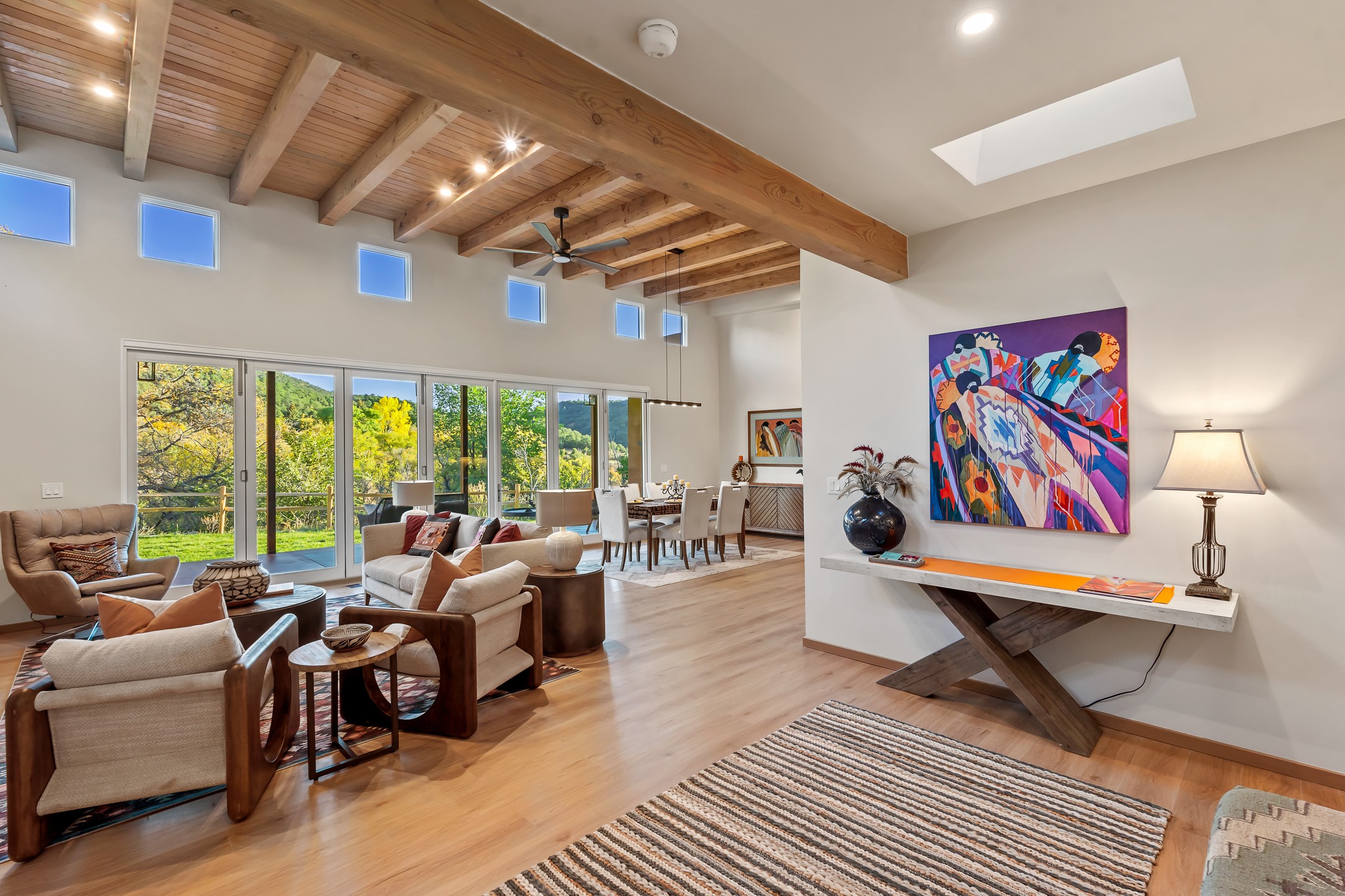Contemporary Elegance Above the Santa Fe River Nature Preserve. Perched above the Santa Fe River Nature Preserve, with breathtaking views of Picacho Peak, this brand-new, all-single-level 2025 contemporary residence is a masterful blend of architecture, nature, and modern comfort--just minutes from Canyon Road, The Teahouse, and downtown Santa Fe.Designed for effortless living and entertaining, the main residence offers three bedrooms and two baths, an open-concept living space with soaring ceilings, wood flooring, a sleek gas fireplace with a built-in banco, and a wall of glass articulating doors that frame Picacho Peak and the surrounding foothills, inviting the outdoors in with seamless flow onto the southeast-facing, view-filled portal--perfect for entertaining or quiet moments of reflection. The open, well-designed chef's kitchen features Nocturne quartz countertops, soft-hued cabinetry, and stainless-steel appliances.Set on over half an acre, the landscaped property features lush green grass framed by a graceful grove of native oak trees and is graced by the historic Acequia, its gentle spring-fed waters flowing near the primary suite. The spa-like primary bath offers a freestanding soaking tub and a separate walk-in shower, creating a serene retreat inspired by nature.A TPO roof and two-car garage speak to both form and function, while mindful touches--fire suppression system, drip irrigation, and central air conditioning--ensure lasting peace of mind. The detached one-bedroom, one-bath casita with a full kitchen provides the ideal retreat for guests, an art studio, an office, or a rental opportunity.All a five-minute drive from Canyon Road and moments from the Dale Ball Trails, the Beaver Pond, and the Audubon, this location offers endless opportunities to connect with Santa Fe's natural beauty and culture--an inspired sanctuary for those who live beautifully.