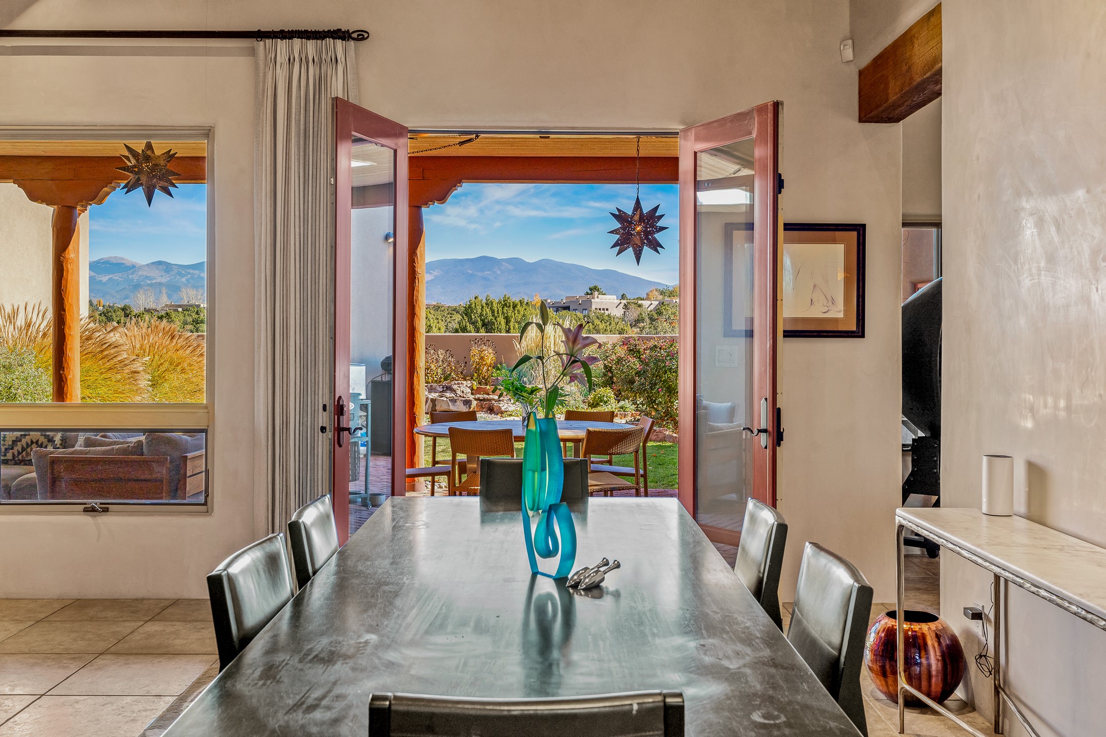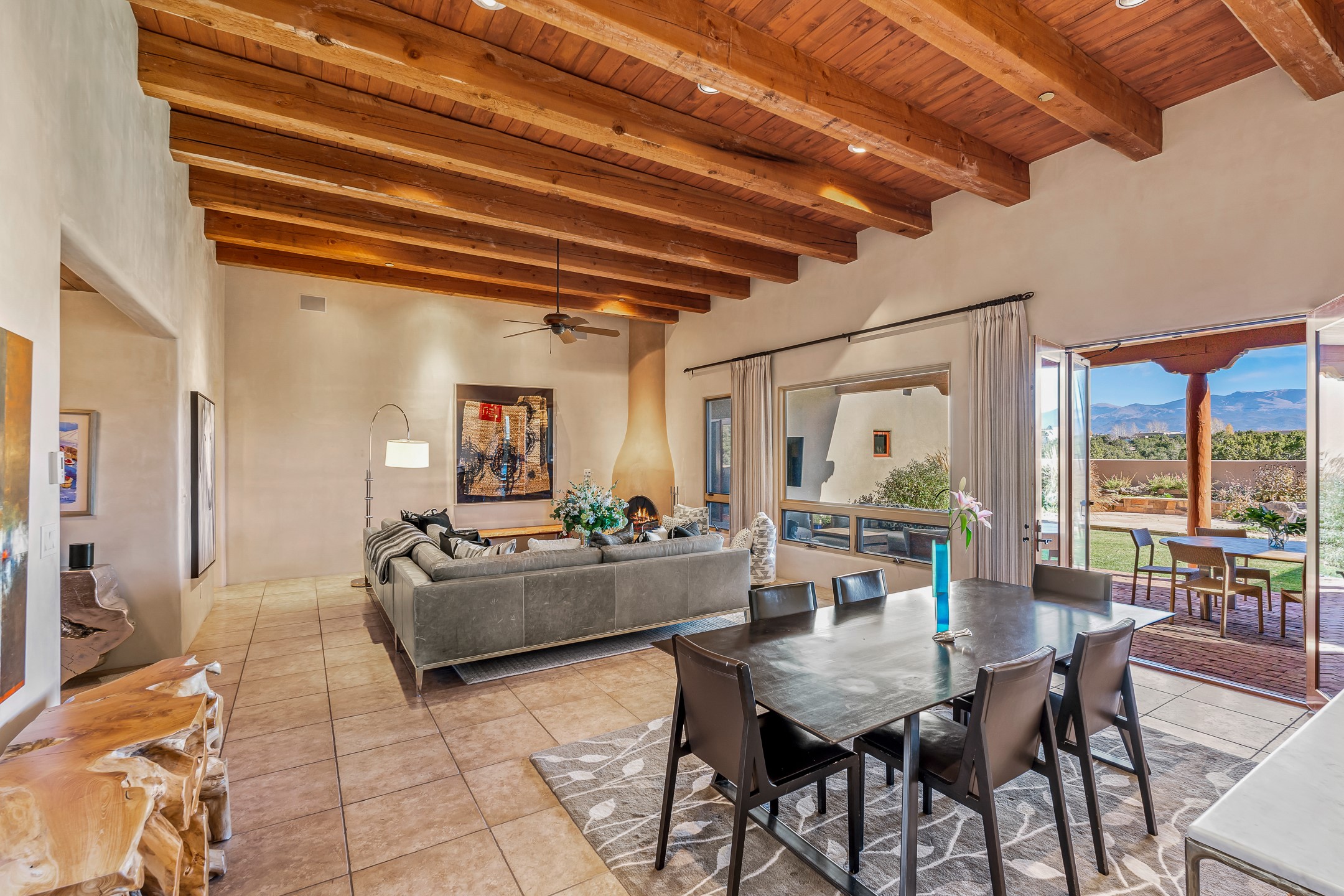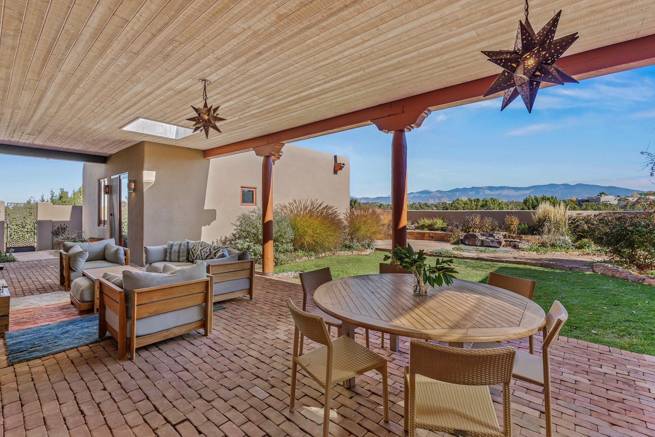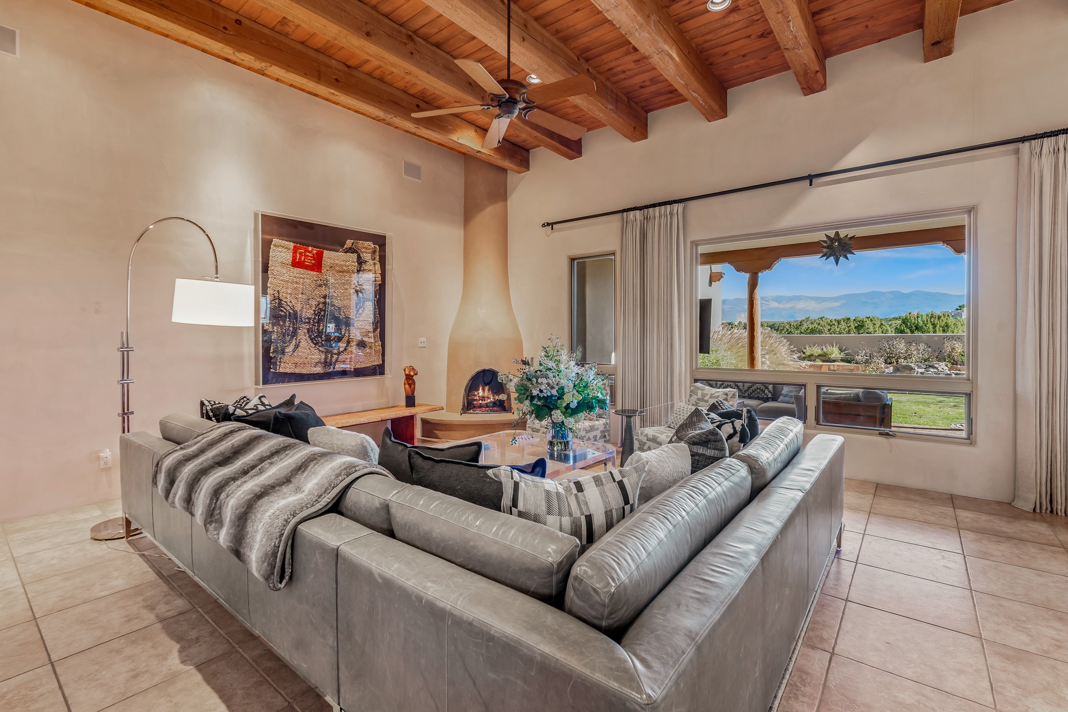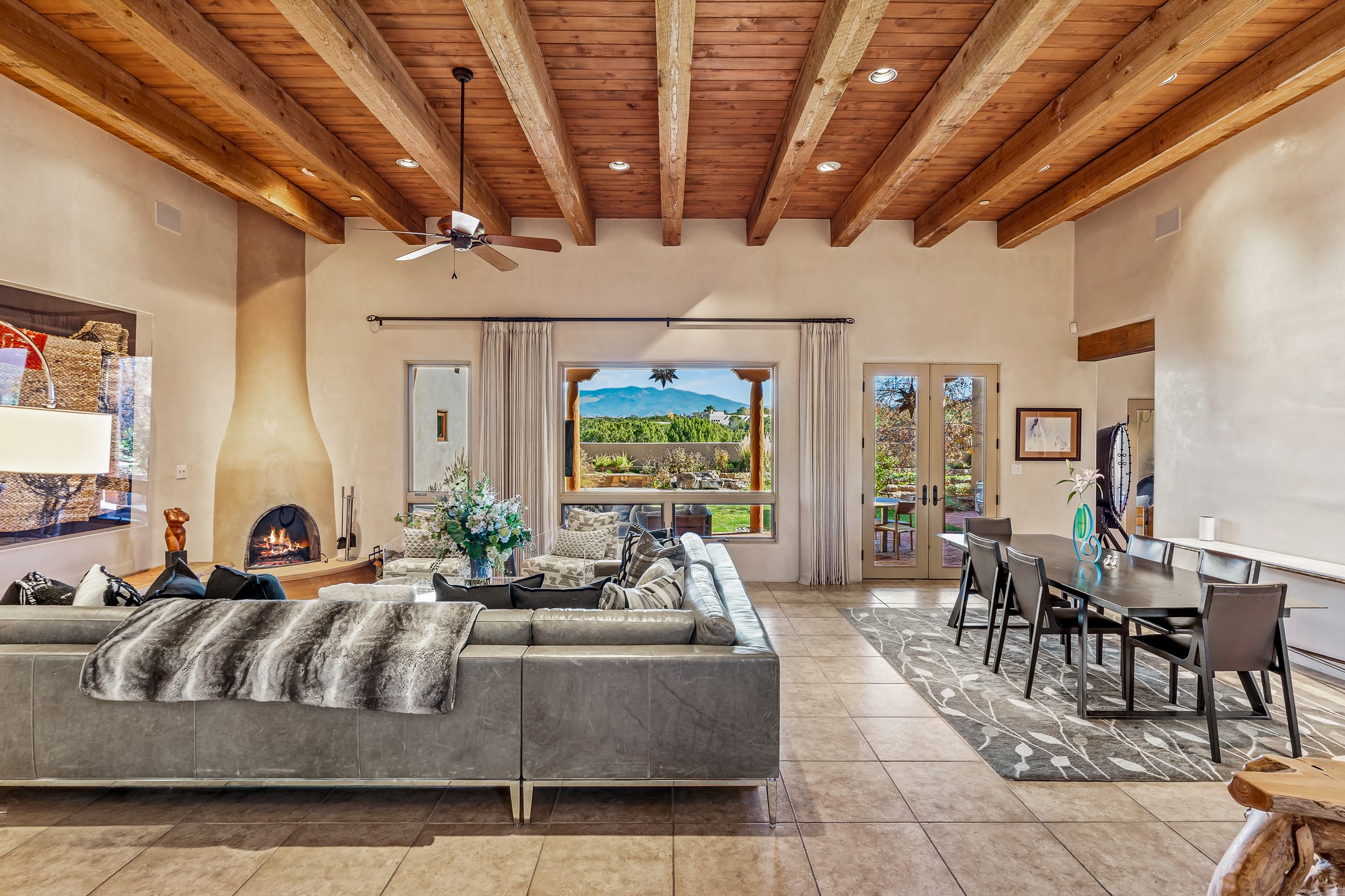 Experience true Santa Fe living in this elegant residence with a detached guesthouse, perfectly positioned in the coveted Sundance Estates to capture sweeping views of the Sangre de Cristo Mountains. Designed for seamless indoor-outdoor living, this home offers expansive portals, an inviting outdoor kiva fireplace, and exquisite landscaping that frame the essence of the Santa Fe lifestyle. Step inside to the beautifully designed open-concept formal living and dining room featuring smooth plaster walls, tall beamed ceilings, a kiva fireplace, expansive windows and double French doors that flood the interiors with natural light and boast the sweeping mountain views. The kitchen is a cook's delight--featuring high-end appliances including a Wolf cooktop and oven, a walk-in pantry, a large cherrywood island, and thoughtful finishes that blend style and function. The primary suite is both luxurious and serene, complete with a gas fireplace, spa-like bath with dual marble vanities, a soaking tub, a walk-in shower, and a grand walk-in closet. Step outside to your private patio and unwind in the hot tub beneath the stars. A pre-wired media room/theater offers the perfect setting for entertainment, while guests enjoy privacy in their own wing with an en-suite bedroom nearby and two convenient powder rooms for visitors. The detached casita provides a private retreat with its own entrance, kiva fireplace, bedroom, kitchenette, and access to the main home through the landscaped backyard. The grounds are as impressive as the interiors, with mature trees, lush lawn, a tranquil water feature, and walkways that connect every outdoor living space--from the primary suite's patio to the guesthouse. A circular driveway completes the property's sense of arrival and sophistication, along with solar and a heated three-car garage, where the third bay currently functions as a gym. 58 Sundance Drive is a home where elegance, comfort, and the natural beauty of Santa Fe come together in harmony.