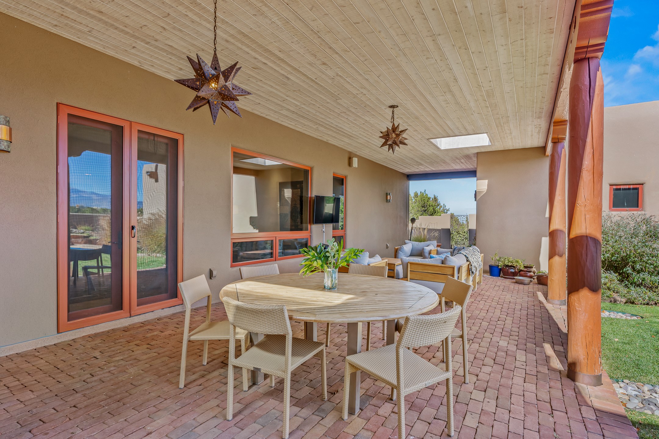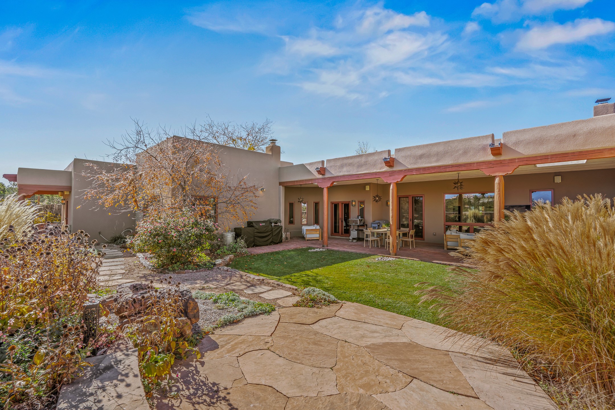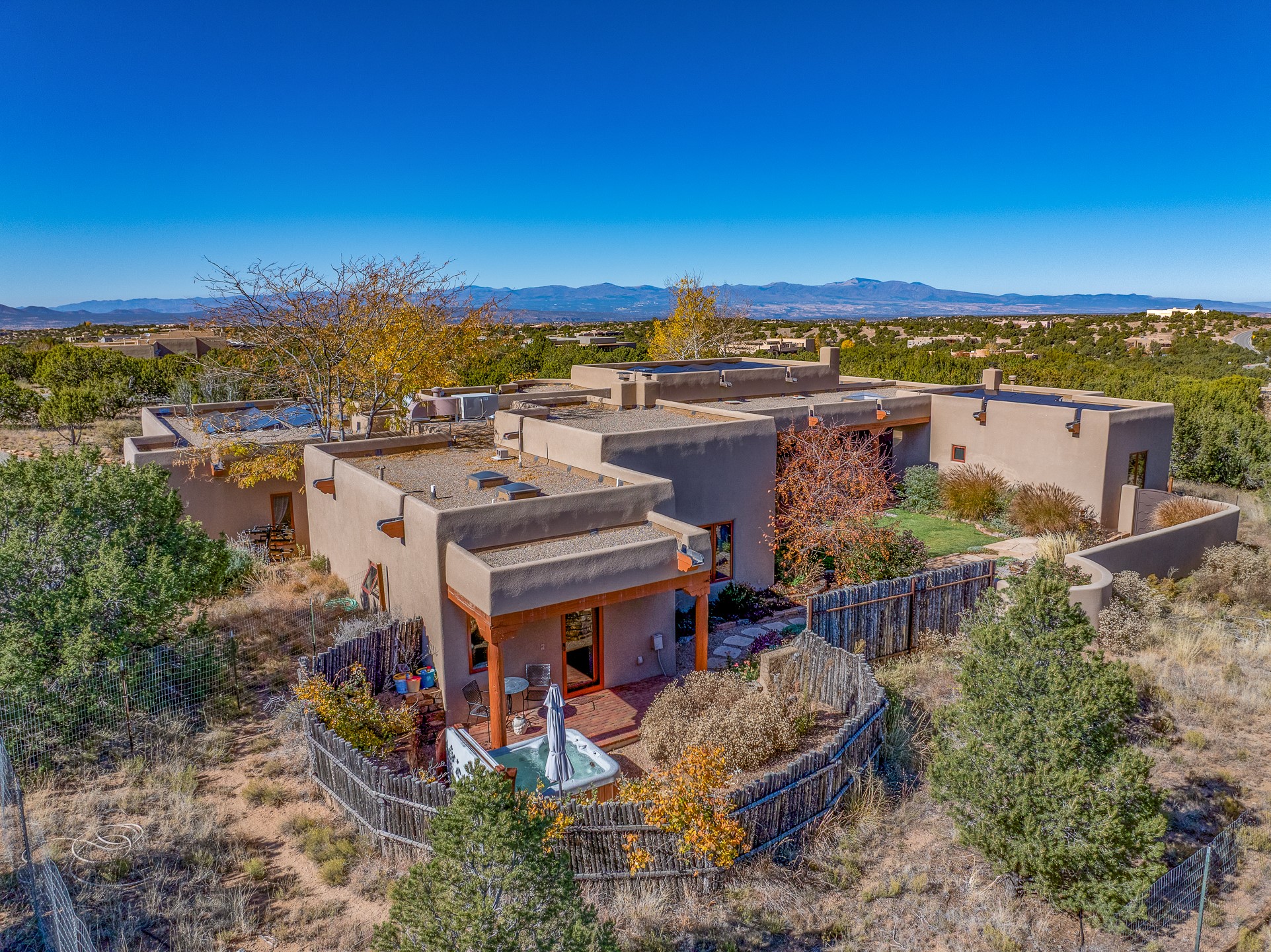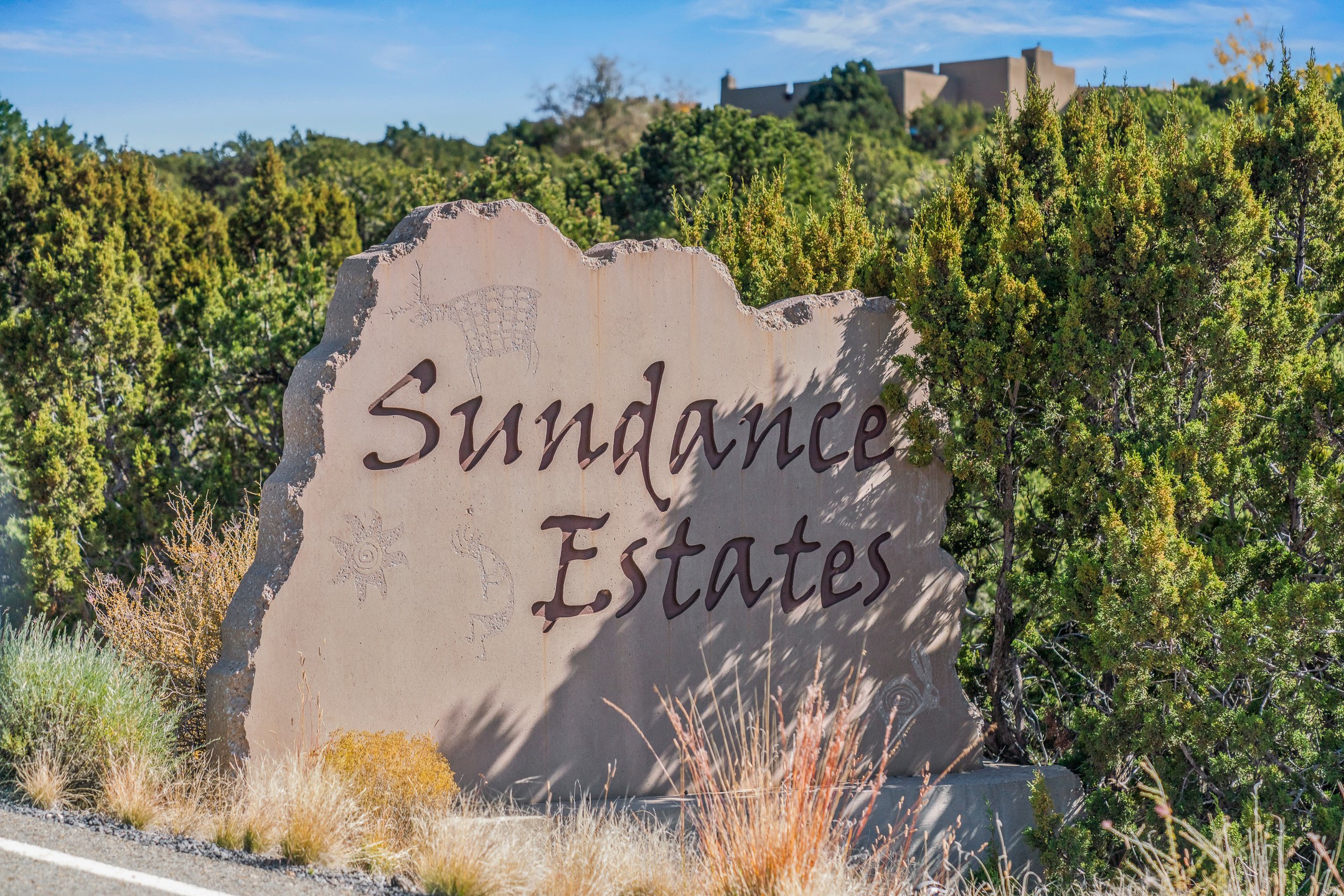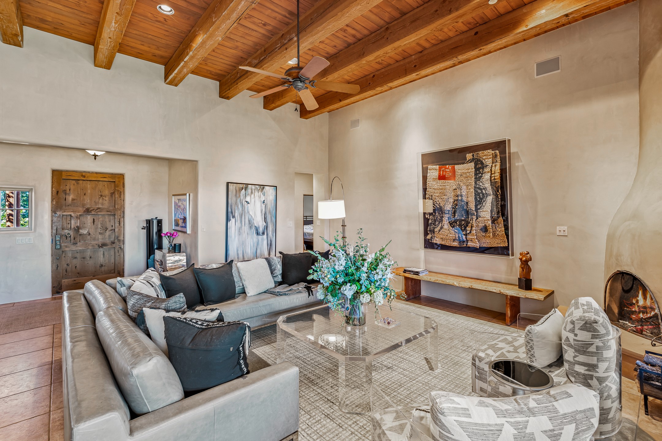 Experience true Santa Fe living in this elegant residence with a detached guesthouse, perfectly positioned in the coveted Sundance Estates to capture sweeping views of the Sangre de Cristo Mountains. Designed for seamless indoor-outdoor living, this home offers expansive portals, an inviting outdoor kiva fireplace, and exquisite landscaping that frame the essence of the Santa Fe lifestyle. Step inside to the beautifully designed open-concept formal living and dining room featuring smooth plaster walls, tall beamed ceilings, a kiva fireplace, expansive windows and double French doors that flood the interiors with natural light and boast the sweeping mountain views. The kitchen is a cook's delight--featuring high-end appliances including a Wolf cooktop and oven, a walk-in pantry, a large cherrywood island, and thoughtful finishes that blend style and function. The primary suite is both luxurious and serene, complete with a gas fireplace, spa-like bath with dual marble vanities, a soaking tub, a walk-in shower, and a grand walk-in closet. Step outside to your private patio and unwind in the hot tub beneath the stars. A pre-wired media room/theater offers the perfect setting for entertainment, while guests enjoy privacy in their own wing with an en-suite bedroom nearby and two convenient powder rooms for visitors. The detached casita provides a private retreat with its own entrance, kiva fireplace, bedroom, kitchenette, and access to the main home through the landscaped backyard. The grounds are as impressive as the interiors, with mature trees, lush lawn, a tranquil water feature, and walkways that connect every outdoor living space--from the primary suite's patio to the guesthouse. A circular driveway completes the property's sense of arrival and sophistication, along with solar and a heated three-car garage, where the third bay currently functions as a gym. 58 Sundance Drive is a home where elegance, comfort, and the natural beauty of Santa Fe come together in harmony.