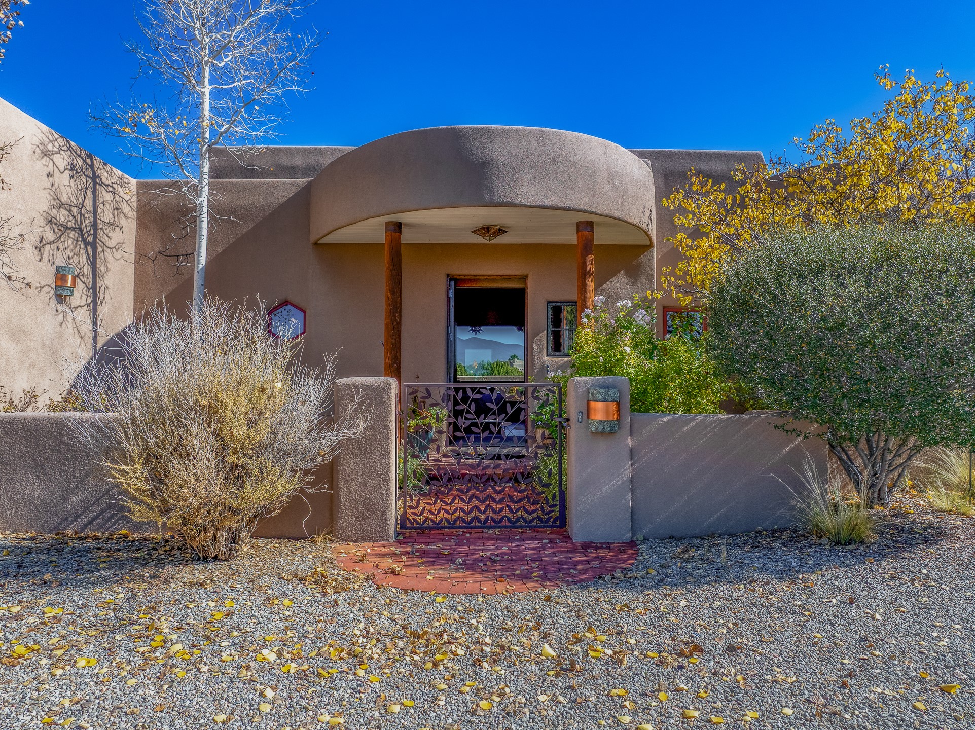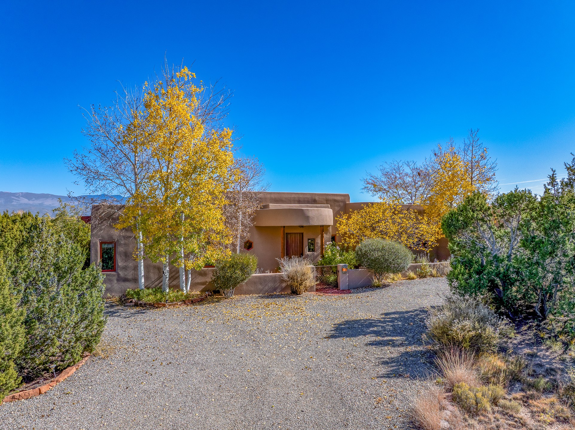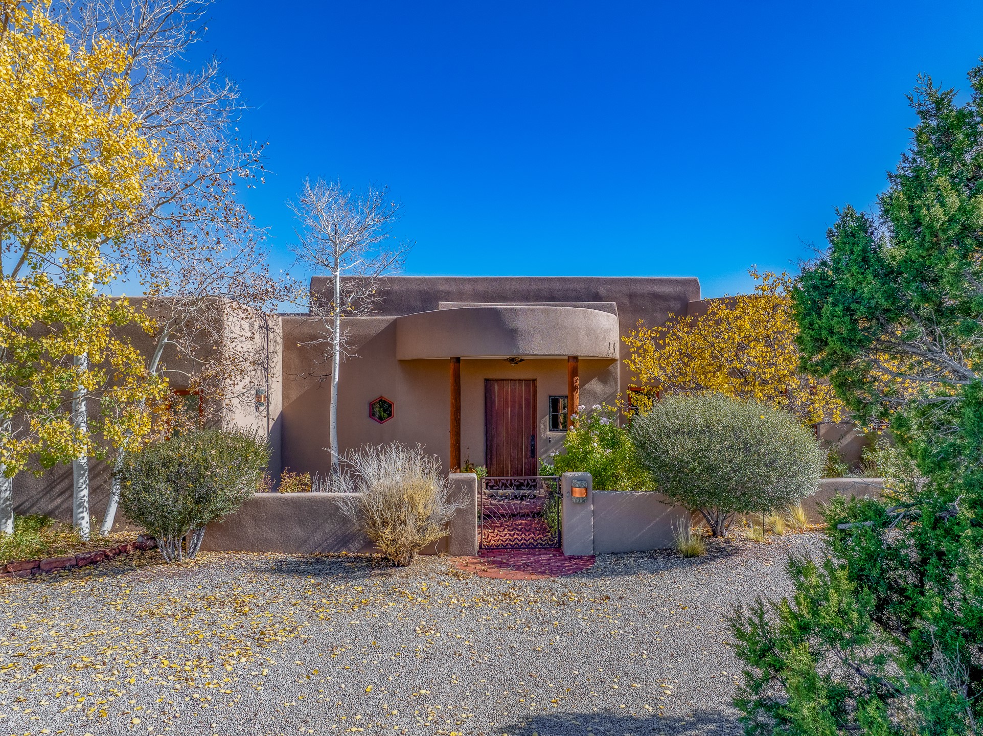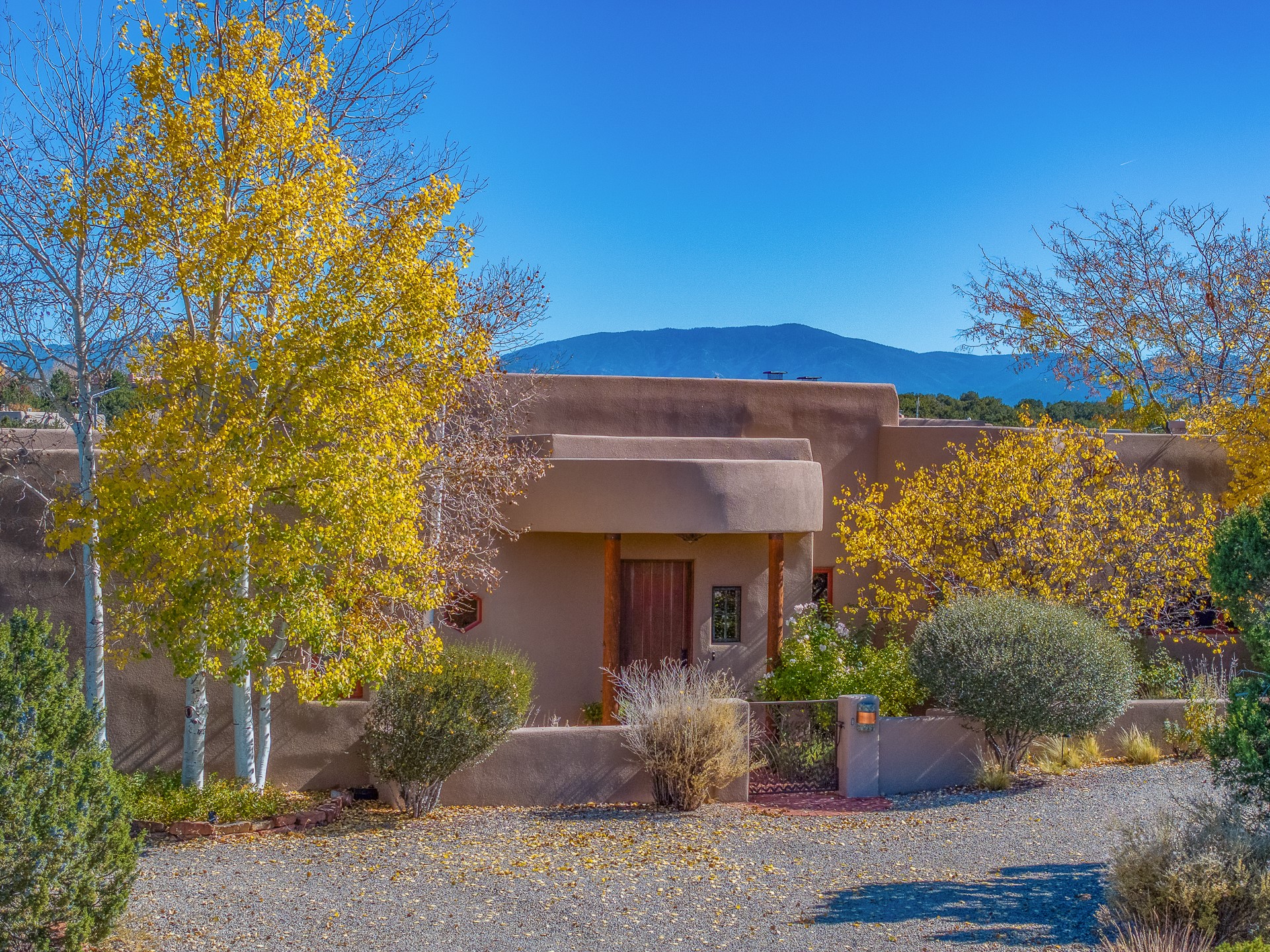 Experience true Santa Fe living in this elegant residence with a detached guesthouse, perfectly positioned in the coveted Sundance Estates to capture sweeping views of the Sangre de Cristo Mountains. Designed for seamless indoor-outdoor living, this home offers expansive portals, an inviting outdoor kiva fireplace, and exquisite landscaping that frame the essence of the Santa Fe lifestyle. Step inside to the beautifully designed open-concept formal living and dining room featuring smooth plaster walls, tall beamed ceilings, a kiva fireplace, expansive windows and double French doors that flood the interiors with natural light and boast the sweeping mountain views. The kitchen is a cook's delight--featuring high-end appliances including a Wolf cooktop and oven, a walk-in pantry, a large cherrywood island, and thoughtful finishes that blend style and function. The primary suite is both luxurious and serene, complete with a gas fireplace, spa-like bath with dual marble vanities, a soaking tub, a walk-in shower, and a grand walk-in closet. Step outside to your private patio and unwind in the hot tub beneath the stars. A pre-wired media room/theater offers the perfect setting for entertainment, while guests enjoy privacy in their own wing with an en-suite bedroom nearby and two convenient powder rooms for visitors. The detached casita provides a private retreat with its own entrance, kiva fireplace, bedroom, kitchenette, and access to the main home through the landscaped backyard. The grounds are as impressive as the interiors, with mature trees, lush lawn, a tranquil water feature, and walkways that connect every outdoor living space--from the primary suite's patio to the guesthouse. A circular driveway completes the property's sense of arrival and sophistication, along with solar and a heated three-car garage, where the third bay currently functions as a gym. 58 Sundance Drive is a home where elegance, comfort, and the natural beauty of Santa Fe come together in harmony.