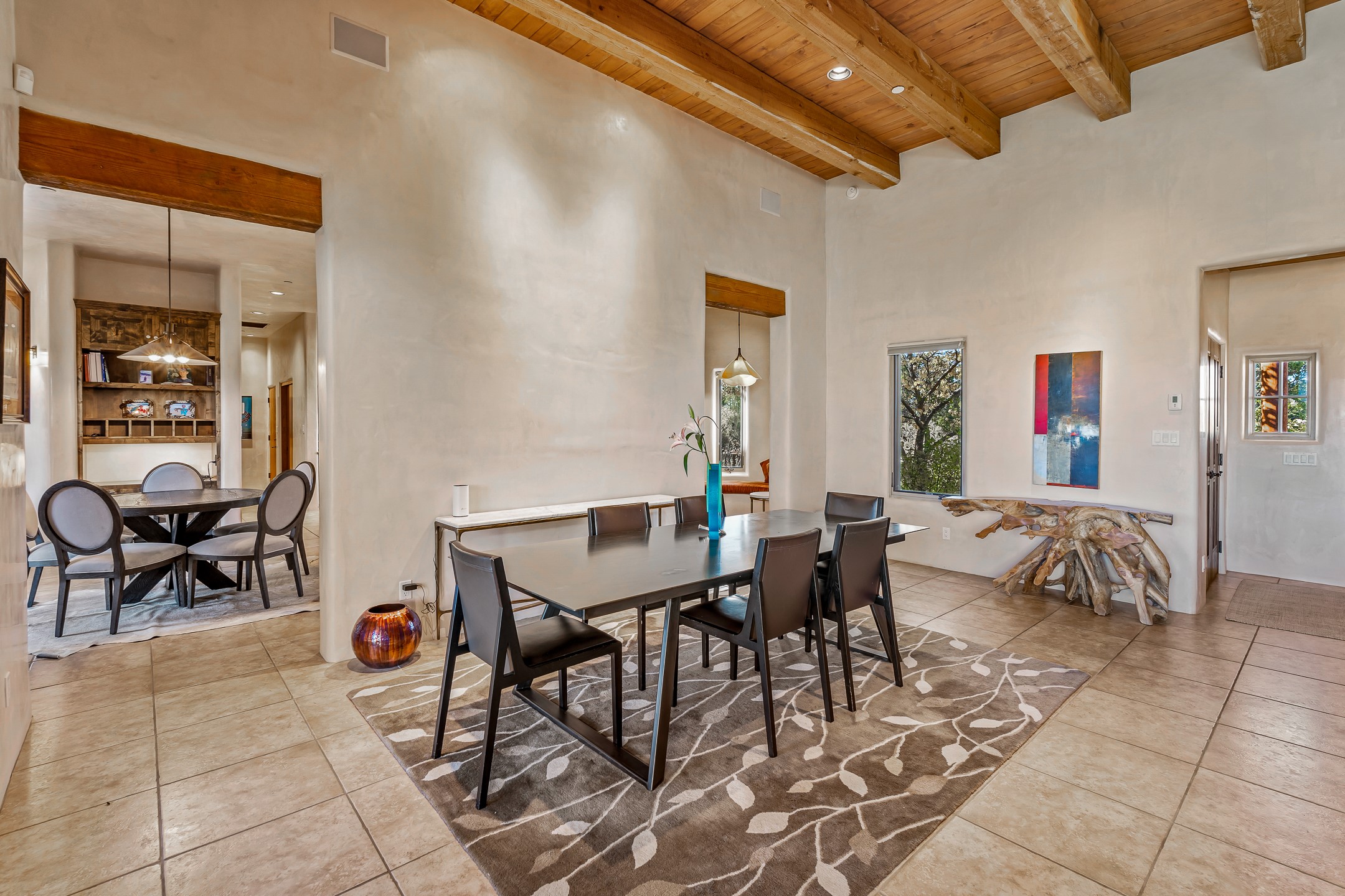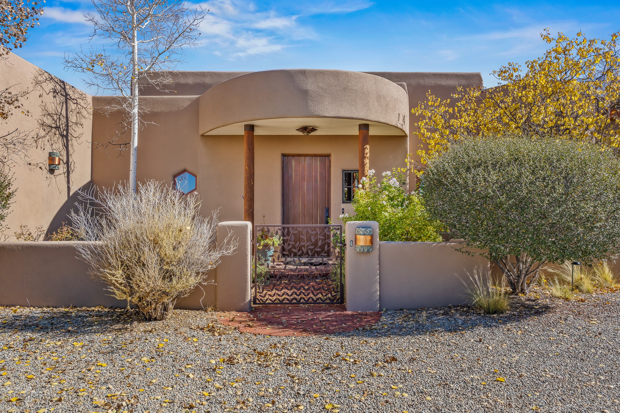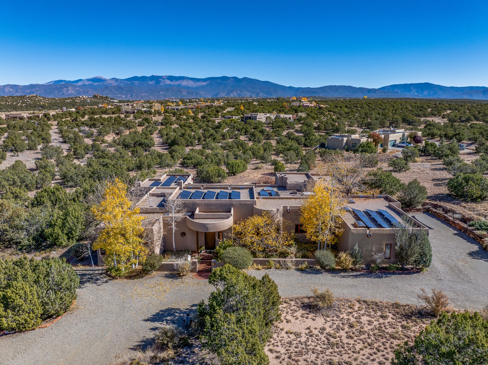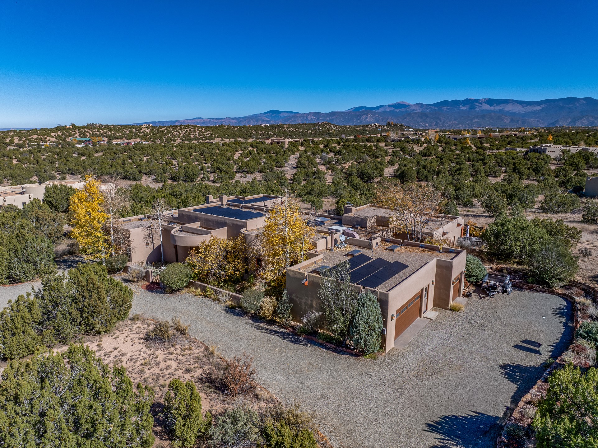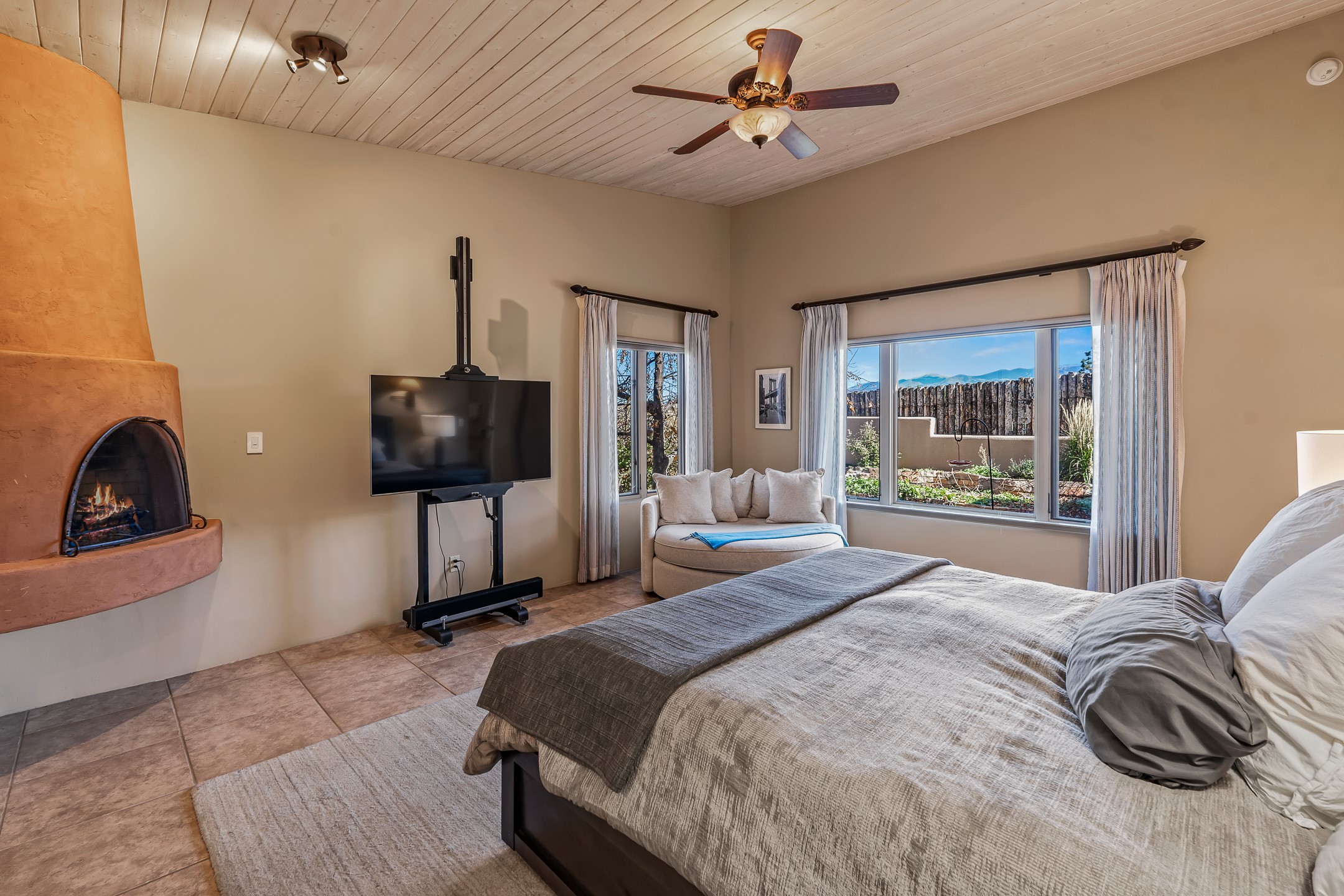 Experience true Santa Fe living in this elegant residence with a detached guesthouse, perfectly positioned in the coveted Sundance Estates to capture sweeping views of the Sangre de Cristo Mountains. Designed for seamless indoor-outdoor living, this home offers expansive portals, an inviting outdoor kiva fireplace, and exquisite landscaping that frame the essence of the Santa Fe lifestyle. Step inside to the beautifully designed open-concept formal living and dining room featuring smooth plaster walls, tall beamed ceilings, a kiva fireplace, expansive windows and double French doors that flood the interiors with natural light and boast the sweeping mountain views. The kitchen is a cook's delight--featuring high-end appliances including a Wolf cooktop and oven, a walk-in pantry, a large cherrywood island, and thoughtful finishes that blend style and function. The primary suite is both luxurious and serene, complete with a gas fireplace, spa-like bath with dual marble vanities, a soaking tub, a walk-in shower, and a grand walk-in closet. Step outside to your private patio and unwind in the hot tub beneath the stars. A pre-wired media room/theater offers the perfect setting for entertainment, while guests enjoy privacy in their own wing with an en-suite bedroom nearby and two convenient powder rooms for visitors. The detached casita provides a private retreat with its own entrance, kiva fireplace, bedroom, kitchenette, and access to the main home through the landscaped backyard. The grounds are as impressive as the interiors, with mature trees, lush lawn, a tranquil water feature, and walkways that connect every outdoor living space--from the primary suite's patio to the guesthouse. A circular driveway completes the property's sense of arrival and sophistication, along with solar and a heated three-car garage, where the third bay currently functions as a gym. 58 Sundance Drive is a home where elegance, comfort, and the natural beauty of Santa Fe come together in harmony.
