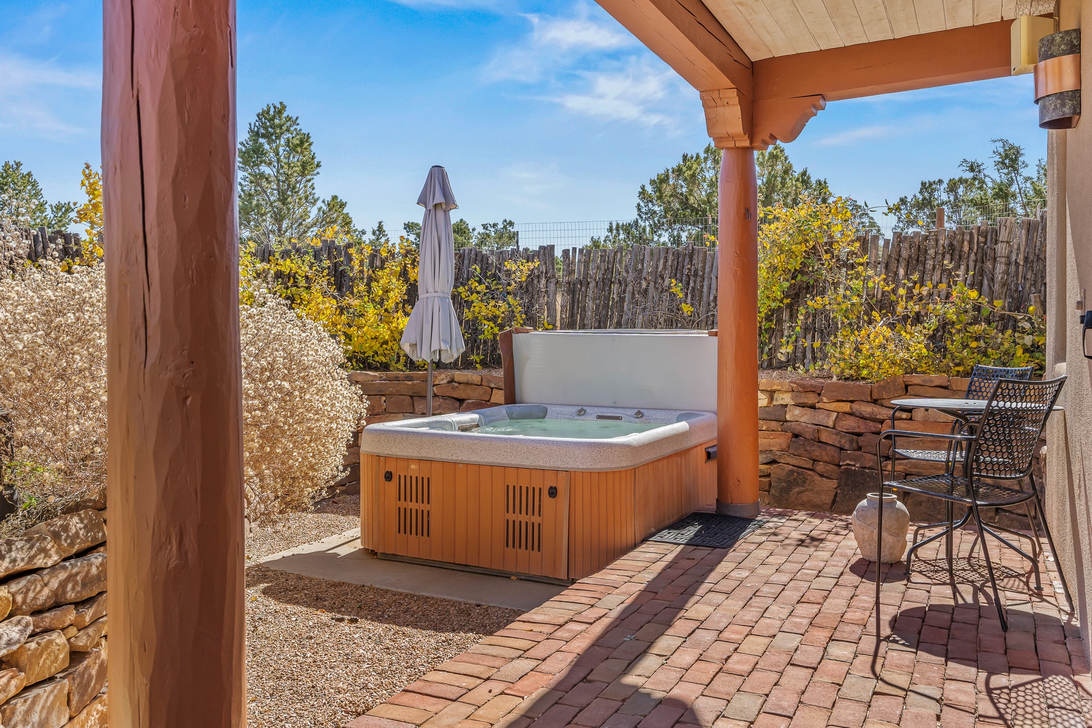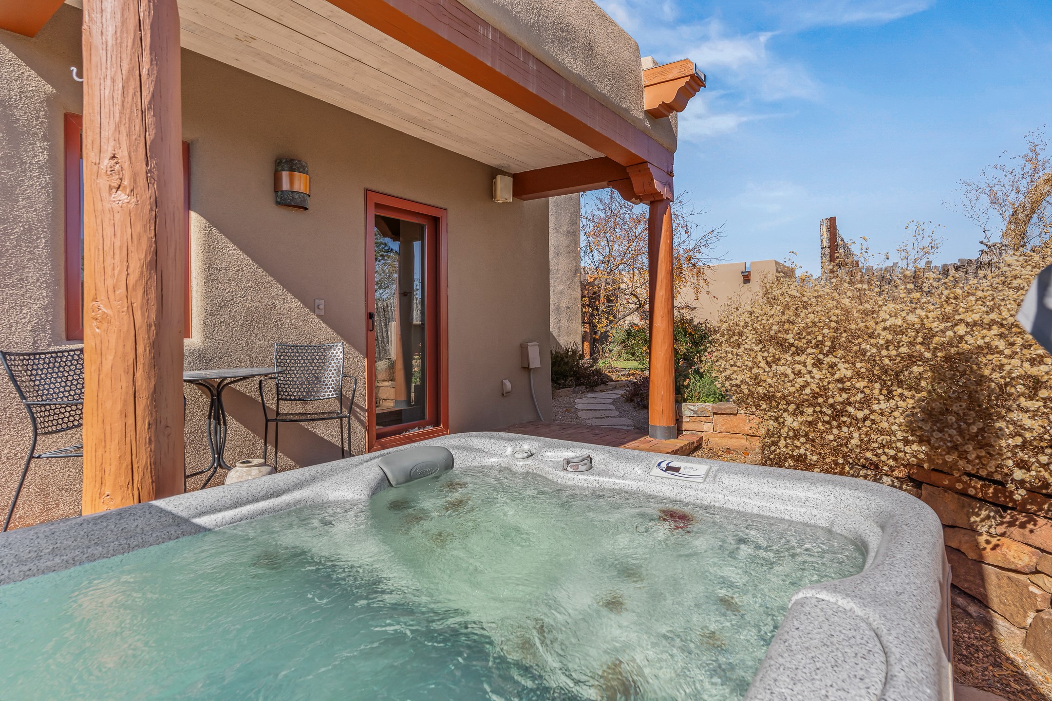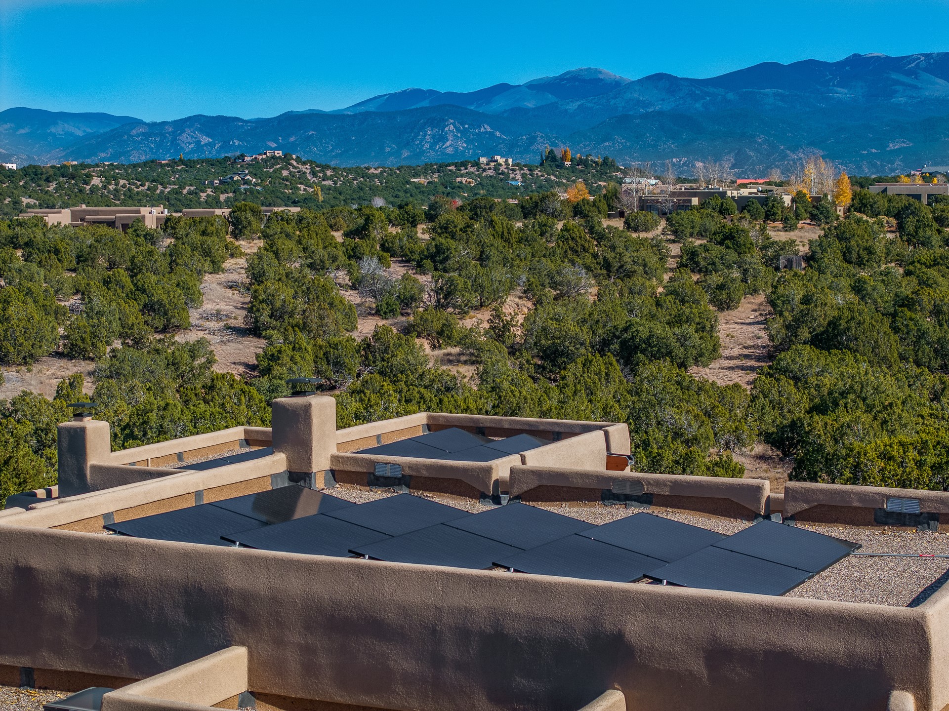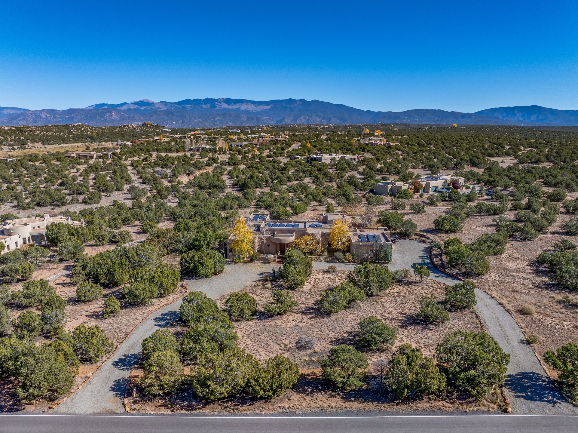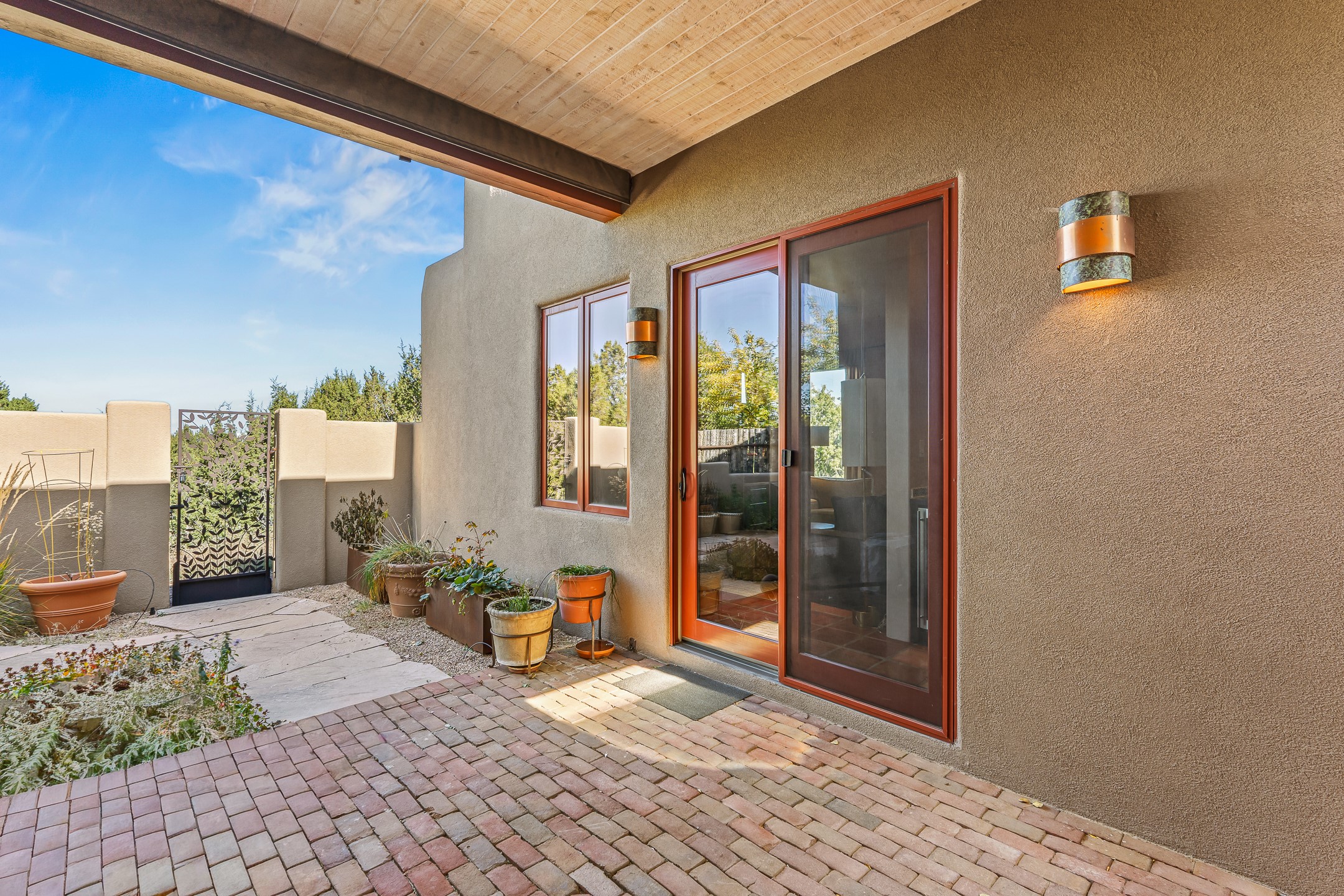 Experience true Santa Fe living in this elegant residence with a detached guesthouse, perfectly positioned in the coveted Sundance Estates to capture sweeping views of the Sangre de Cristo Mountains. Designed for seamless indoor-outdoor living, this home offers expansive portals, an inviting outdoor kiva fireplace, and exquisite landscaping that frame the essence of the Santa Fe lifestyle. Step inside to the beautifully designed open-concept formal living and dining room featuring smooth plaster walls, tall beamed ceilings, a kiva fireplace, expansive windows and double French doors that flood the interiors with natural light and boast the sweeping mountain views. The kitchen is a cook's delight--featuring high-end appliances including a Wolf cooktop and oven, a walk-in pantry, a large cherrywood island, and thoughtful finishes that blend style and function. The primary suite is both luxurious and serene, complete with a gas fireplace, spa-like bath with dual marble vanities, a soaking tub, a walk-in shower, and a grand walk-in closet. Step outside to your private patio and unwind in the hot tub beneath the stars. A pre-wired media room/theater offers the perfect setting for entertainment, while guests enjoy privacy in their own wing with an en-suite bedroom nearby and two convenient powder rooms for visitors. The detached casita provides a private retreat with its own entrance, kiva fireplace, bedroom, kitchenette, and access to the main home through the landscaped backyard. The grounds are as impressive as the interiors, with mature trees, lush lawn, a tranquil water feature, and walkways that connect every outdoor living space--from the primary suite's patio to the guesthouse. A circular driveway completes the property's sense of arrival and sophistication, along with solar and a heated three-car garage, where the third bay currently functions as a gym. 58 Sundance Drive is a home where elegance, comfort, and the natural beauty of Santa Fe come together in harmony.
