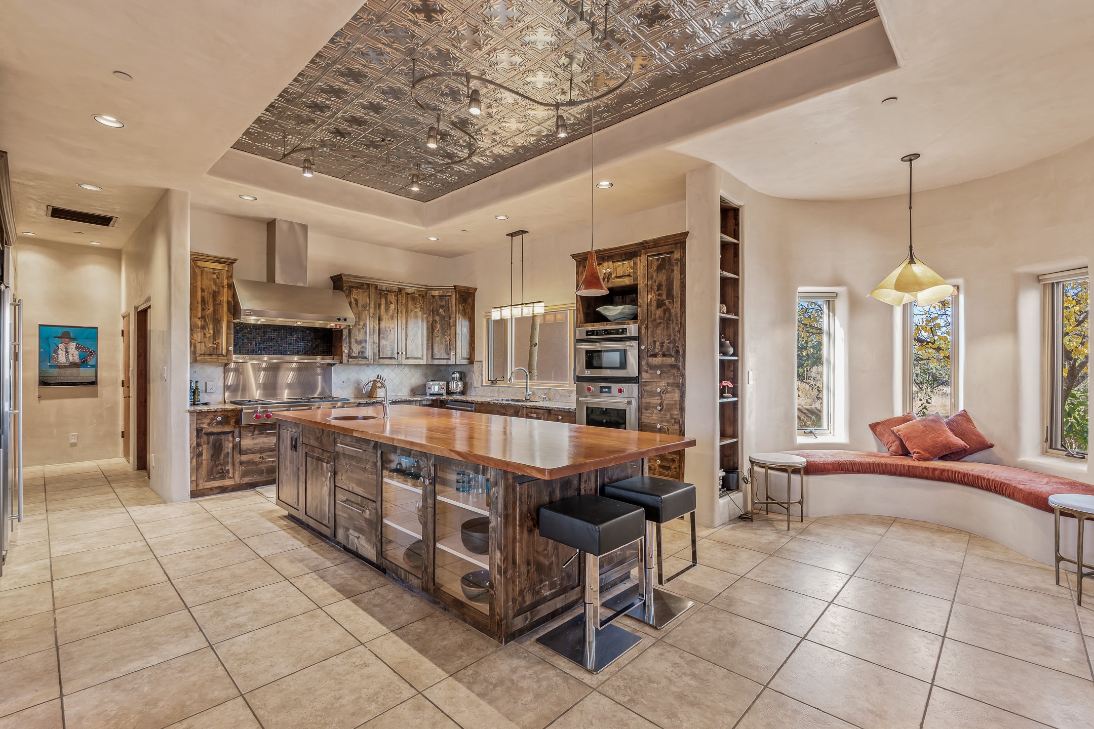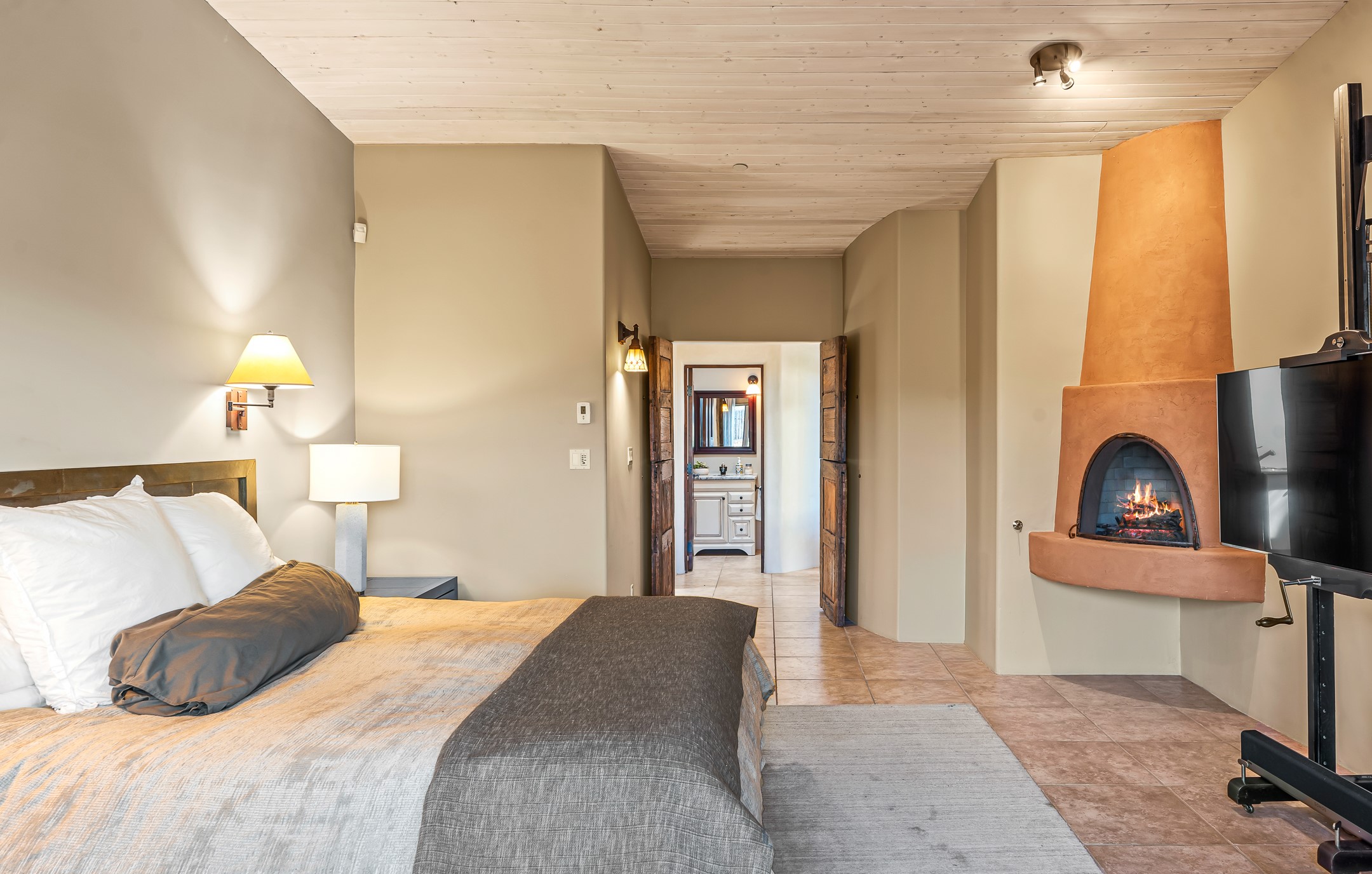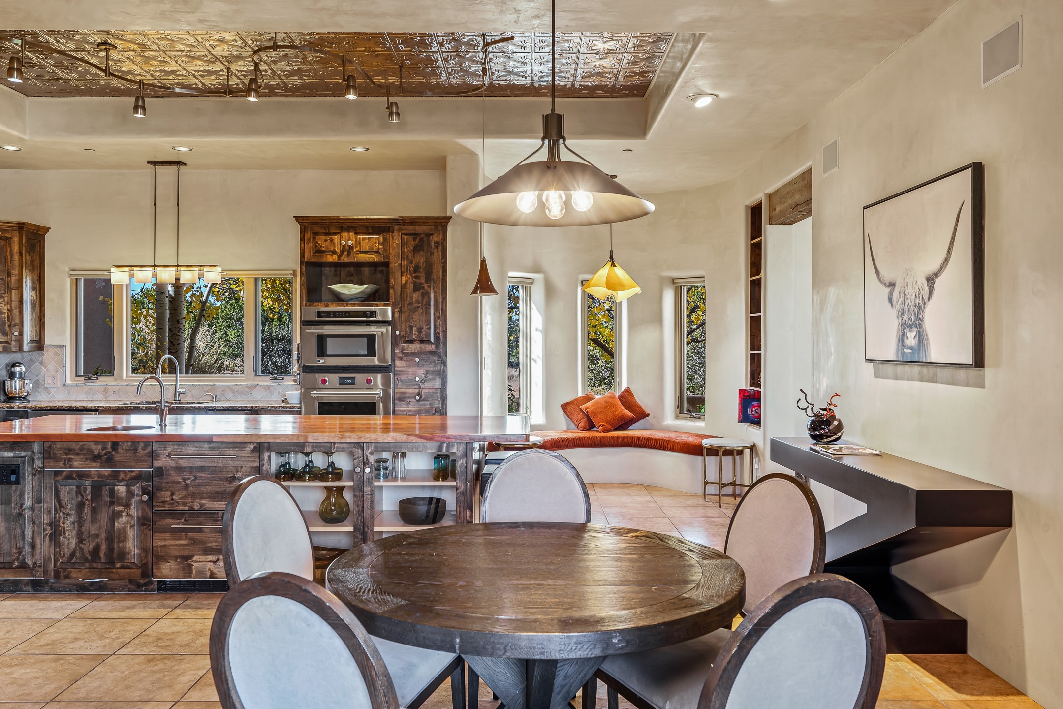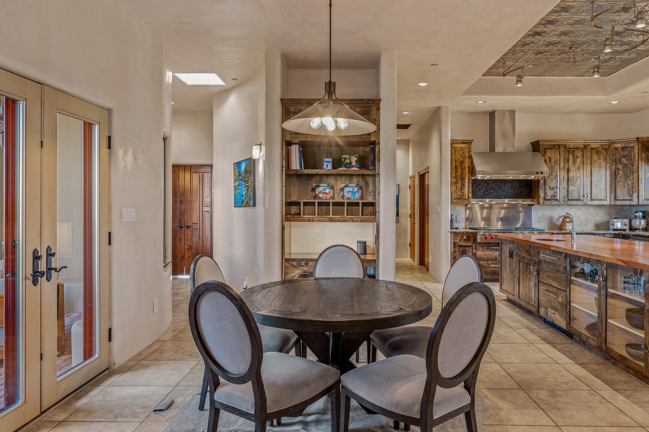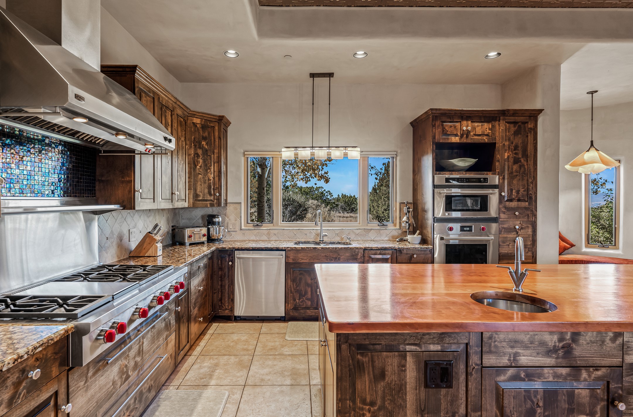 Experience true Santa Fe living in this elegant residence with a detached guesthouse, perfectly positioned in the coveted Sundance Estates to capture sweeping views of the Sangre de Cristo Mountains. Designed for seamless indoor-outdoor living, this home offers expansive portals, an inviting outdoor kiva fireplace, and exquisite landscaping that frame the essence of the Santa Fe lifestyle. Step inside to the beautifully designed open-concept formal living and dining room featuring smooth plaster walls, tall beamed ceilings, a kiva fireplace, expansive windows and double French doors that flood the interiors with natural light and boast the sweeping mountain views. The kitchen is a cook's delight--featuring high-end appliances including a Wolf cooktop and oven, a walk-in pantry, a large cherrywood island, and thoughtful finishes that blend style and function. The primary suite is both luxurious and serene, complete with a gas fireplace, spa-like bath with dual marble vanities, a soaking tub, a walk-in shower, and a grand walk-in closet. Step outside to your private patio and unwind in the hot tub beneath the stars. A pre-wired media room/theater offers the perfect setting for entertainment, while guests enjoy privacy in their own wing with an en-suite bedroom nearby and two convenient powder rooms for visitors. The detached casita provides a private retreat with its own entrance, kiva fireplace, bedroom, kitchenette, and access to the main home through the landscaped backyard. The grounds are as impressive as the interiors, with mature trees, lush lawn, a tranquil water feature, and walkways that connect every outdoor living space--from the primary suite's patio to the guesthouse. A circular driveway completes the property's sense of arrival and sophistication, along with solar and a heated three-car garage, where the third bay currently functions as a gym. 58 Sundance Drive is a home where elegance, comfort, and the natural beauty of Santa Fe come together in harmony.