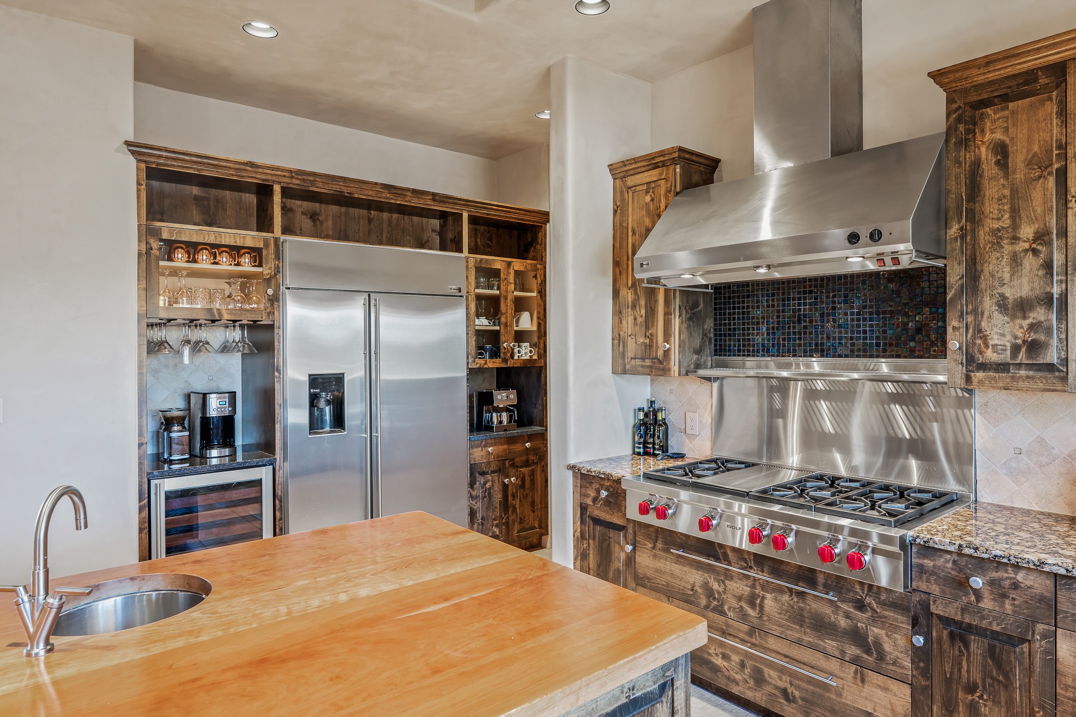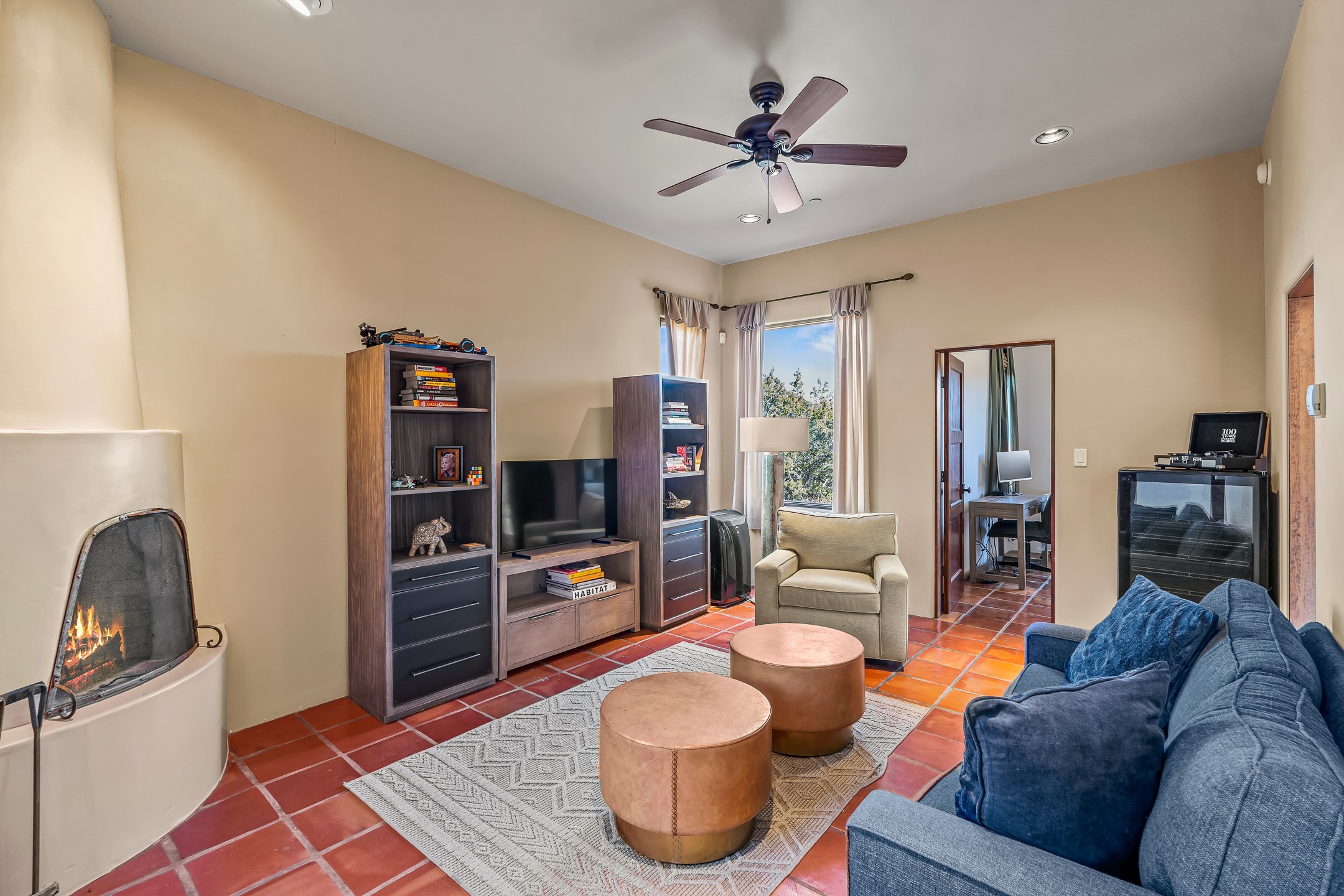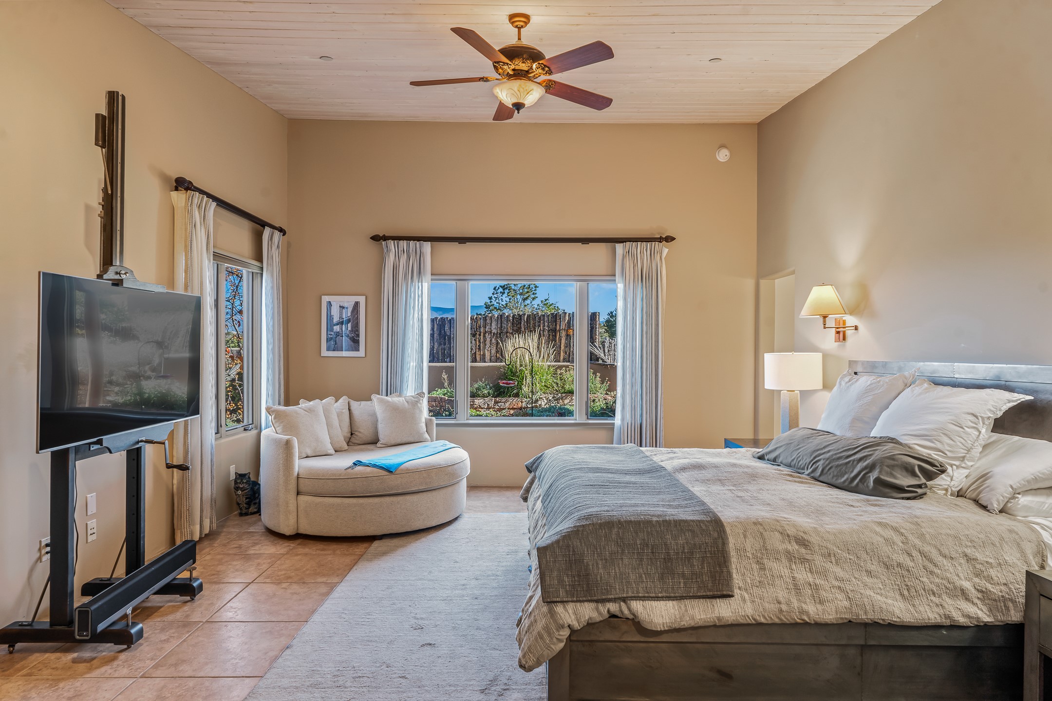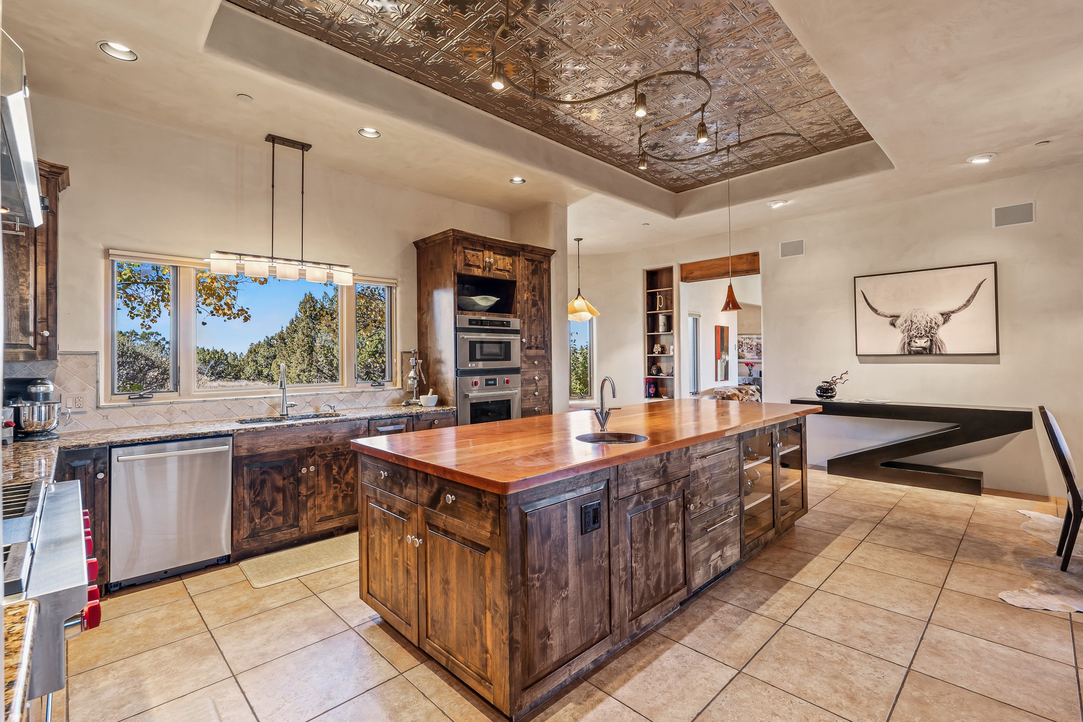 Experience true Santa Fe living in this elegant residence with a detached guesthouse, perfectly positioned in the coveted Sundance Estates to capture sweeping views of the Sangre de Cristo Mountains. Designed for seamless indoor-outdoor living, this home offers expansive portals, an inviting outdoor kiva fireplace, and exquisite landscaping that frame the essence of the Santa Fe lifestyle. Step inside to the beautifully designed open-concept formal living and dining room featuring smooth plaster walls, tall beamed ceilings, a kiva fireplace, expansive windows and double French doors that flood the interiors with natural light and boast the sweeping mountain views. The kitchen is a cook's delight--featuring high-end appliances including a Wolf cooktop and oven, a walk-in pantry, a large cherrywood island, and thoughtful finishes that blend style and function. The primary suite is both luxurious and serene, complete with a gas fireplace, spa-like bath with dual marble vanities, a soaking tub, a walk-in shower, and a grand walk-in closet. Step outside to your private patio and unwind in the hot tub beneath the stars. A pre-wired media room/theater offers the perfect setting for entertainment, while guests enjoy privacy in their own wing with an en-suite bedroom nearby and two convenient powder rooms for visitors. The detached casita provides a private retreat with its own entrance, kiva fireplace, bedroom, kitchenette, and access to the main home through the landscaped backyard. The grounds are as impressive as the interiors, with mature trees, lush lawn, a tranquil water feature, and walkways that connect every outdoor living space--from the primary suite's patio to the guesthouse. A circular driveway completes the property's sense of arrival and sophistication, along with solar and a heated three-car garage, where the third bay currently functions as a gym. 58 Sundance Drive is a home where elegance, comfort, and the natural beauty of Santa Fe come together in harmony.
