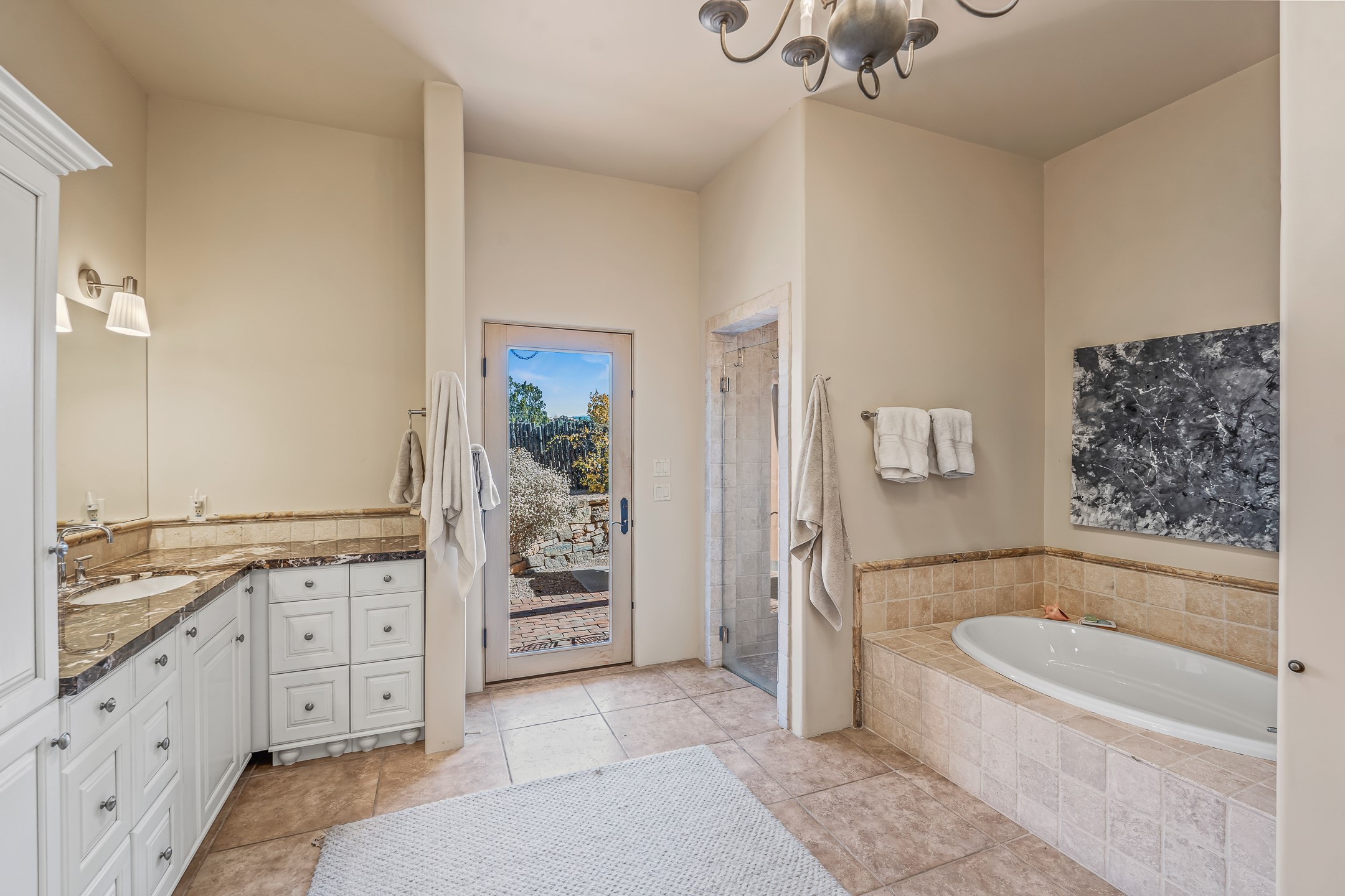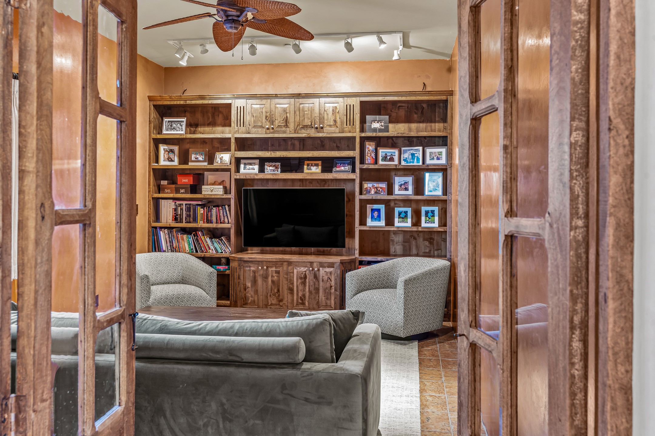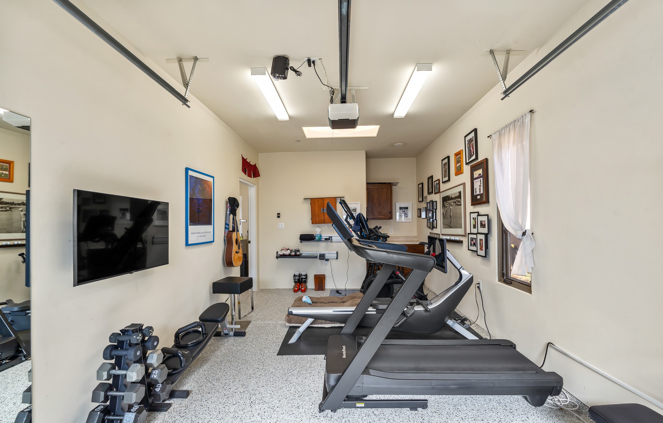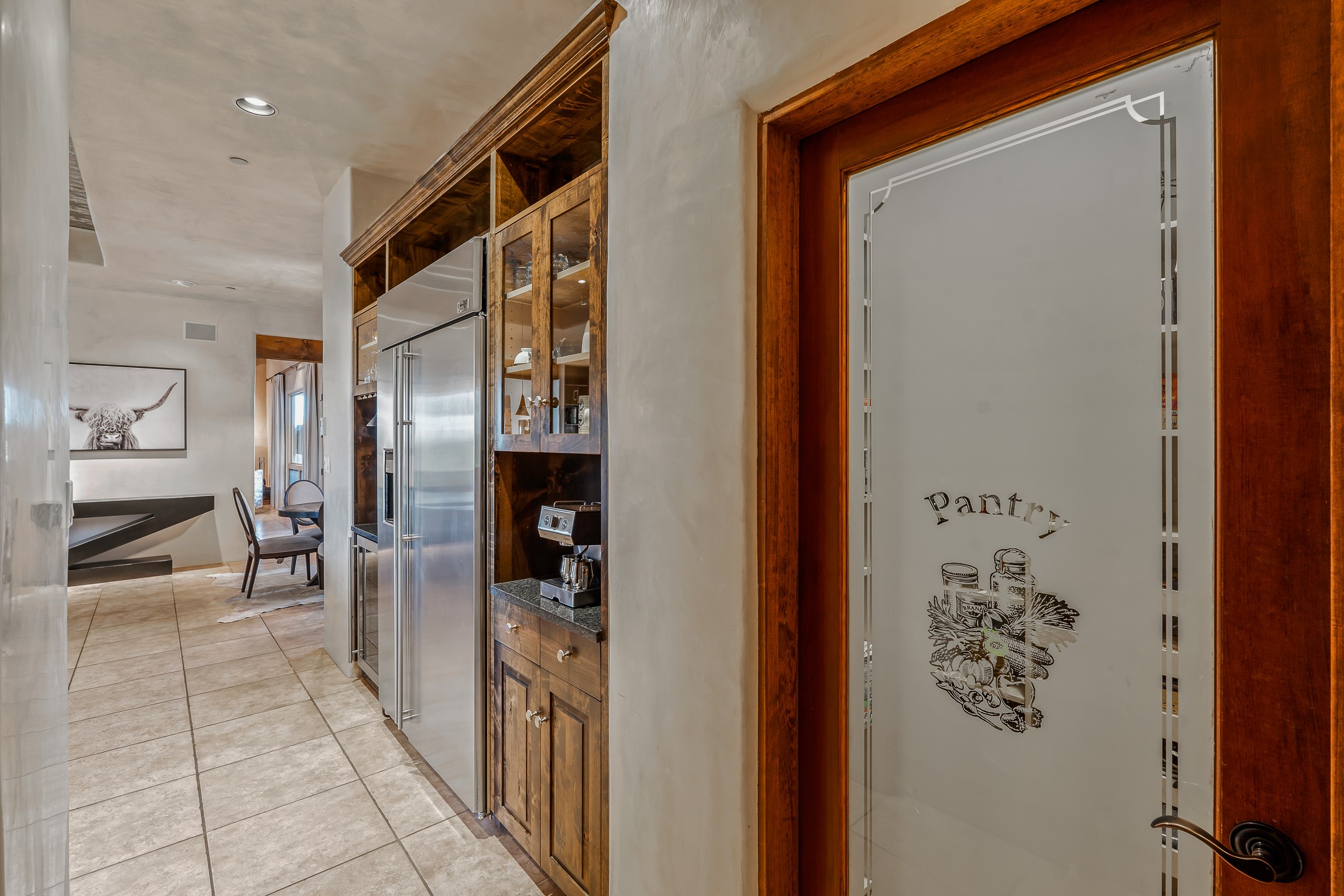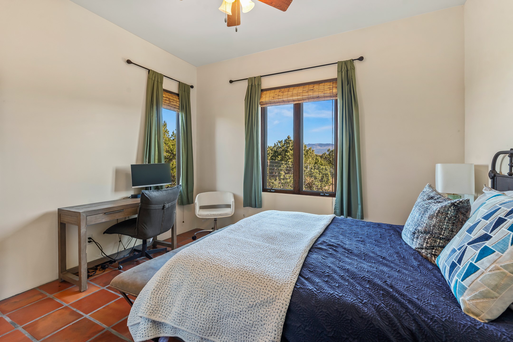 Experience true Santa Fe living in this elegant residence with a detached guesthouse, perfectly positioned in the coveted Sundance Estates to capture sweeping views of the Sangre de Cristo Mountains. Designed for seamless indoor-outdoor living, this home offers expansive portals, an inviting outdoor kiva fireplace, and exquisite landscaping that frame the essence of the Santa Fe lifestyle. Step inside to the beautifully designed open-concept formal living and dining room featuring smooth plaster walls, tall beamed ceilings, a kiva fireplace, expansive windows and double French doors that flood the interiors with natural light and boast the sweeping mountain views. The kitchen is a cook's delight--featuring high-end appliances including a Wolf cooktop and oven, a walk-in pantry, a large cherrywood island, and thoughtful finishes that blend style and function. The primary suite is both luxurious and serene, complete with a gas fireplace, spa-like bath with dual marble vanities, a soaking tub, a walk-in shower, and a grand walk-in closet. Step outside to your private patio and unwind in the hot tub beneath the stars. A pre-wired media room/theater offers the perfect setting for entertainment, while guests enjoy privacy in their own wing with an en-suite bedroom nearby and two convenient powder rooms for visitors. The detached casita provides a private retreat with its own entrance, kiva fireplace, bedroom, kitchenette, and access to the main home through the landscaped backyard. The grounds are as impressive as the interiors, with mature trees, lush lawn, a tranquil water feature, and walkways that connect every outdoor living space--from the primary suite's patio to the guesthouse. A circular driveway completes the property's sense of arrival and sophistication, along with solar and a heated three-car garage, where the third bay currently functions as a gym. 58 Sundance Drive is a home where elegance, comfort, and the natural beauty of Santa Fe come together in harmony.