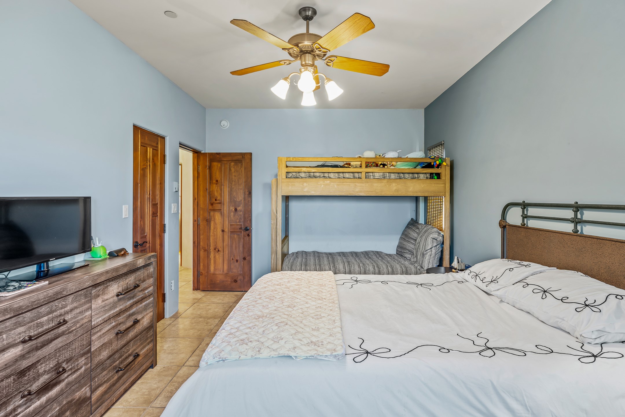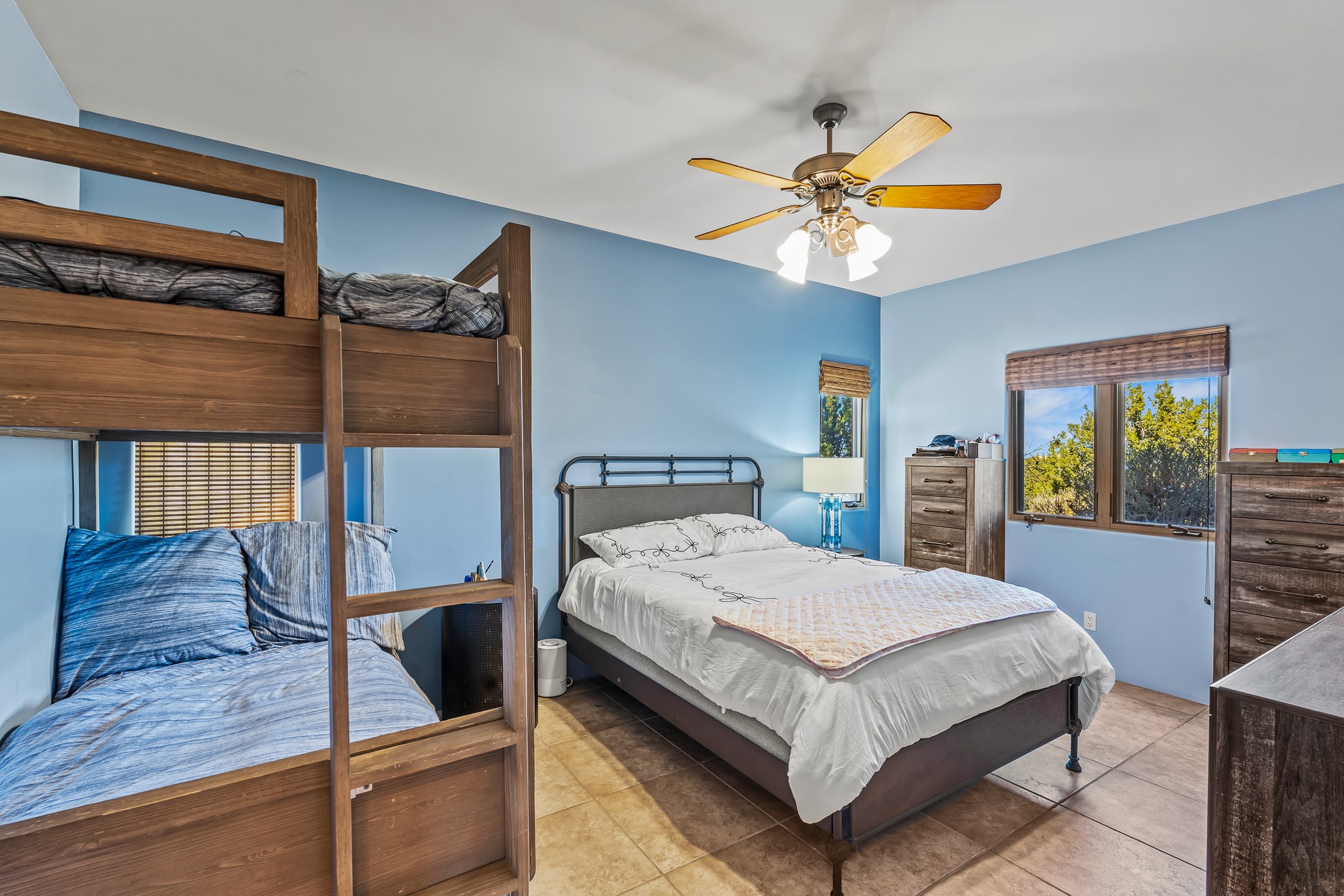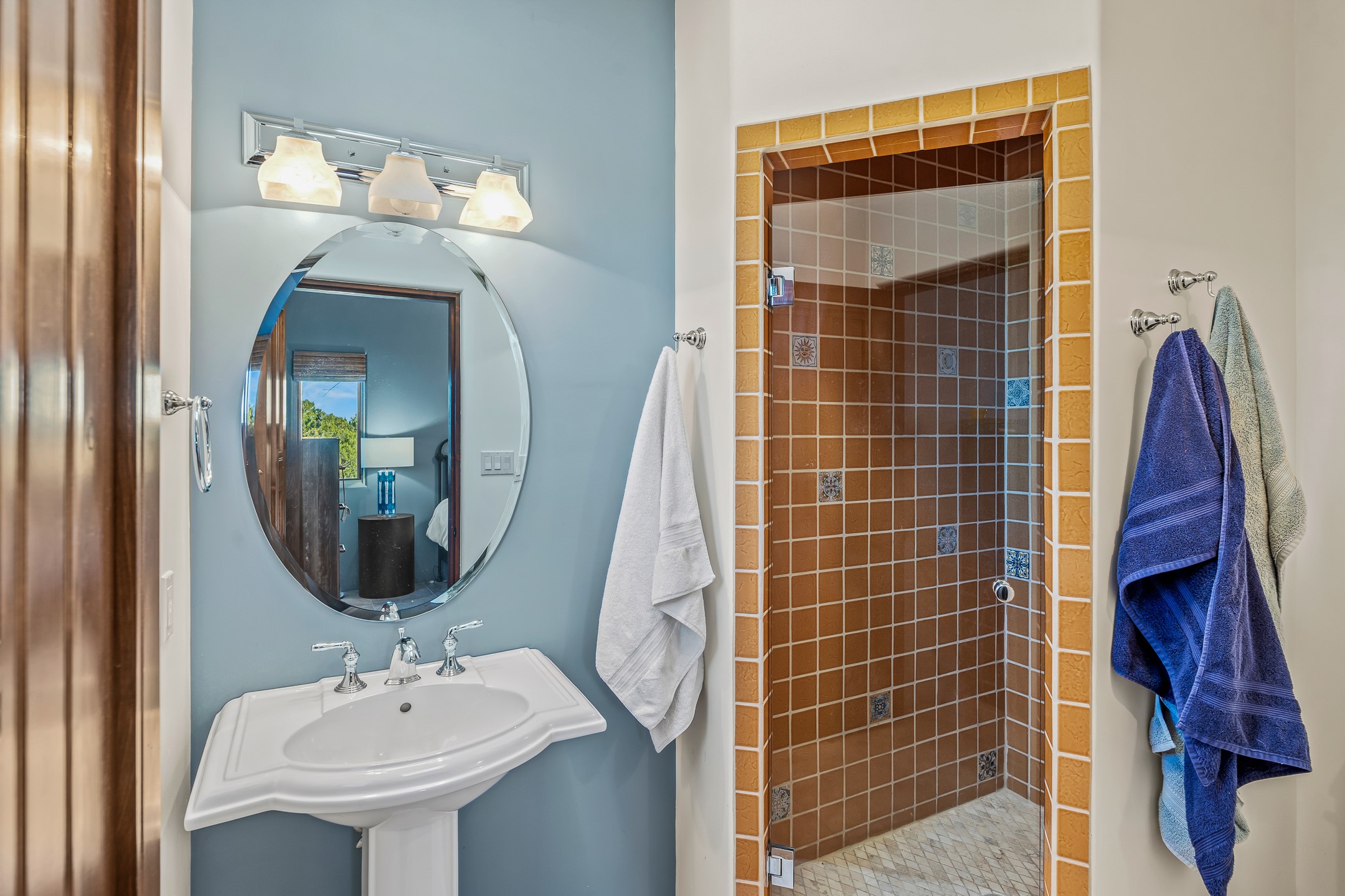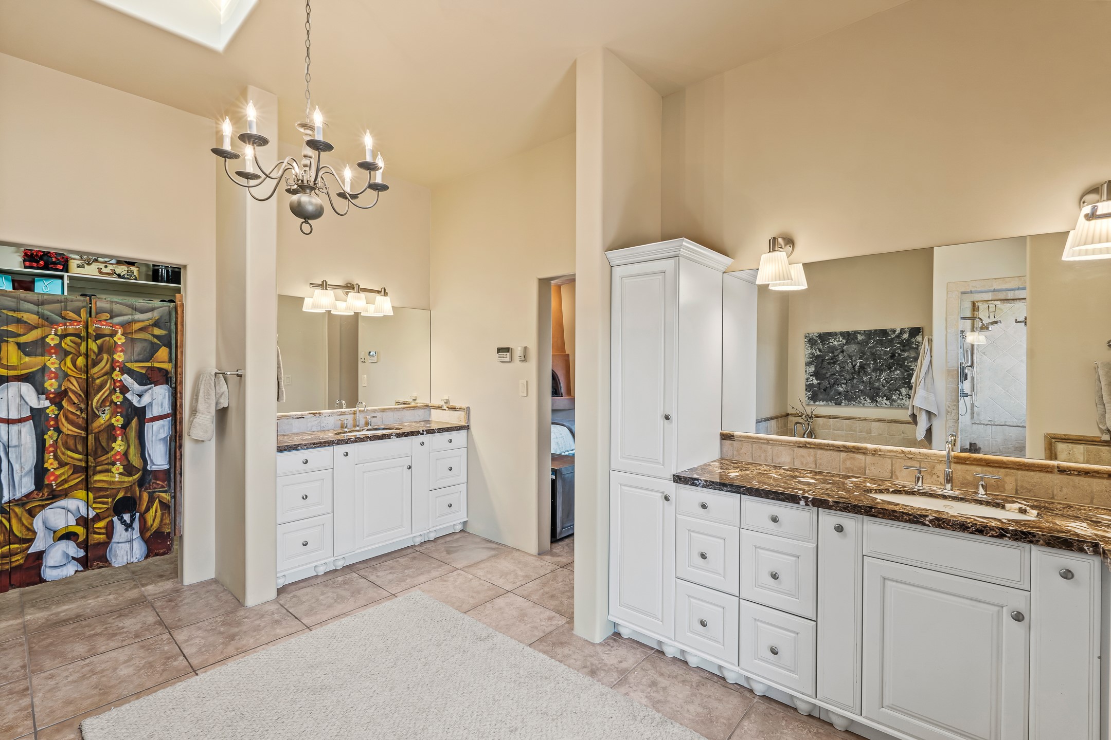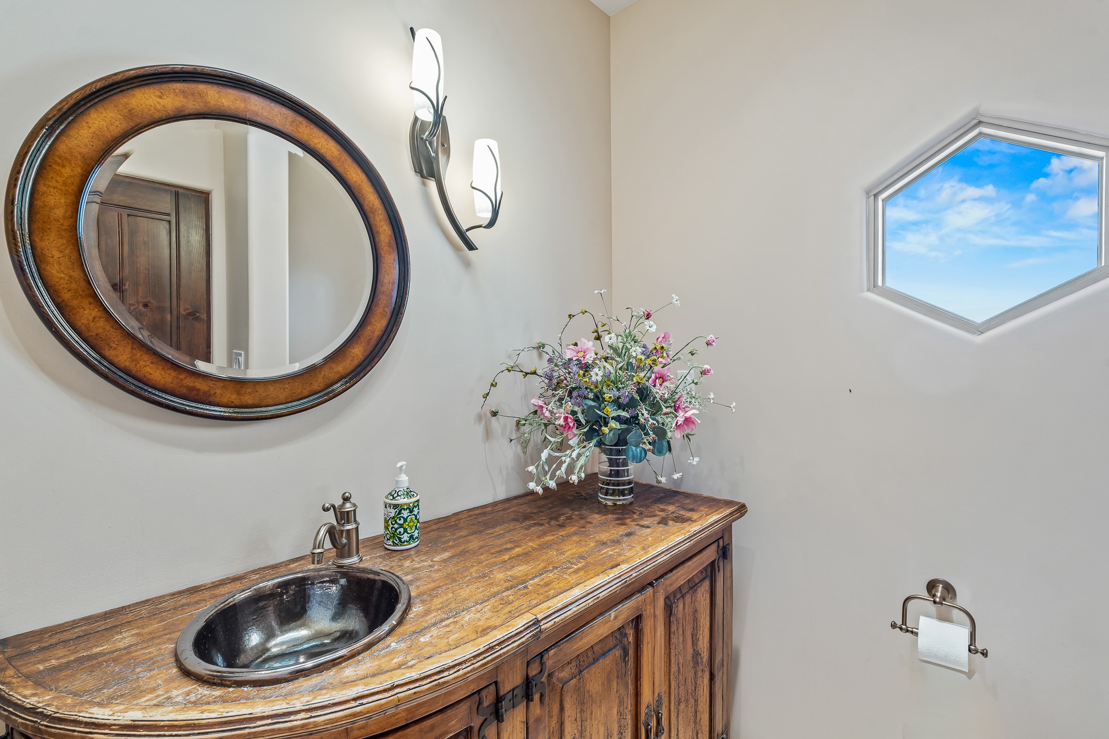 Experience true Santa Fe living in this elegant residence with a detached guesthouse, perfectly positioned in the coveted Sundance Estates to capture sweeping views of the Sangre de Cristo Mountains. Designed for seamless indoor-outdoor living, this home offers expansive portals, an inviting outdoor kiva fireplace, and exquisite landscaping that frame the essence of the Santa Fe lifestyle. Step inside to the beautifully designed open-concept formal living and dining room featuring smooth plaster walls, tall beamed ceilings, a kiva fireplace, expansive windows and double French doors that flood the interiors with natural light and boast the sweeping mountain views. The kitchen is a cook's delight--featuring high-end appliances including a Wolf cooktop and oven, a walk-in pantry, a large cherrywood island, and thoughtful finishes that blend style and function. The primary suite is both luxurious and serene, complete with a gas fireplace, spa-like bath with dual marble vanities, a soaking tub, a walk-in shower, and a grand walk-in closet. Step outside to your private patio and unwind in the hot tub beneath the stars. A pre-wired media room/theater offers the perfect setting for entertainment, while guests enjoy privacy in their own wing with an en-suite bedroom nearby and two convenient powder rooms for visitors. The detached casita provides a private retreat with its own entrance, kiva fireplace, bedroom, kitchenette, and access to the main home through the landscaped backyard. The grounds are as impressive as the interiors, with mature trees, lush lawn, a tranquil water feature, and walkways that connect every outdoor living space--from the primary suite's patio to the guesthouse. A circular driveway completes the property's sense of arrival and sophistication, along with solar and a heated three-car garage, where the third bay currently functions as a gym. 58 Sundance Drive is a home where elegance, comfort, and the natural beauty of Santa Fe come together in harmony.