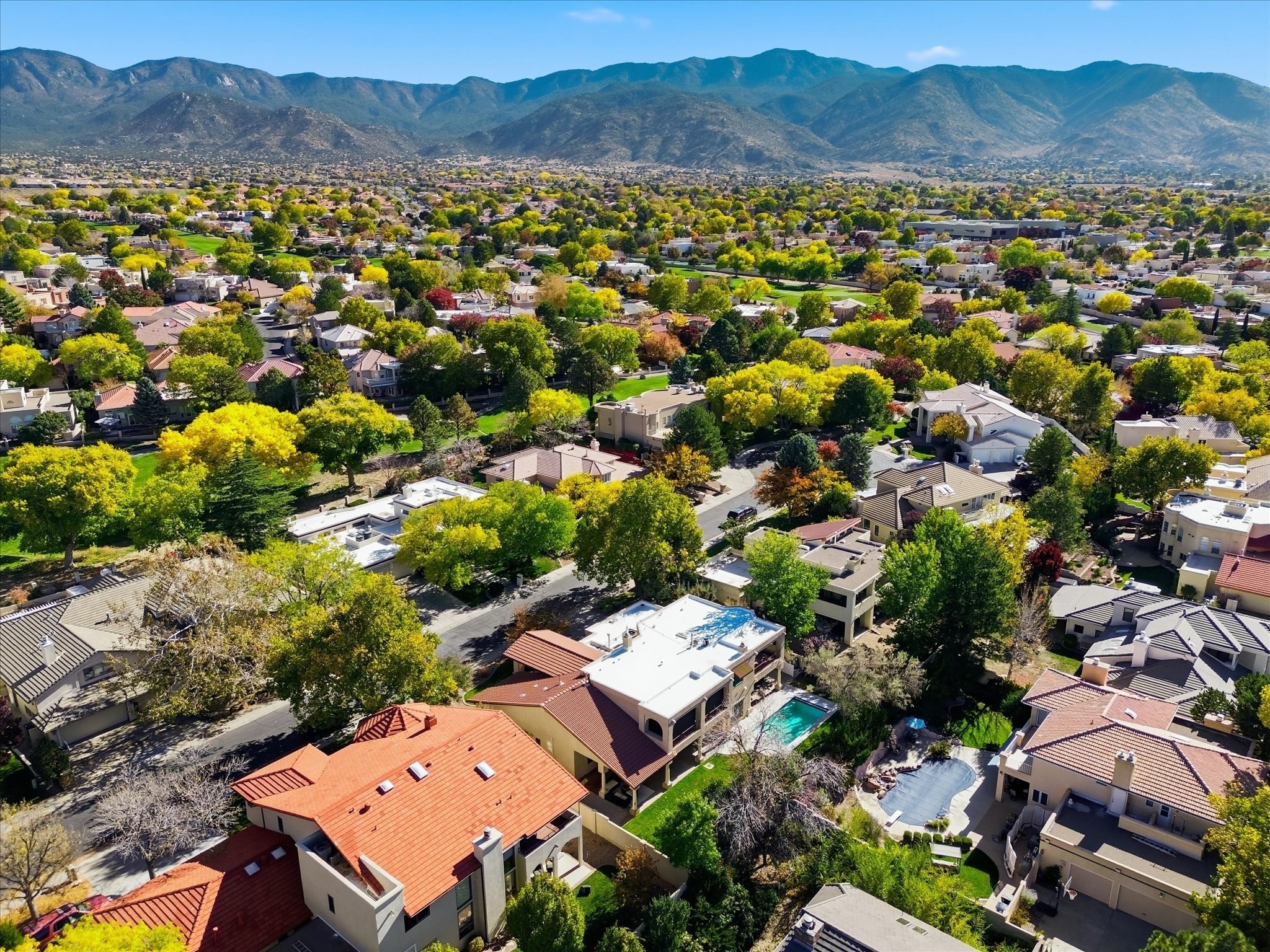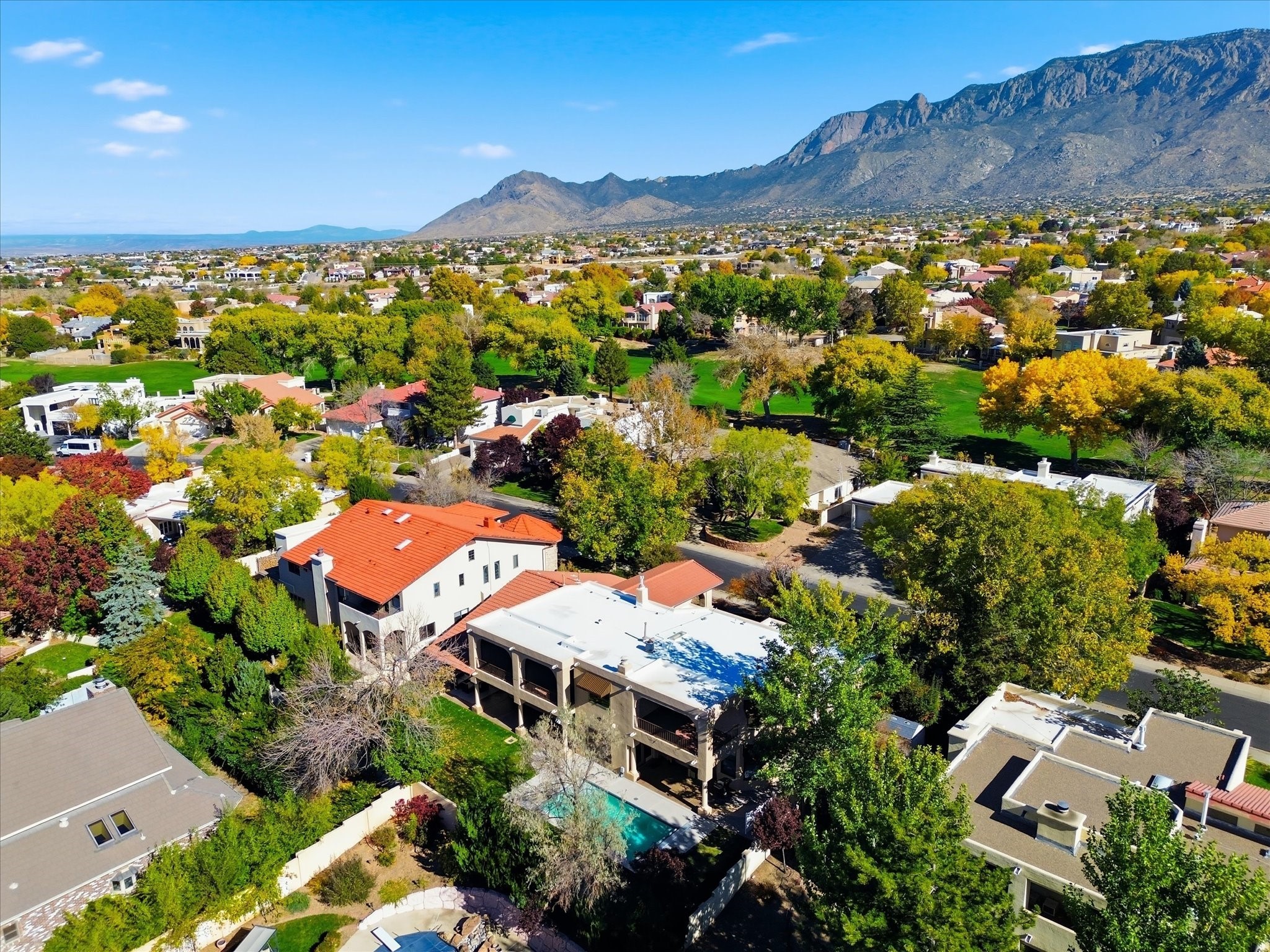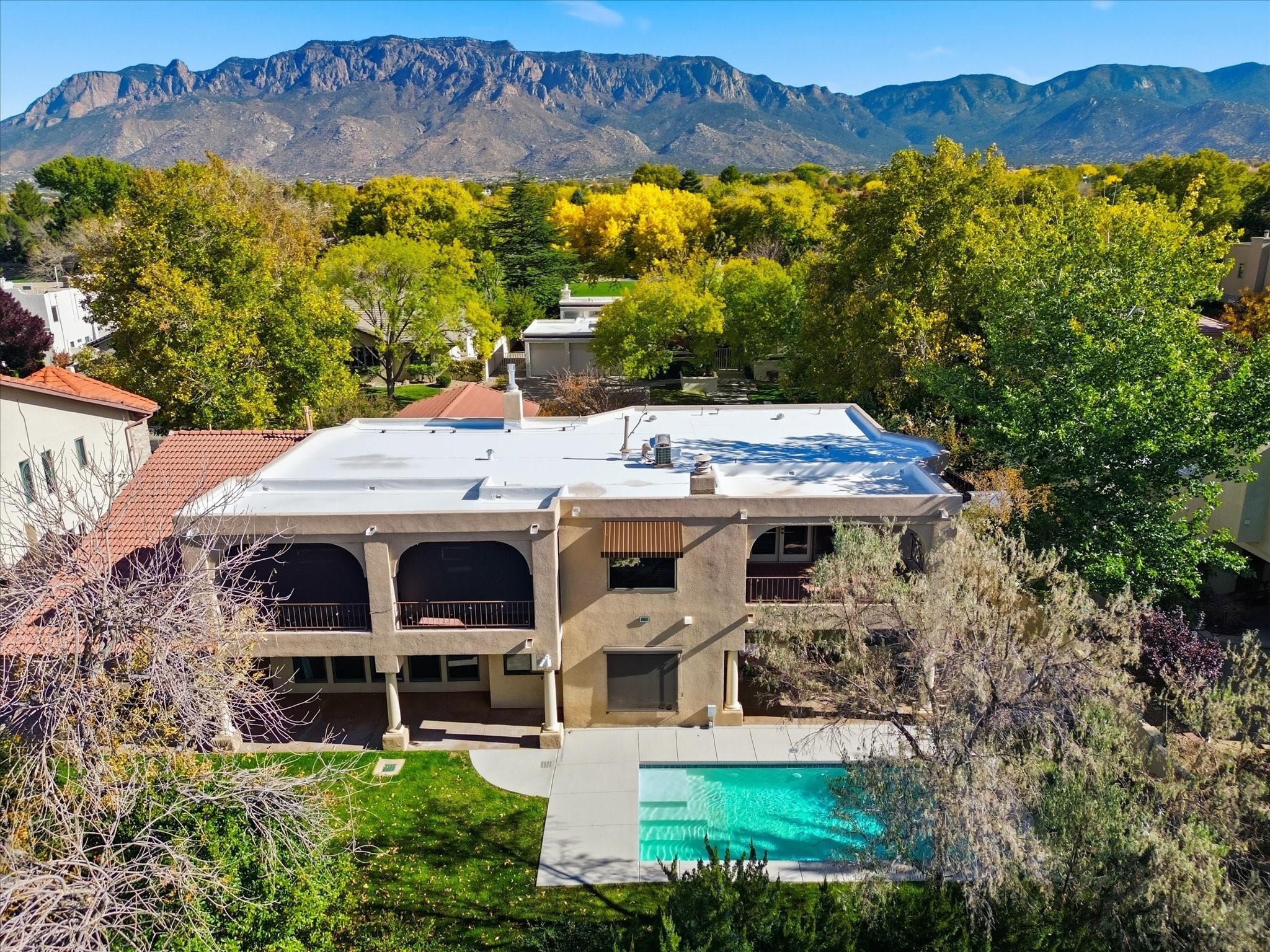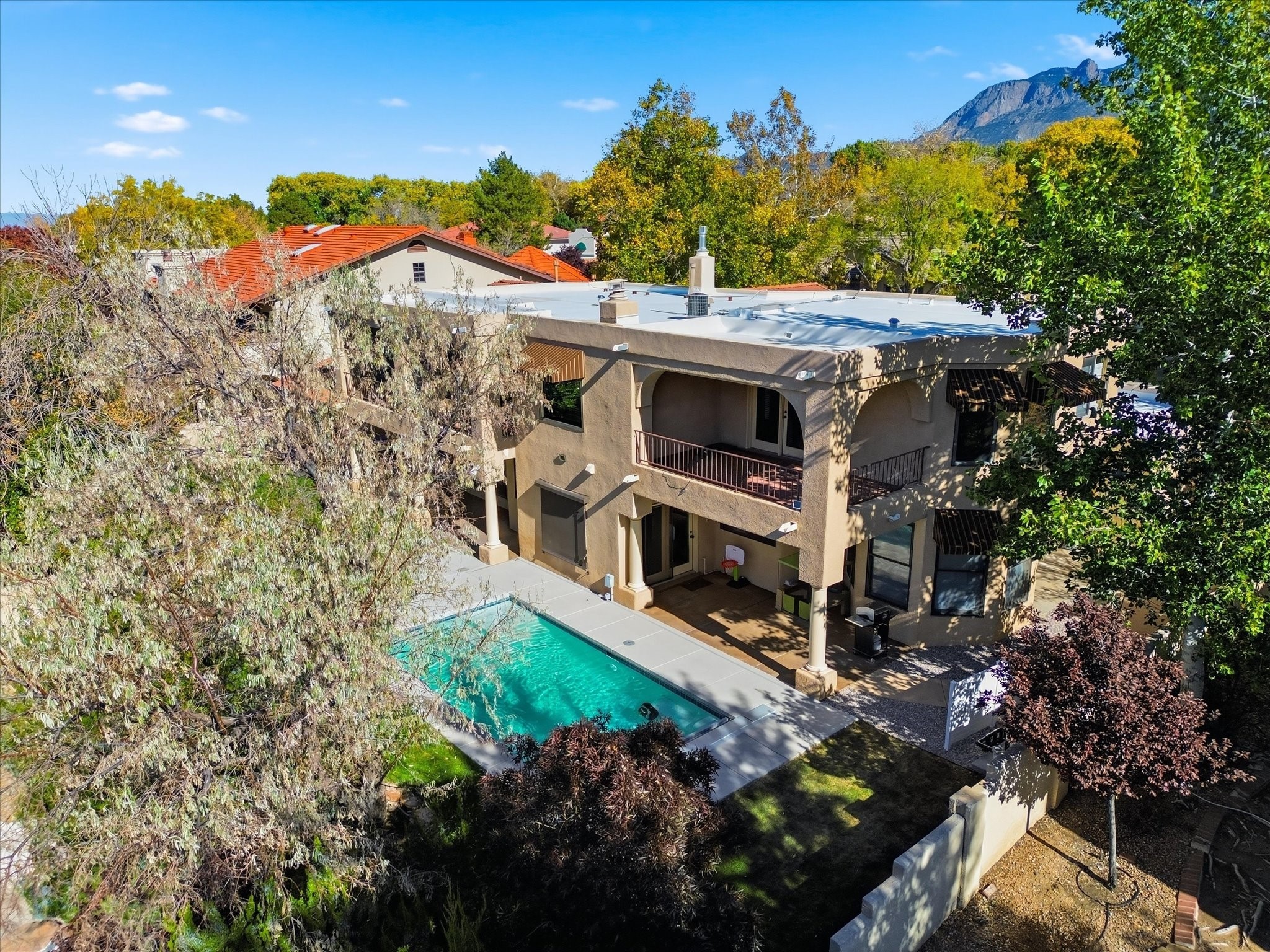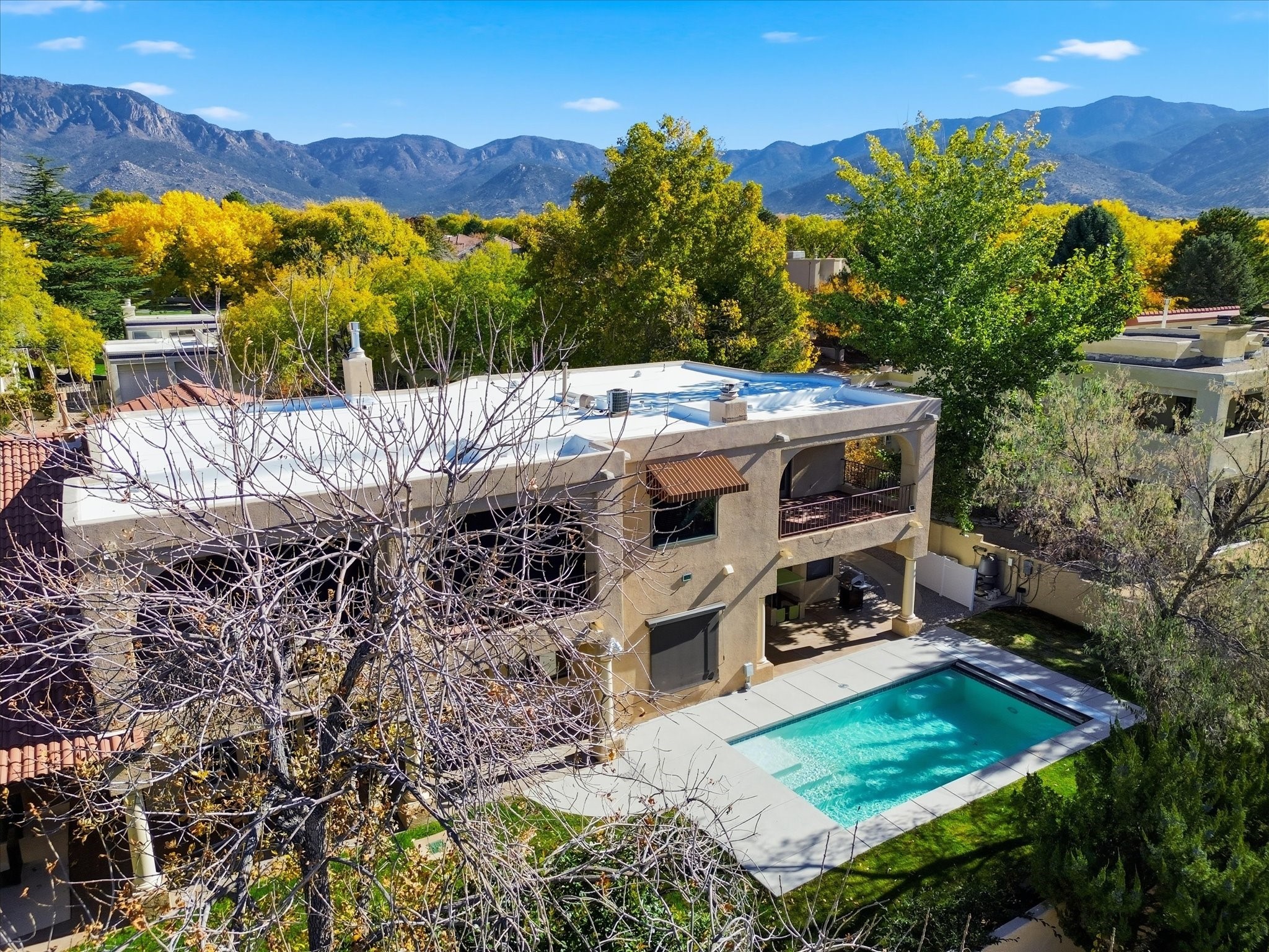 Nestled on one of Tanoan's beautiful tree lined streets, this stunning home sits nearby a cul-de-sac and within walking distance of the country club. This updated home has exquisite attention to detail, showcasing high-end finishes throughout, including Venetian plaster walls, hand-chiseled stone and hardwood floors. Upon entering the home you will appreciate the high ceilings and many windows that open to the backyard and patio, offering lots of natural light into the home. Downstairs you will find 3 generously sized bedrooms with good separation between them. Off the foyer is the formal dining room and large expansive living room with dry bar nearby. The kitchen will not disappoint, with dual ovens, granite countertops, tile backsplash and undermount lighting, plus an eat-in kitchen area. There is also a room off the back patio that is currently being used as an at home gym. The upper level is dedicated to a private primary suite, featuring a spacious bedroom, a cozy loft sitting area with balcony access, and a luxurious spa-like bath complete with a soaking tub, large shower, sauna, and generous walk-in closet. The landscaped backyard offers a beautiful lawn, multiple covered patios ideal for outdoor living and entertaining, along with a heated pool with automatic cover system. 3 car garage with EV charger, water filtration system and soft water system. Recent seller updates include replacement of a portion of the TPO roof, A/C unit, dishwasher, automated irrigation system and heated pool. Enjoy the tranquility, privacy, and security of Albuquerque's 24/7 guard-gated country club community.