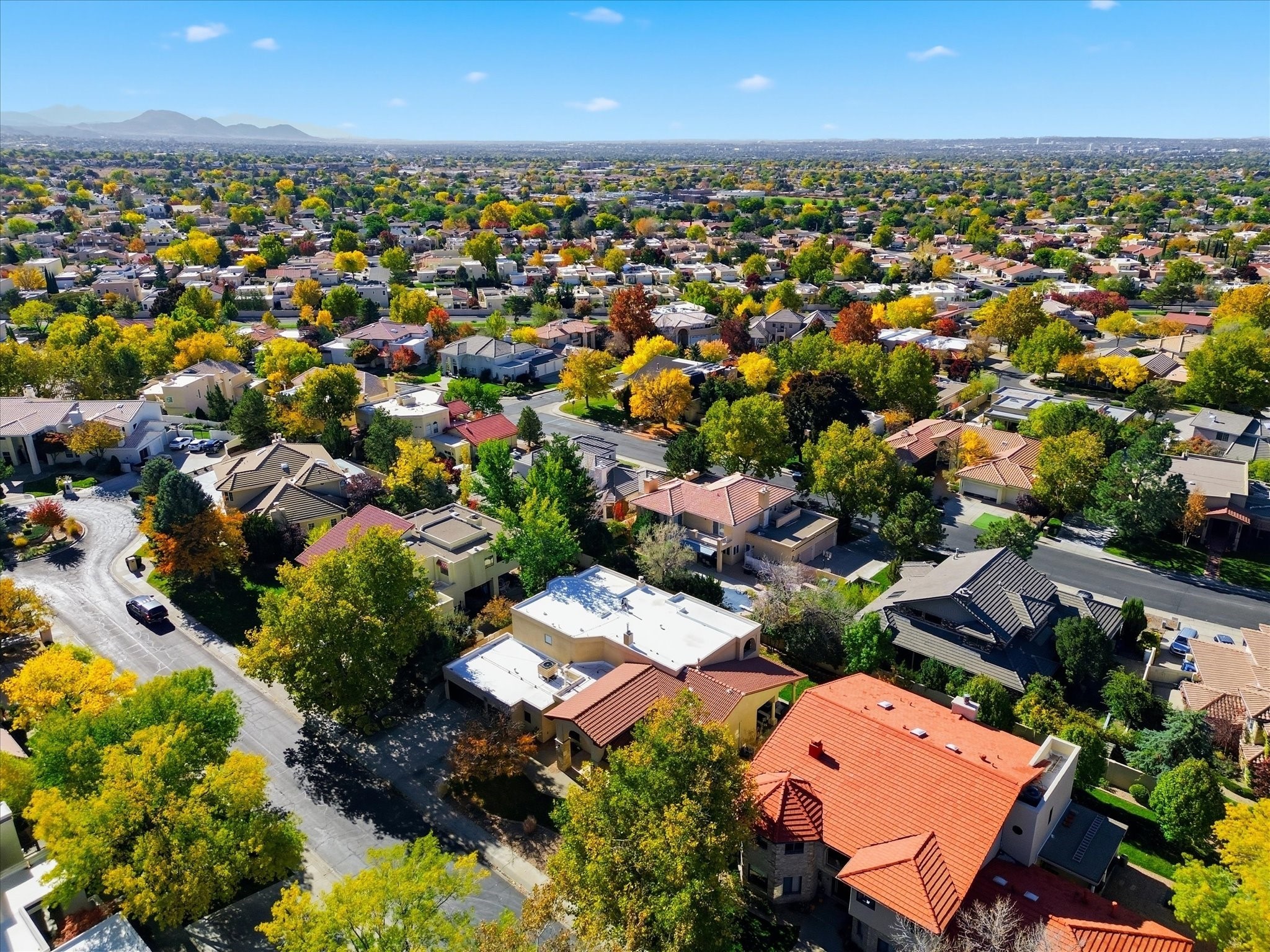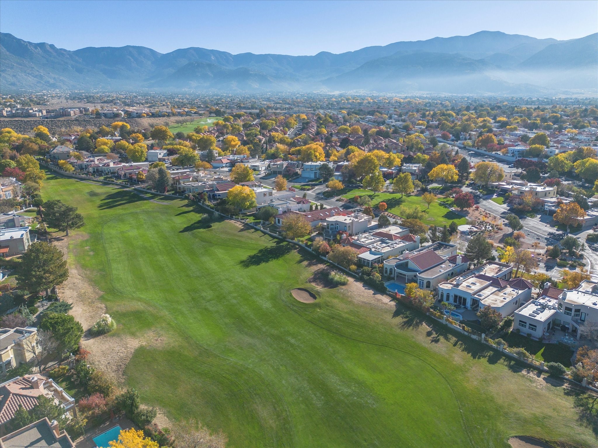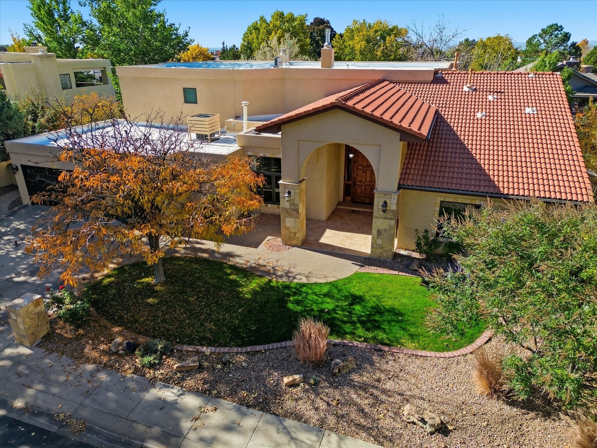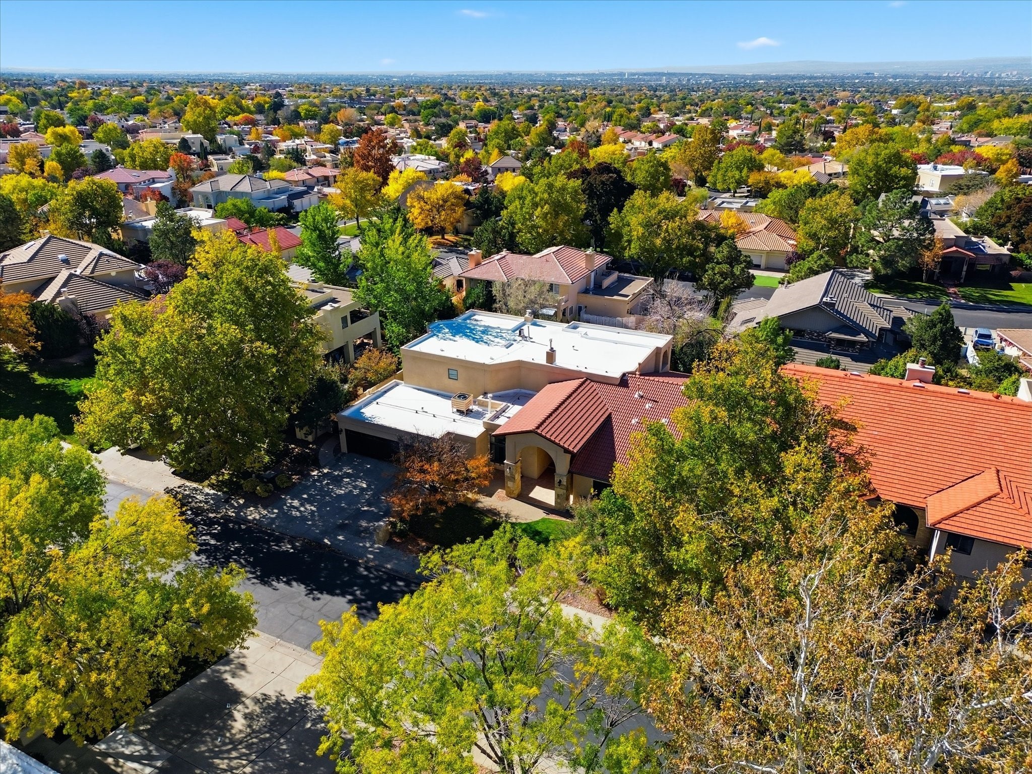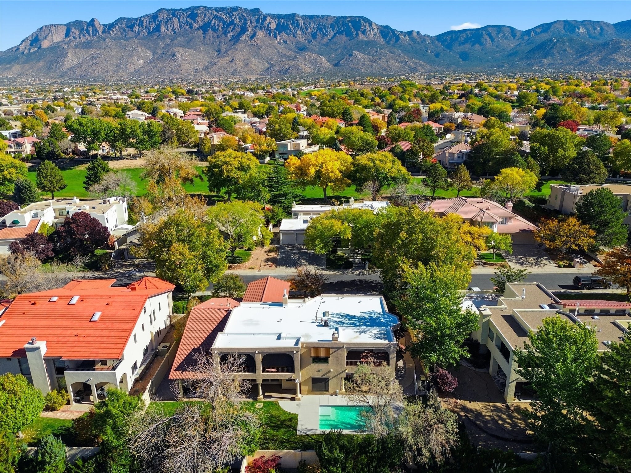 Nestled on one of Tanoan's beautiful tree lined streets, this stunning home sits nearby a cul-de-sac and within walking distance of the country club. This updated home has exquisite attention to detail, showcasing high-end finishes throughout, including Venetian plaster walls, hand-chiseled stone and hardwood floors. Upon entering the home you will appreciate the high ceilings and many windows that open to the backyard and patio, offering lots of natural light into the home. Downstairs you will find 3 generously sized bedrooms with good separation between them. Off the foyer is the formal dining room and large expansive living room with dry bar nearby. The kitchen will not disappoint, with dual ovens, granite countertops, tile backsplash and undermount lighting, plus an eat-in kitchen area. There is also a room off the back patio that is currently being used as an at home gym. The upper level is dedicated to a private primary suite, featuring a spacious bedroom, a cozy loft sitting area with balcony access, and a luxurious spa-like bath complete with a soaking tub, large shower, sauna, and generous walk-in closet. The landscaped backyard offers a beautiful lawn, multiple covered patios ideal for outdoor living and entertaining, along with a heated pool with automatic cover system. 3 car garage with EV charger, water filtration system and soft water system. Recent seller updates include replacement of a portion of the TPO roof, A/C unit, dishwasher, automated irrigation system and heated pool. Enjoy the tranquility, privacy, and security of Albuquerque's 24/7 guard-gated country club community.