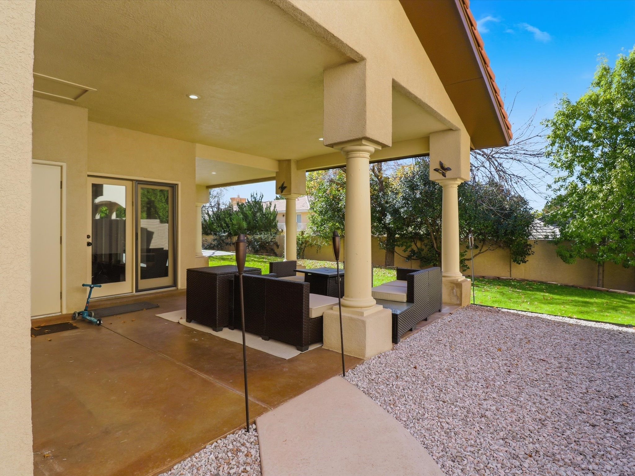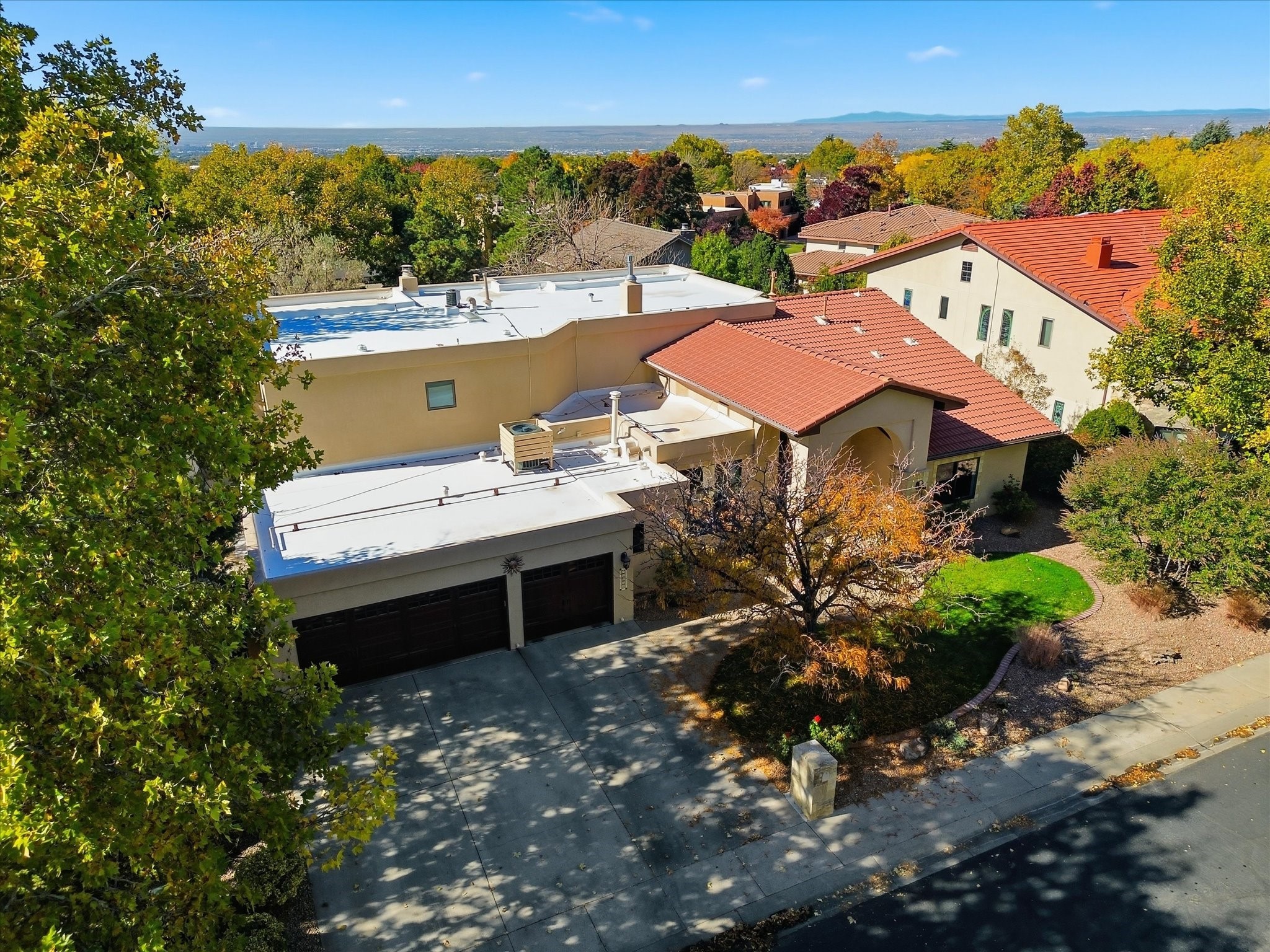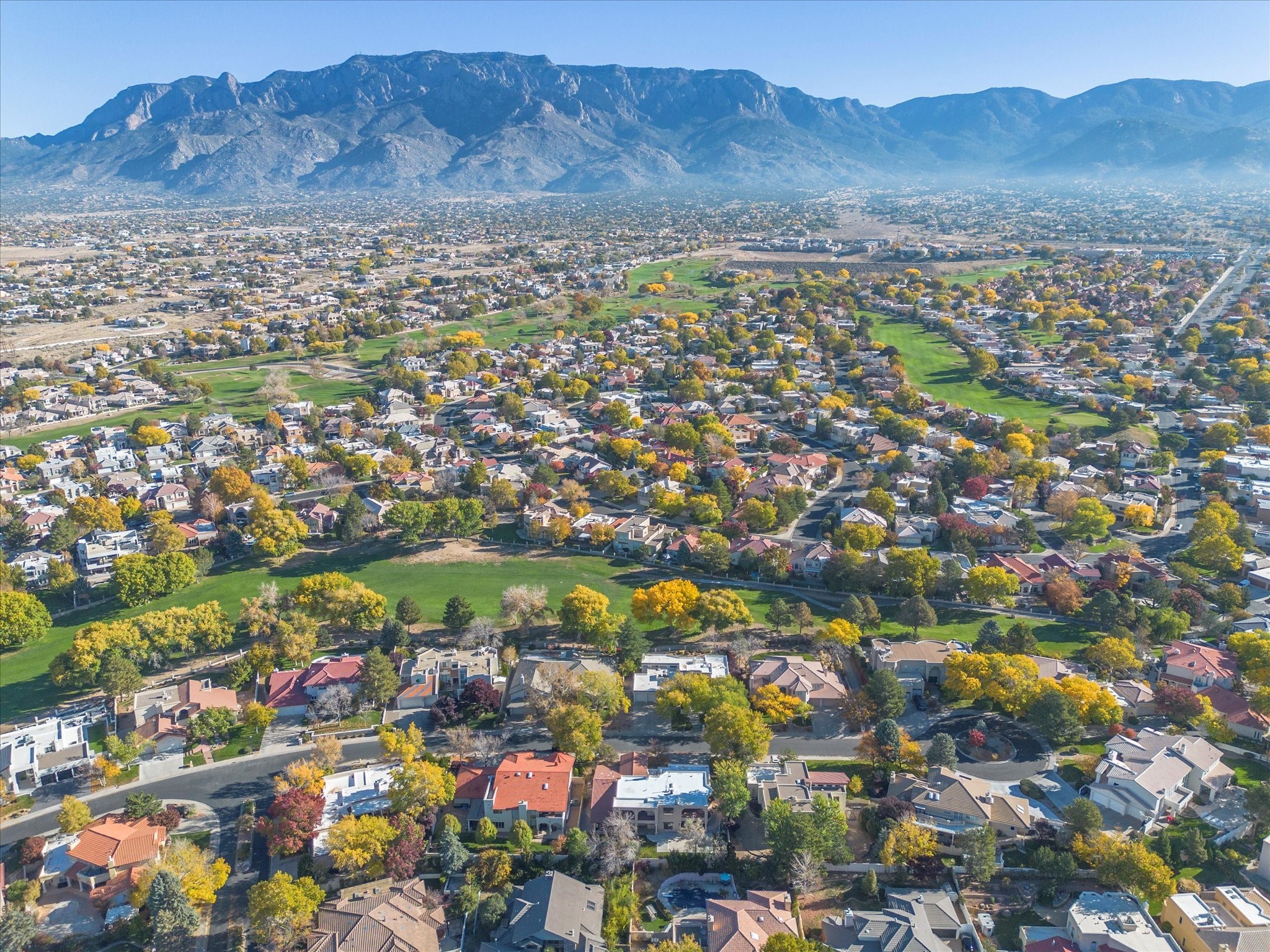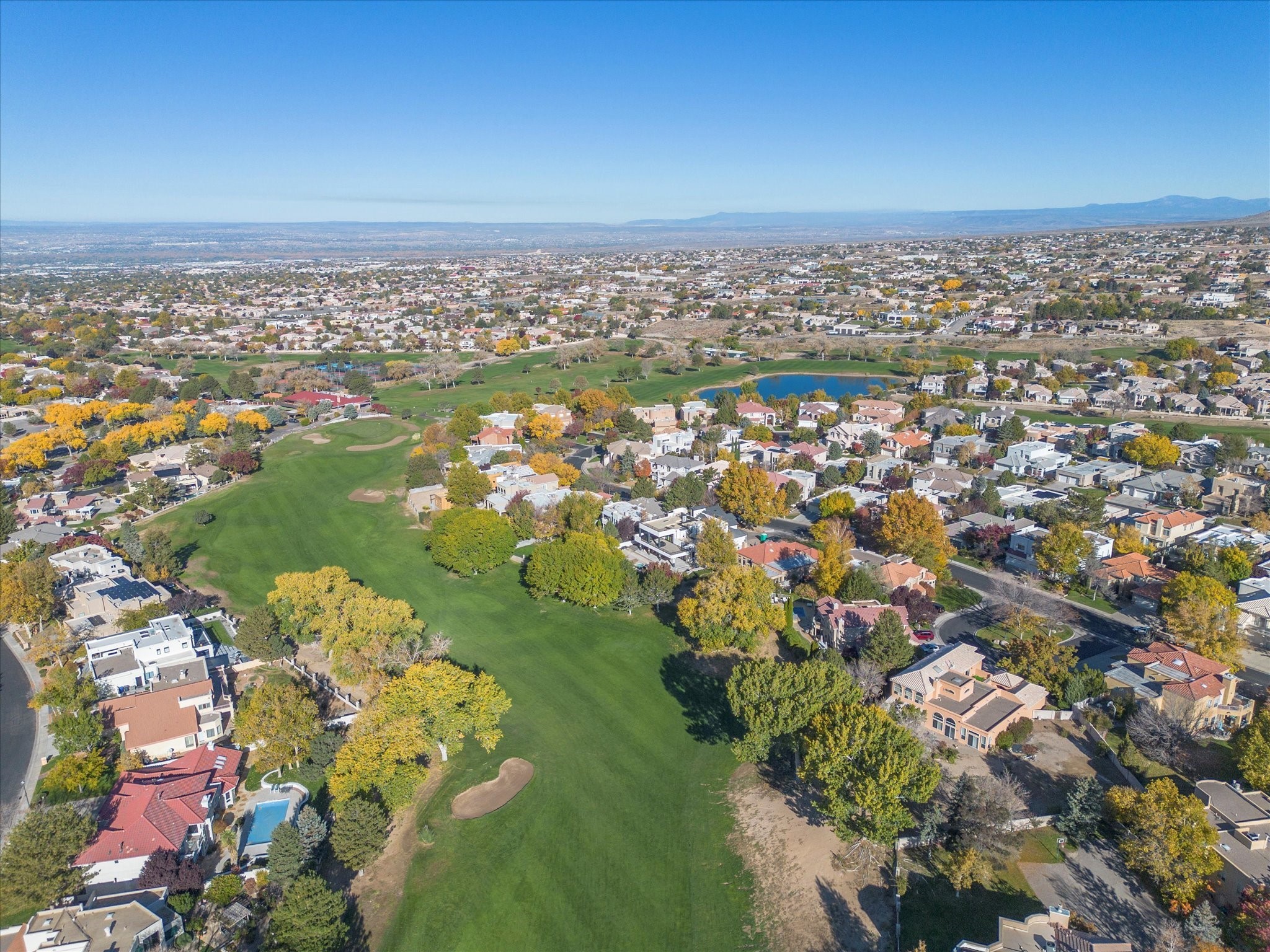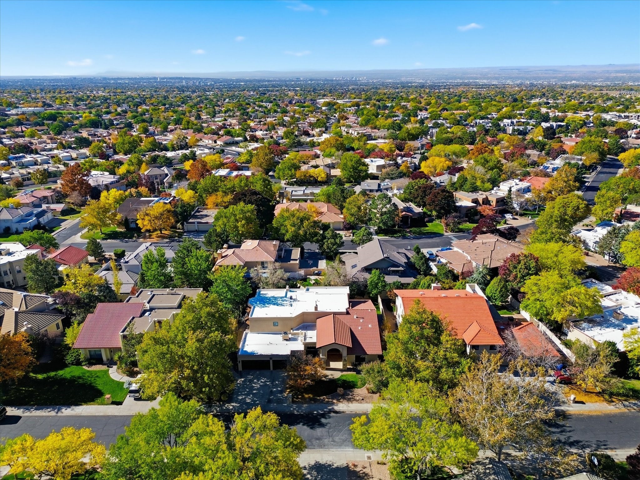 Nestled on one of Tanoan's beautiful tree lined streets, this stunning home sits nearby a cul-de-sac and within walking distance of the country club. This updated home has exquisite attention to detail, showcasing high-end finishes throughout, including Venetian plaster walls, hand-chiseled stone and hardwood floors. Upon entering the home you will appreciate the high ceilings and many windows that open to the backyard and patio, offering lots of natural light into the home. Downstairs you will find 3 generously sized bedrooms with good separation between them. Off the foyer is the formal dining room and large expansive living room with dry bar nearby. The kitchen will not disappoint, with dual ovens, granite countertops, tile backsplash and undermount lighting, plus an eat-in kitchen area. There is also a room off the back patio that is currently being used as an at home gym. The upper level is dedicated to a private primary suite, featuring a spacious bedroom, a cozy loft sitting area with balcony access, and a luxurious spa-like bath complete with a soaking tub, large shower, sauna, and generous walk-in closet. The landscaped backyard offers a beautiful lawn, multiple covered patios ideal for outdoor living and entertaining, along with a heated pool with automatic cover system. 3 car garage with EV charger, water filtration system and soft water system. Recent seller updates include replacement of a portion of the TPO roof, A/C unit, dishwasher, automated irrigation system and heated pool. Enjoy the tranquility, privacy, and security of Albuquerque's 24/7 guard-gated country club community.
