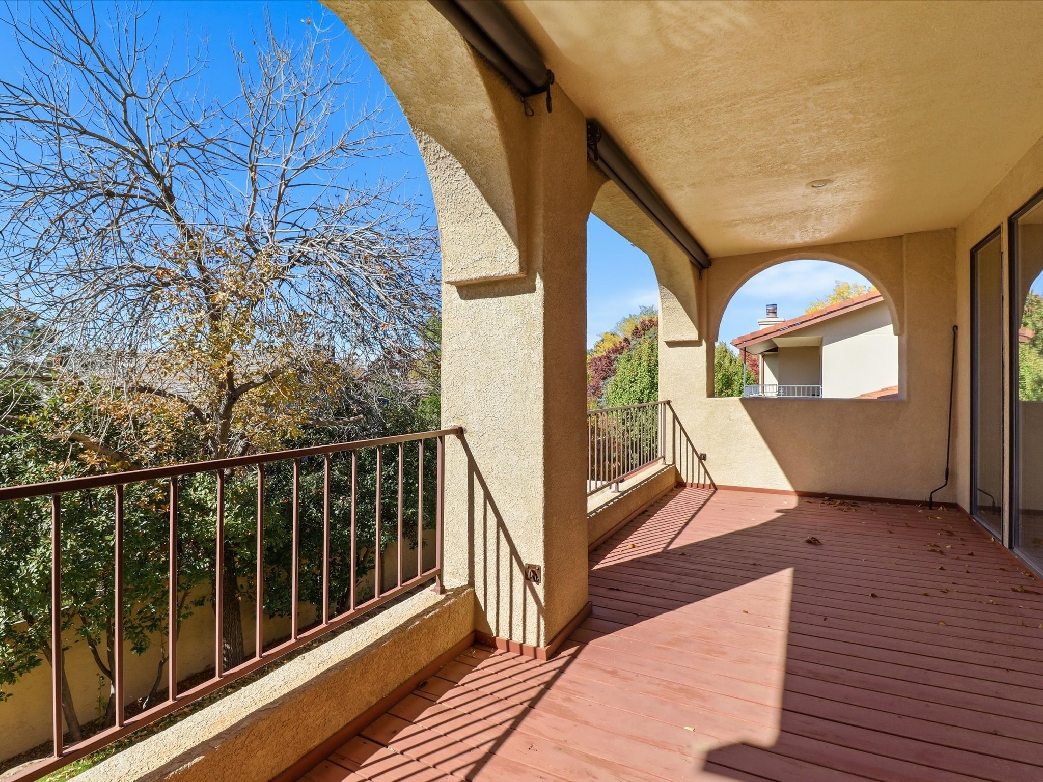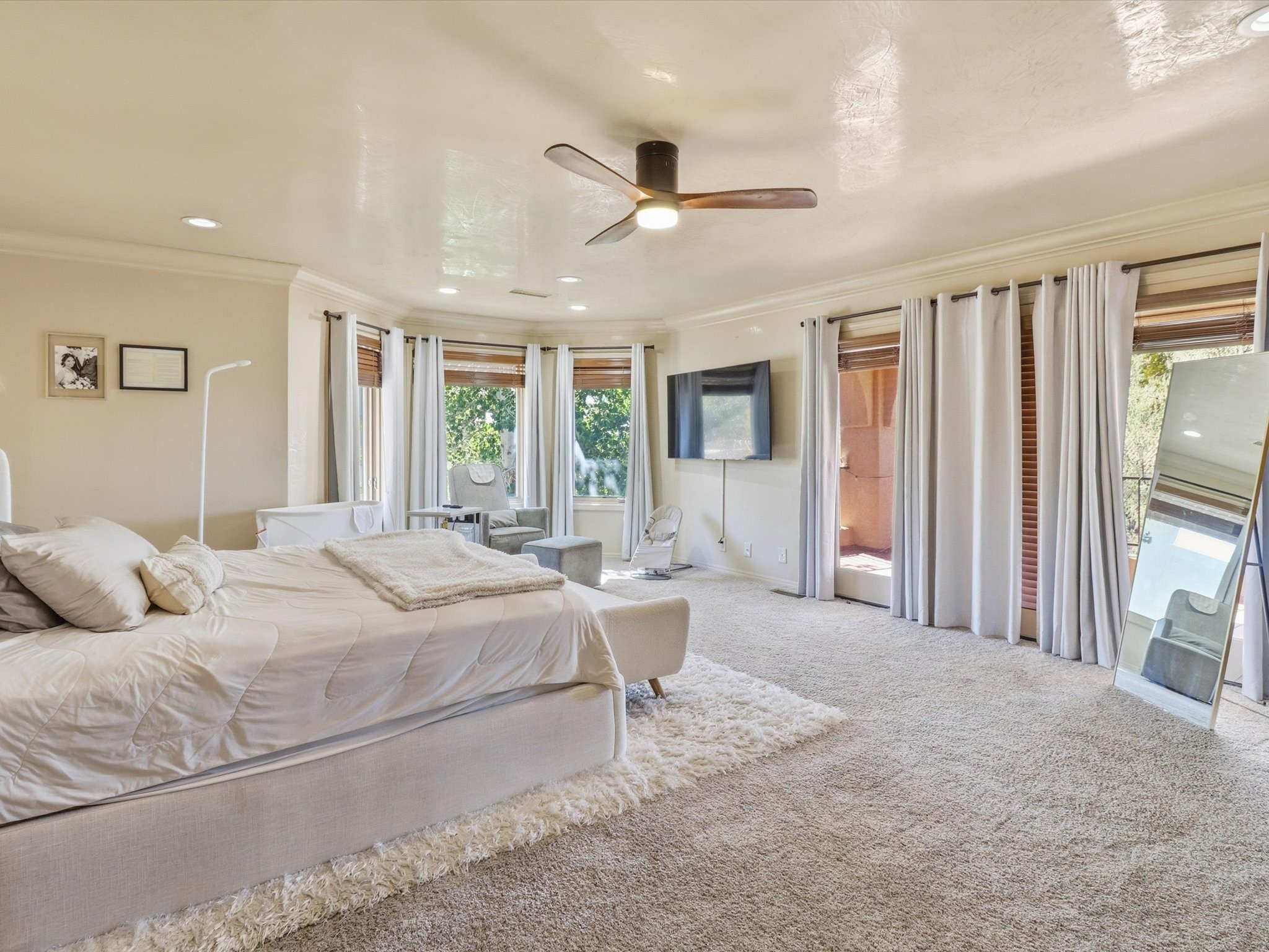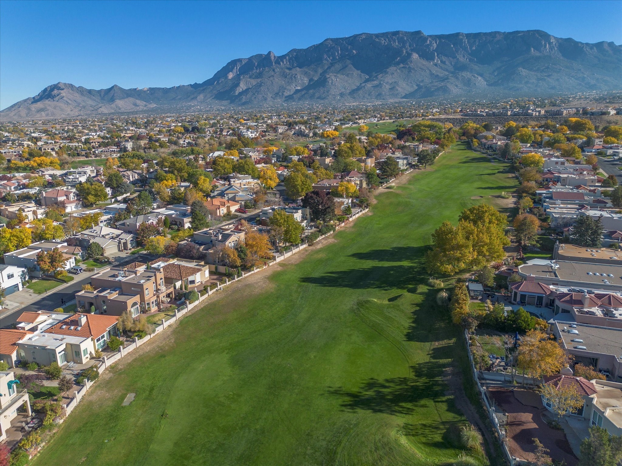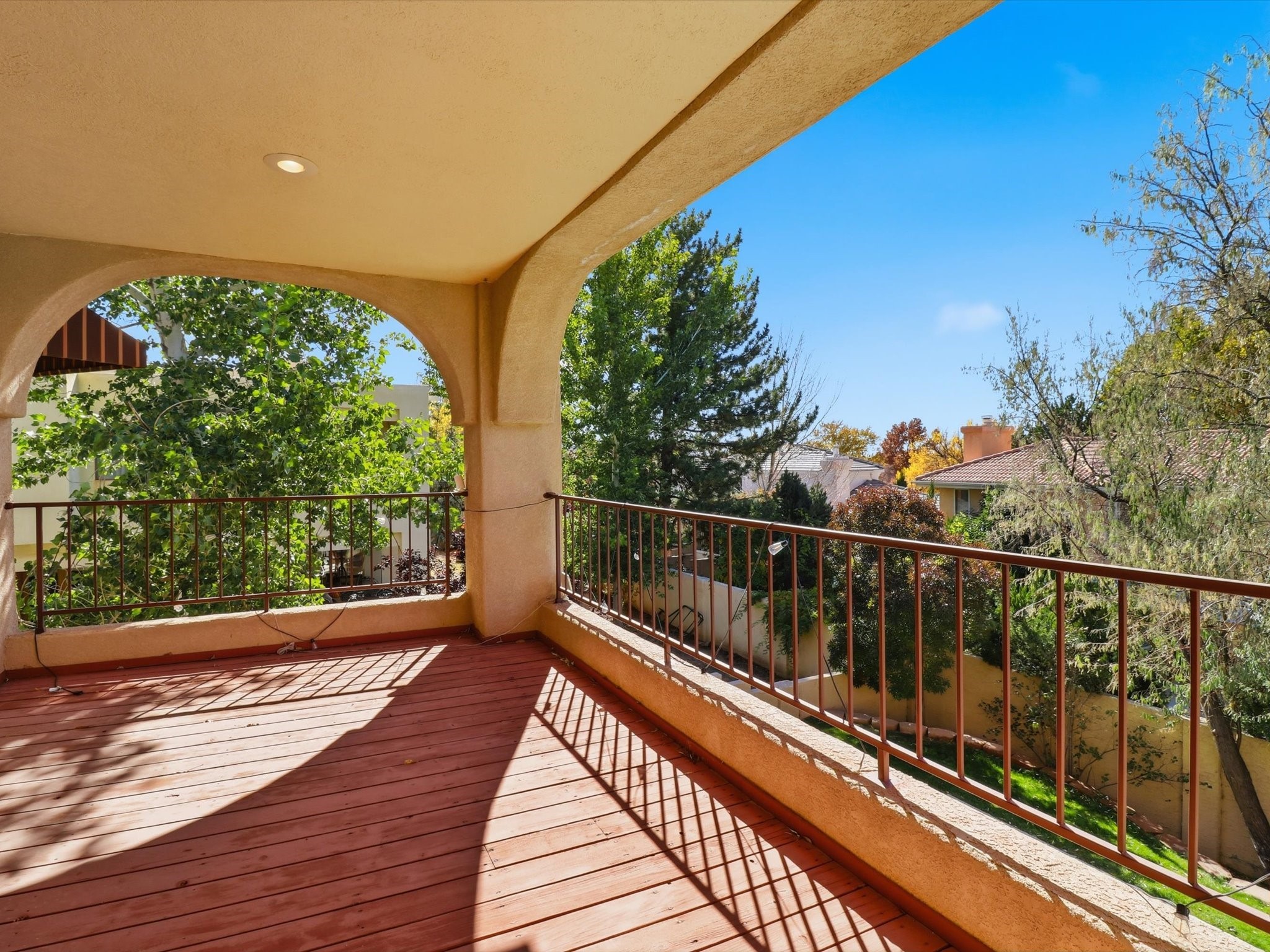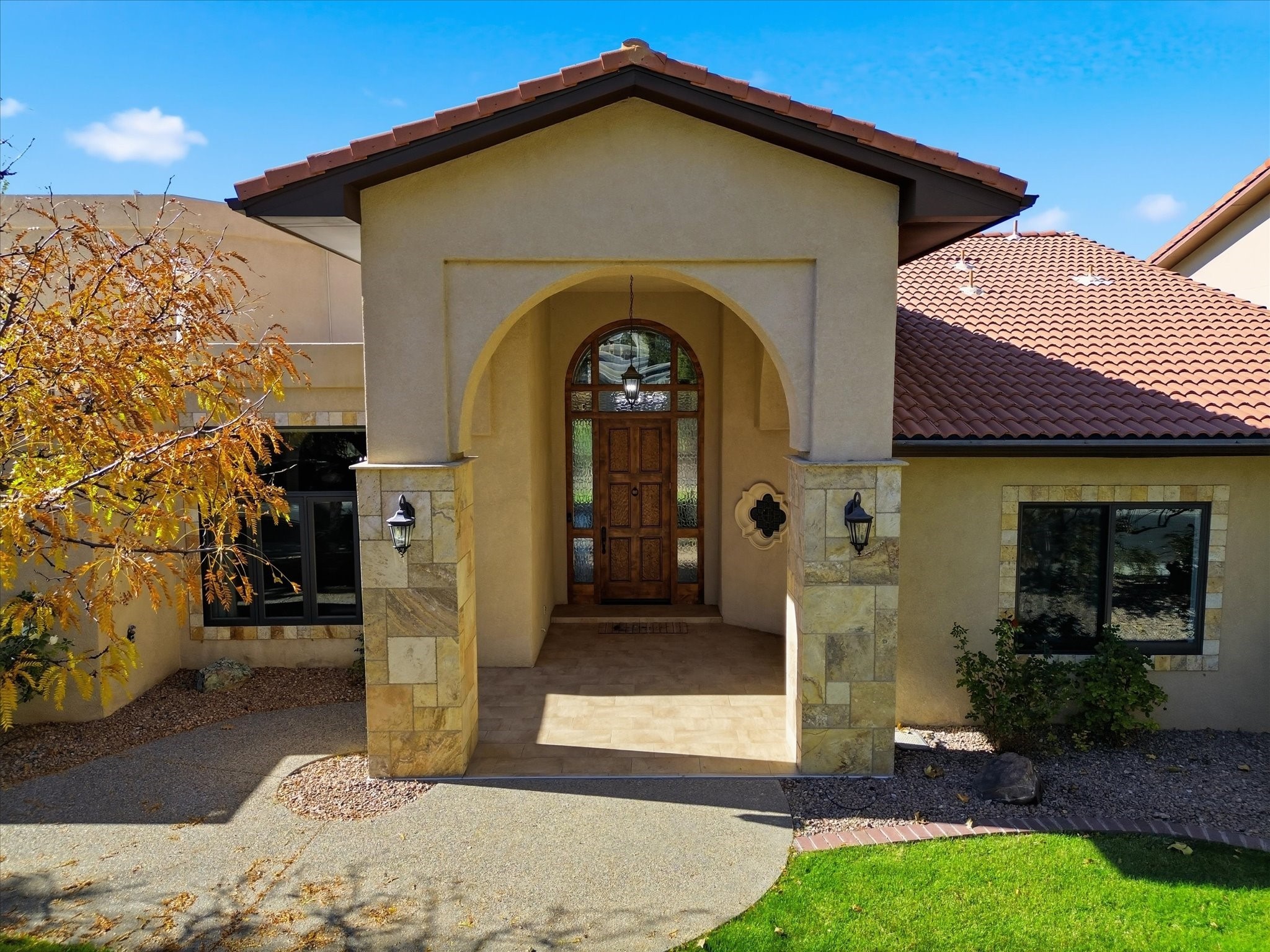 Nestled on one of Tanoan's beautiful tree lined streets, this stunning home sits nearby a cul-de-sac and within walking distance of the country club. This updated home has exquisite attention to detail, showcasing high-end finishes throughout, including Venetian plaster walls, hand-chiseled stone and hardwood floors. Upon entering the home you will appreciate the high ceilings and many windows that open to the backyard and patio, offering lots of natural light into the home. Downstairs you will find 3 generously sized bedrooms with good separation between them. Off the foyer is the formal dining room and large expansive living room with dry bar nearby. The kitchen will not disappoint, with dual ovens, granite countertops, tile backsplash and undermount lighting, plus an eat-in kitchen area. There is also a room off the back patio that is currently being used as an at home gym. The upper level is dedicated to a private primary suite, featuring a spacious bedroom, a cozy loft sitting area with balcony access, and a luxurious spa-like bath complete with a soaking tub, large shower, sauna, and generous walk-in closet. The landscaped backyard offers a beautiful lawn, multiple covered patios ideal for outdoor living and entertaining, along with a heated pool with automatic cover system. 3 car garage with EV charger, water filtration system and soft water system. Recent seller updates include replacement of a portion of the TPO roof, A/C unit, dishwasher, automated irrigation system and heated pool. Enjoy the tranquility, privacy, and security of Albuquerque's 24/7 guard-gated country club community.