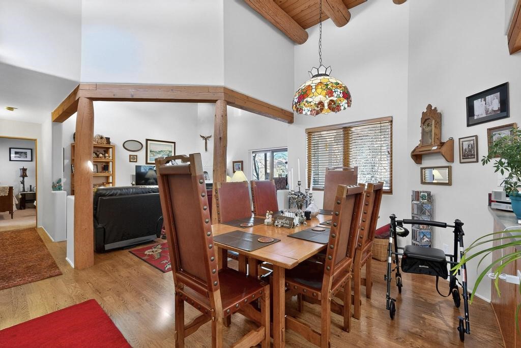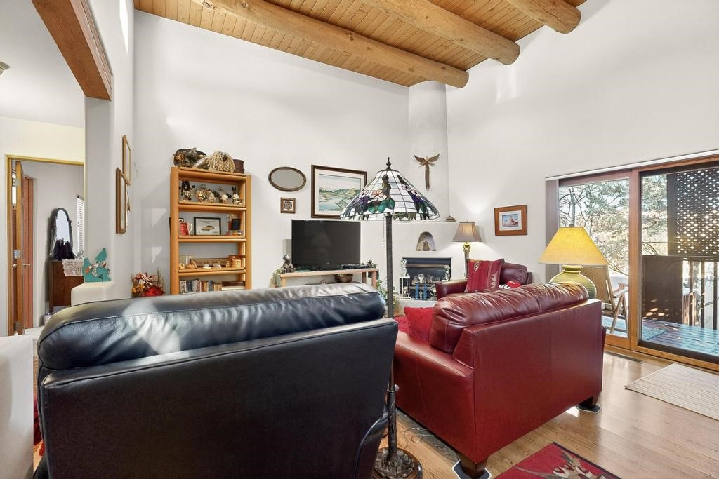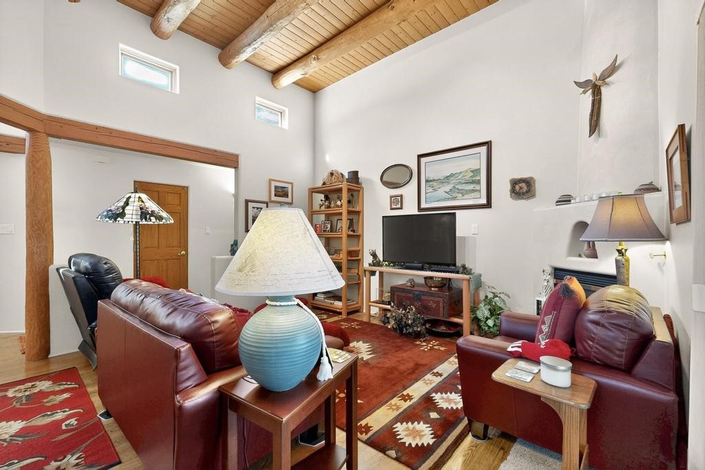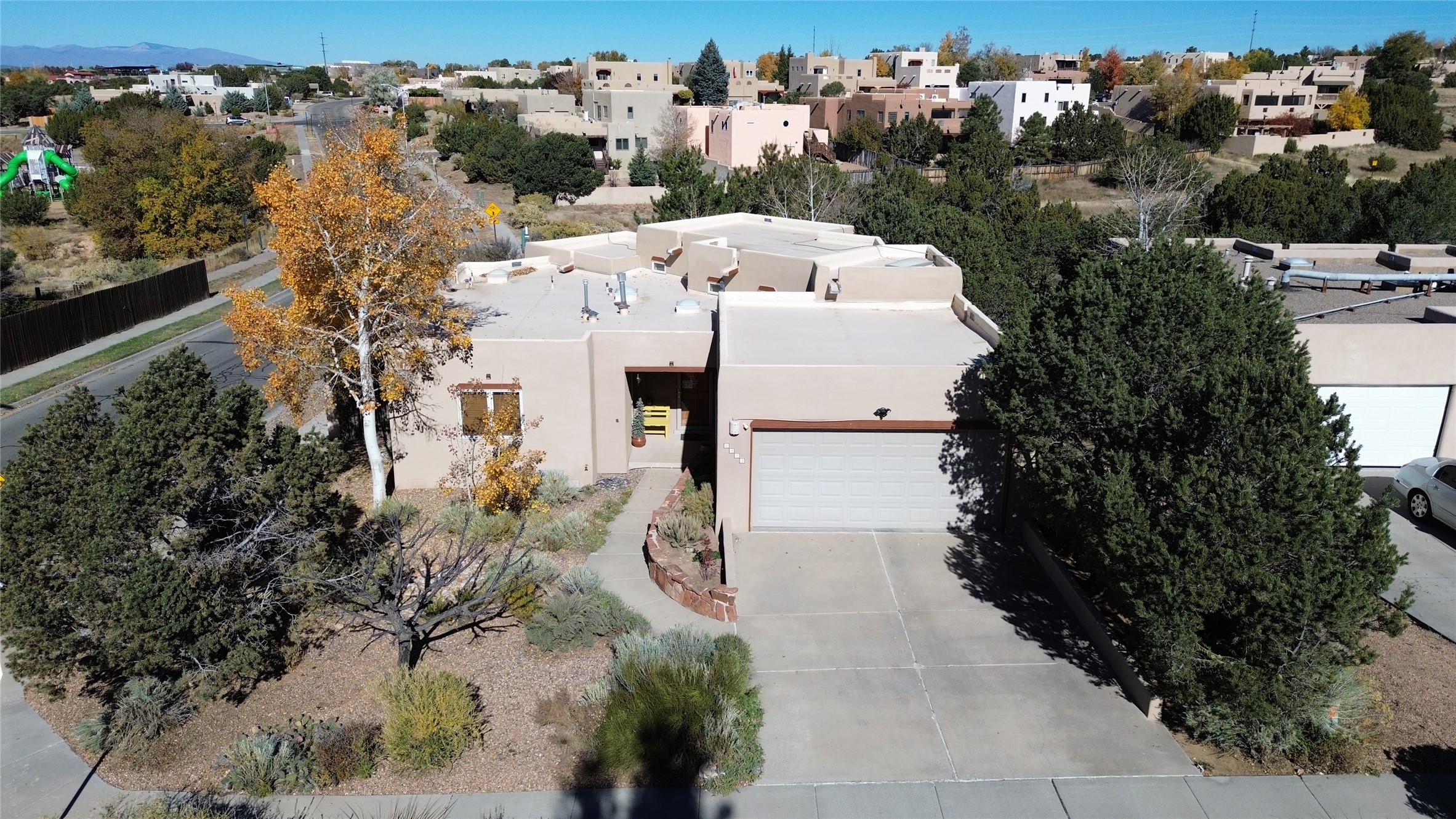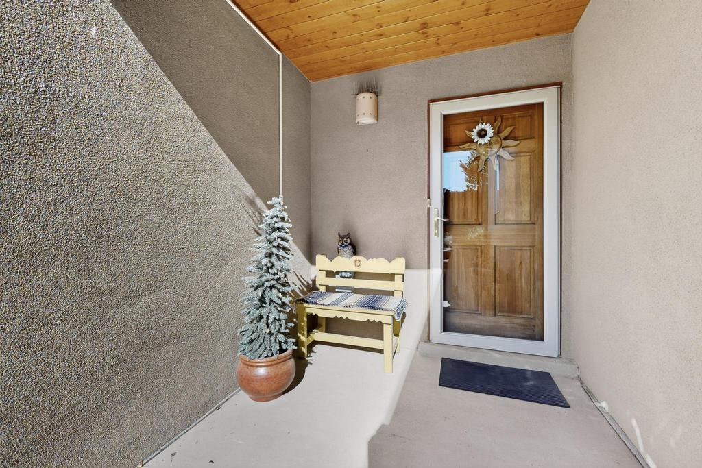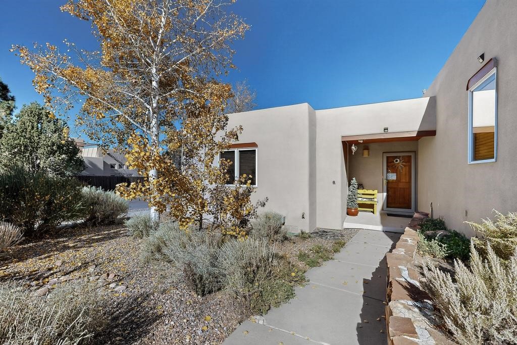 Don't miss this charming single-level home in Pueblos del Sol featuring three bedrooms and two bathrooms. This residence showcases classic Santa Fe details such as Vigas and a cozy Kiva fireplace. Lots of natural light streaming in from five skylights throughout the home. The open floor plan provides great flow and comfortable bedroom separation, while the spacious deck with a solid portal--accessible from both the living room and primary bedroom--offers the perfect place to relax and enjoy the beautiful mountain views. York Central air conditioning and a two-car garage complete this wonderful Santa Fe home. Additionally, the raised subfloor design allows for easy access to plumbing for repairs or modifications. Situated on a large, beautifully landscaped corner lot with native plants and an apricot tree, the property backs onto a greenbelt for added privacy. Recent updates include a finished garage with a new door (2016), a new TPO roof (2021), new coyote and dog-eared fencing (2021), stucco patched and stained (2025), a new hot water heater (2025), a new sump pump (2023), and a new tankless water heater (2025). We invite you to come take a look at this wonderful property.