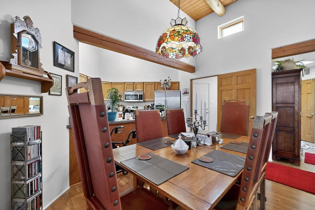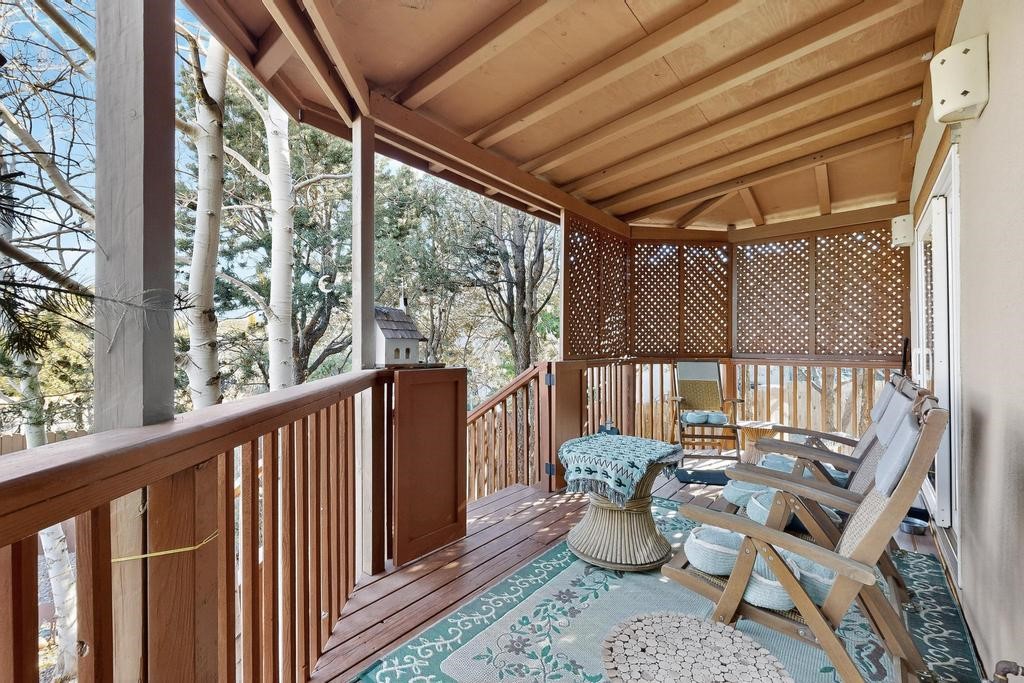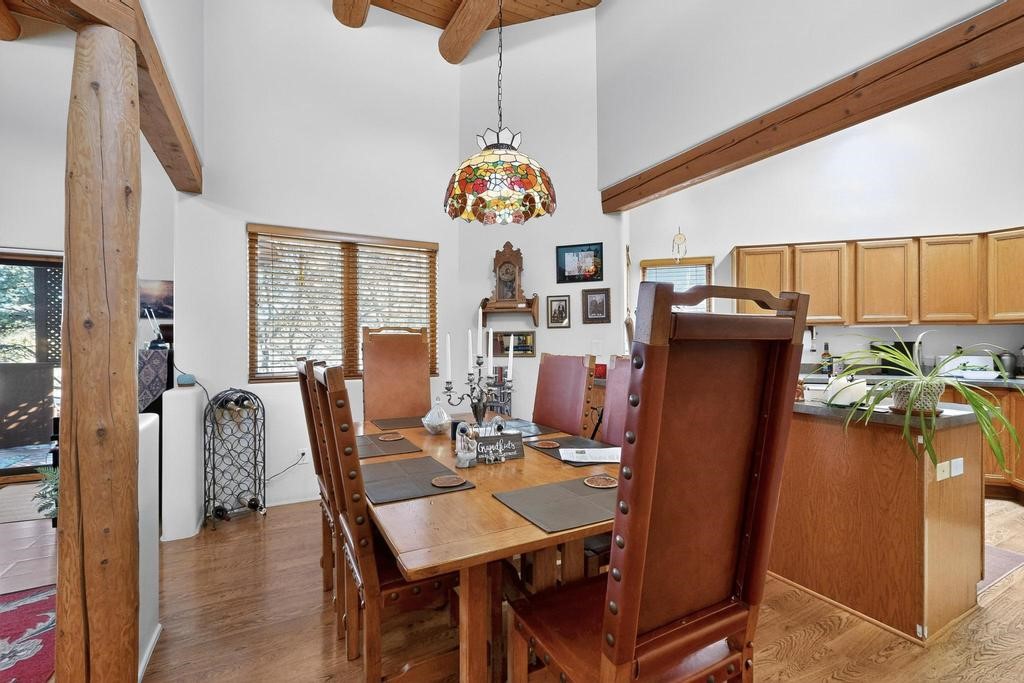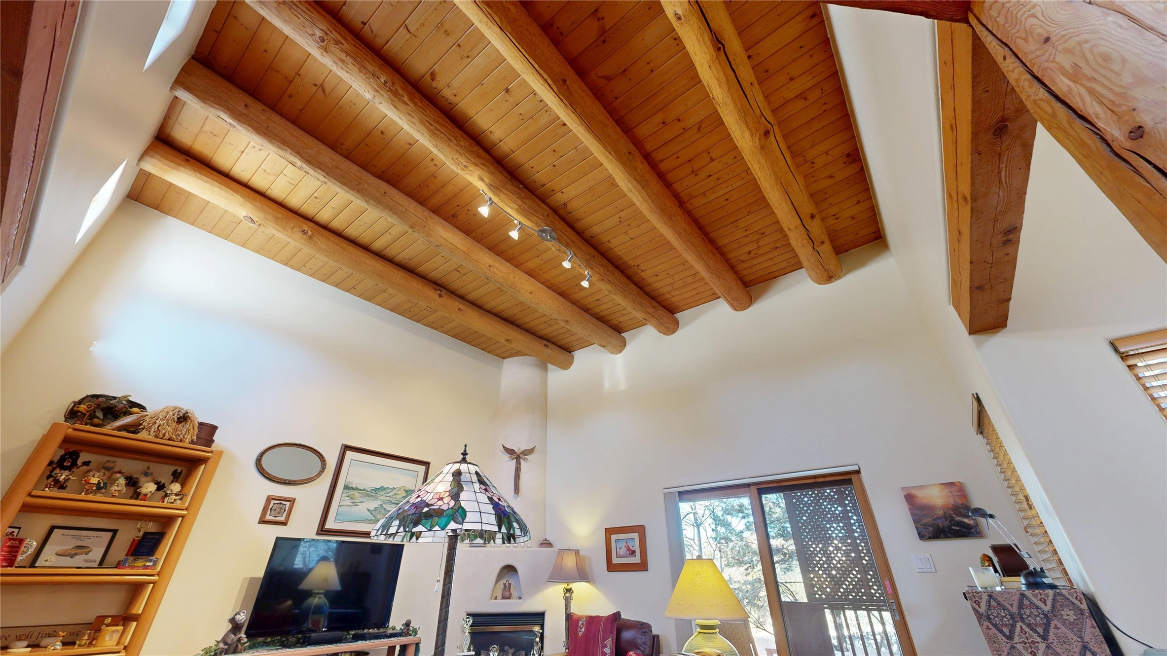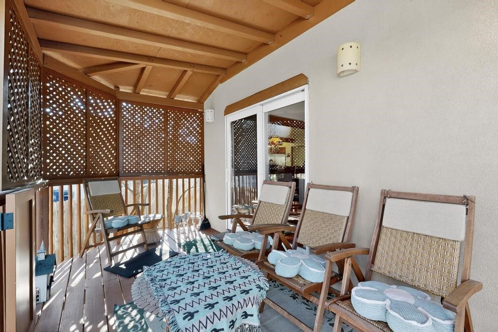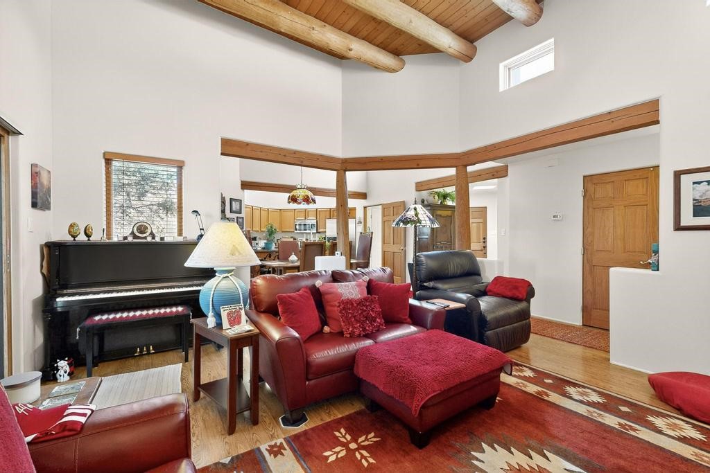 Don't miss this charming single-level home in Pueblos del Sol featuring three bedrooms and two bathrooms. This residence showcases classic Santa Fe details such as Vigas and a cozy Kiva fireplace. Lots of natural light streaming in from five skylights throughout the home. The open floor plan provides great flow and comfortable bedroom separation, while the spacious deck with a solid portal--accessible from both the living room and primary bedroom--offers the perfect place to relax and enjoy the beautiful mountain views. York Central air conditioning and a two-car garage complete this wonderful Santa Fe home. Additionally, the raised subfloor design allows for easy access to plumbing for repairs or modifications. Situated on a large, beautifully landscaped corner lot with native plants and an apricot tree, the property backs onto a greenbelt for added privacy. Recent updates include a finished garage with a new door (2016), a new TPO roof (2021), new coyote and dog-eared fencing (2021), stucco patched and stained (2025), a new hot water heater (2025), a new sump pump (2023), and a new tankless water heater (2025). We invite you to come take a look at this wonderful property.
