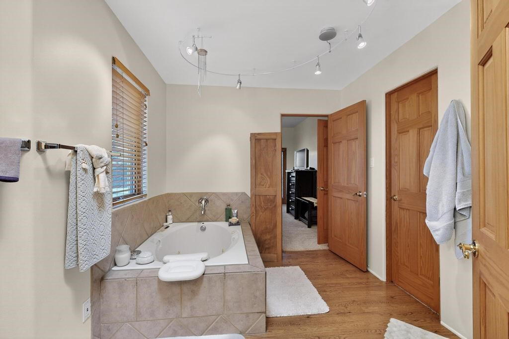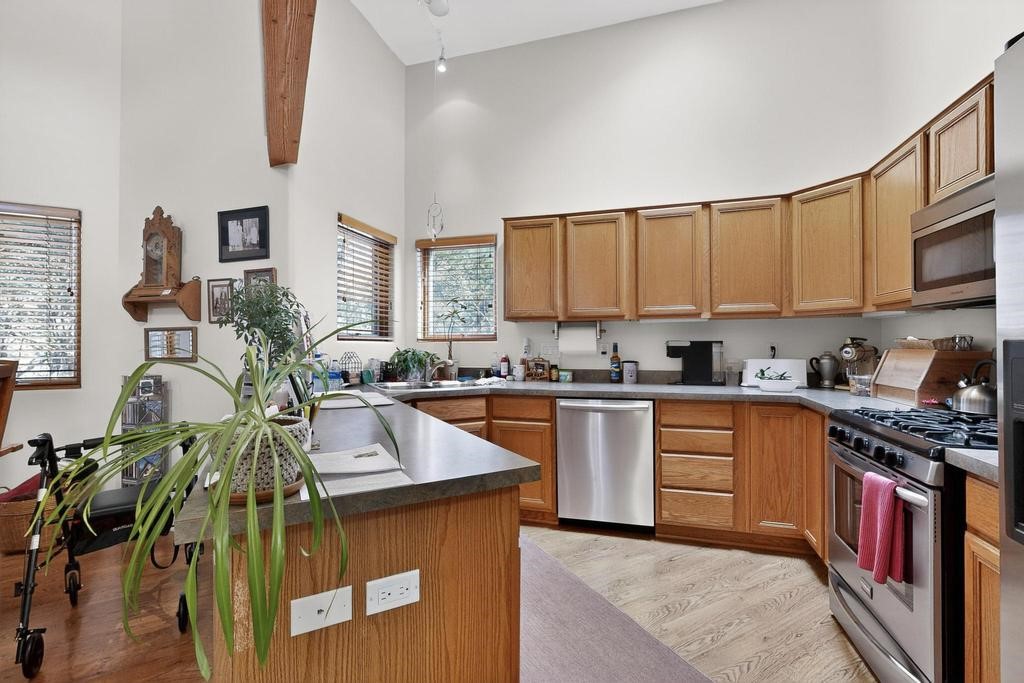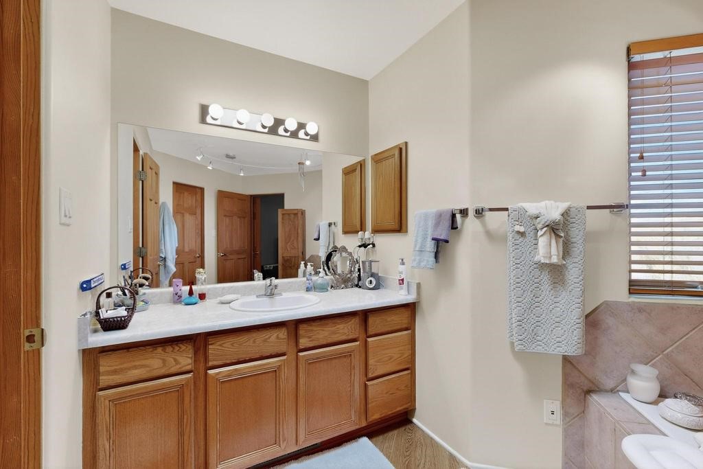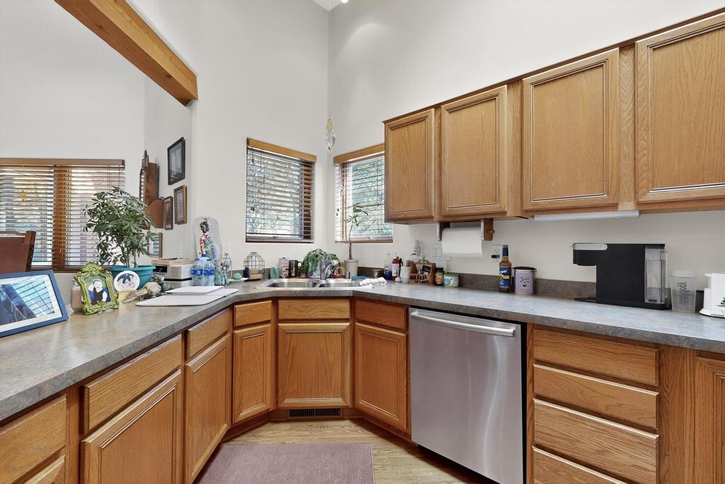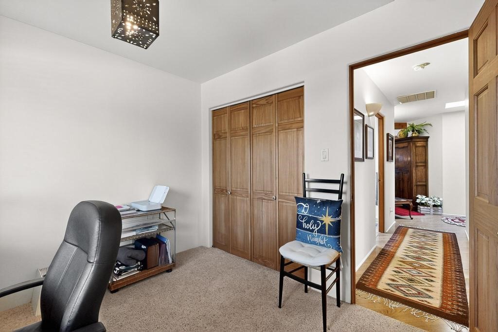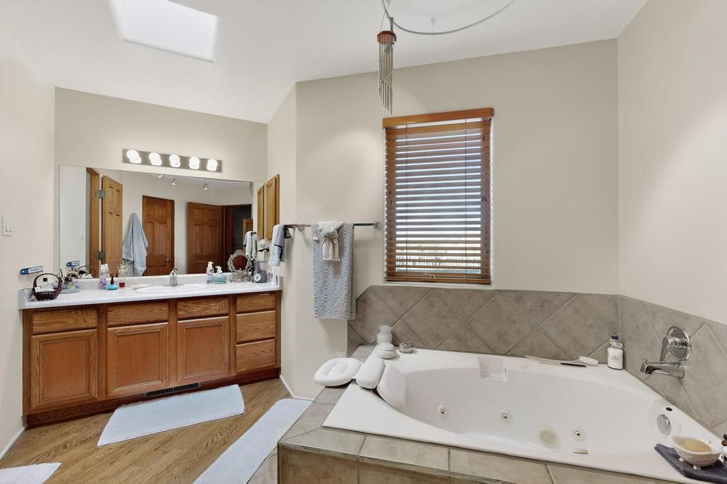 Don't miss this charming single-level home in Pueblos del Sol featuring three bedrooms and two bathrooms. This residence showcases classic Santa Fe details such as Vigas and a cozy Kiva fireplace. Lots of natural light streaming in from five skylights throughout the home. The open floor plan provides great flow and comfortable bedroom separation, while the spacious deck with a solid portal--accessible from both the living room and primary bedroom--offers the perfect place to relax and enjoy the beautiful mountain views. York Central air conditioning and a two-car garage complete this wonderful Santa Fe home. Additionally, the raised subfloor design allows for easy access to plumbing for repairs or modifications. Situated on a large, beautifully landscaped corner lot with native plants and an apricot tree, the property backs onto a greenbelt for added privacy. Recent updates include a finished garage with a new door (2016), a new TPO roof (2021), new coyote and dog-eared fencing (2021), stucco patched and stained (2025), a new hot water heater (2025), a new sump pump (2023), and a new tankless water heater (2025). We invite you to come take a look at this wonderful property.