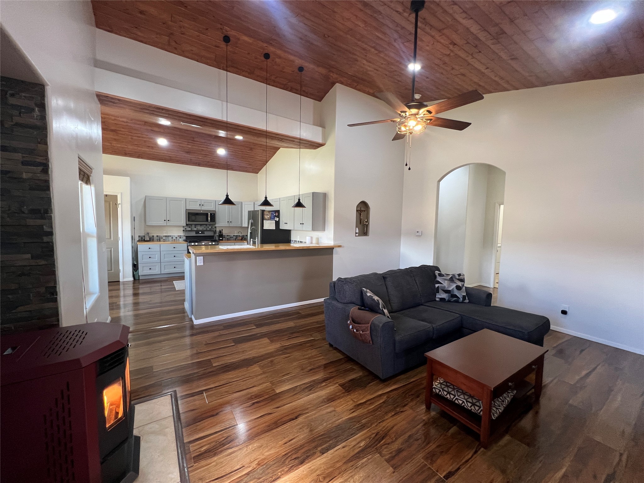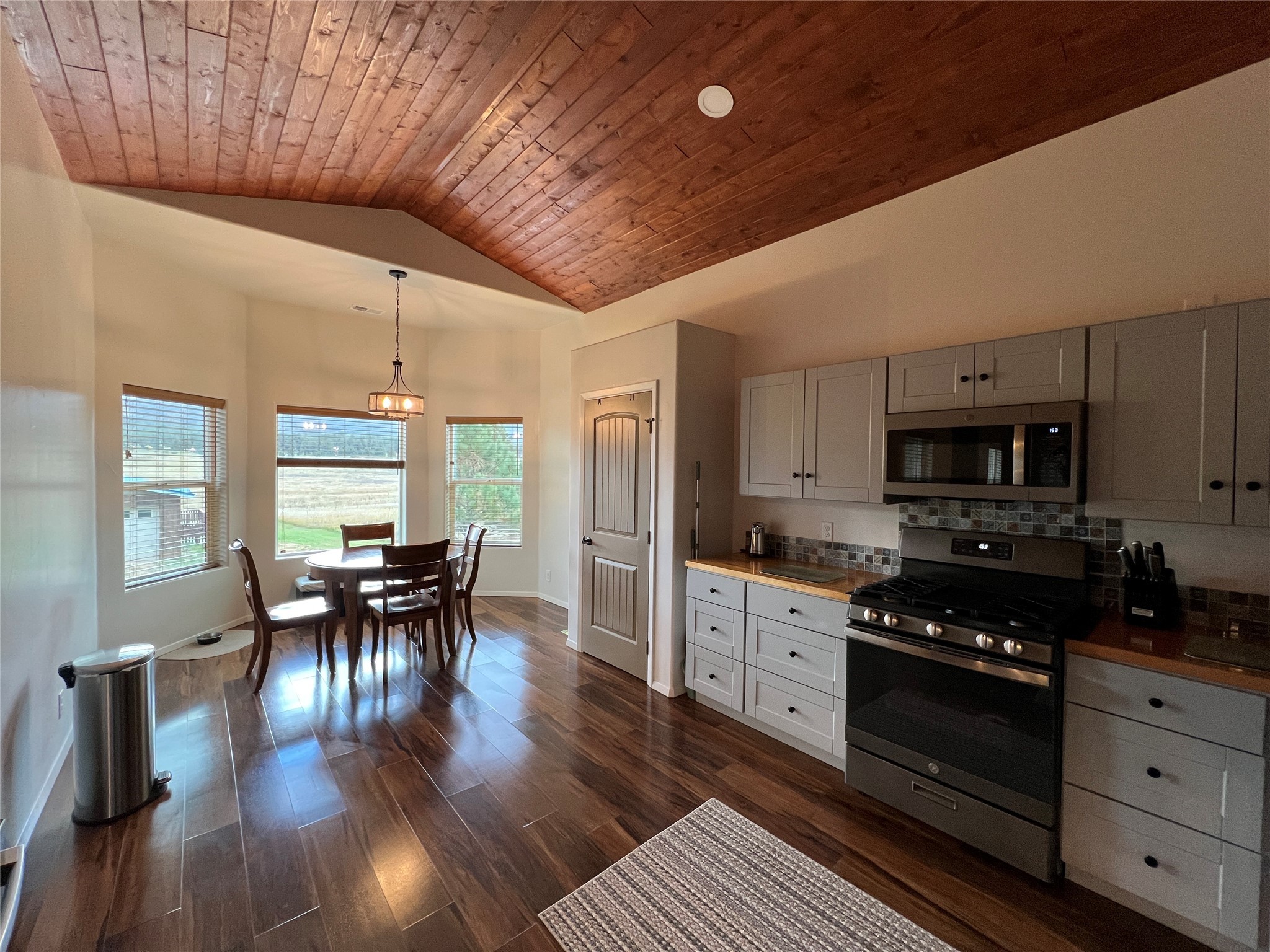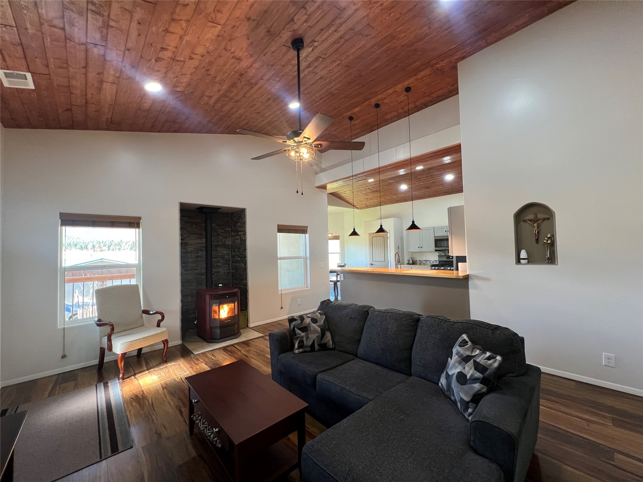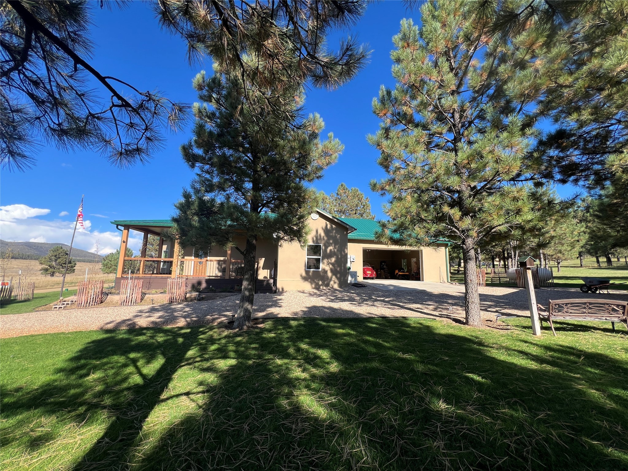 Immaculate mountain retreat with panoramic views and exceptional craftsmanship. Built in 2022, this beautifully maintained mountain home combines modern comfort with comfortable living. Situated on two lots with 0.83 acres allows for easy access off the paved county road. Step inside to soaring vaulted ceilings and a bright, open living area centered around a cozy pellet stove--perfect for relaxing or entertaining in style. The light bright well designed kitchen boasts butcher block countertops protected with an epoxy finish and a spacious pantry. The thoughtfully designed floor plan with luxury vinyl flooring throughout features a primary bedroom with en-suite bath and walk-in closet and a guest bedroom and another full bath. A convenient laundry area and mud room leads to the attached spacious oversized insulated finished 900-square-foot heated garage offering far more than parking--complete with a wood stove, workshop space, utility sink, and 220-volt outlet, it's ideal for hobbies, projects, or extra storage. Step out to the covered deck and take in breathtaking valley, mountain, and forest views--a peaceful setting where you'll love to unwind. Lush lawns frame the property, accented by two hand-built bridges and a large new storage shed with electricity for added convenience. Generac hard-wired full-house generator provides worry-free backup power. Offered furnished, this move-in-ready home is the perfect blend of quality, comfort, and mountain serenity. Located just 25 miles from Las Vegas, NM, and an easy 1-hour drive to Santa Fe or Taos, this property invites you to relax, recharge, and enjoy life in one of northern New Mexico's most scenic settings.